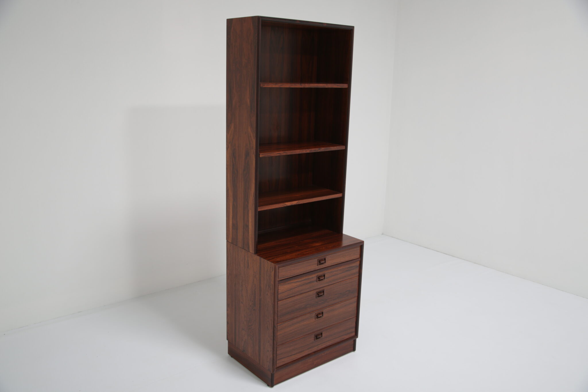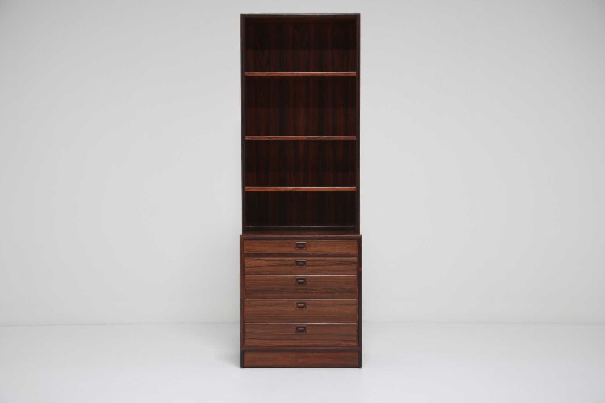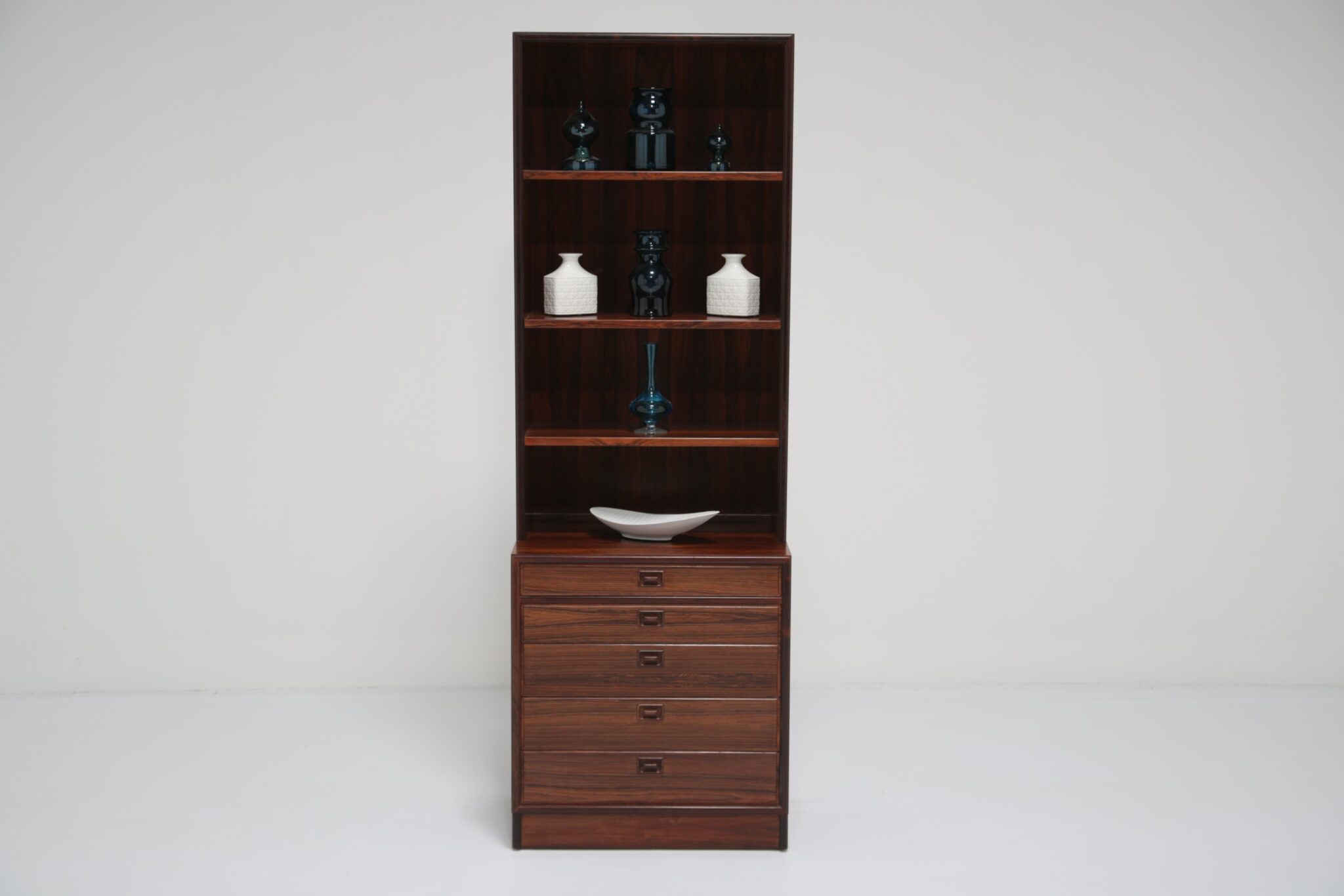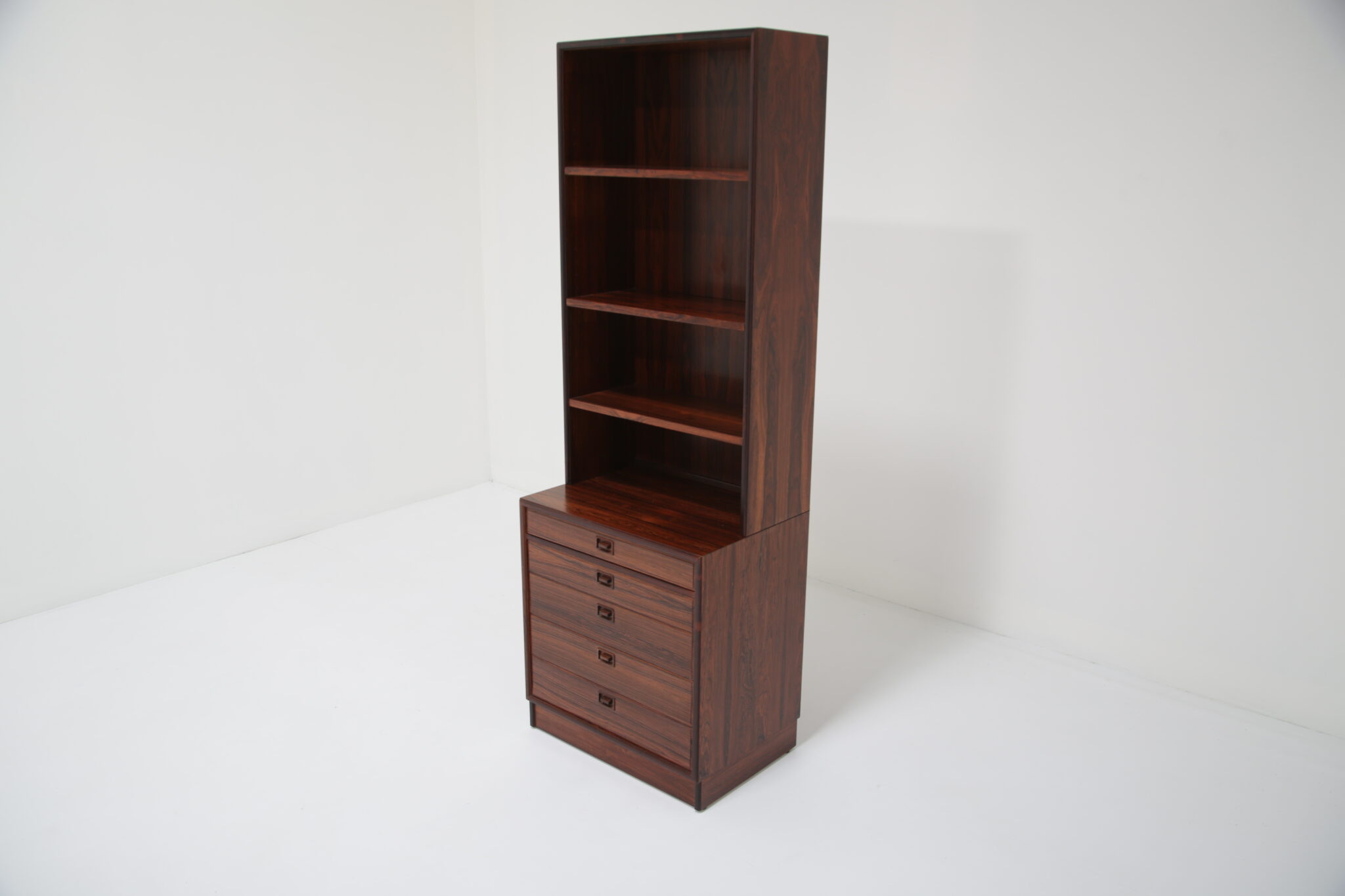 Just added to our collection is this gorgeous two part rosewood bookcase with a five drawer cabinet base. The rosewood grain is beautifully pronounced throughout this piece with mesmerizing patterns all around this piece. The drawers increase in size as it goes down to the last drawer, allowing for storing plenty of miscellaneous items. Perfect for an alcove in a living room or as a standout piece on it’s own.