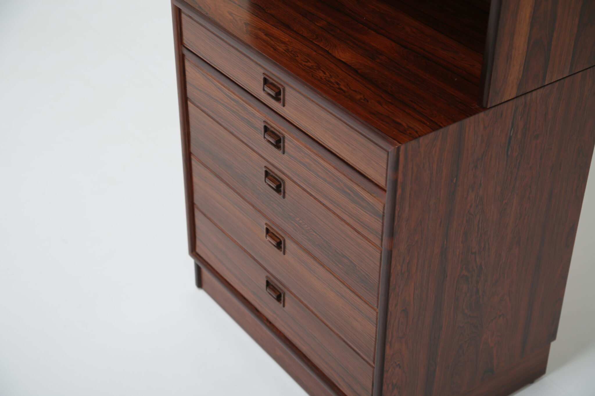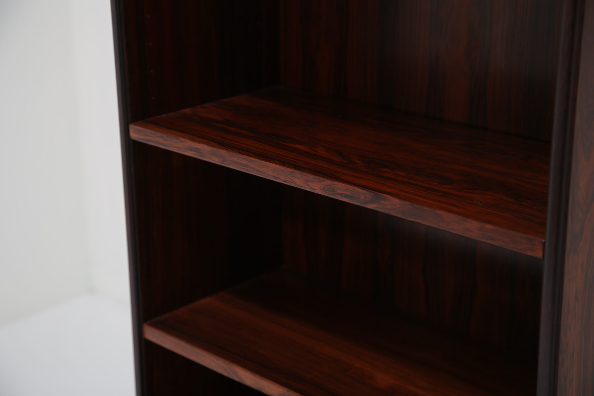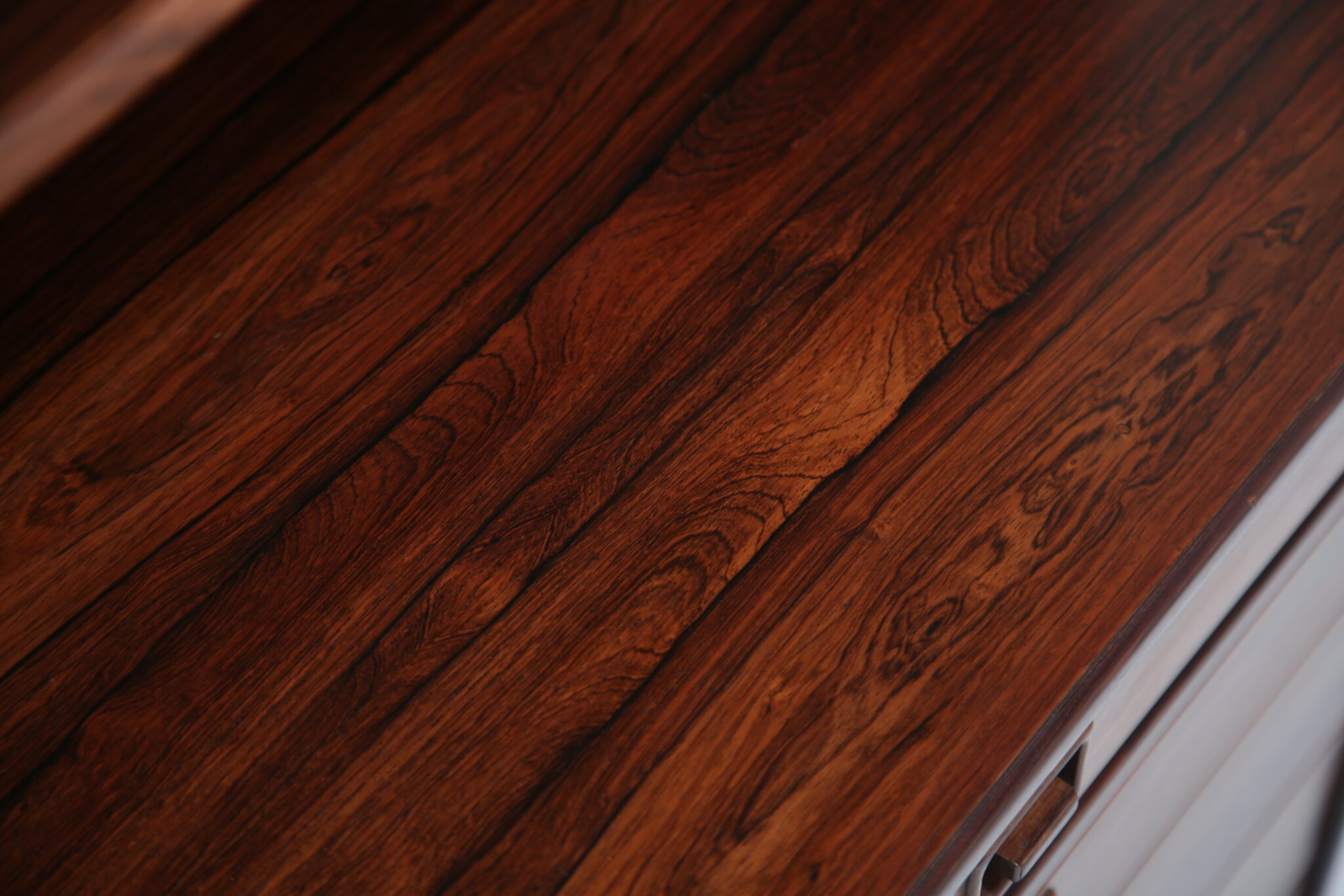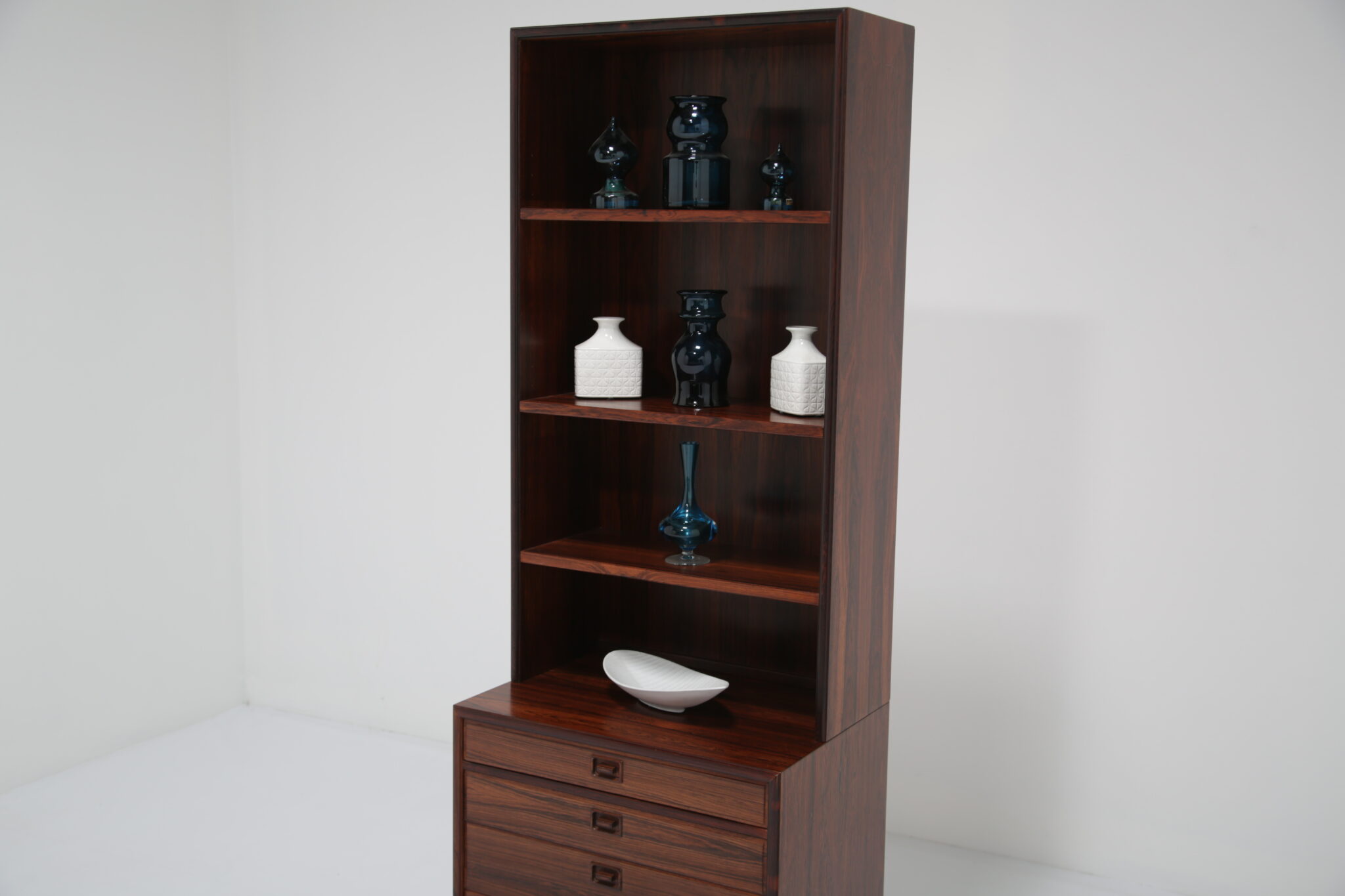 Just added to our collection is this gorgeous two part rosewood bookcase with a five drawer cabinet base. The rosewood grain is beautifully pronounced throughout this piece with mesmerizing patterns all around this piece. The drawers increase in size as it goes down to the last drawer, allowing for storing plenty of miscellaneous items. Perfect for an alcove in a living room or as a standout piece on it’s own.