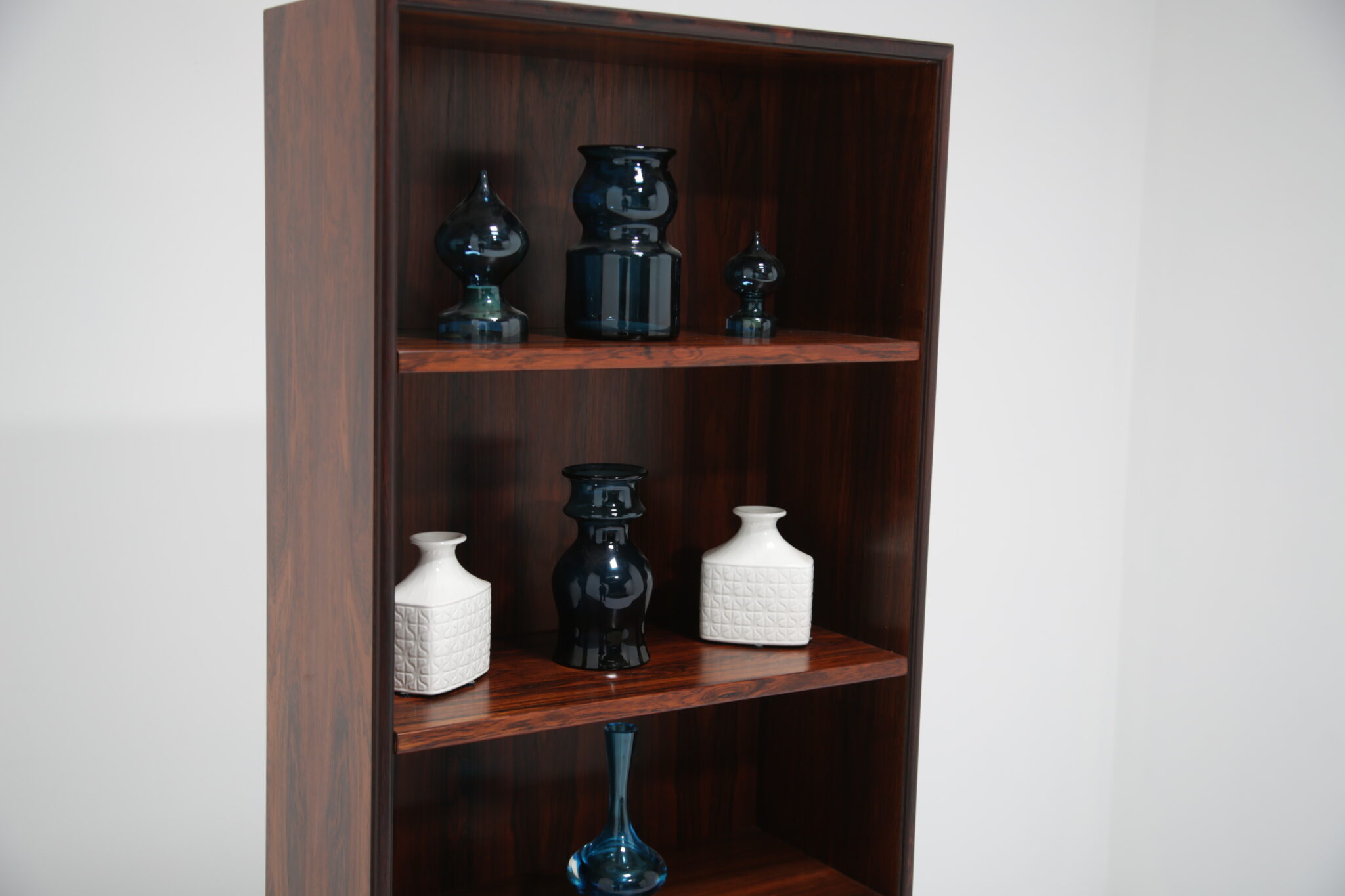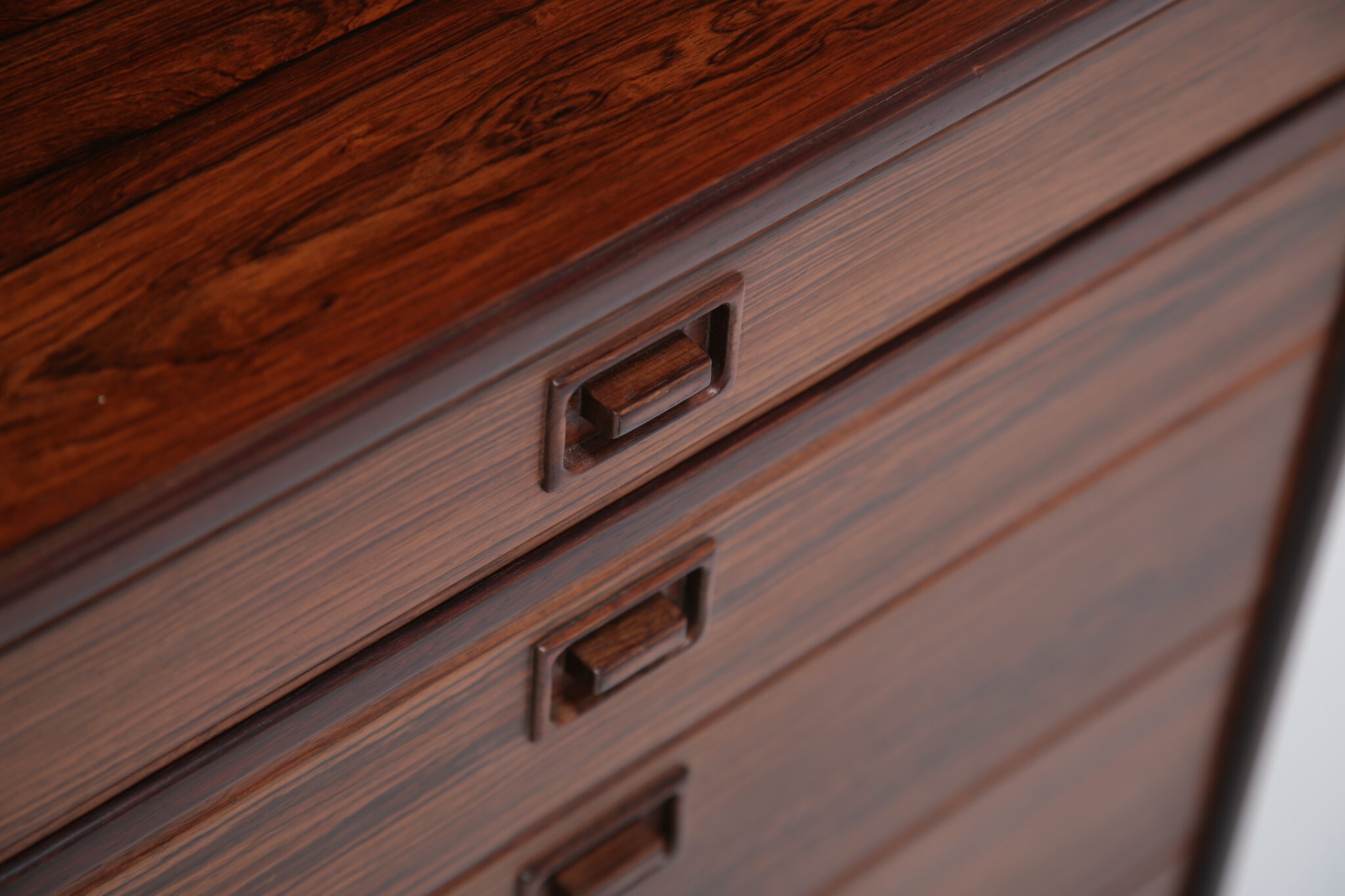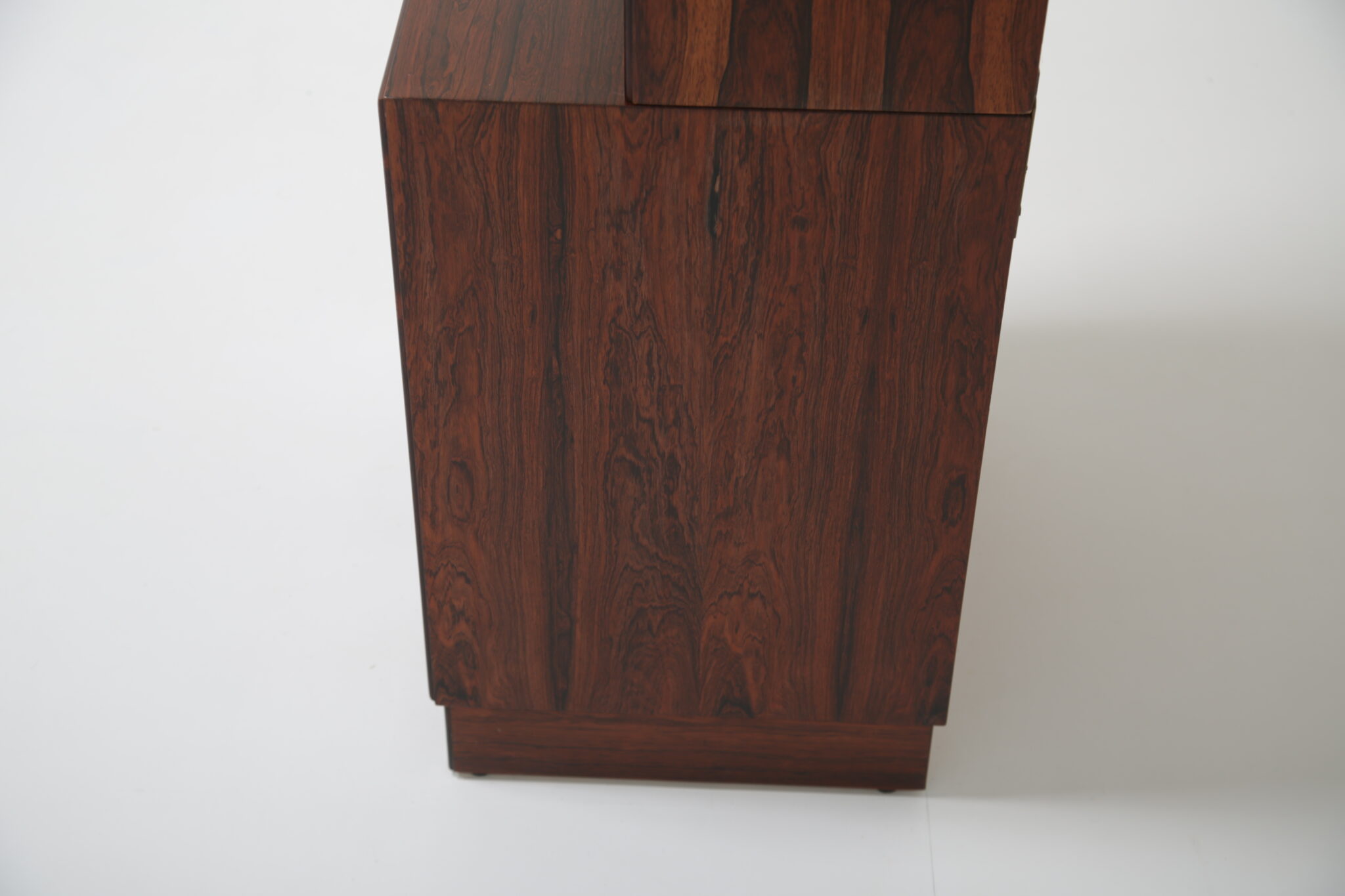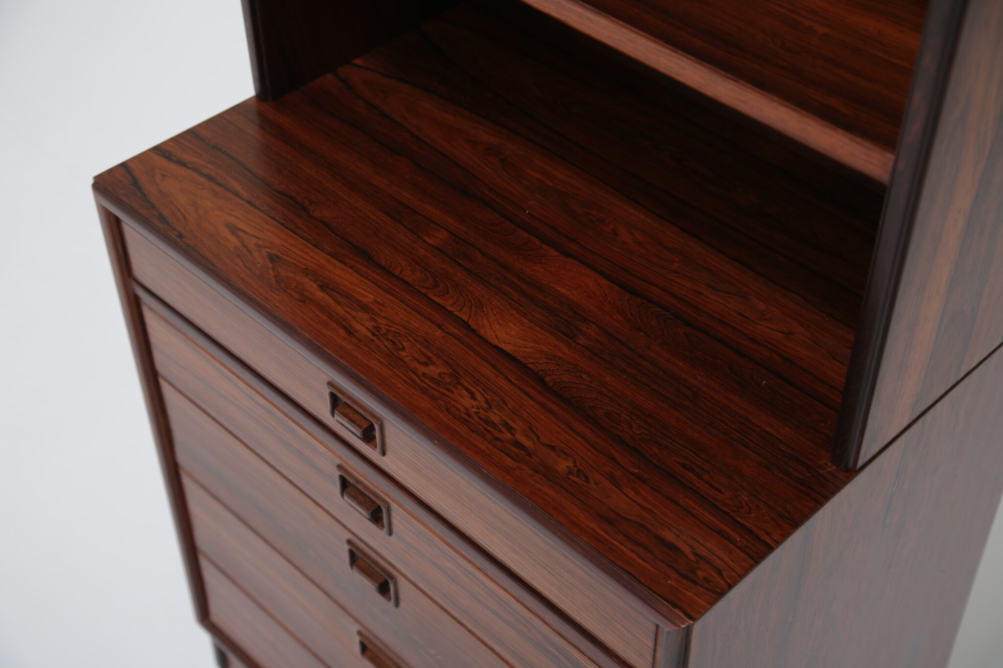 Just added to our collection is this gorgeous two part rosewood bookcase with a five drawer cabinet base. The rosewood grain is beautifully pronounced throughout this piece with mesmerizing patterns all around this piece. The drawers increase in size as it goes down to the last drawer, allowing for storing plenty of miscellaneous items. Perfect for an alcove in a living room or as a standout piece on it’s own.