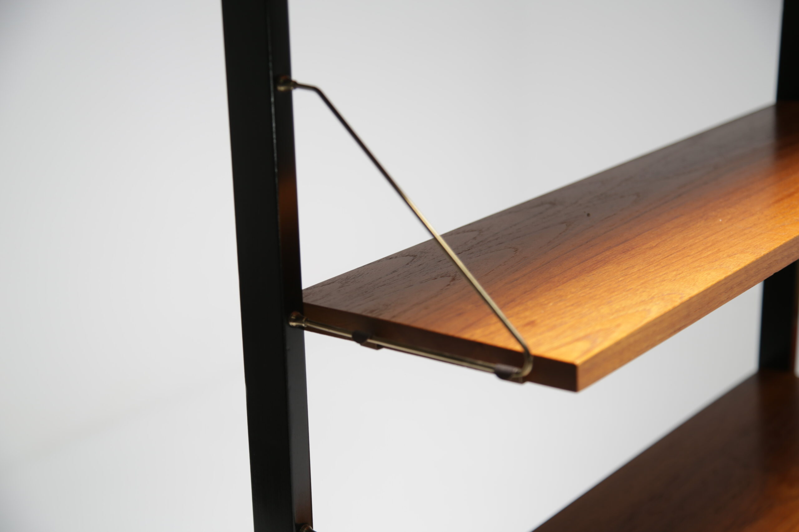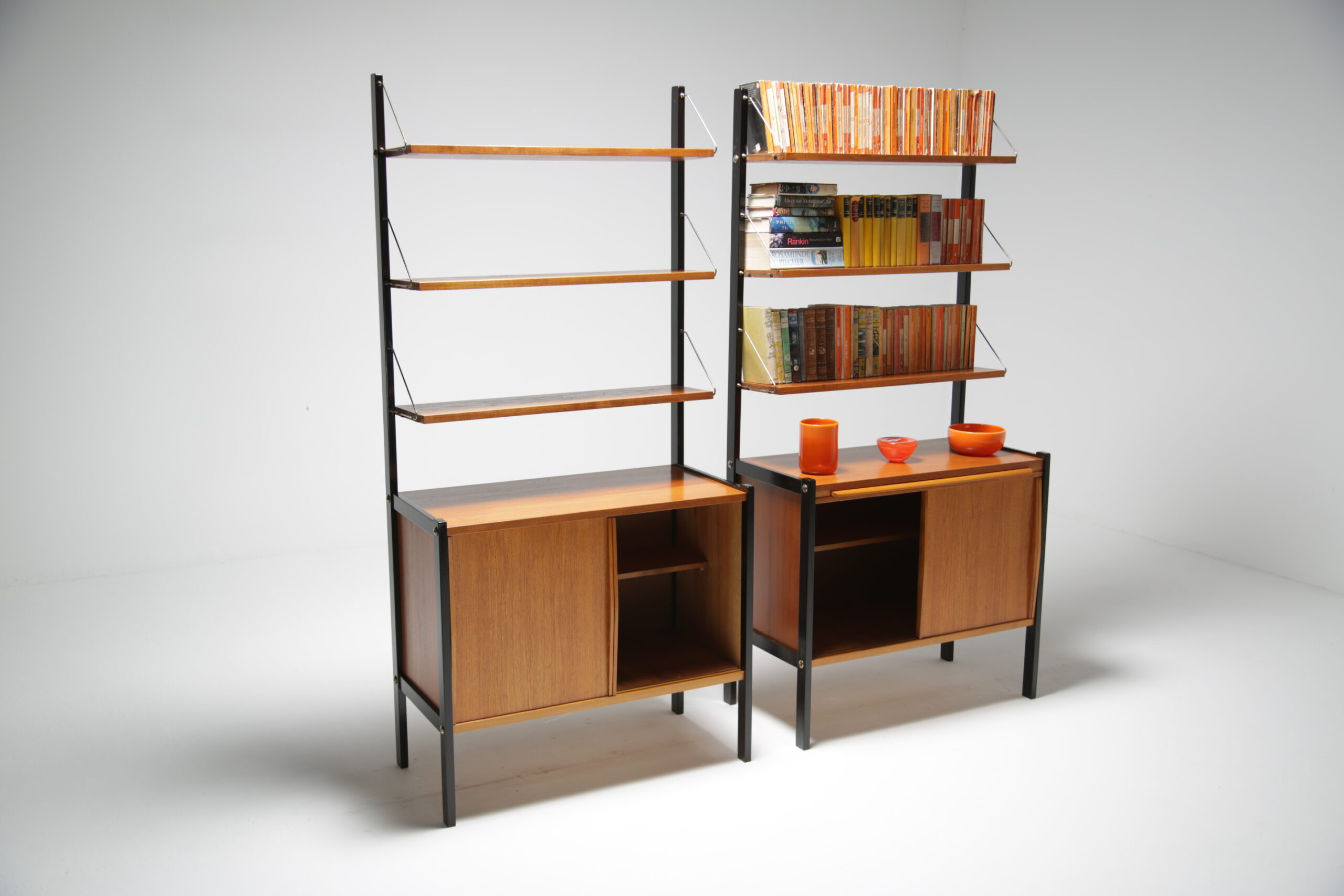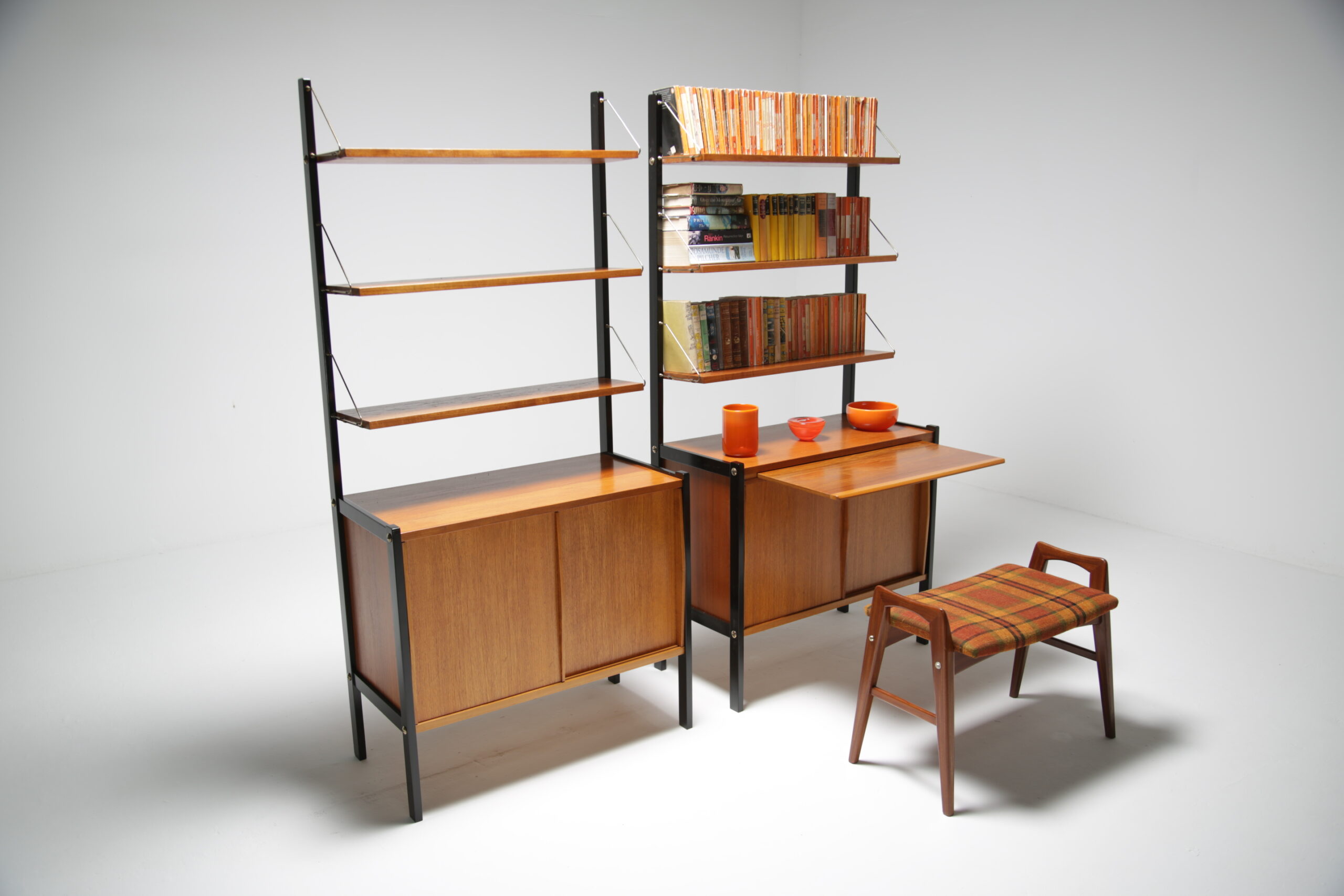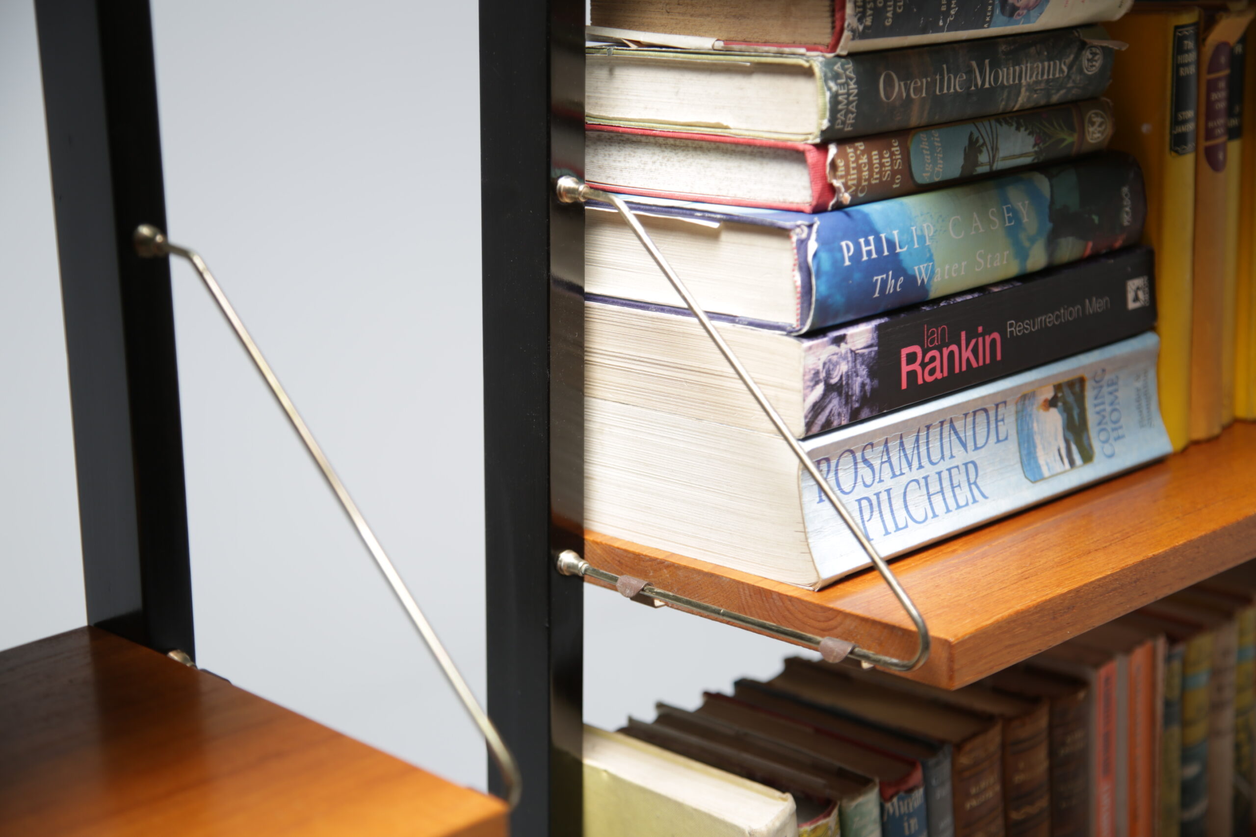 A Pair of Swedish teak bookcases with ebonised sides. A very good looking pair of bookcases with a nice contrast between the ebonised sides, the teak body and the brass hardware. Plenty of shelf space for books and some good storage beneath. One of the bookcases has a slide out desk top or bureau plat. This slide out shelf gives the user a very discreet and easily stowed away desk top to work on. The brass shelf supports and the other brass hardware again add a lovely contrast between the black sides and the teak. Both bookcases have been fully refurbished and are ready to go. Worldwide delivery available.