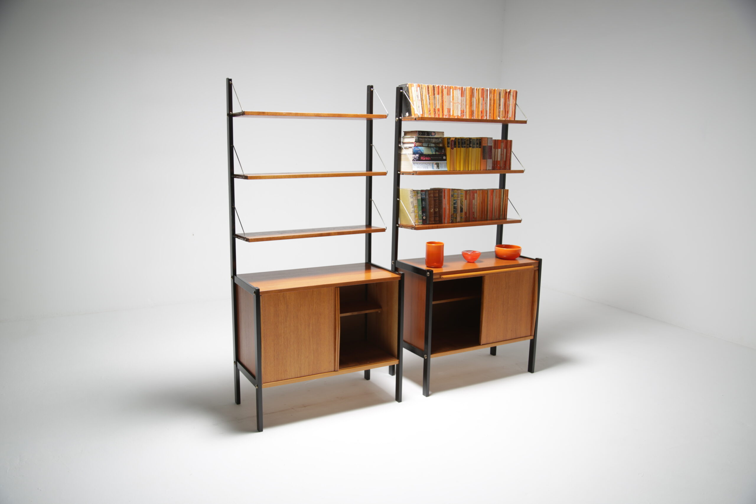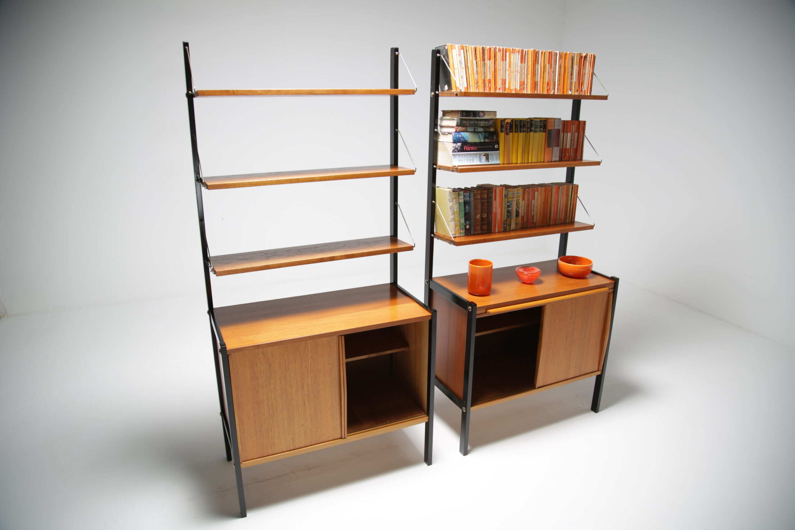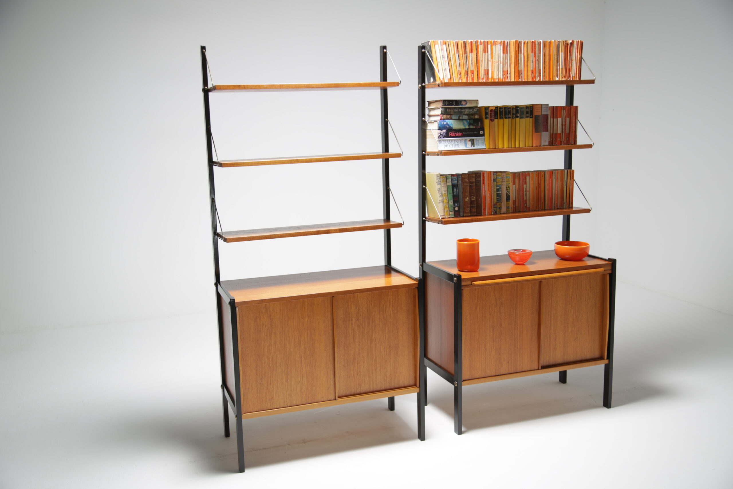 A Pair of Swedish teak bookcases with ebonised sides. A very good looking pair of bookcases with a nice contrast between the ebonised sides, the teak body and the brass hardware. Plenty of shelf space for books and some good storage beneath. One of the bookcases has a slide out desk top or bureau plat. This slide out shelf gives the user a very discreet and easily stowed away desk top to work on. The brass shelf supports and the other brass hardware again add a lovely contrast between the black sides and the teak. Both bookcases have been fully refurbished and are ready to go. Worldwide delivery available.