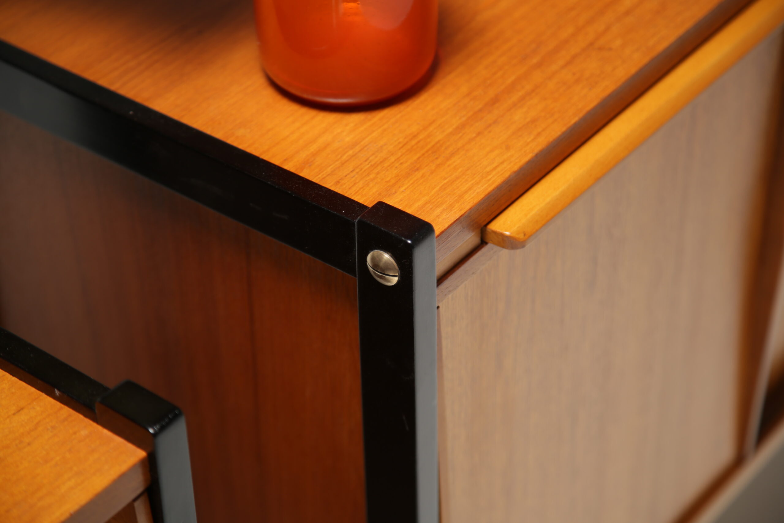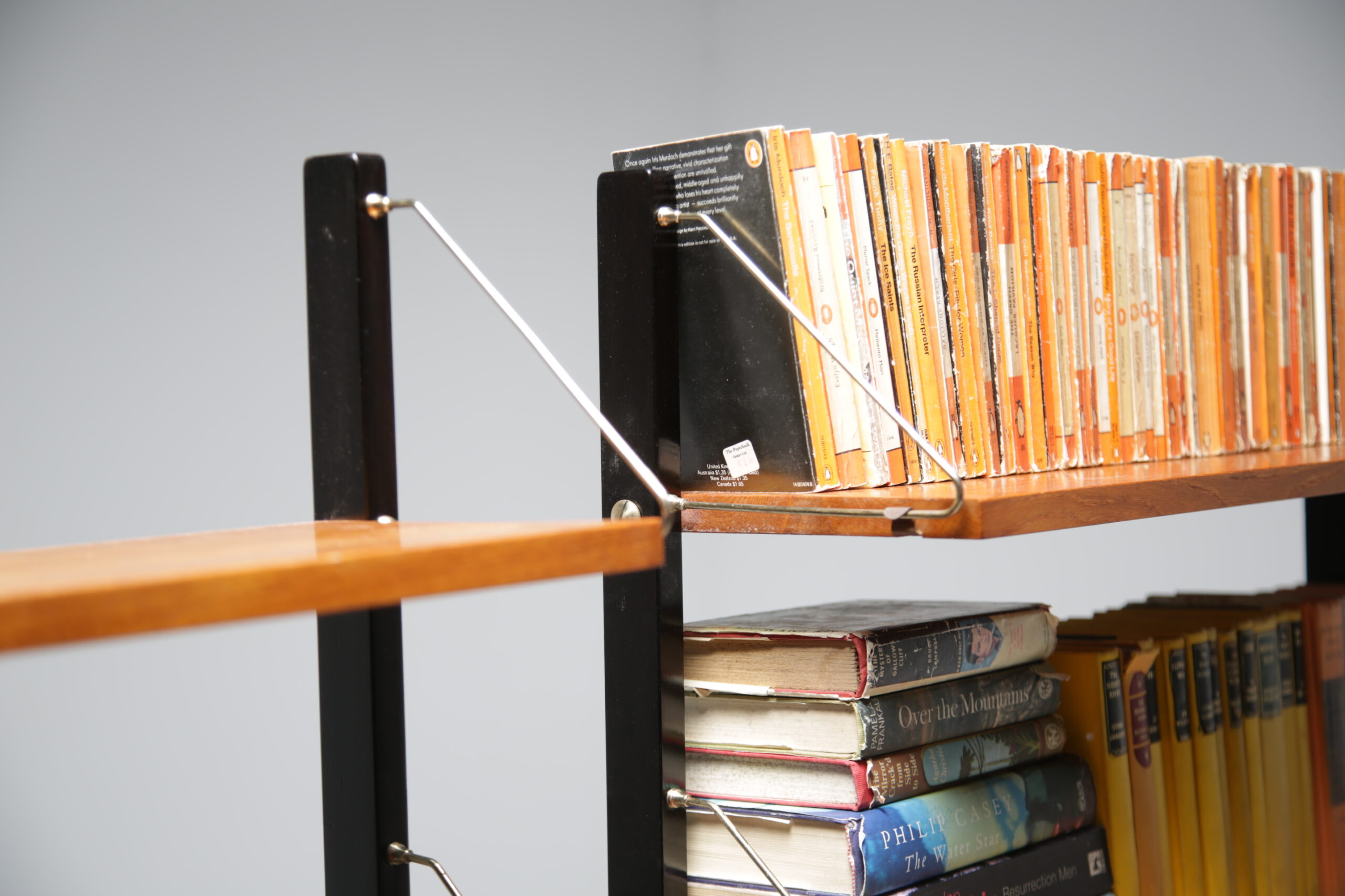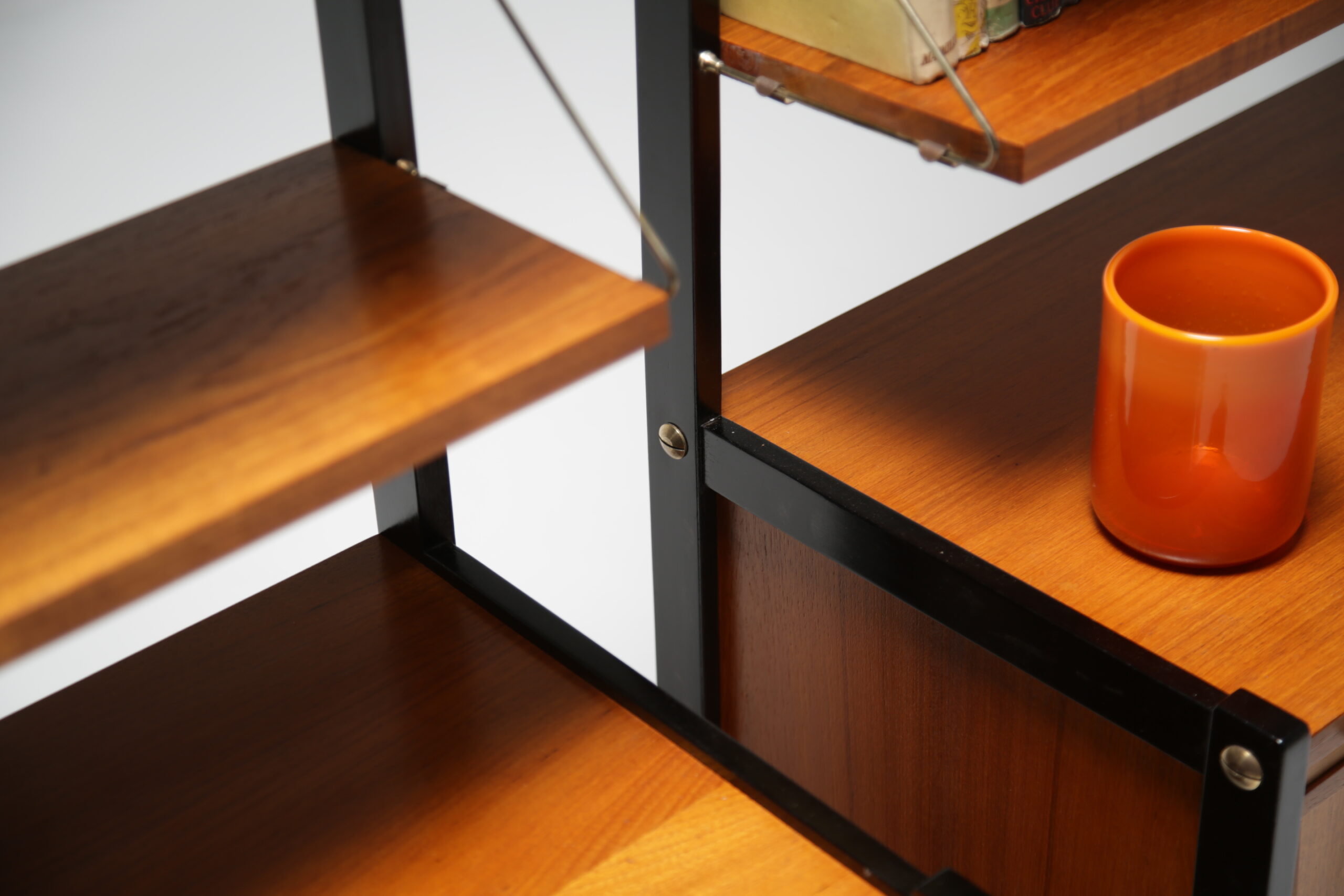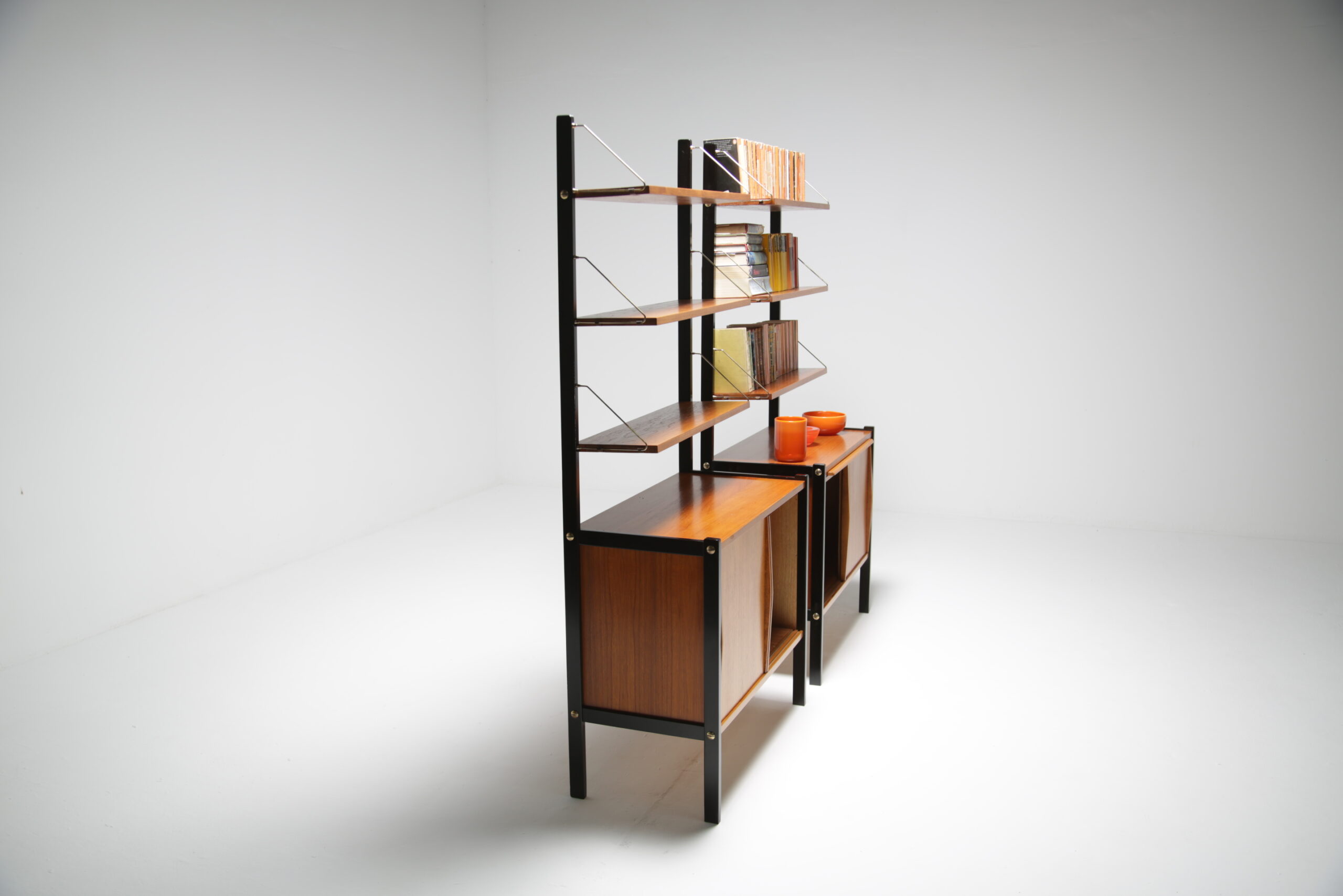 A Pair of Swedish teak bookcases with ebonised sides. A very good looking pair of bookcases with a nice contrast between the ebonised sides, the teak body and the brass hardware. Plenty of shelf space for books and some good storage beneath. One of the bookcases has a slide out desk top or bureau plat. This slide out shelf gives the user a very discreet and easily stowed away desk top to work on. The brass shelf supports and the other brass hardware again add a lovely contrast between the black sides and the teak. Both bookcases have been fully refurbished and are ready to go. Worldwide delivery available.