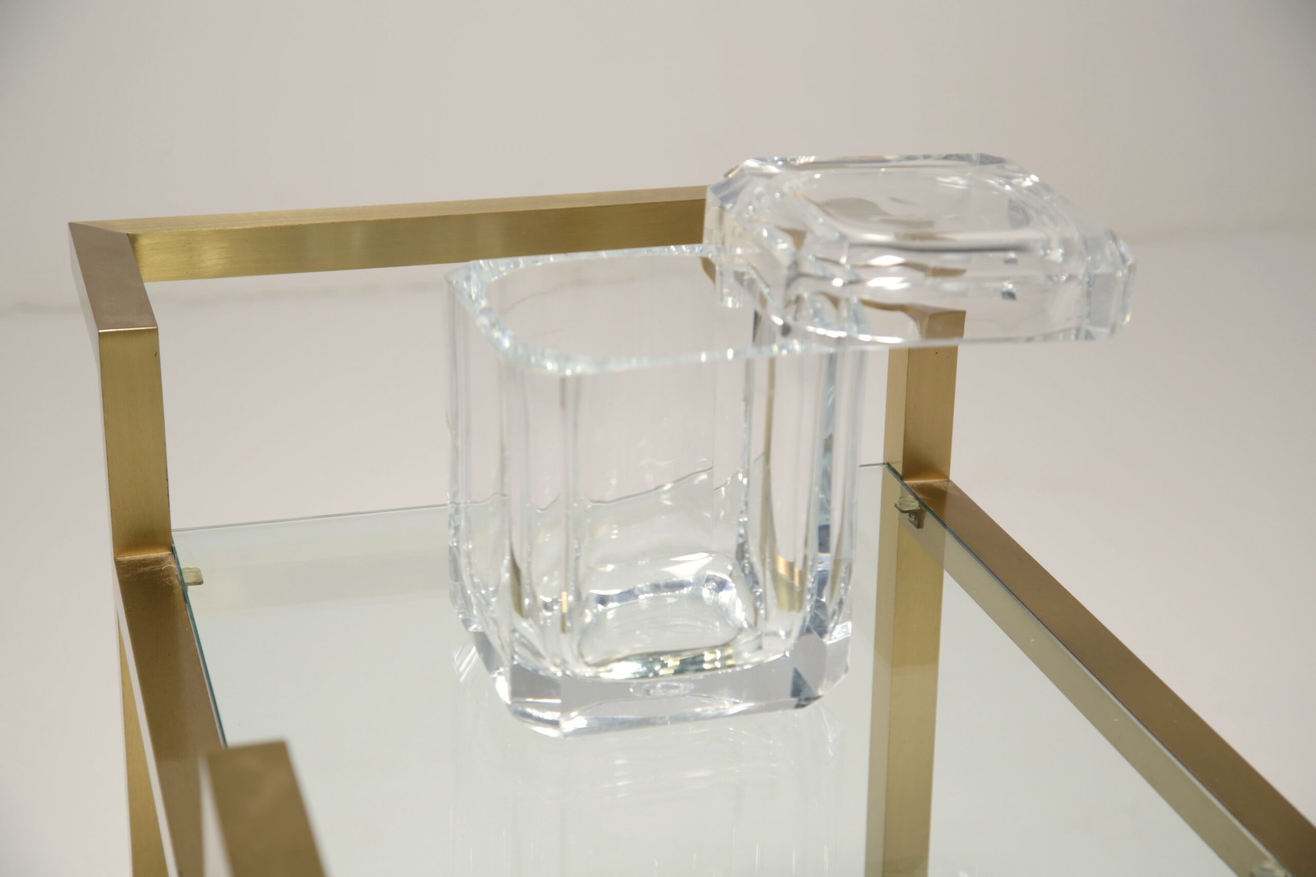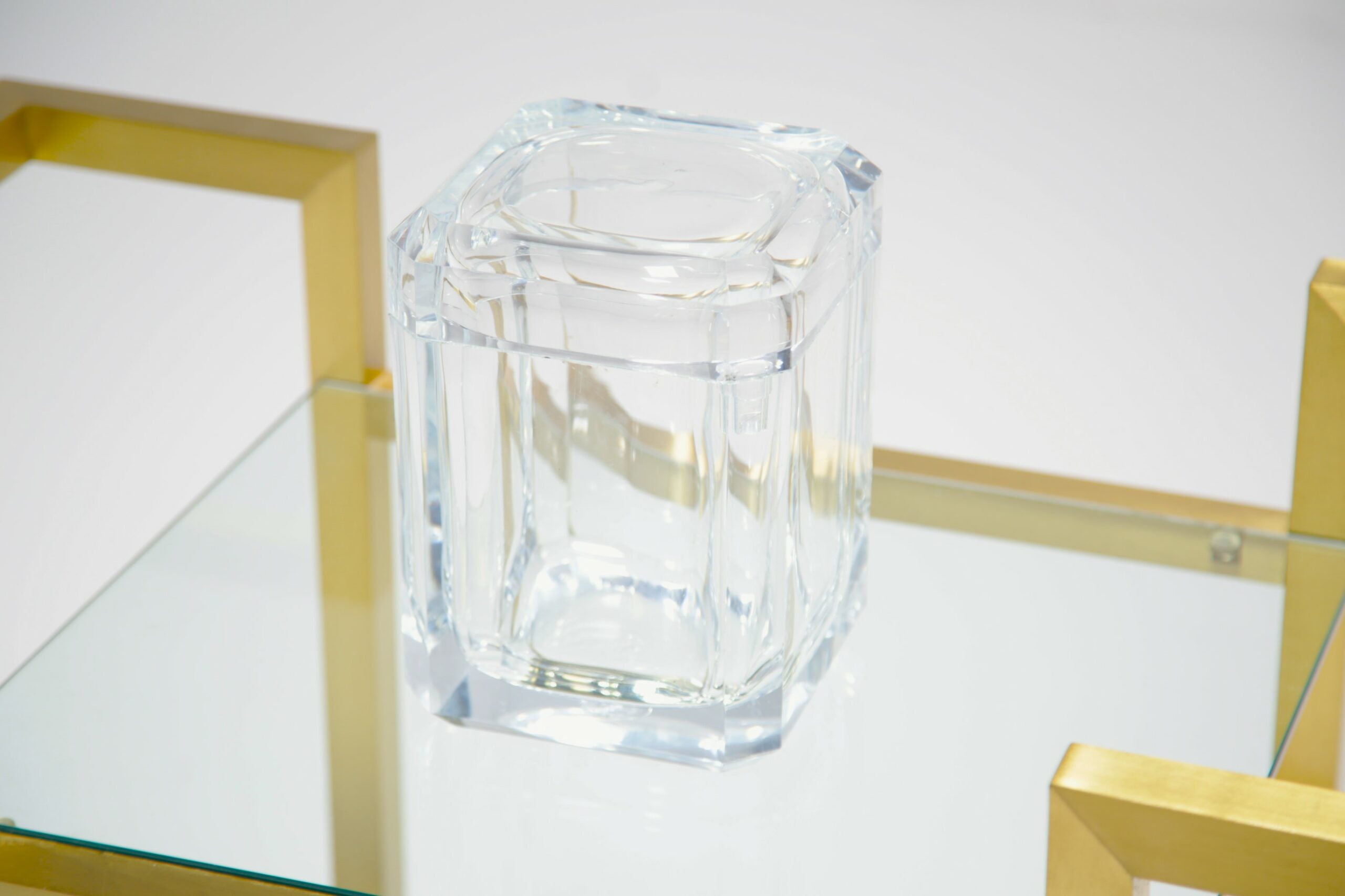 Made from high-quality Lucite, a transparent acrylic material synonymous with modern design, this ice bucket is both functional and a work of art. The sleek and seamless construction enhances its contemporary appeal, while the transparency of the Lucite allows the ice within to take center stage, elevating your beverage service to new heights of sophistication.
