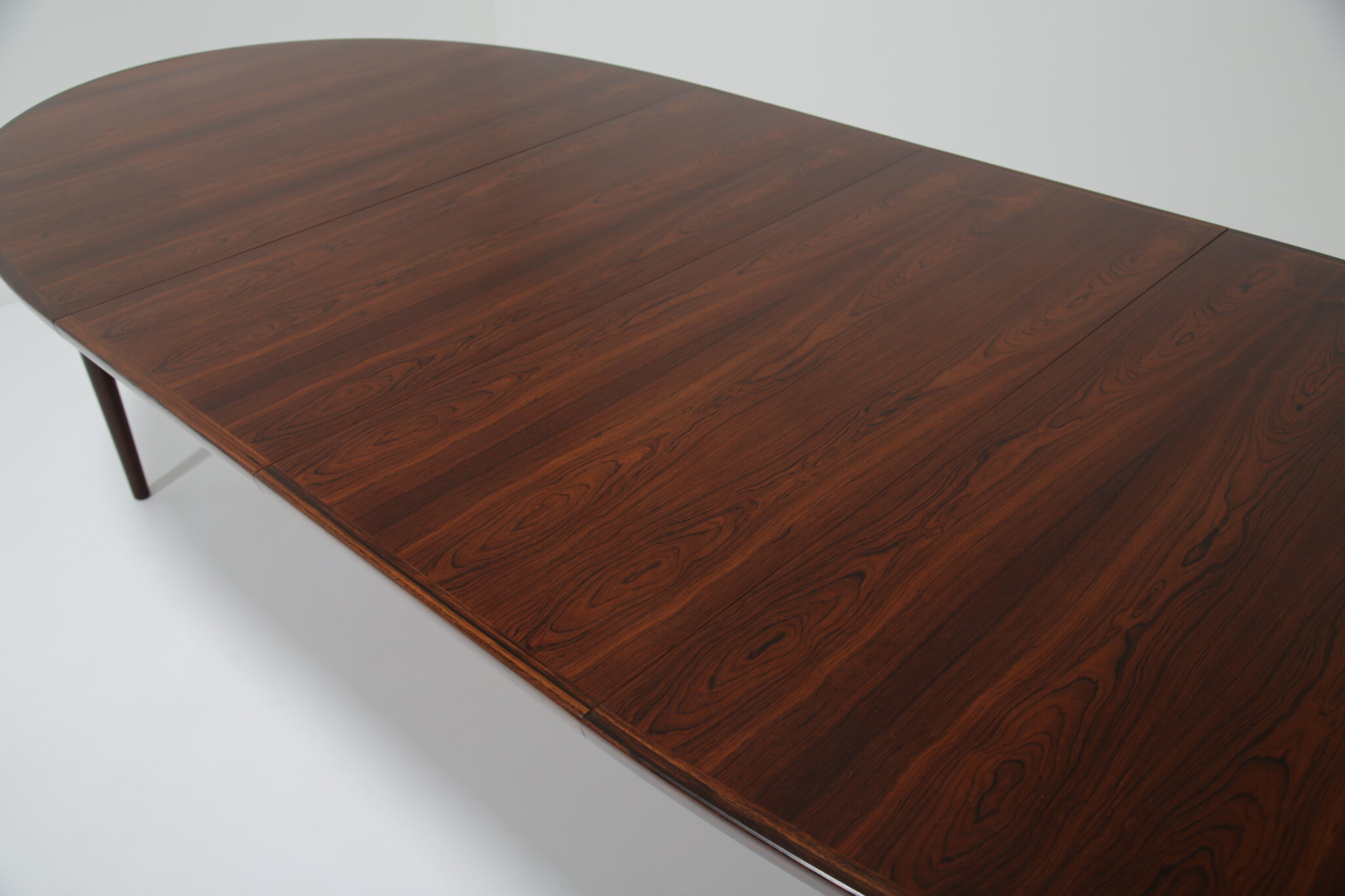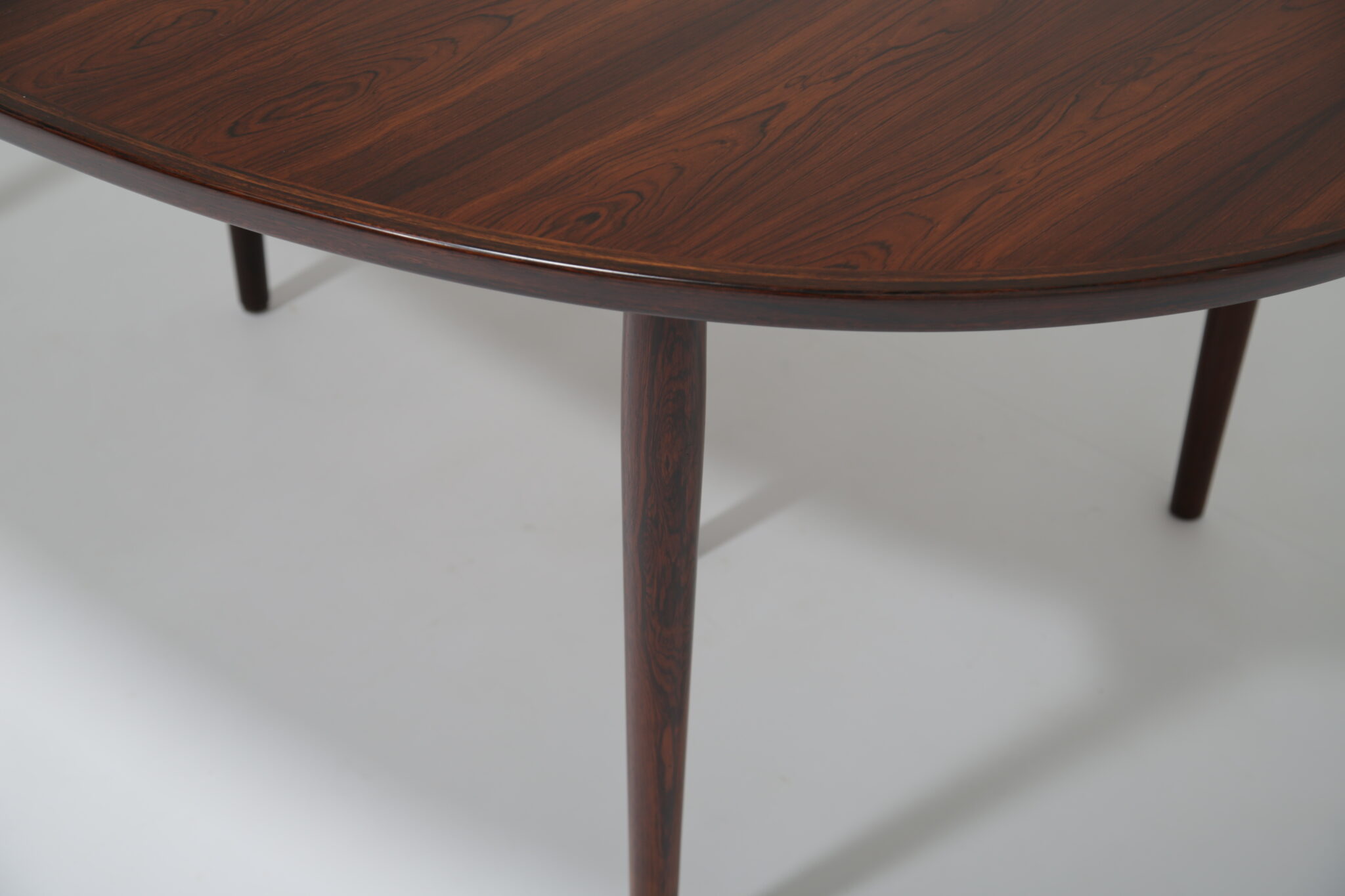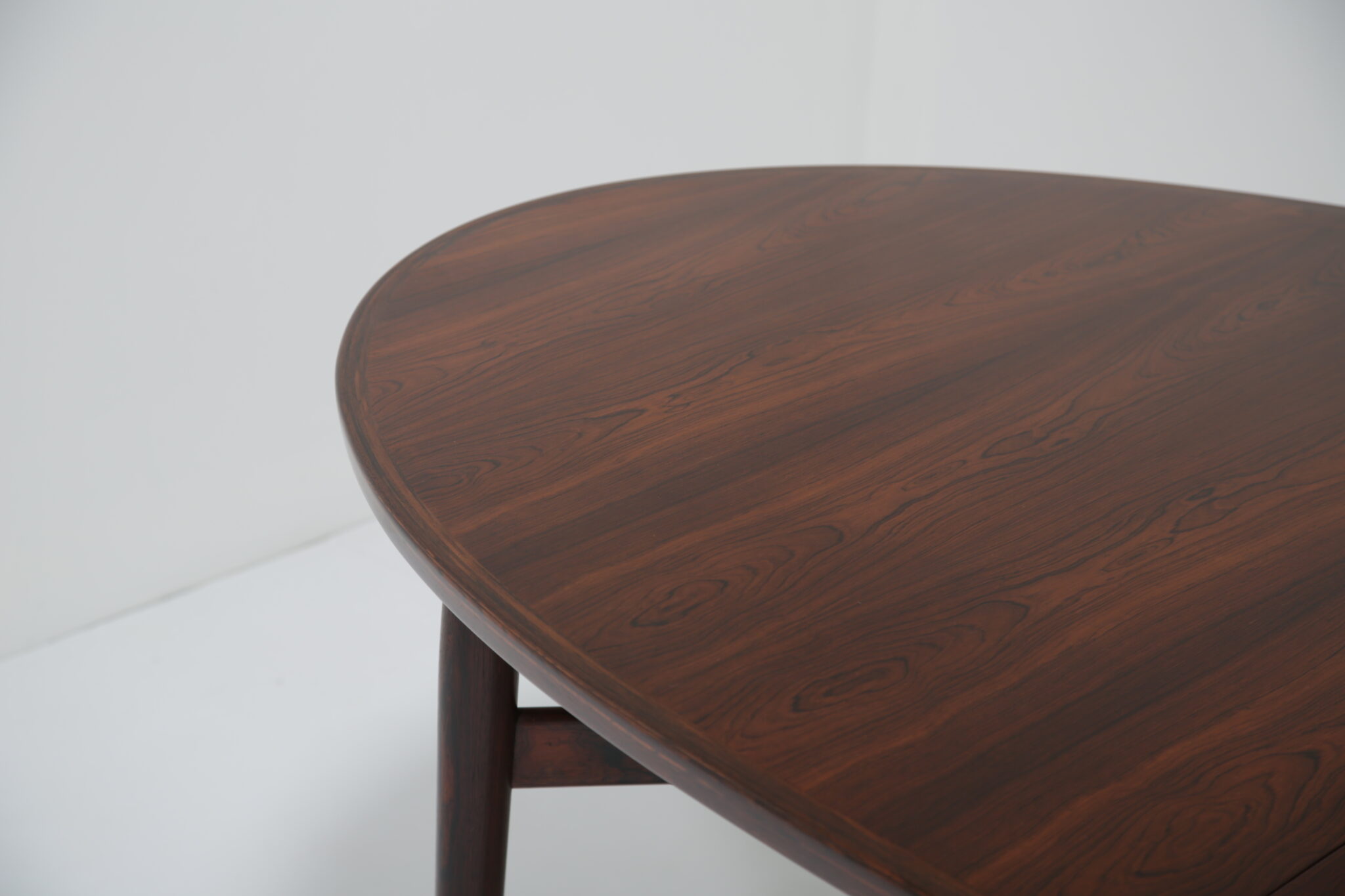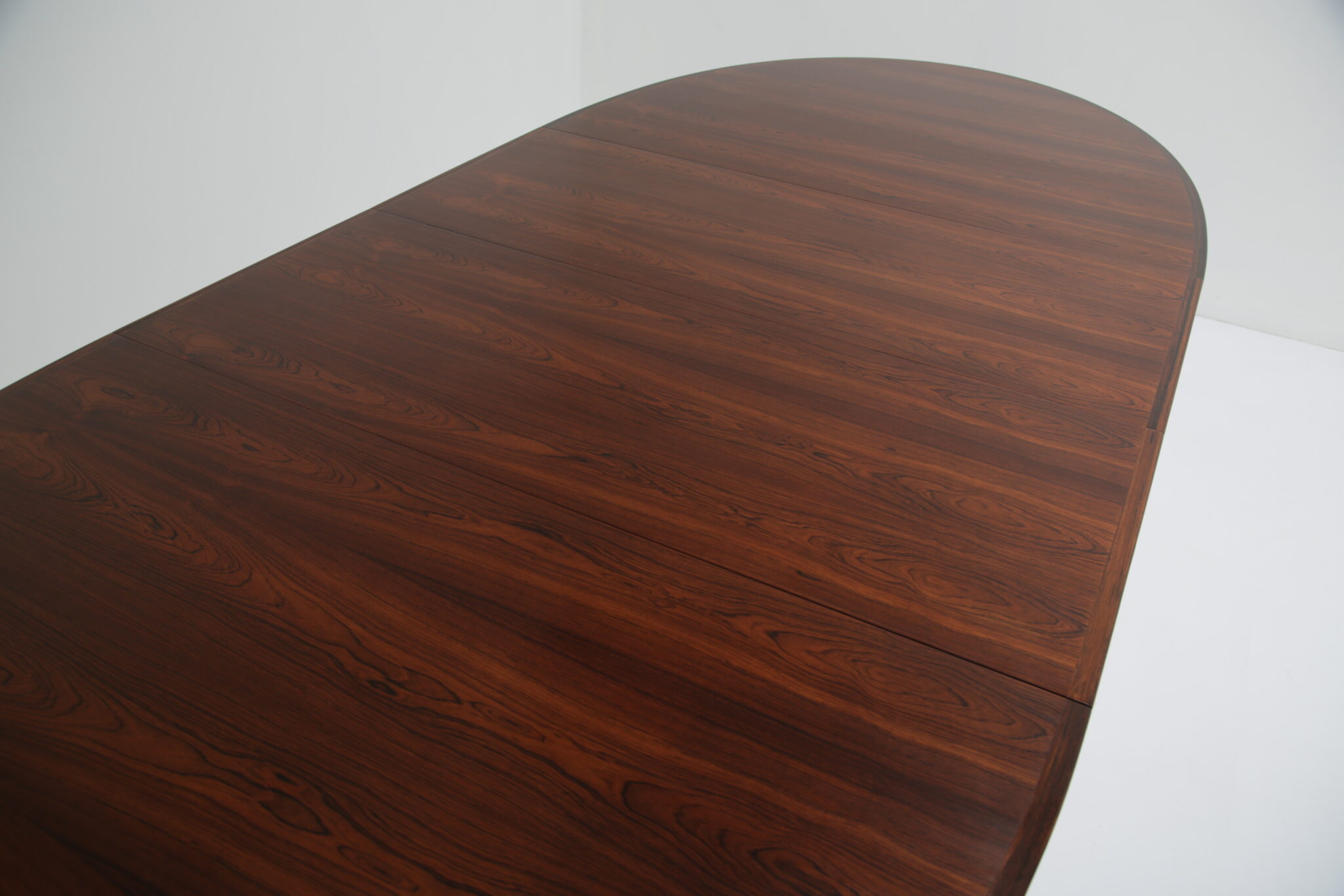 The table features an elegant oval top with softly tapered solid rosewood legs and two matching extension leaves, making it adaptable for everyday use or entertaining. The richness of the rosewood grain is extraordinary—deep, vivid, and meticulously book-matched—showcasing the craftsmanship that defines the best of Scandinavian mid-century design.
