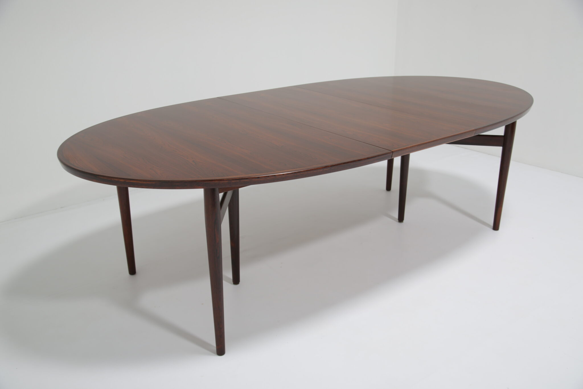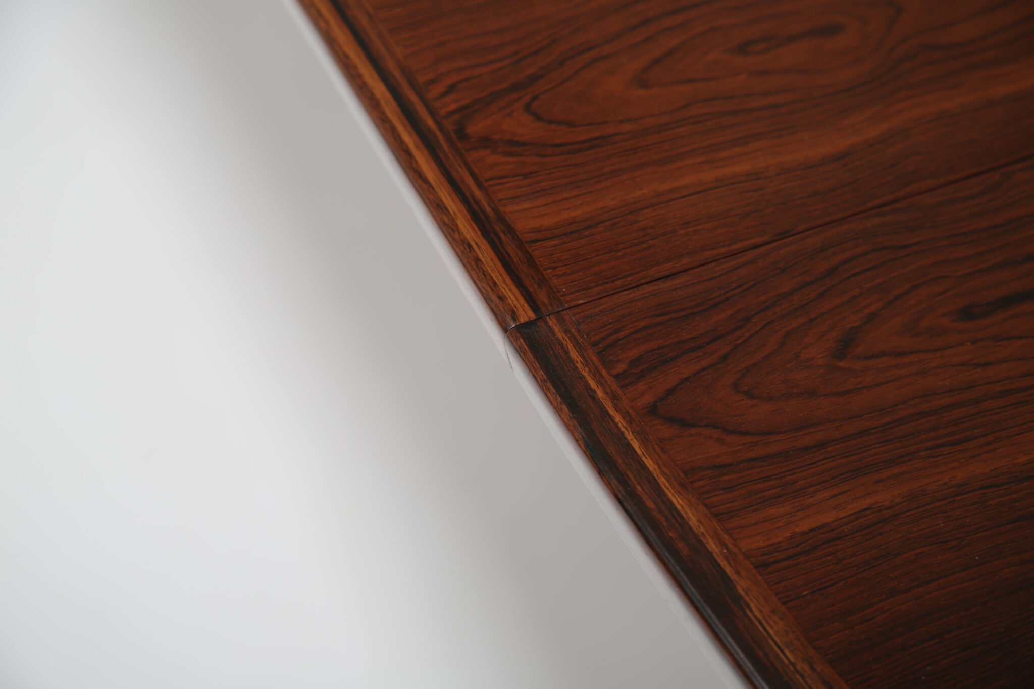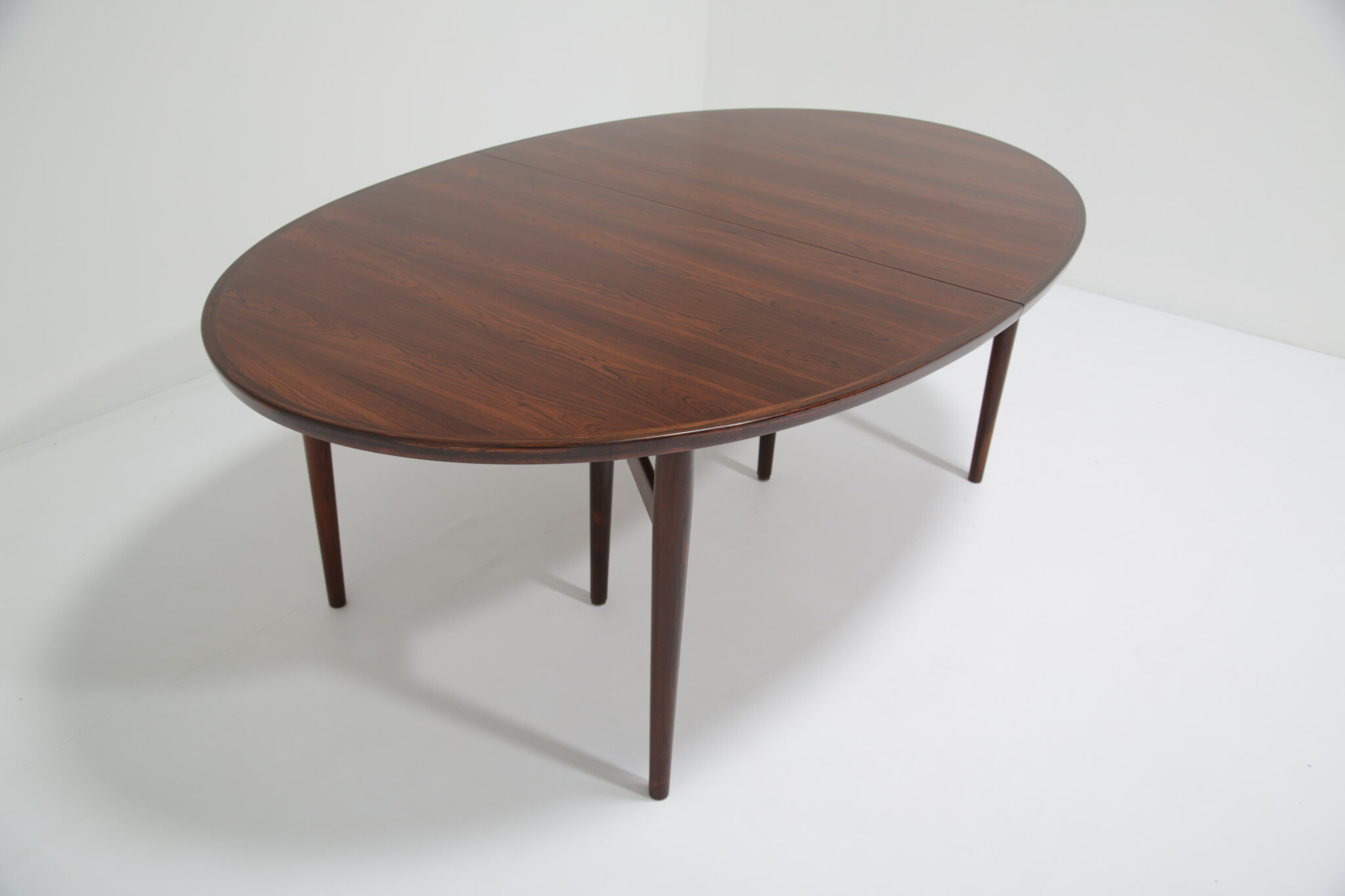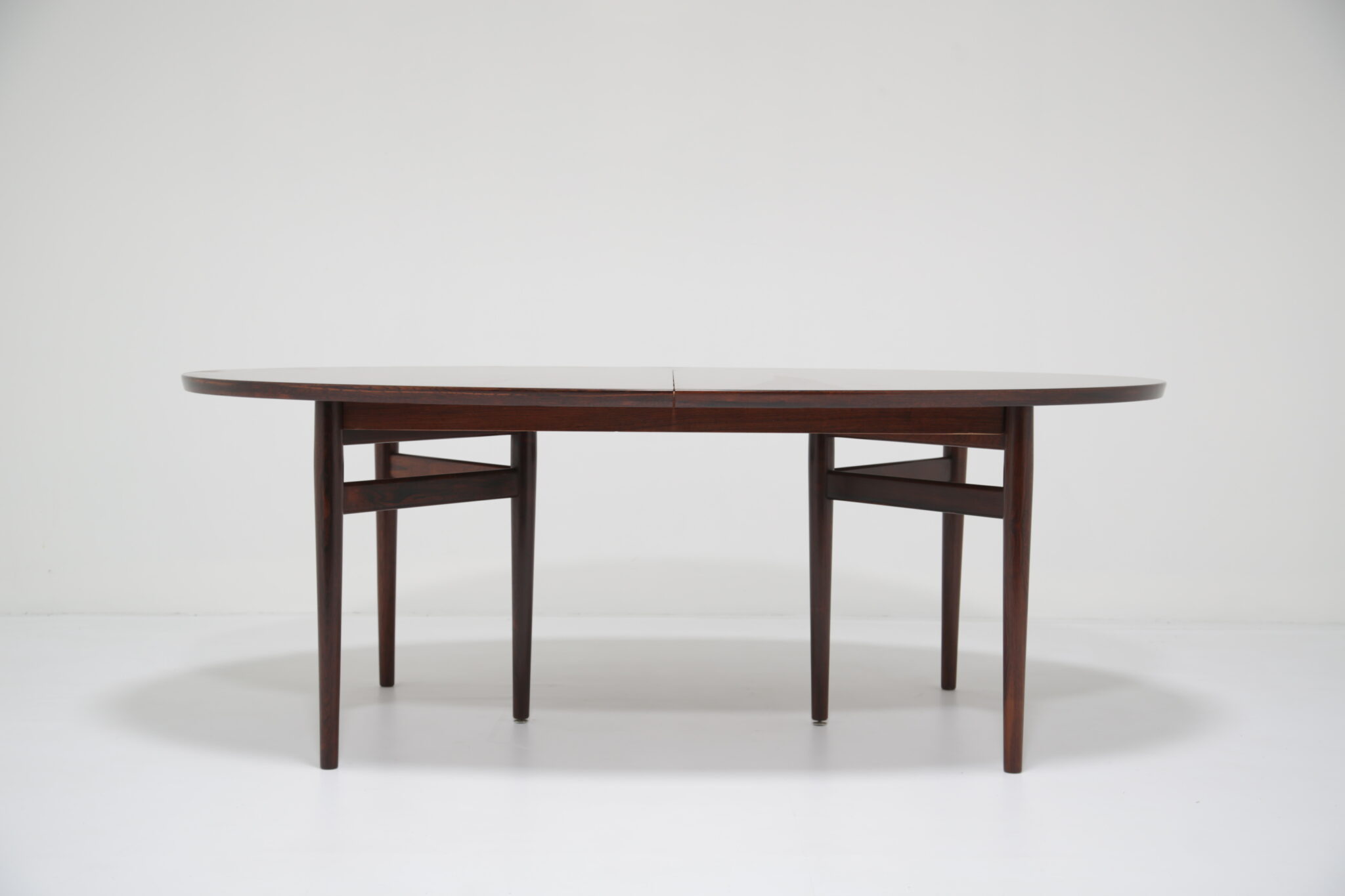 The table features an elegant oval top with softly tapered solid rosewood legs and two matching extension leaves, making it adaptable for everyday use or entertaining. The richness of the rosewood grain is extraordinary—deep, vivid, and meticulously book-matched—showcasing the craftsmanship that defines the best of Scandinavian mid-century design.
