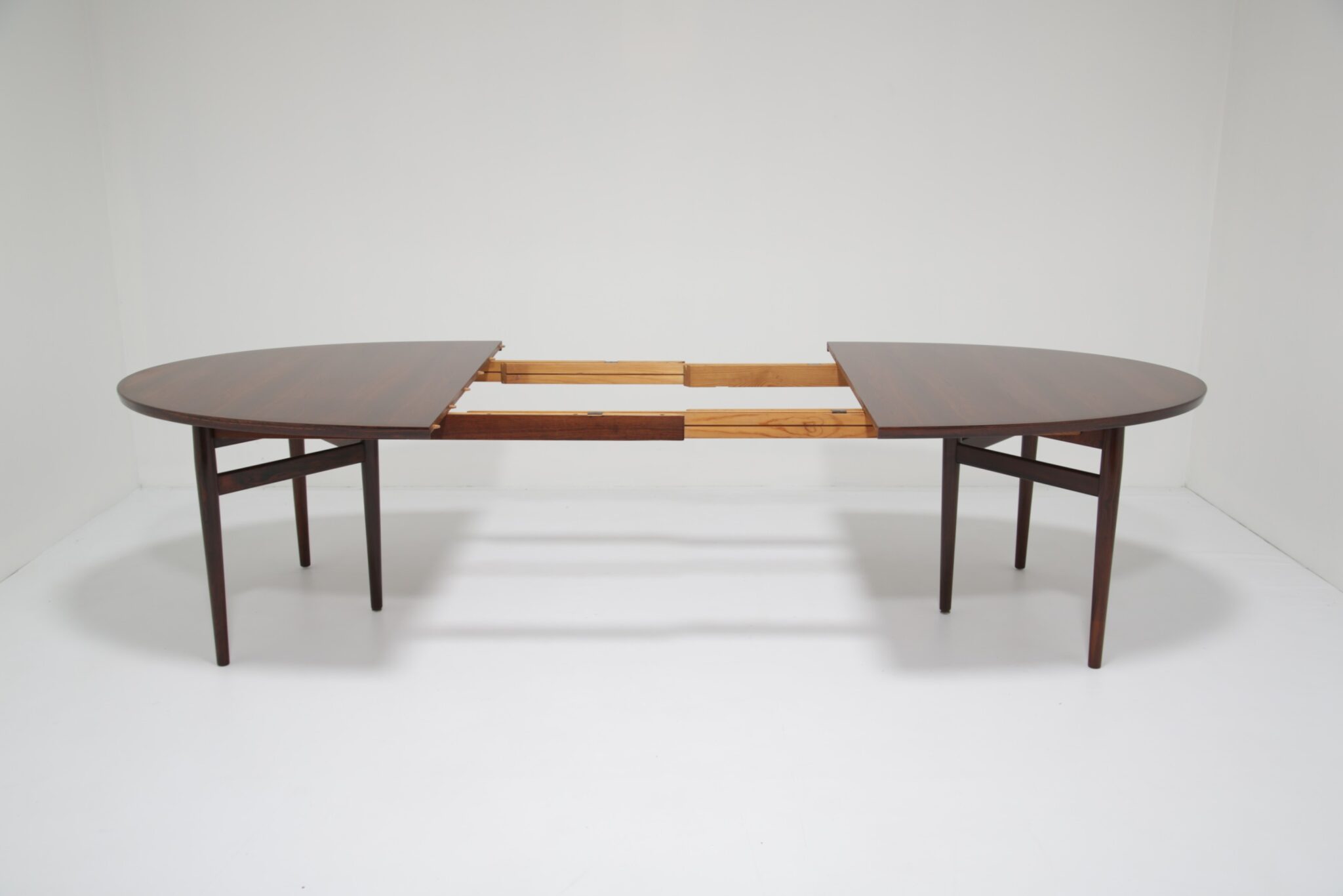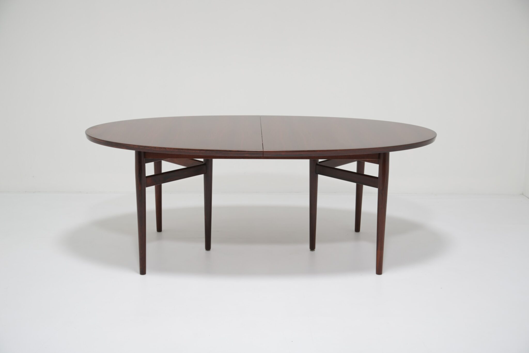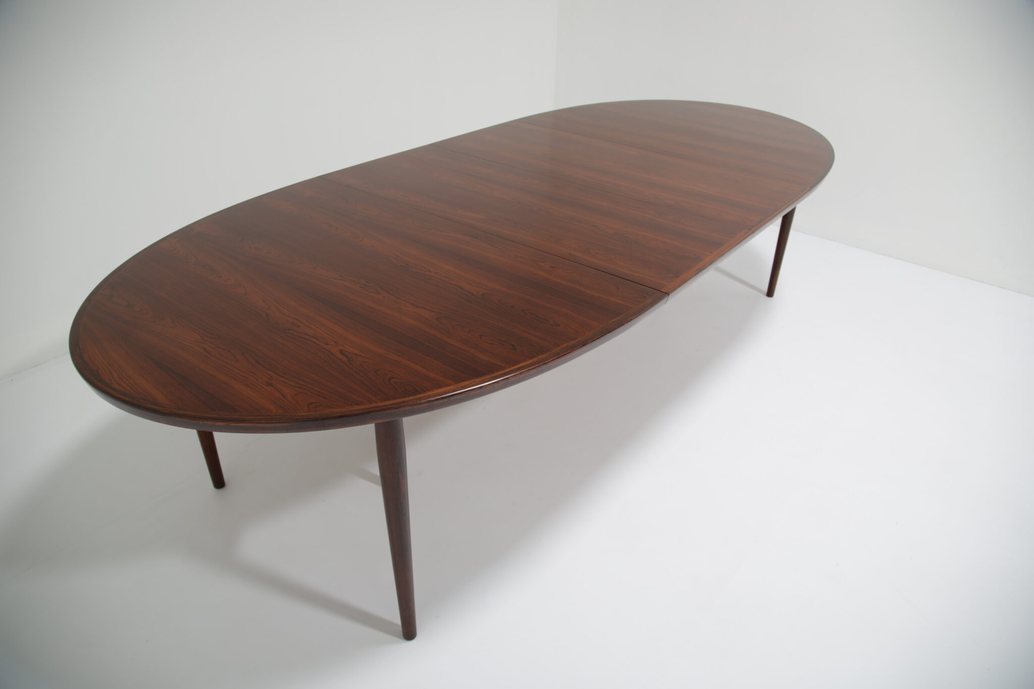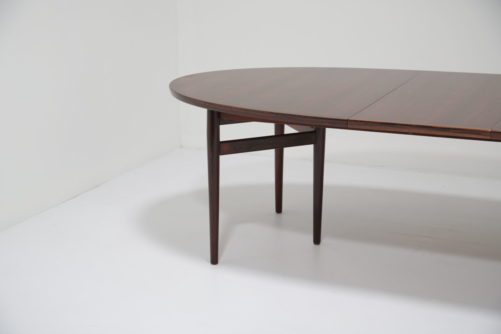 The table features an elegant oval top with softly tapered solid rosewood legs and two matching extension leaves, making it adaptable for everyday use or entertaining. The richness of the rosewood grain is extraordinary—deep, vivid, and meticulously book-matched—showcasing the craftsmanship that defines the best of Scandinavian mid-century design.