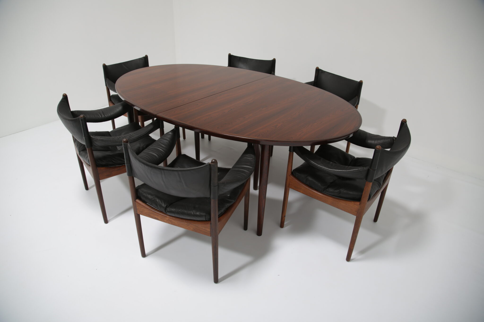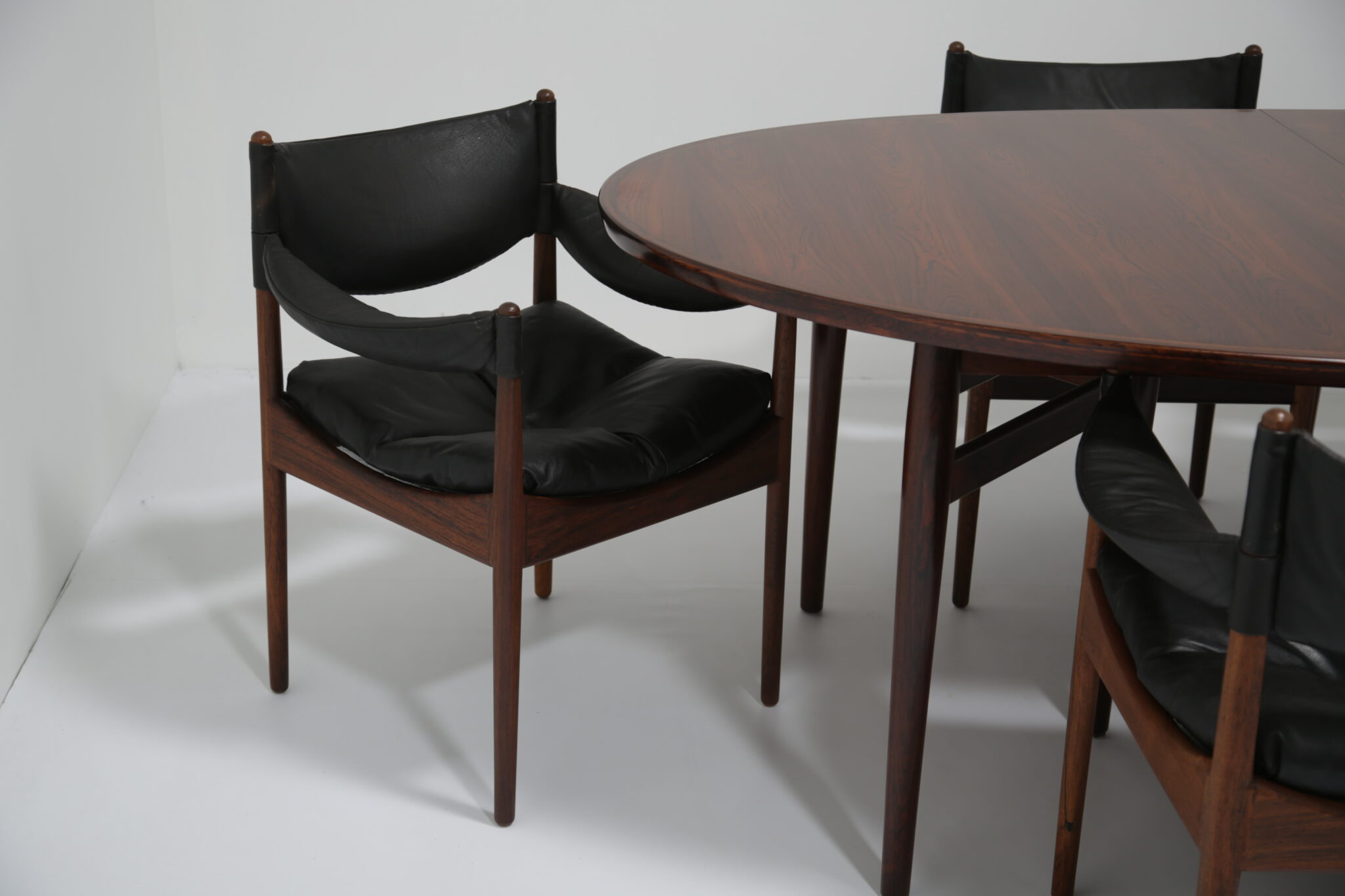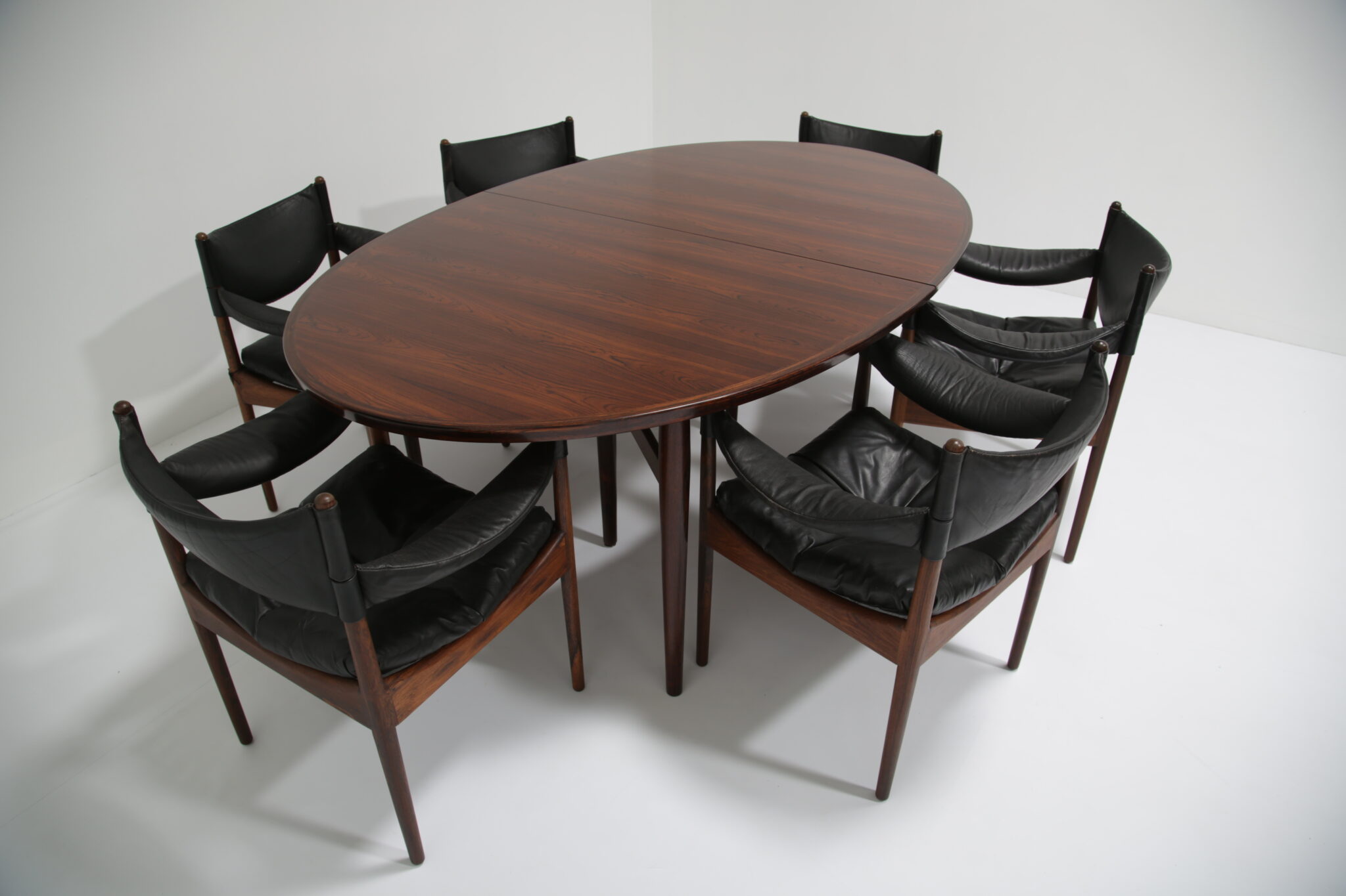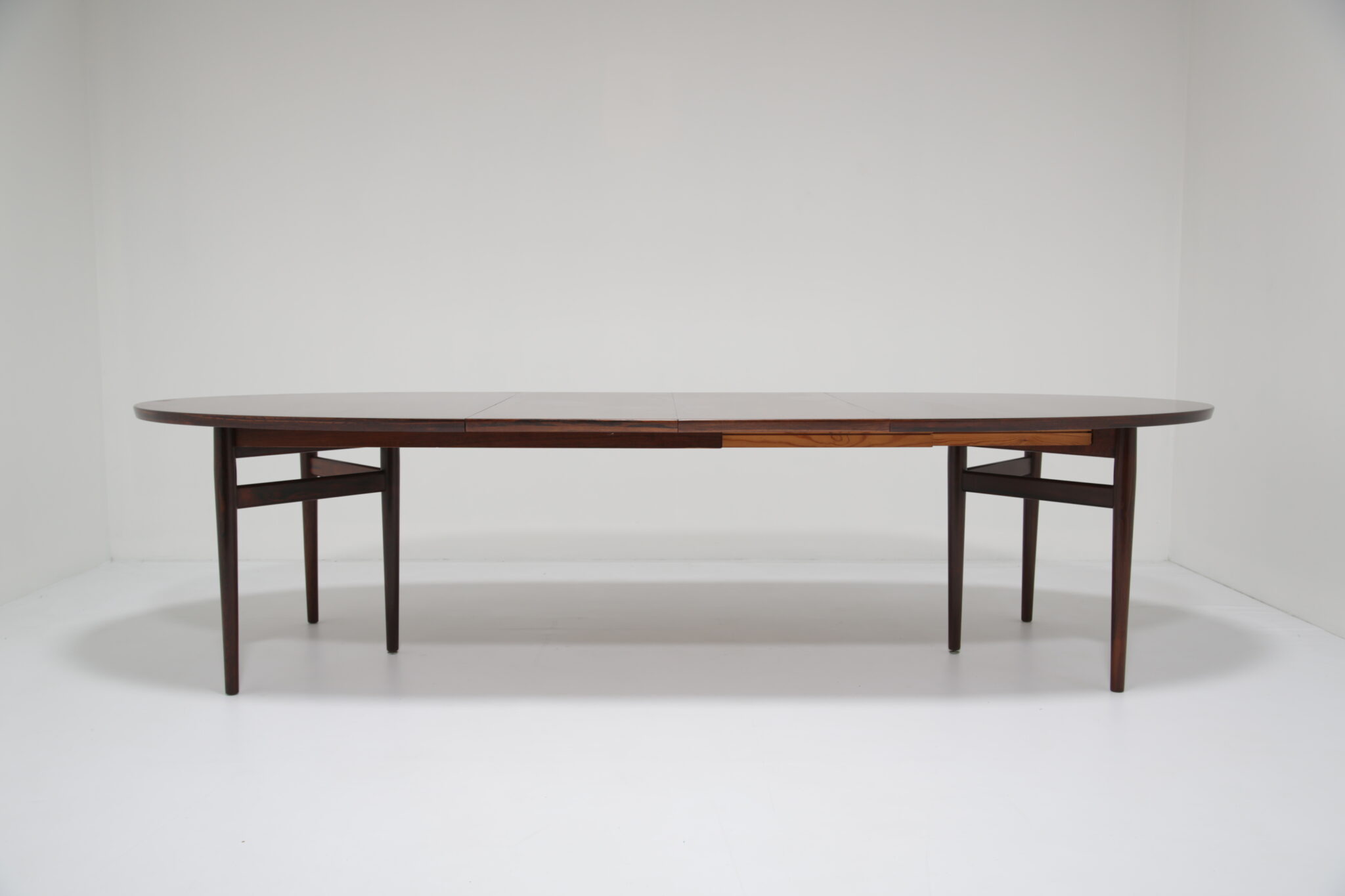 The table features an elegant oval top with softly tapered solid rosewood legs and two matching extension leaves, making it adaptable for everyday use or entertaining. The richness of the rosewood grain is extraordinary—deep, vivid, and meticulously book-matched—showcasing the craftsmanship that defines the best of Scandinavian mid-century design.