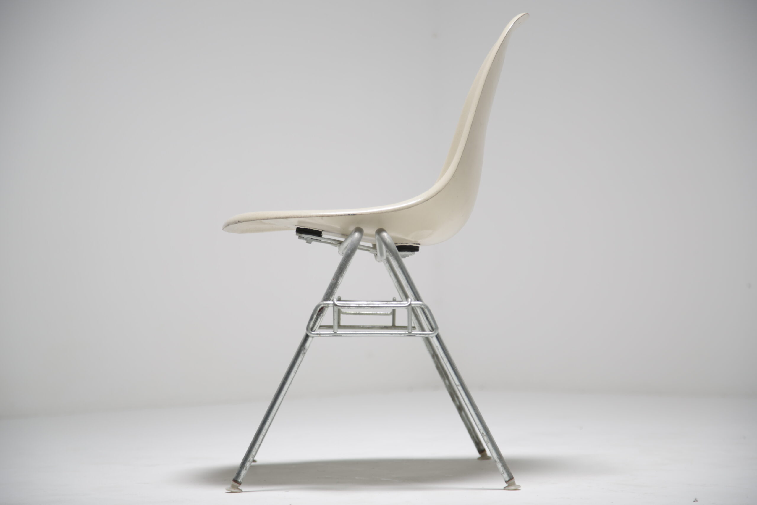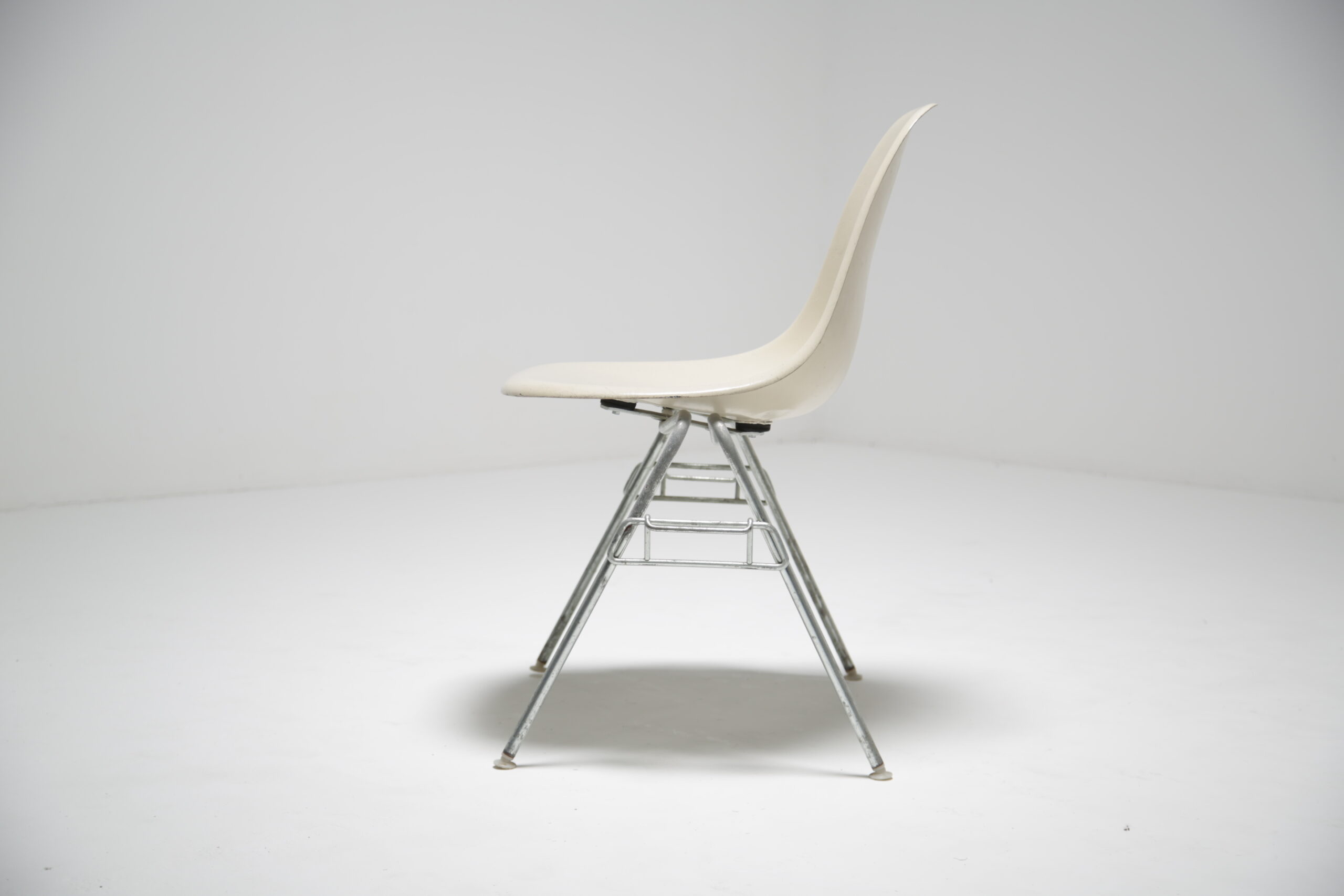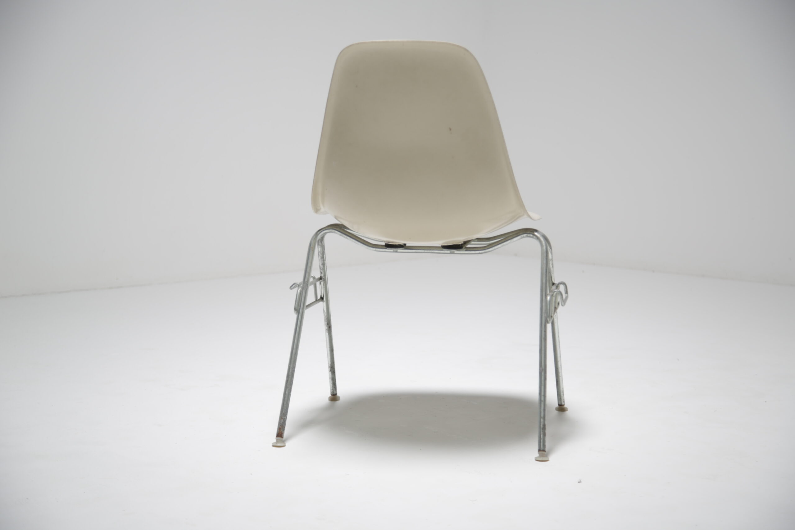 Vintage White Stacking Chair – Style, functionality and innovation, Charles and Ray Eames where certainly ahead of their time when it came to seating and is still iconic today. DSS, which stands for “dining side stacking,” encapsulates the essence of versatile seating. Its sleek chrome frame base combined with a seat in fiberglass not only adds a touch of modern elegance but also provides robust support that ensures lasting durability.