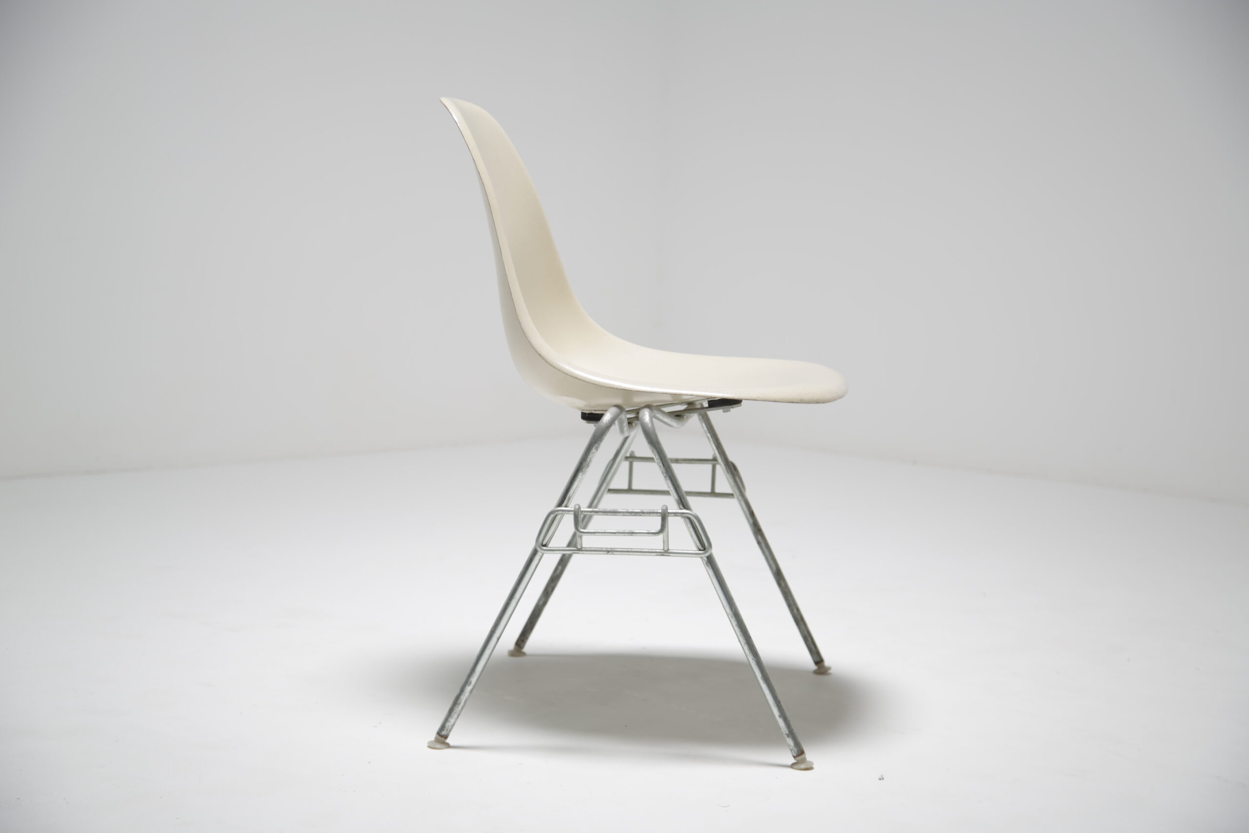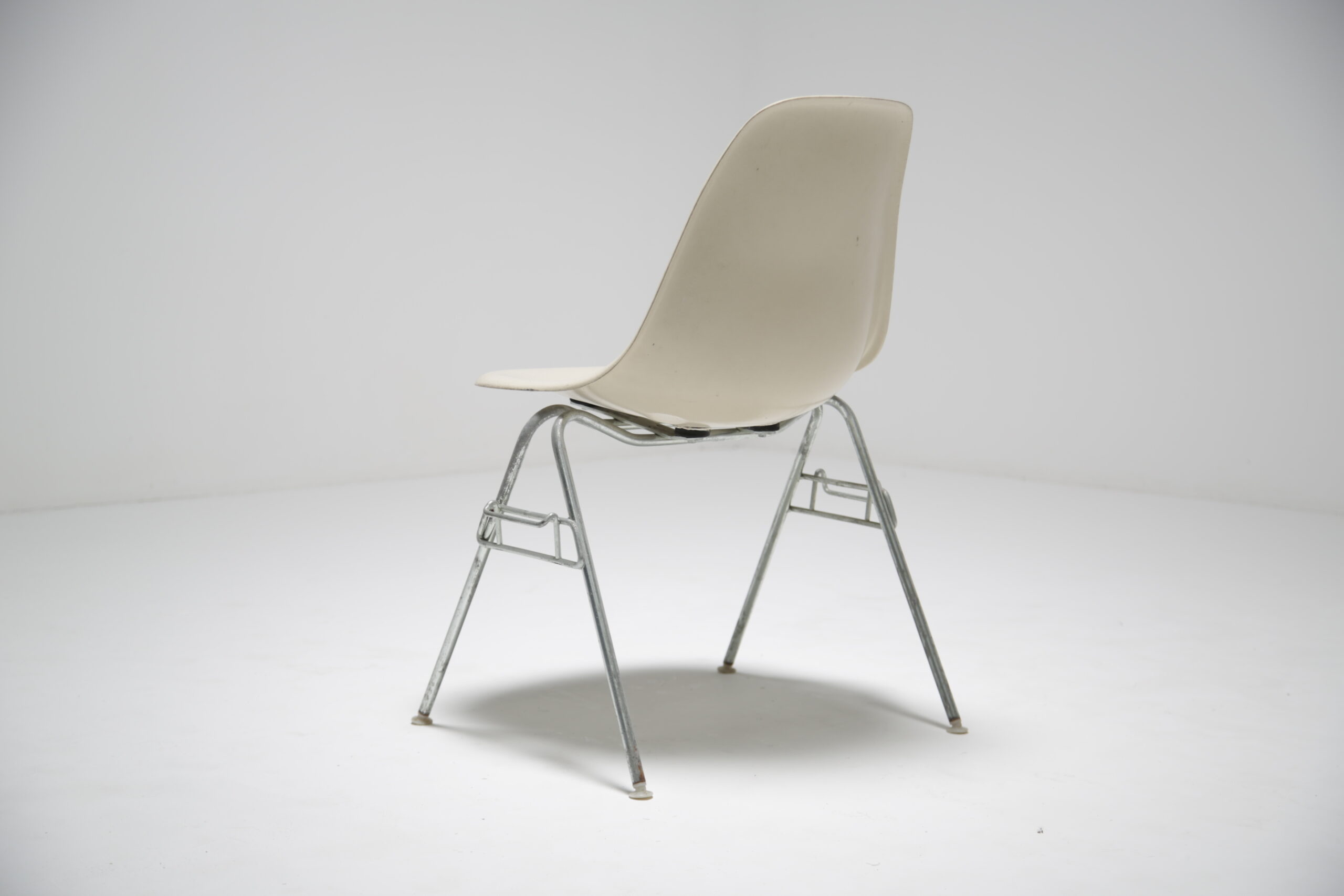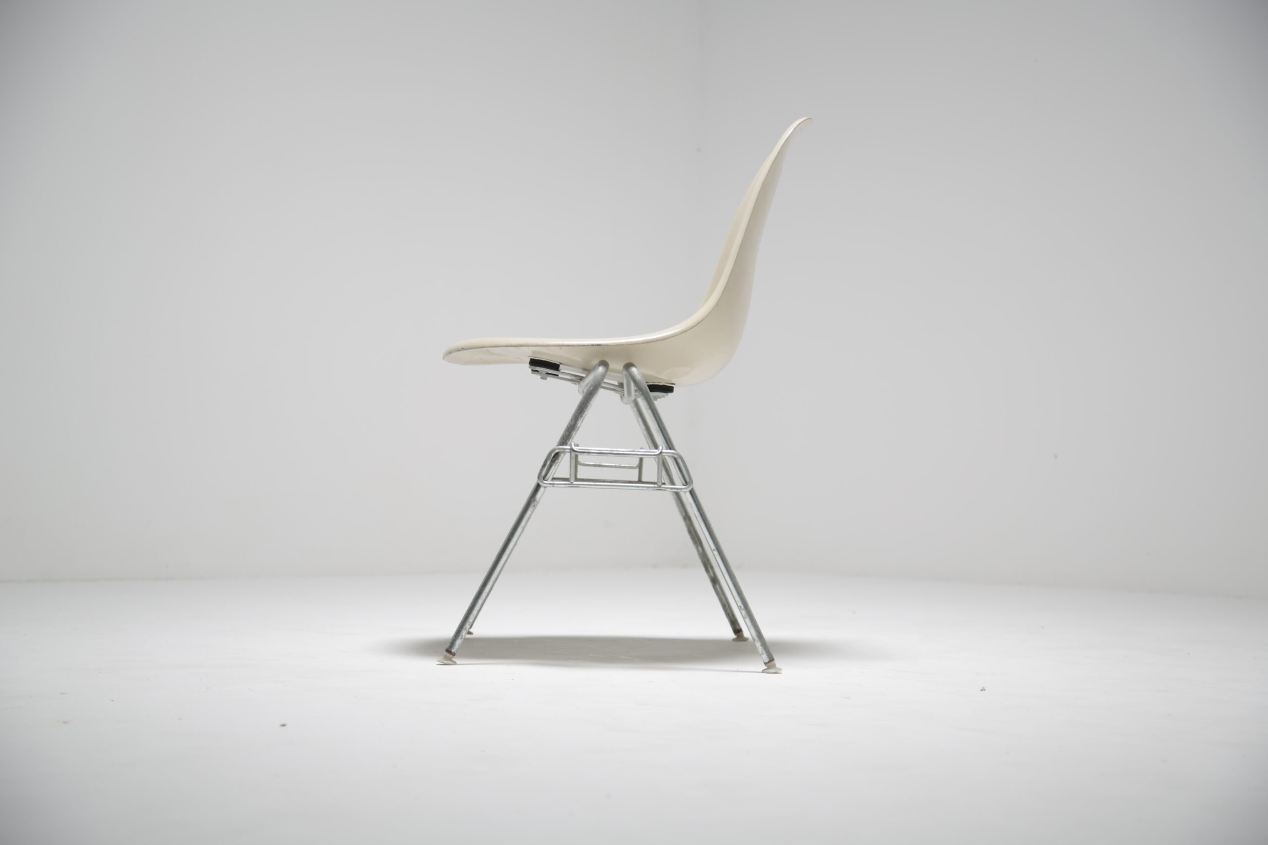 Vintage White Stacking Chair – Style, functionality and innovation, Charles and Ray Eames where certainly ahead of their time when it came to seating and is still iconic today. DSS, which stands for “dining side stacking,” encapsulates the essence of versatile seating. Its sleek chrome frame base combined with a seat in fiberglass not only adds a touch of modern elegance but also provides robust support that ensures lasting durability.
