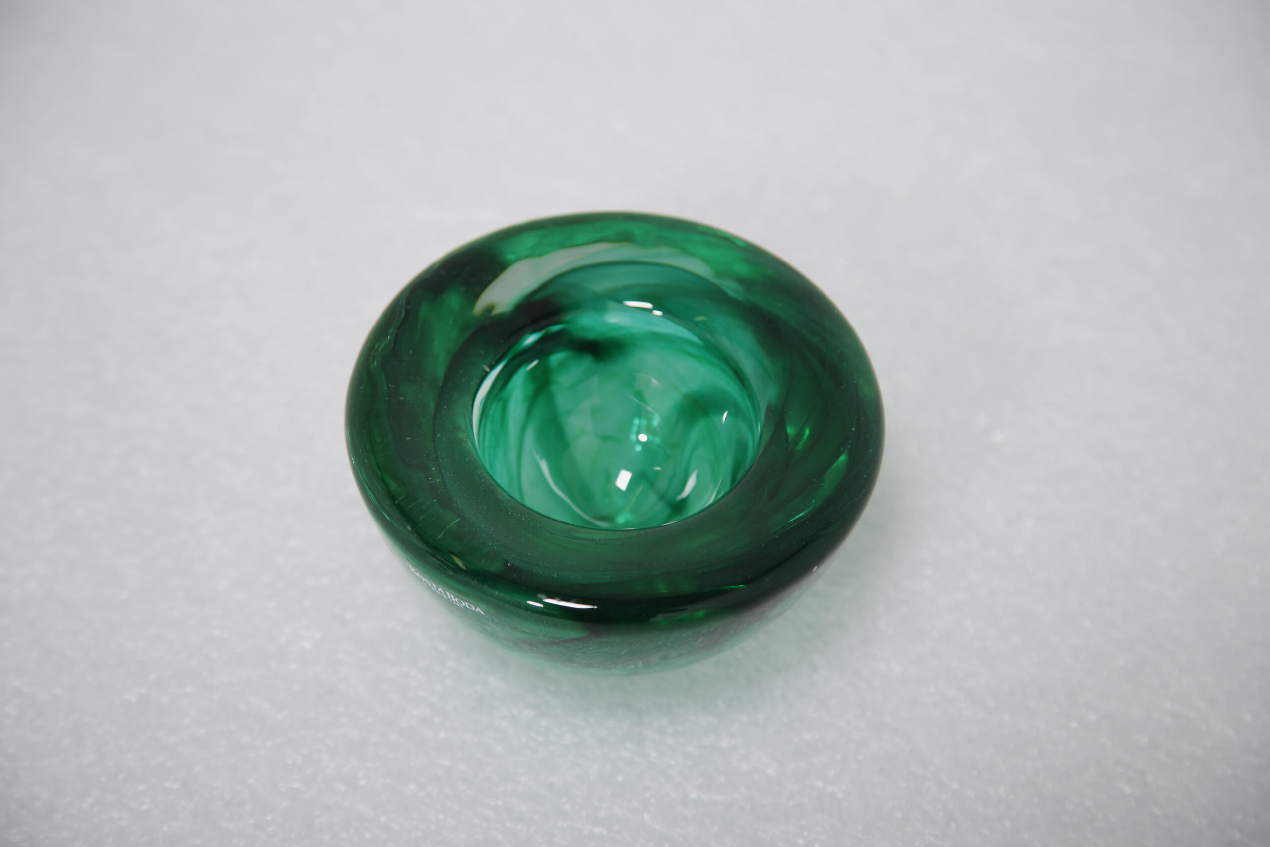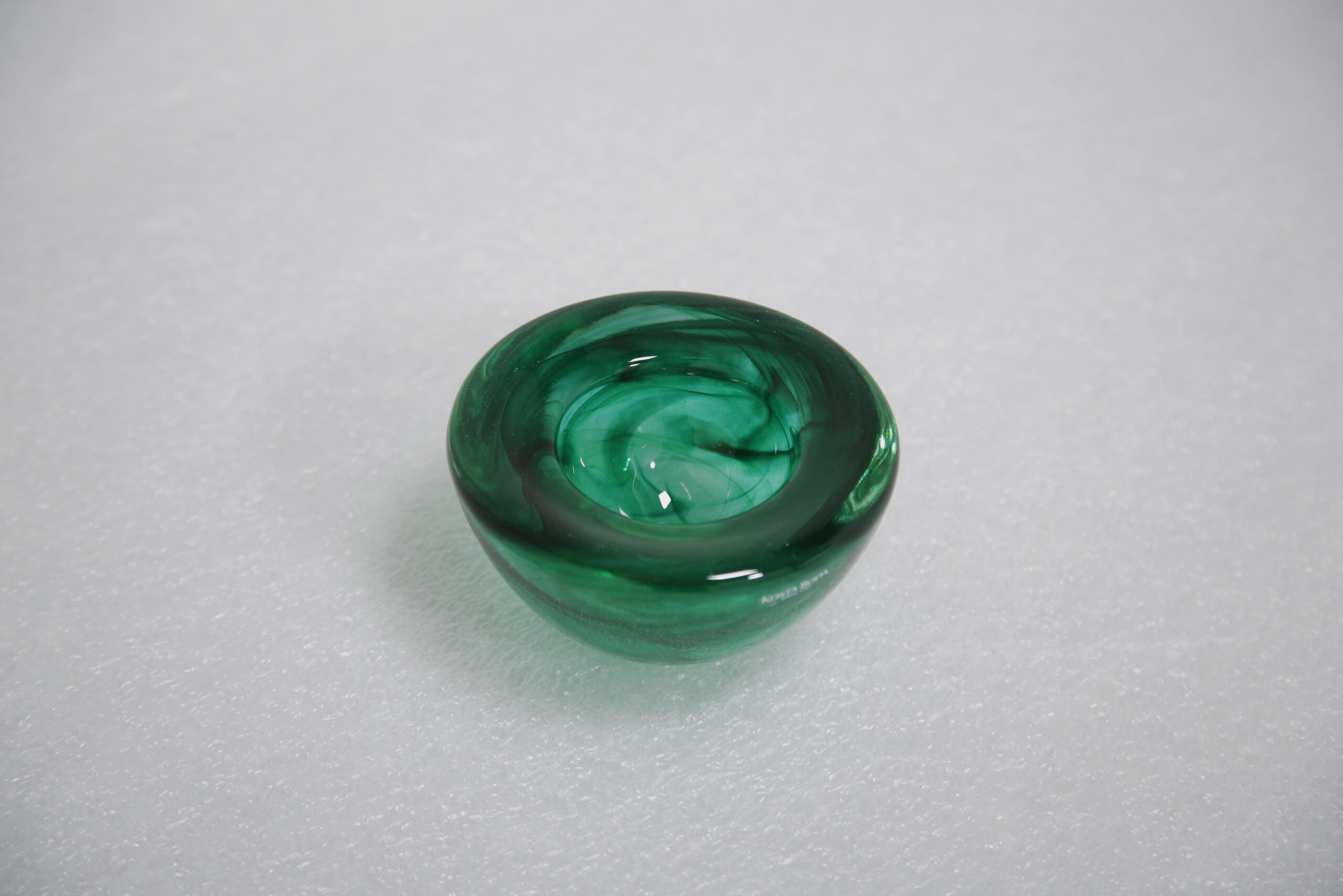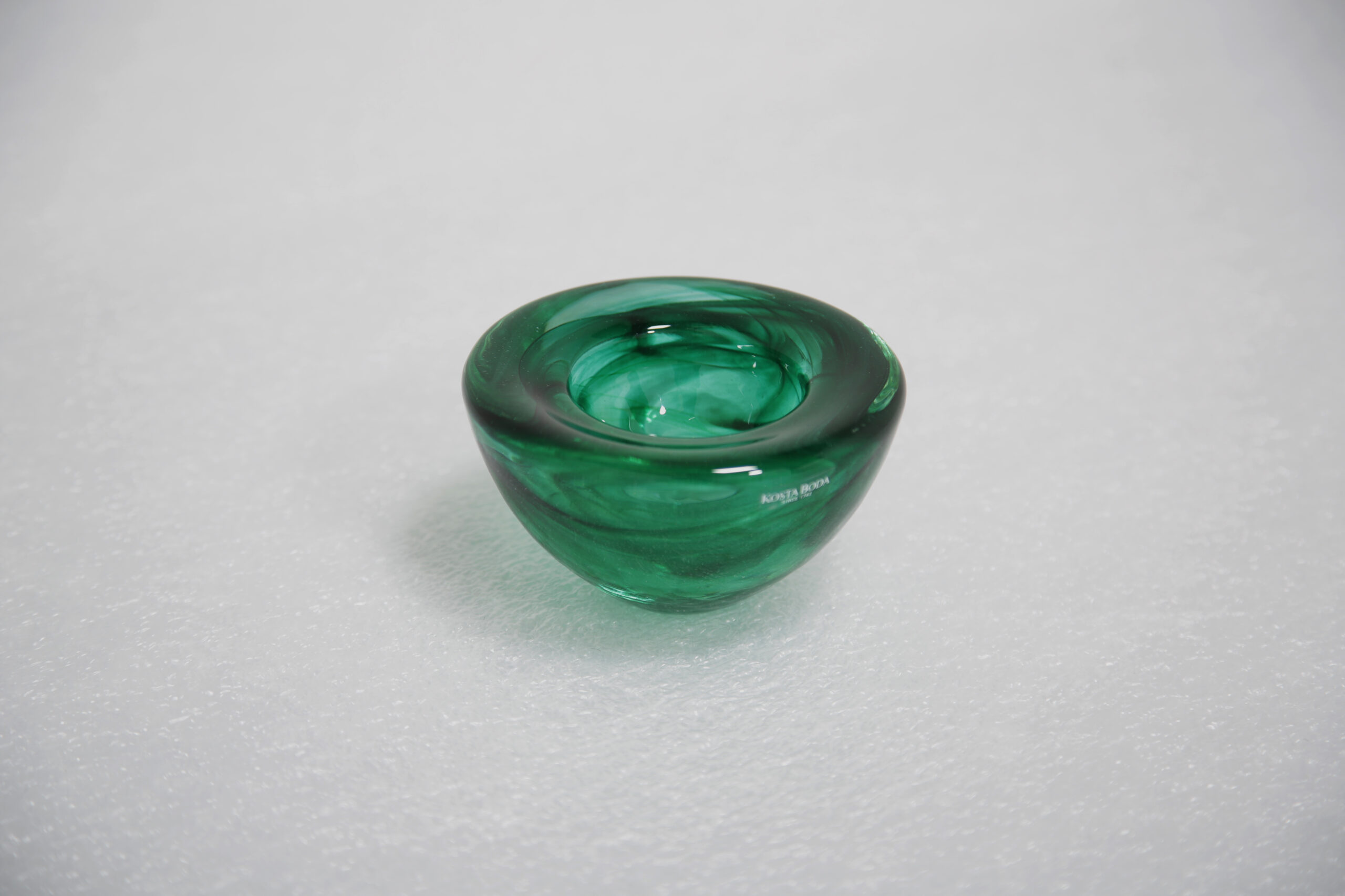 Designed by Swedish glass artist Anna Ehrner for Kosta Boda, this sculptural emerald green glass tealight holder forms part of the “Atoll” collection, known for its organic swirls and fluid glass motion. Featuring a vibrant, richly saturated green tone, the piece displays characteristic ribbon-like movement within the glass body—a hallmark of Ehrner’s work, which explores transparency, color play and the natural flow of molten glass. Compact in form yet visually dynamic, it functions beautifully as a tealight candleholder while also serving as a decorative accent within a contemporary or mid-century interior. Ehrner, recognized for her ability to capture motion within stillness, brings sculptural sensitivity to an everyday object through this design.