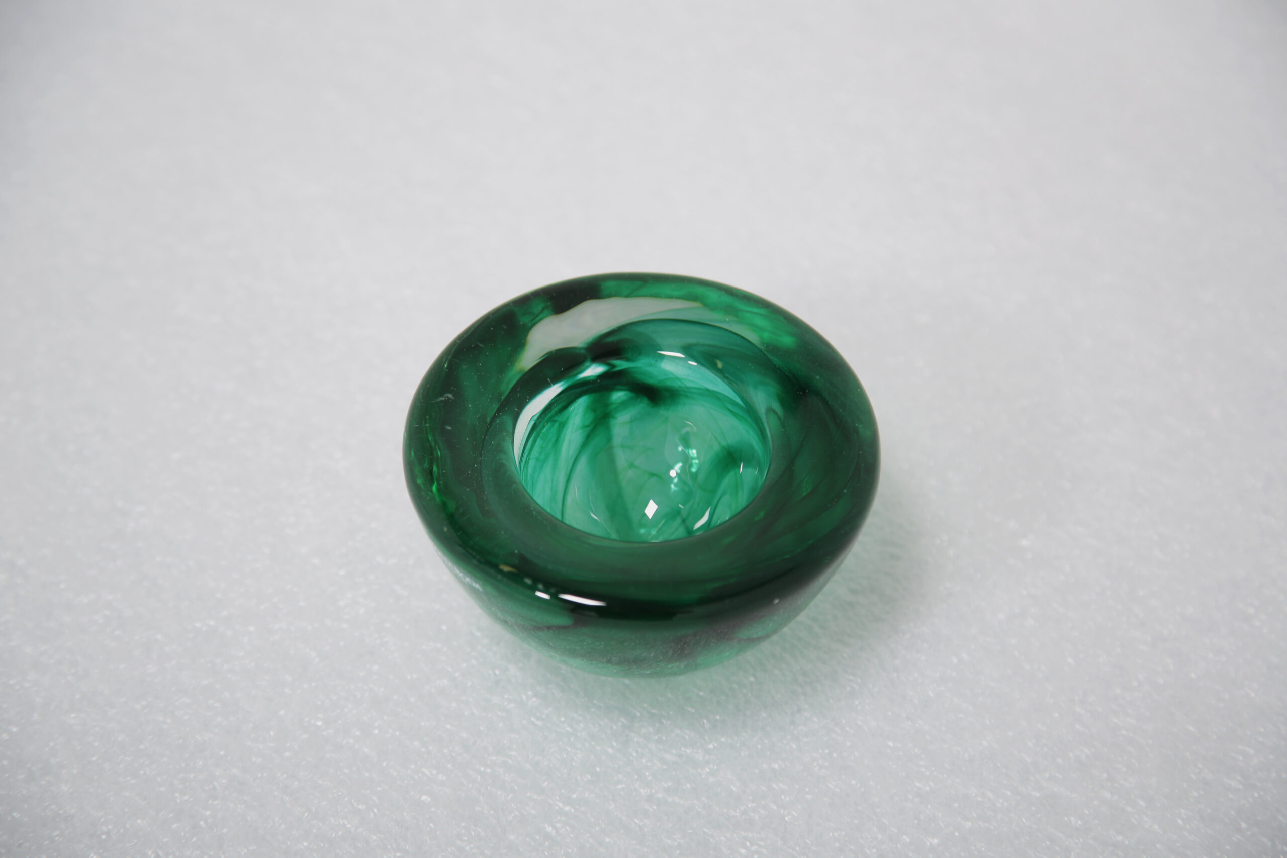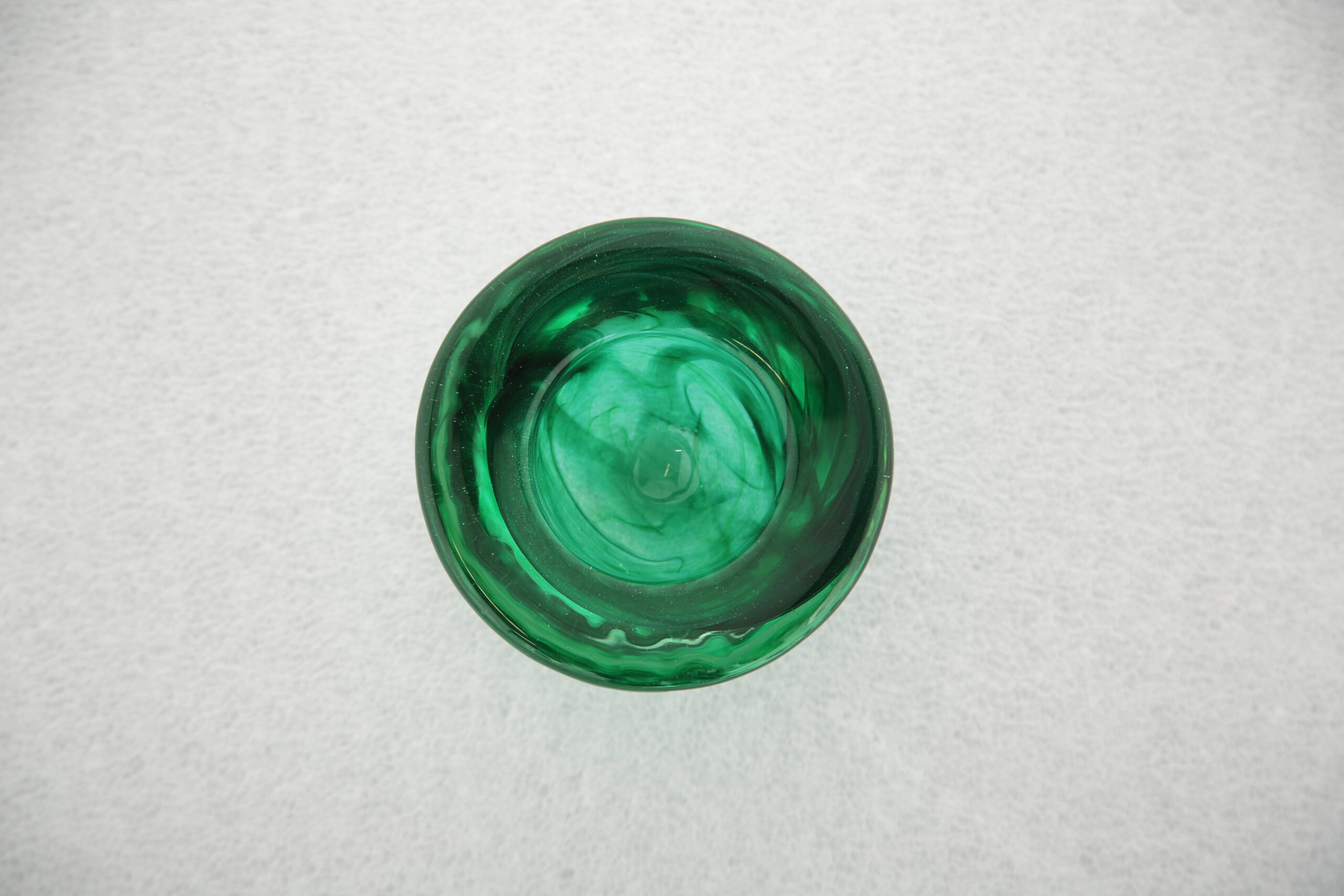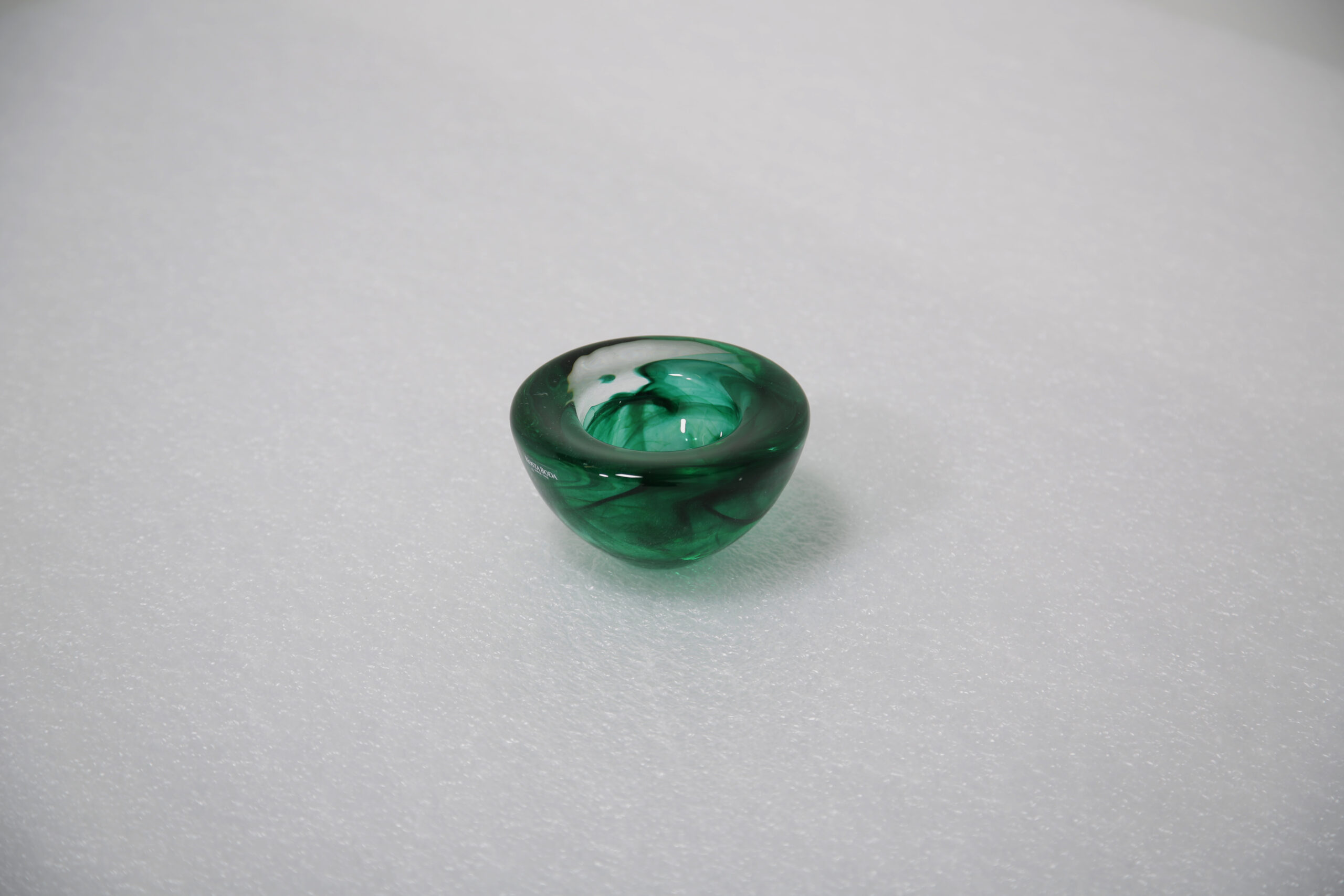 Designed by Swedish glass artist Anna Ehrner for Kosta Boda, this sculptural emerald green glass tealight holder forms part of the “Atoll” collection, known for its organic swirls and fluid glass motion. Featuring a vibrant, richly saturated green tone, the piece displays characteristic ribbon-like movement within the glass body—a hallmark of Ehrner’s work, which explores transparency, color play and the natural flow of molten glass. Compact in form yet visually dynamic, it functions beautifully as a tealight candleholder while also serving as a decorative accent within a contemporary or mid-century interior. Ehrner, recognized for her ability to capture motion within stillness, brings sculptural sensitivity to an everyday object through this design.