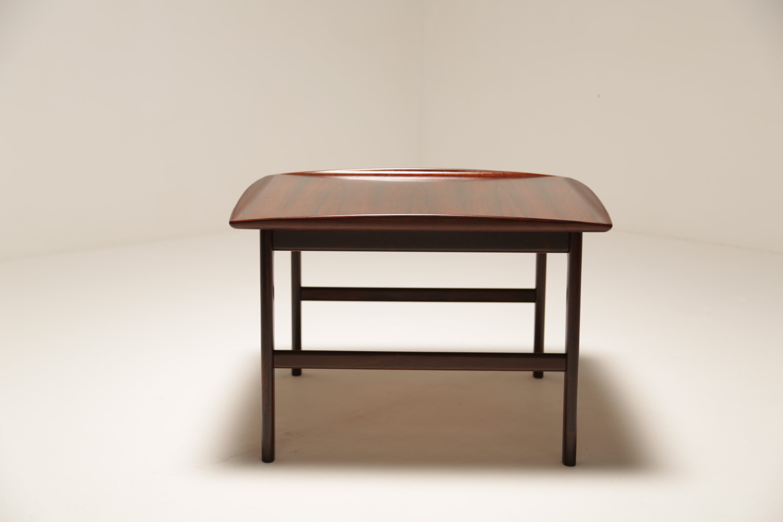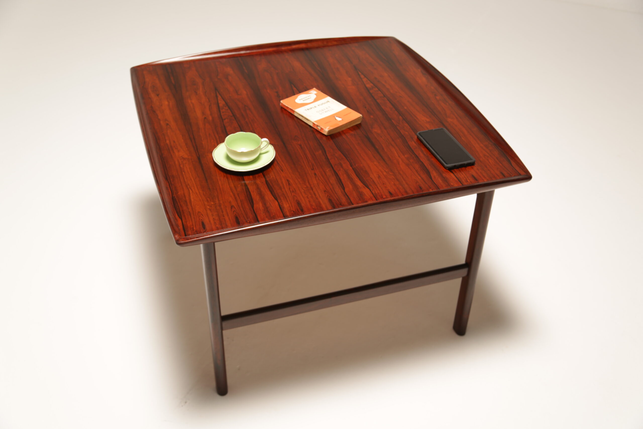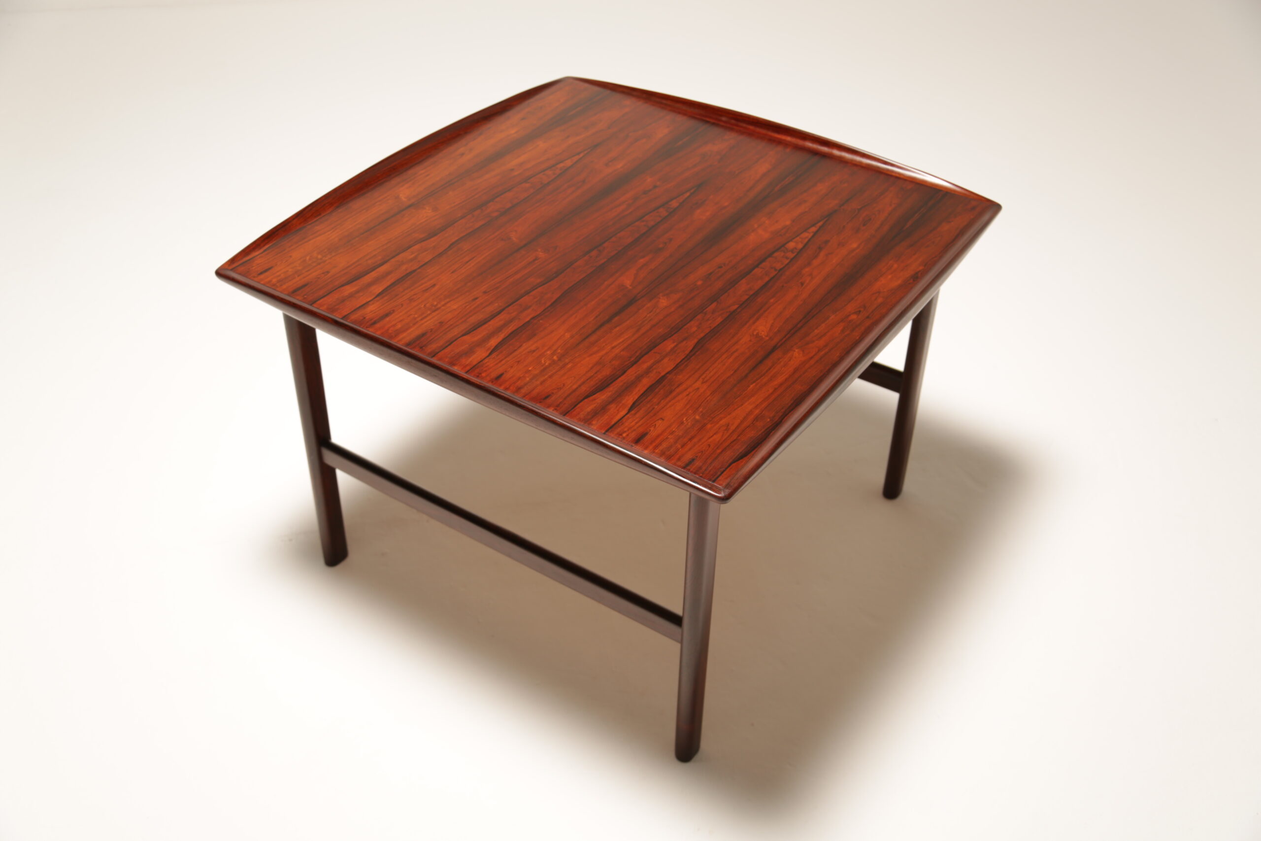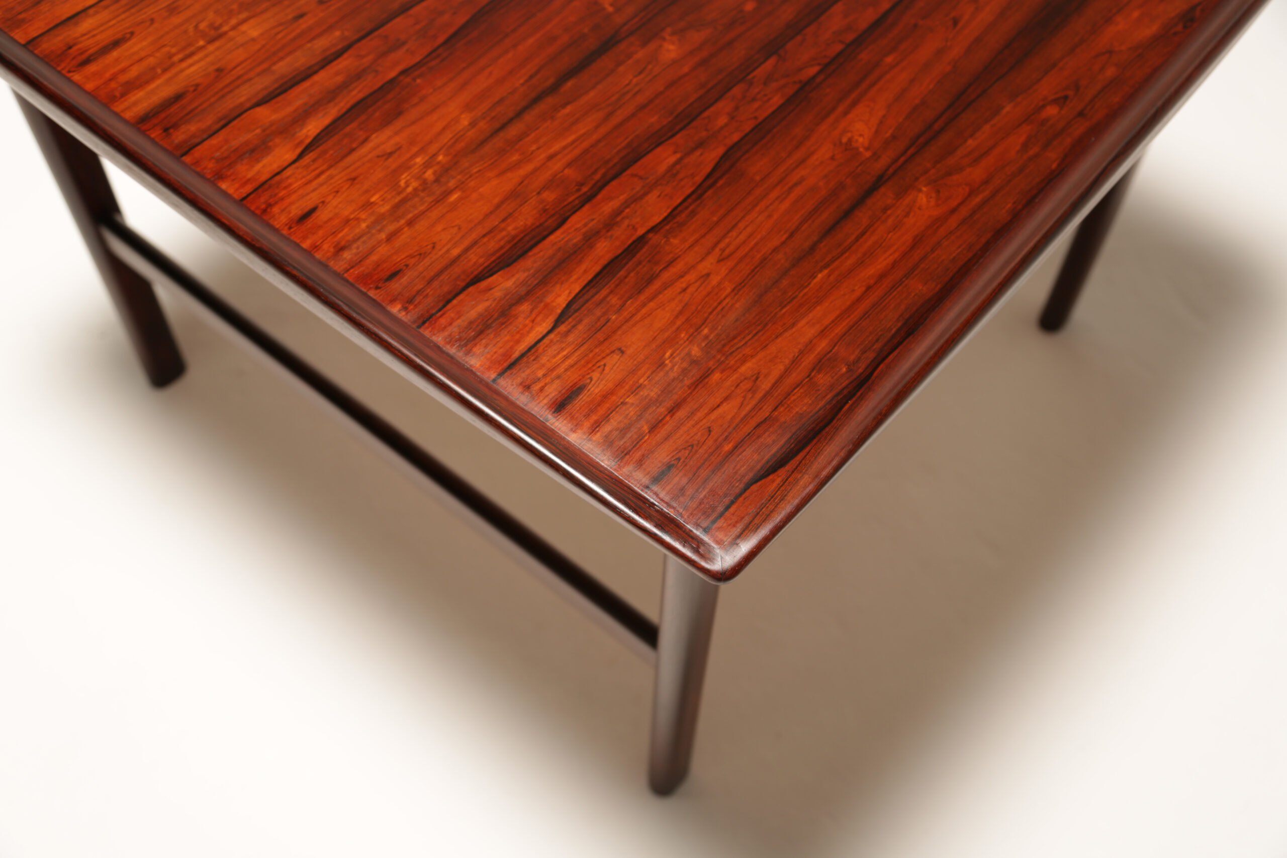 Designed by Folke Ohlsson and manufactured by Tingstroms, Sweden – This is a stunning example of a neat rosewood coffee table. The top features a raised lip which is a nice design. The rosewood grain is deep and clear throughout the table. The table is also stamped underneath. Perfect as a coffee table or as an end table.