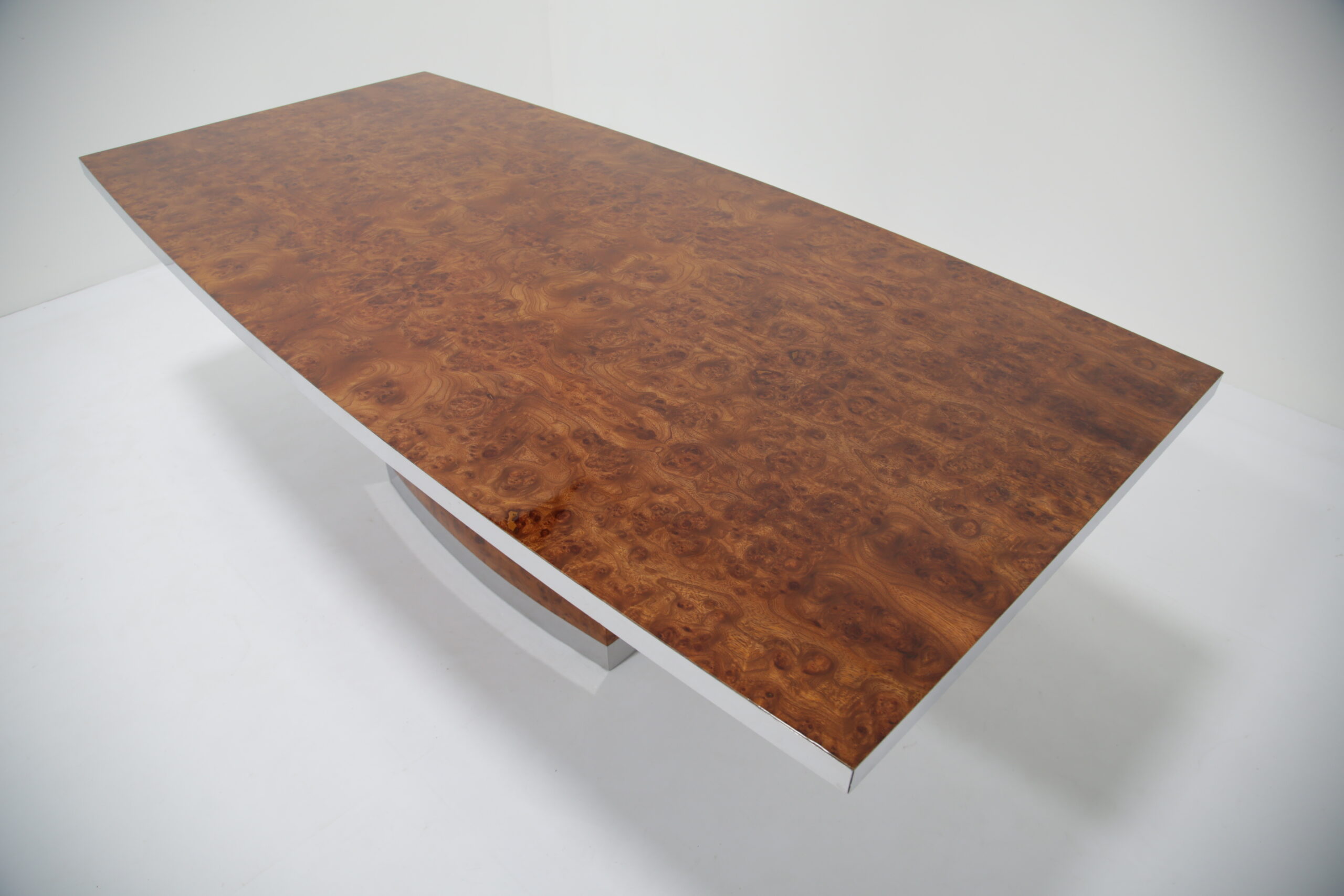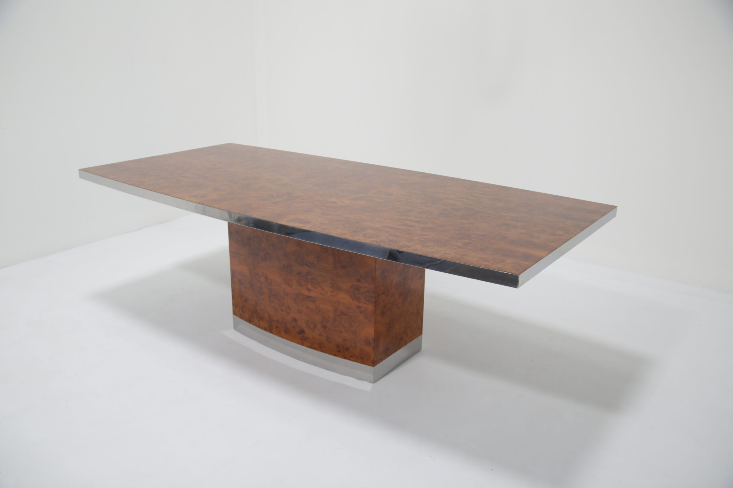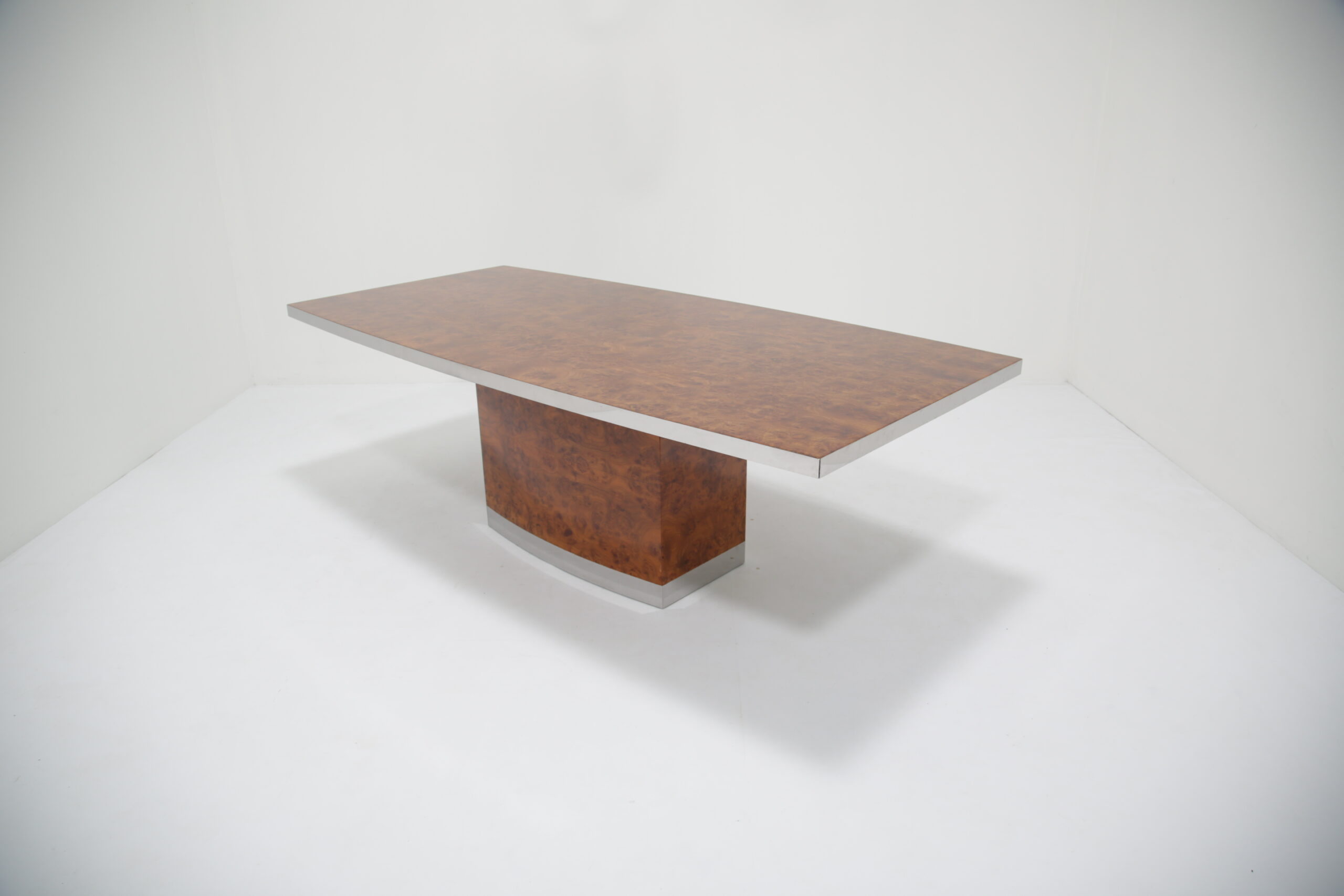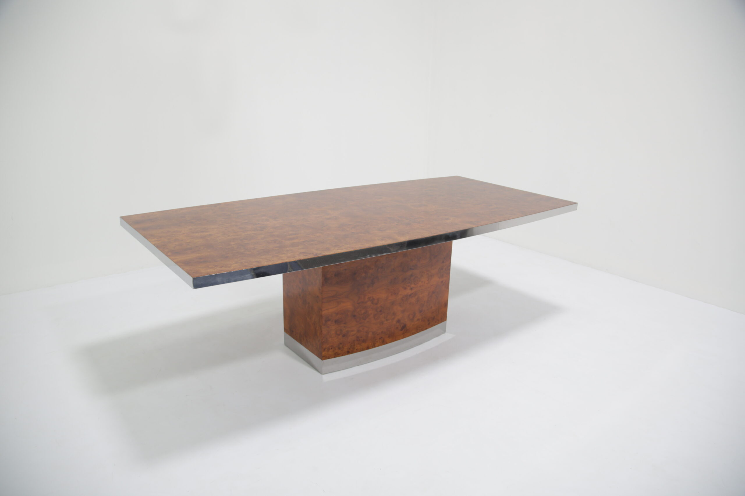 Just added to our collection is this exclusive dining table that would surely be the center of attention in any dining room. This beautiful dining table has been manufactured in burl wood which has a very unique pattern and beautiful grain pattern throughout the top as well as the plinth base. Detailed with a chrome edge around the top as well as base, it offers additional protection ensuring the top is not damaged by chairs but also adds a beautiful reflection of light, whether it be natural or from your own lighting in the room. The table was designed by the French designer Jean Claude Mahey whom was active during the 1970s and 1980s. We have paired this unique dining table with a set of upholstered dining chairs on chrome frames, available in another listing. The dining table has a lacquered finish which is to protect and preserve the wood.