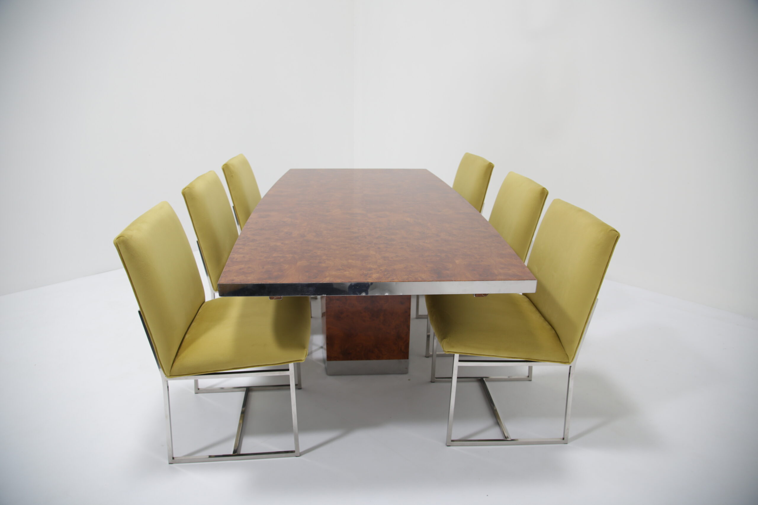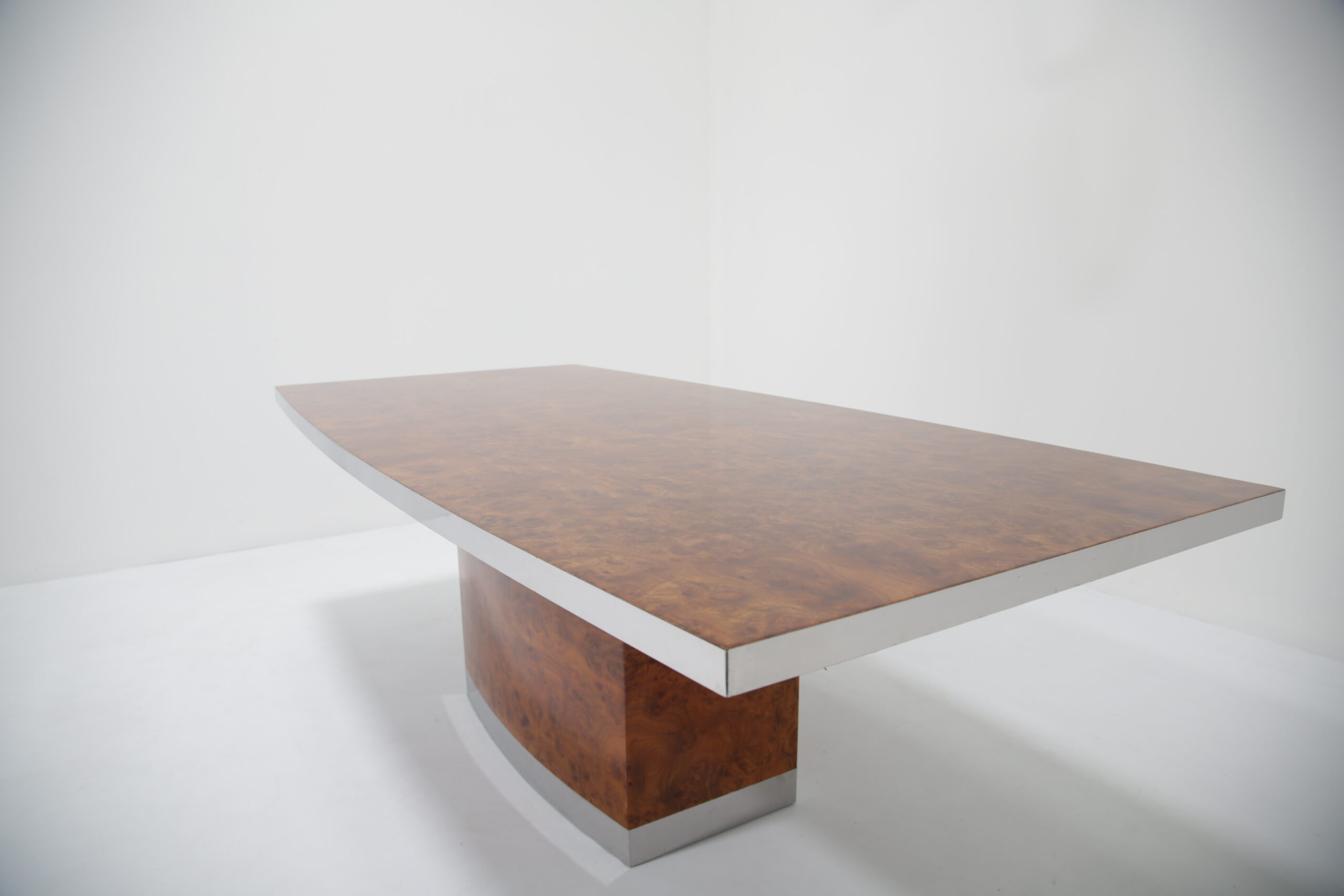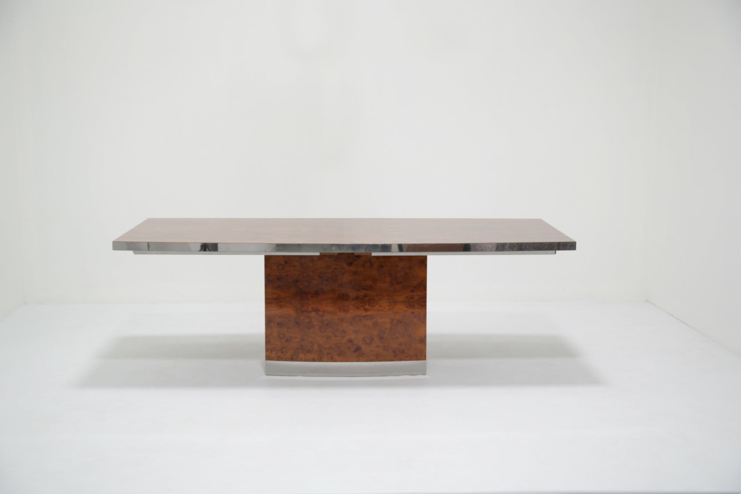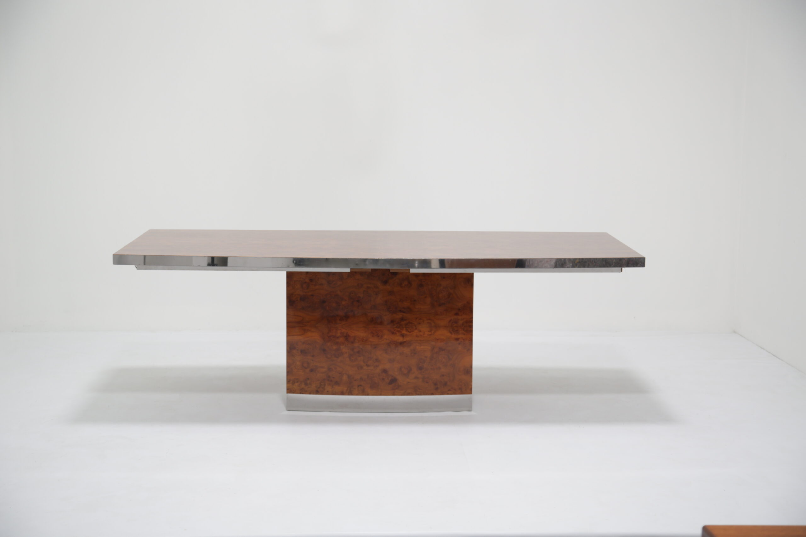 Just added to our collection is this exclusive dining table that would surely be the center of attention in any dining room. This beautiful dining table has been manufactured in burl wood which has a very unique pattern and beautiful grain pattern throughout the top as well as the plinth base. Detailed with a chrome edge around the top as well as base, it offers additional protection ensuring the top is not damaged by chairs but also adds a beautiful reflection of light, whether it be natural or from your own lighting in the room. The table was designed by the French designer Jean Claude Mahey whom was active during the 1970s and 1980s. We have paired this unique dining table with a set of upholstered dining chairs on chrome frames, available in another listing. The dining table has a lacquered finish which is to protect and preserve the wood.