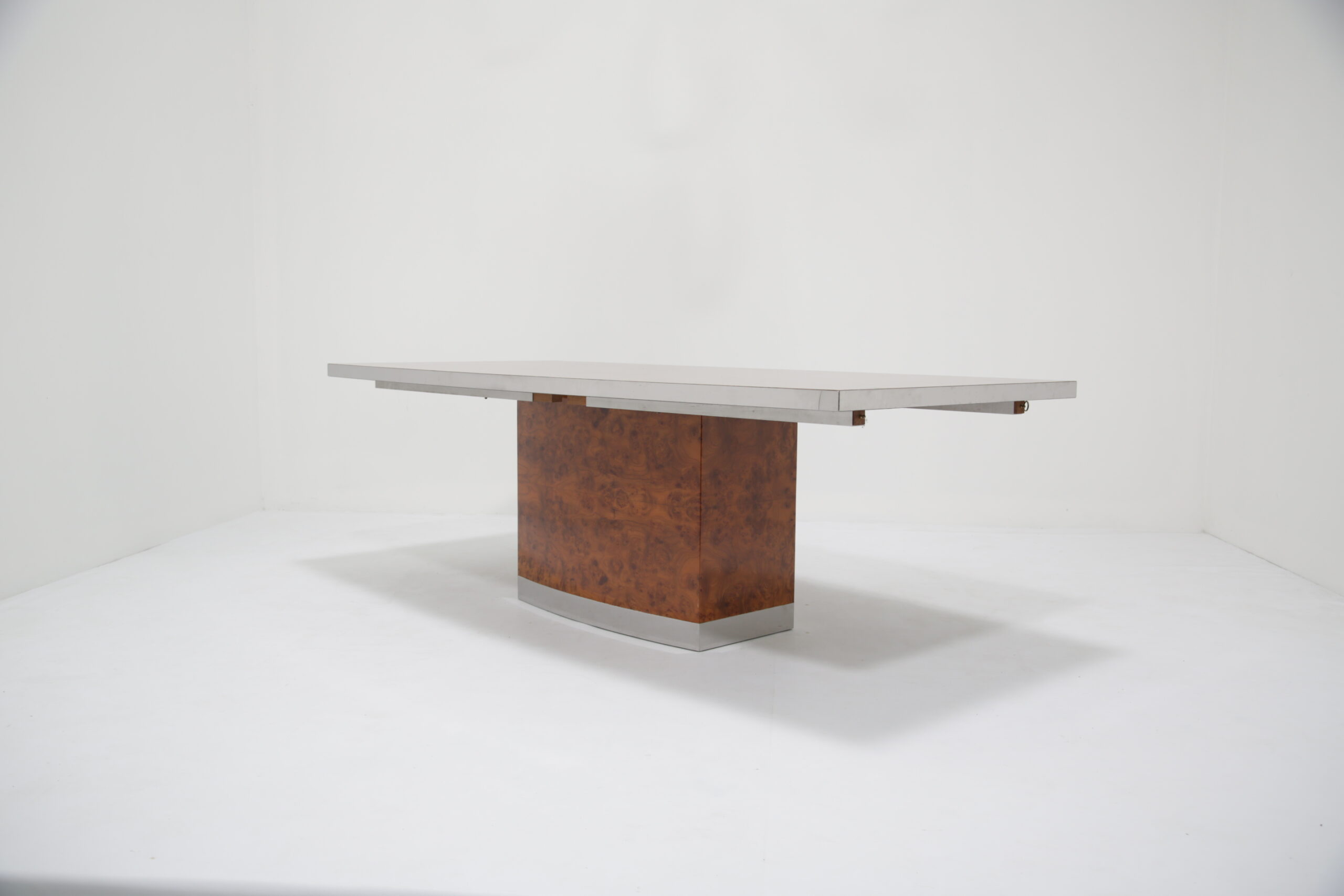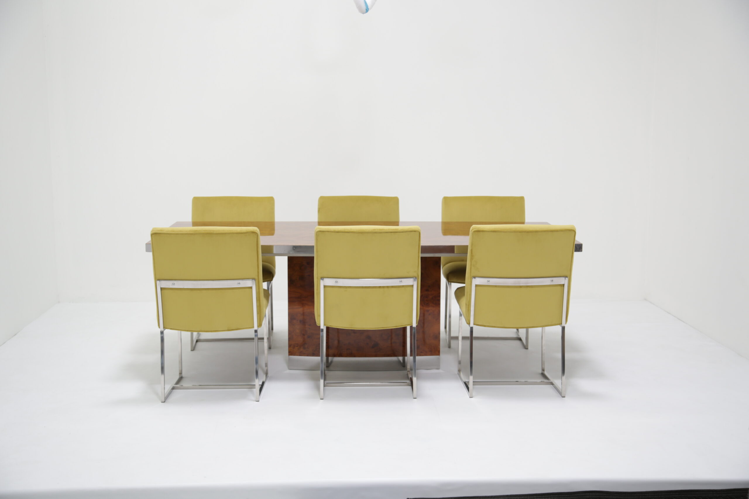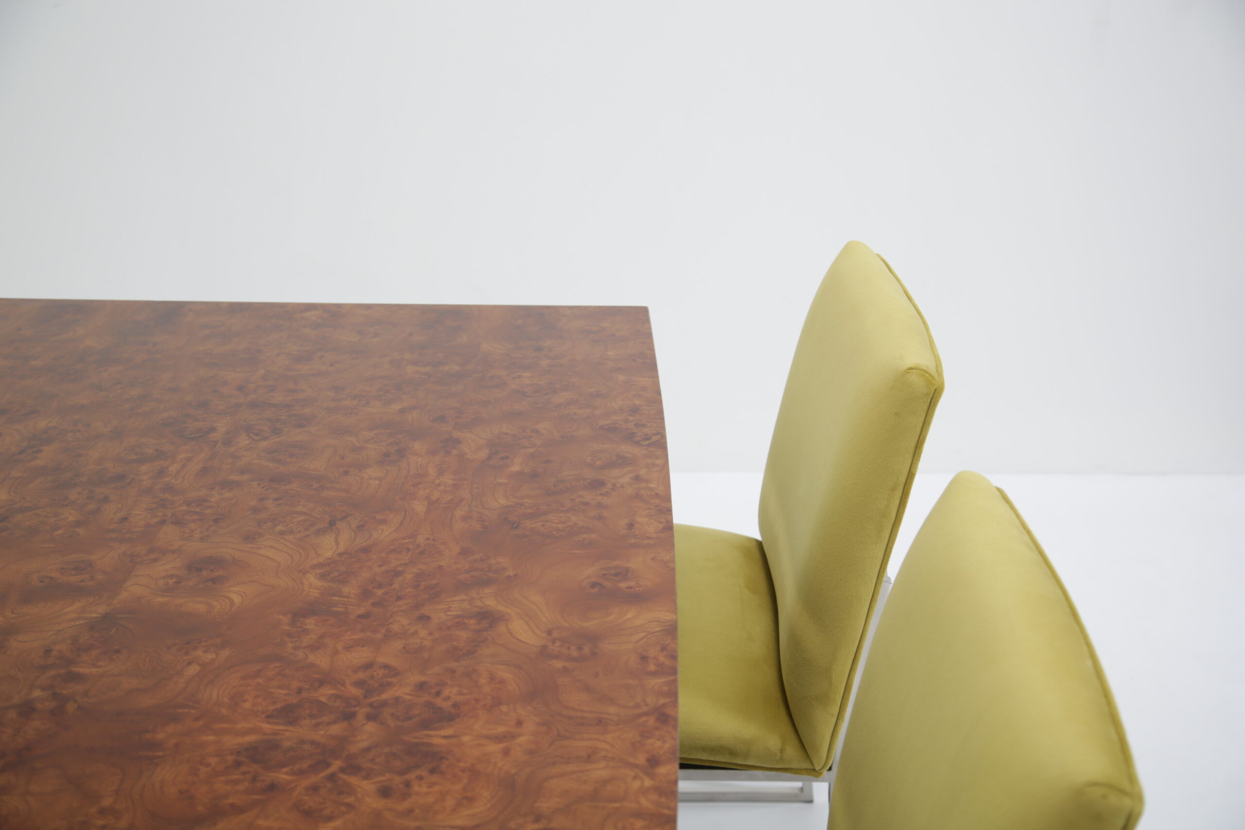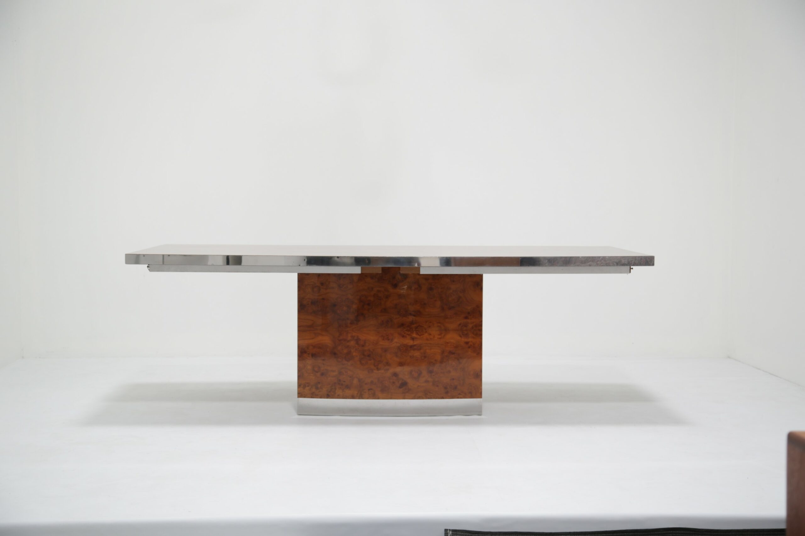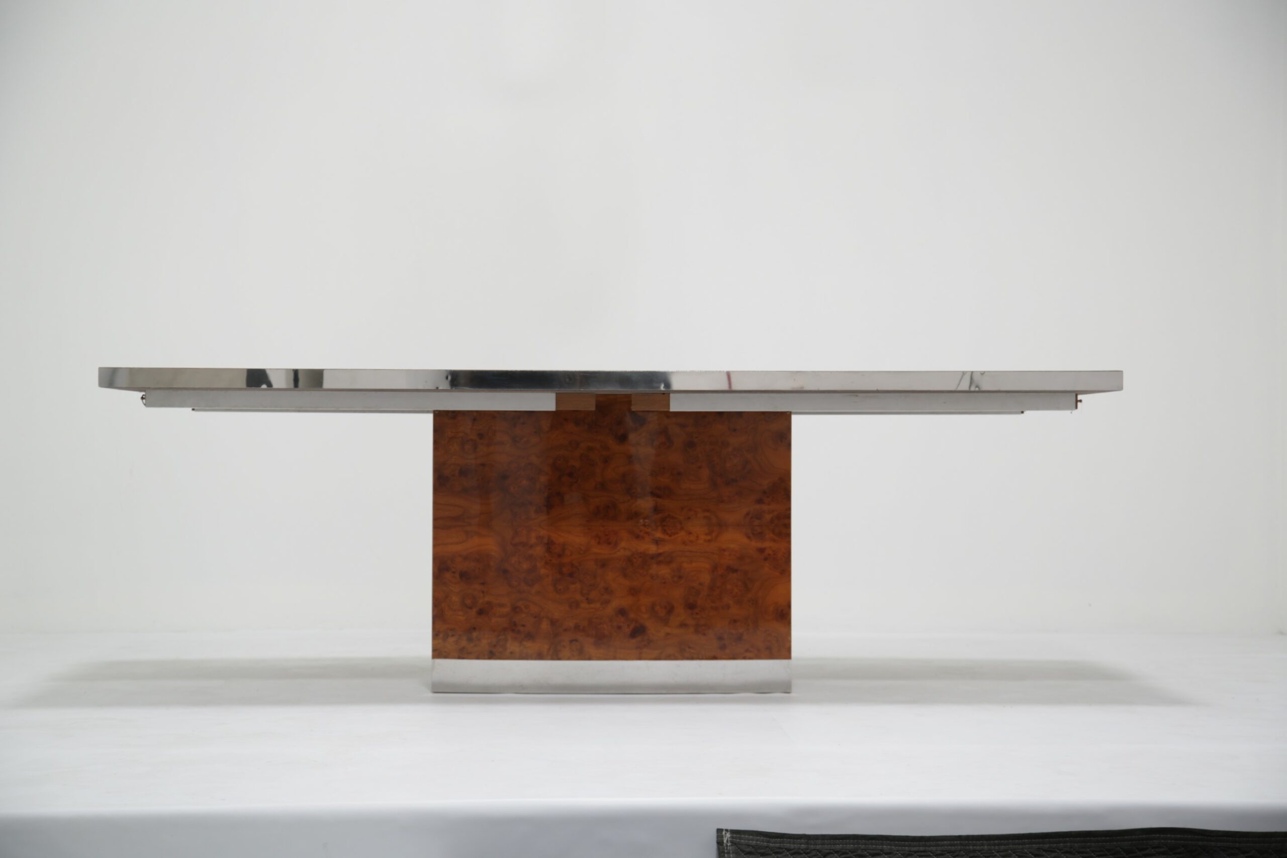 Just added to our collection is this exclusive dining table that would surely be the center of attention in any dining room. This beautiful dining table has been manufactured in burl wood which has a very unique pattern and beautiful grain pattern throughout the top as well as the plinth base. Detailed with a chrome edge around the top as well as base, it offers additional protection ensuring the top is not damaged by chairs but also adds a beautiful reflection of light, whether it be natural or from your own lighting in the room. The table was designed by the French designer Jean Claude Mahey whom was active during the 1970s and 1980s. We have paired this unique dining table with a set of upholstered dining chairs on chrome frames, available in another listing. The dining table has a lacquered finish which is to protect and preserve the wood.