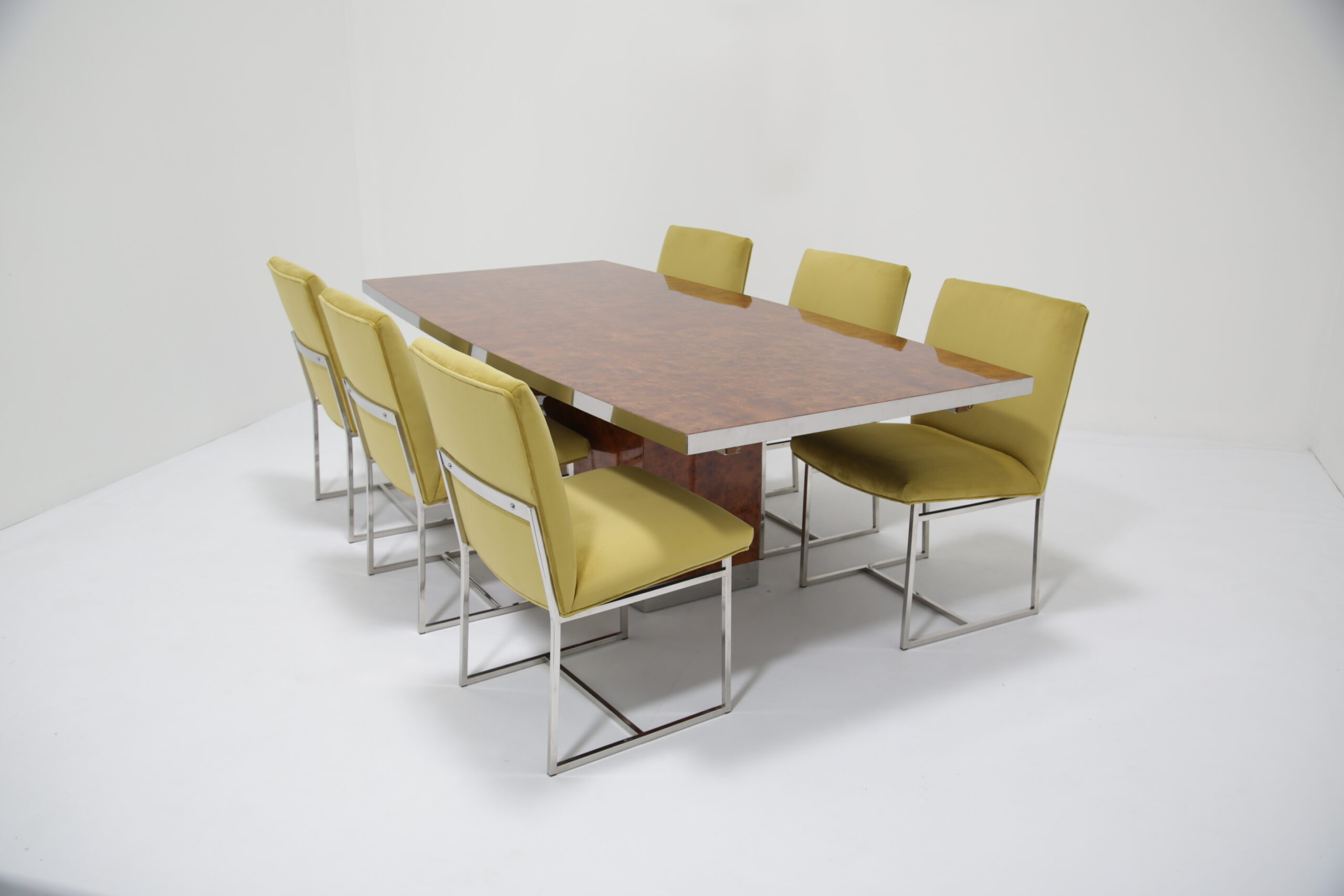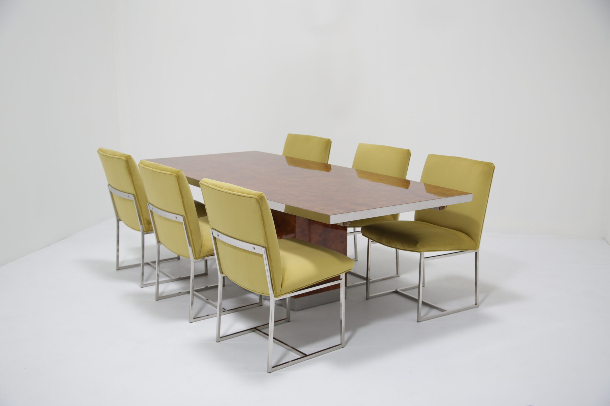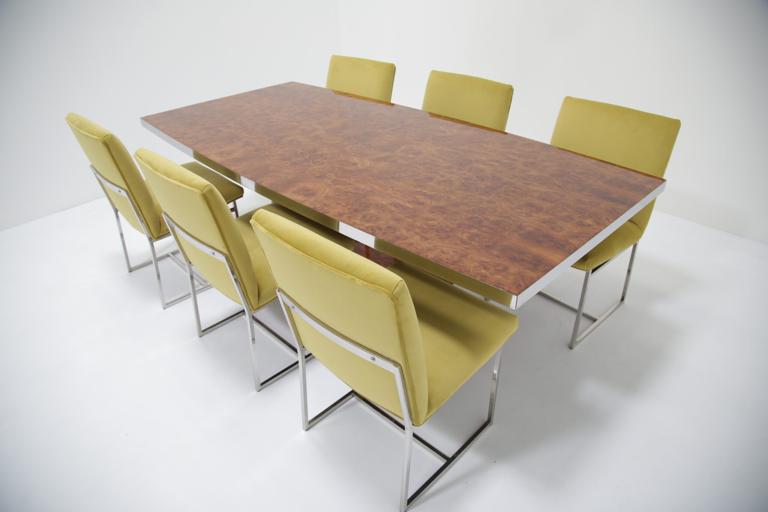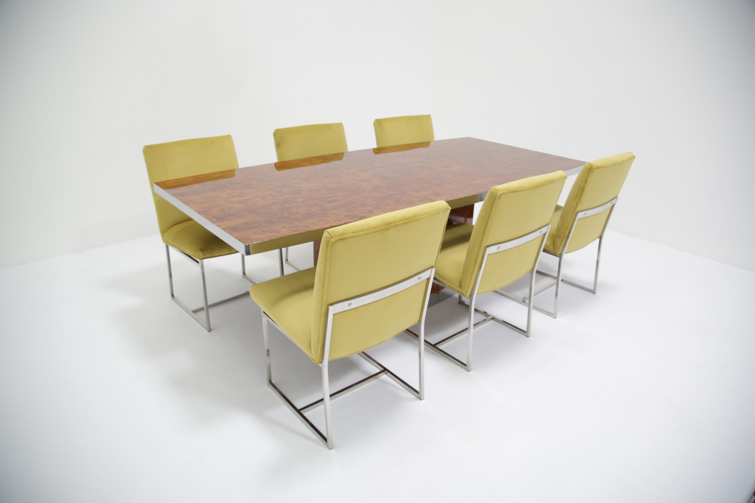 Just added to our collection is this exclusive dining table that would surely be the center of attention in any dining room. This beautiful dining table has been manufactured in burl wood which has a very unique pattern and beautiful grain pattern throughout the top as well as the plinth base. Detailed with a chrome edge around the top as well as base, it offers additional protection ensuring the top is not damaged by chairs but also adds a beautiful reflection of light, whether it be natural or from your own lighting in the room. The table was designed by the French designer Jean Claude Mahey whom was active during the 1970s and 1980s. We have paired this unique dining table with a set of upholstered dining chairs on chrome frames, available in another listing. The dining table has a lacquered finish which is to protect and preserve the wood.