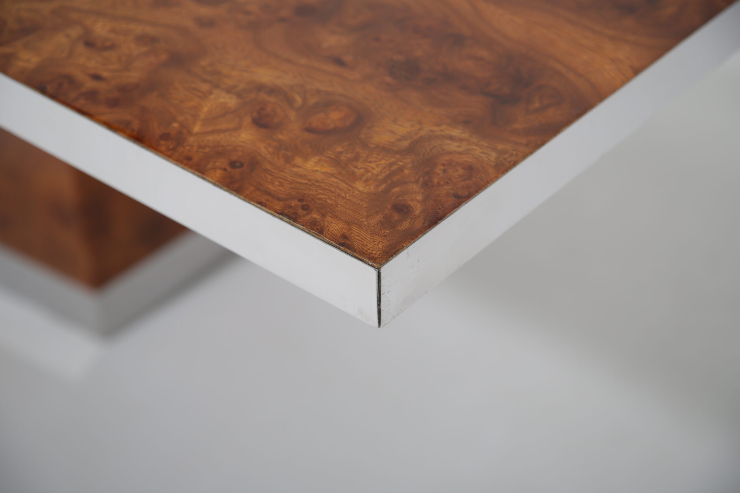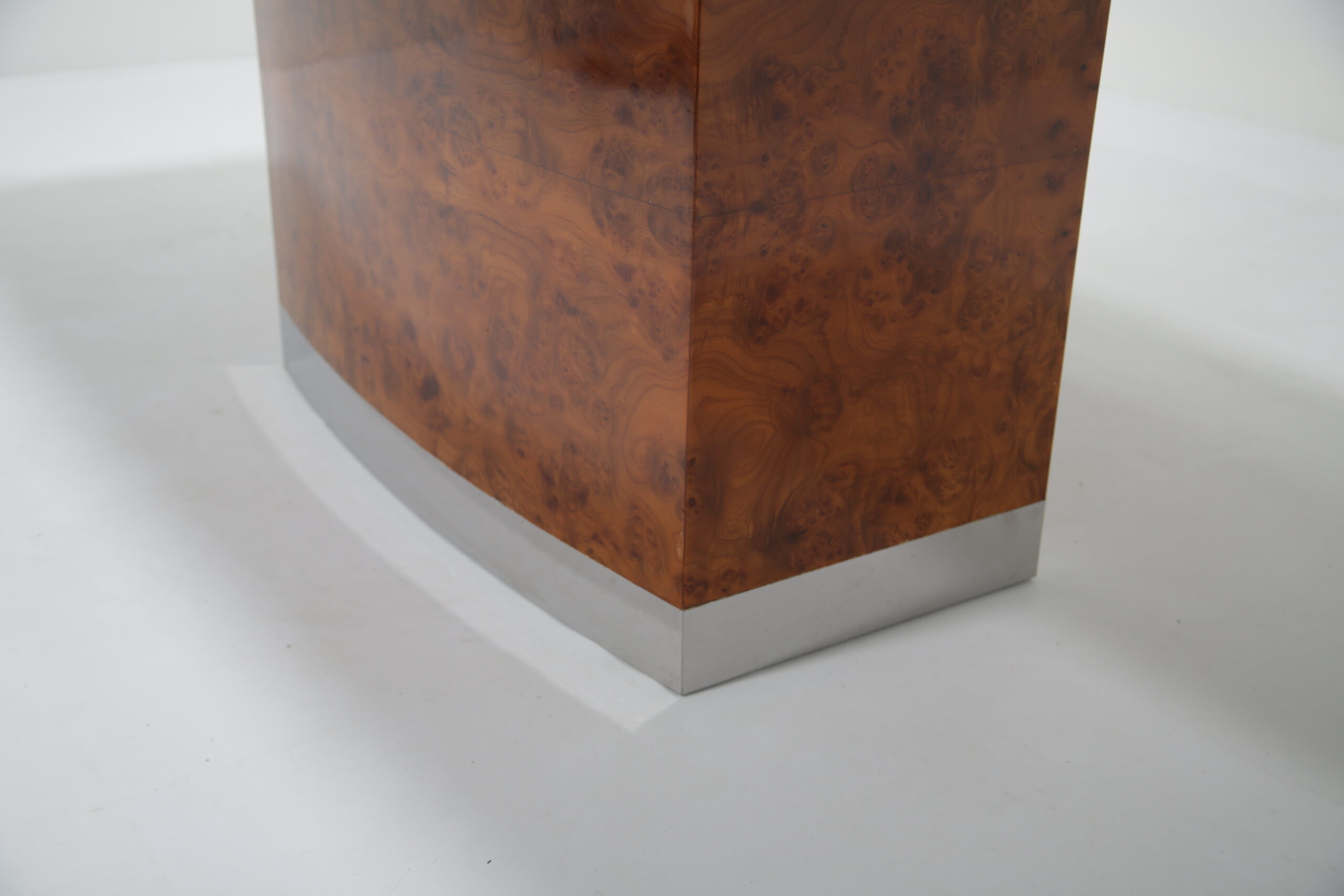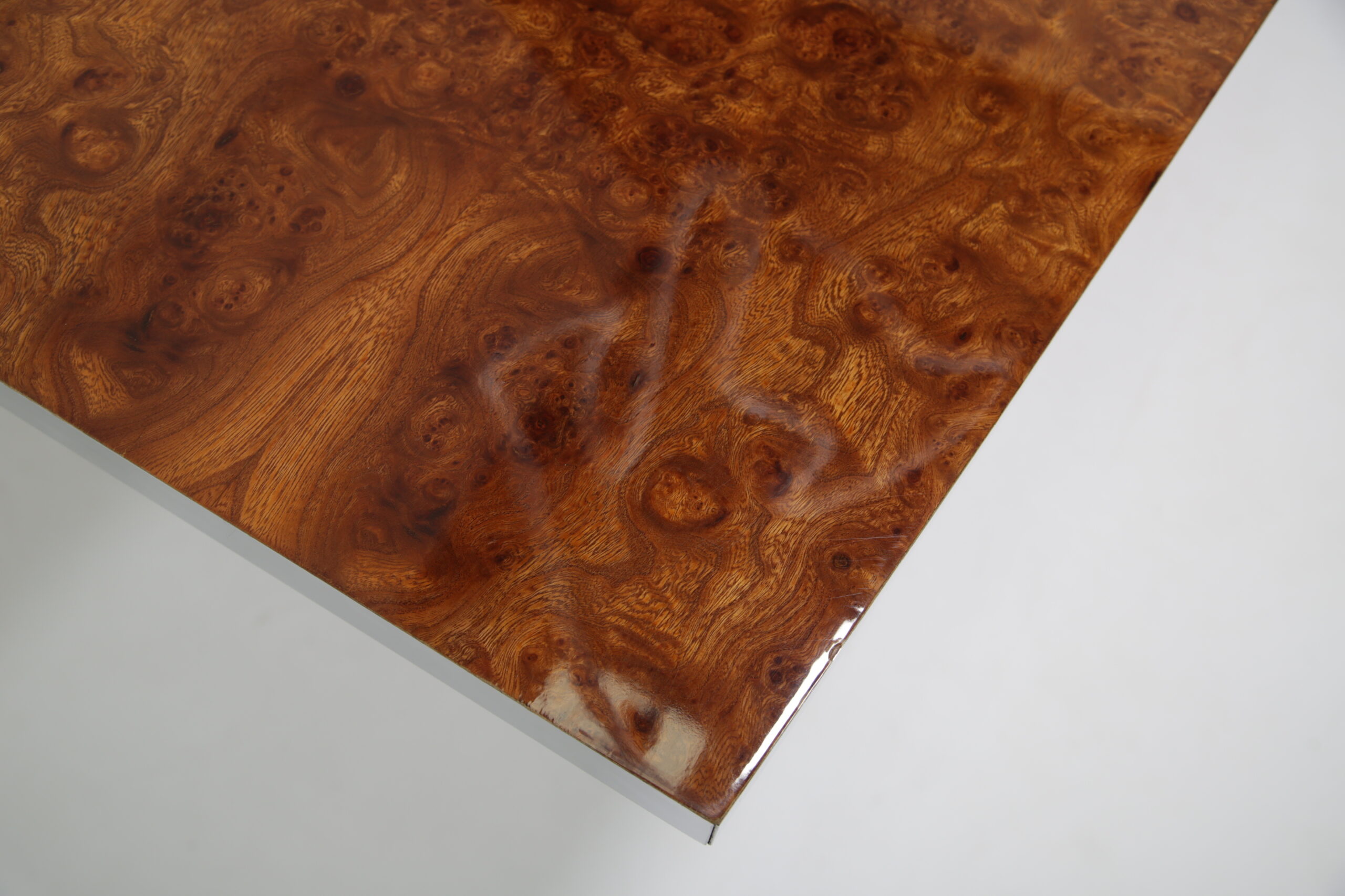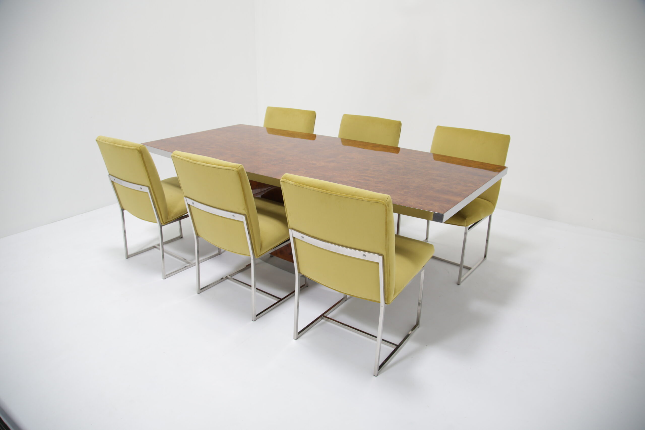 Just added to our collection is this exclusive dining table that would surely be the center of attention in any dining room. This beautiful dining table has been manufactured in burl wood which has a very unique pattern and beautiful grain pattern throughout the top as well as the plinth base. Detailed with a chrome edge around the top as well as base, it offers additional protection ensuring the top is not damaged by chairs but also adds a beautiful reflection of light, whether it be natural or from your own lighting in the room. The table was designed by the French designer Jean Claude Mahey whom was active during the 1970s and 1980s. We have paired this unique dining table with a set of upholstered dining chairs on chrome frames, available in another listing. The dining table has a lacquered finish which is to protect and preserve the wood.