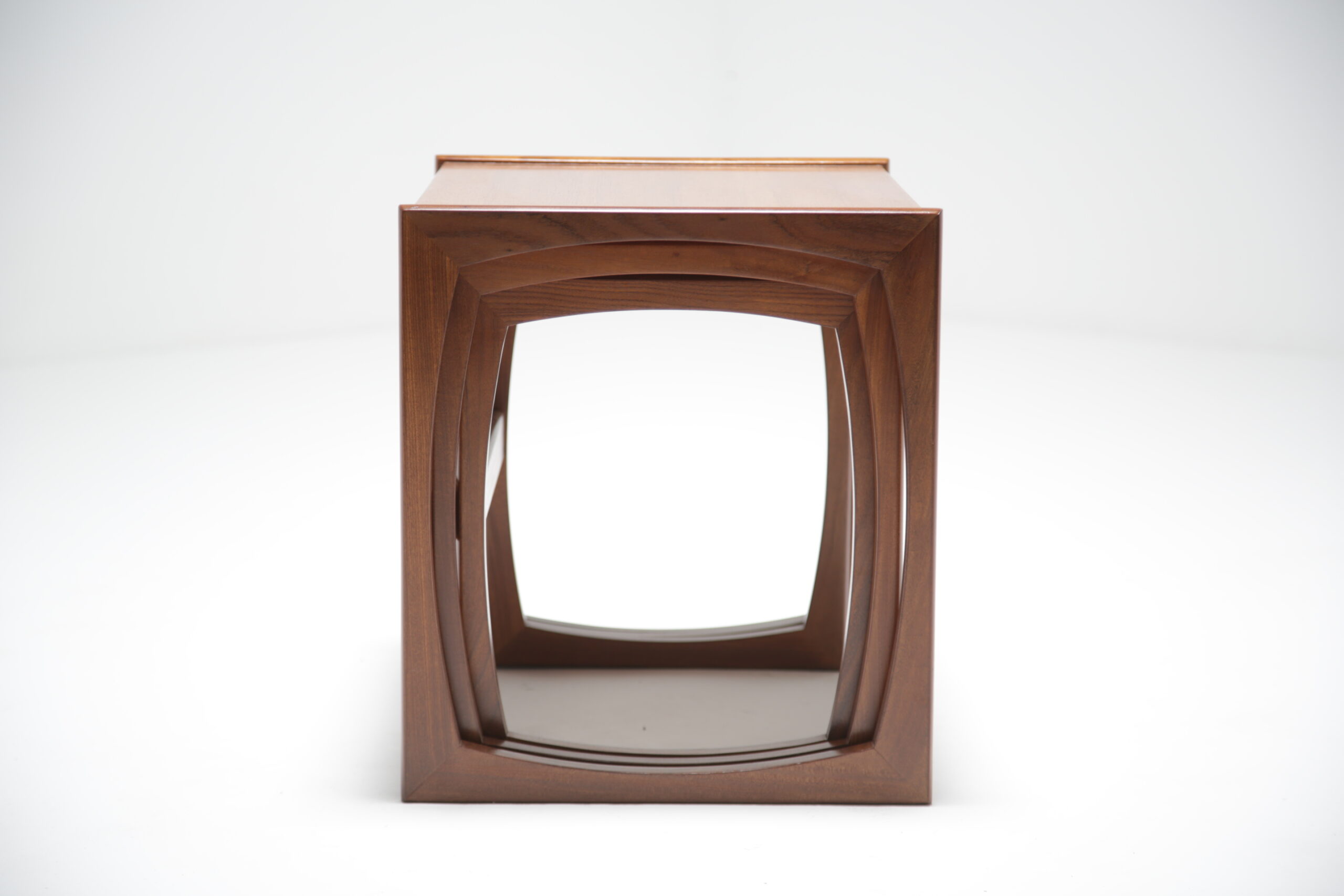 The standout feature of this nest lies in its unique shape. The sides of each table boast a stylized Q design, adding a distinctive touch of flair to the set. When the tables are nested together, this cleverly crafted shape creates a visually captivating side profile that effortlessly enhances the overall aesthetic of the piece.