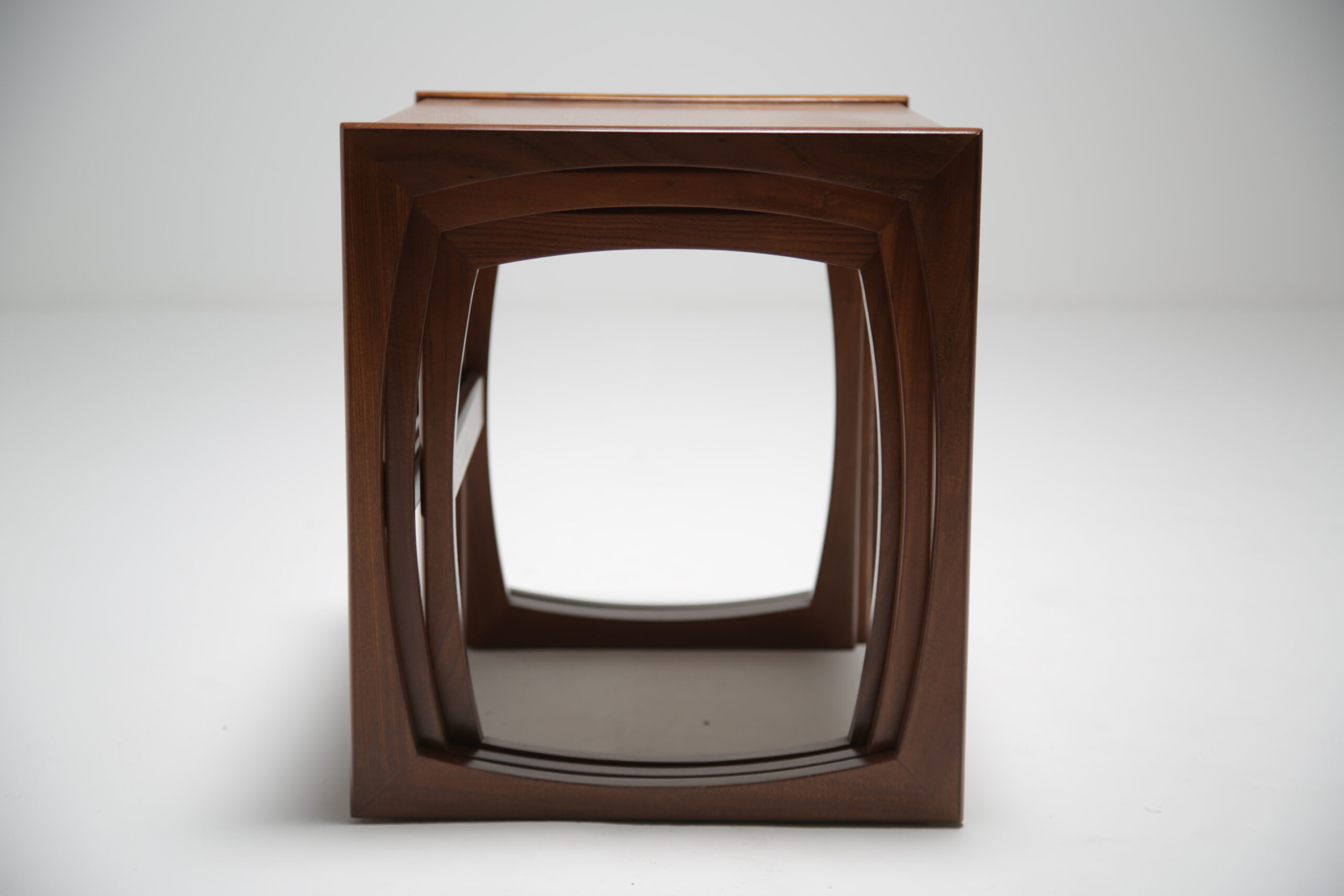 The fully refurbished condition of this nest ensures that it looks great and is ready to be enjoyed immediately. The meticulous restoration process brings out the natural beauty of the teak, enhancing its luster and preserving its original charm. The result is a set of tables that exudes elegance and sophistication, effortlessly elevating any room they adorn.