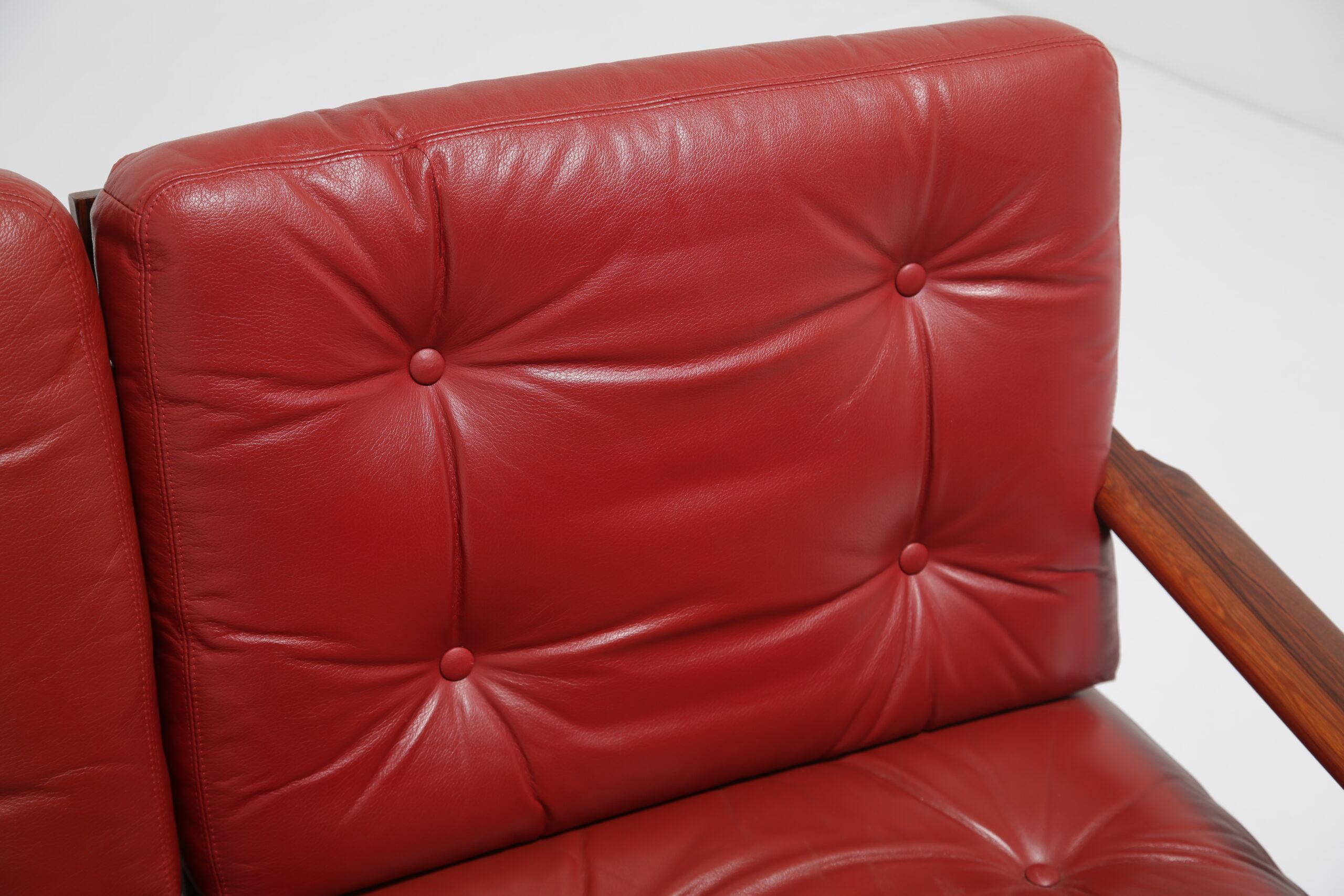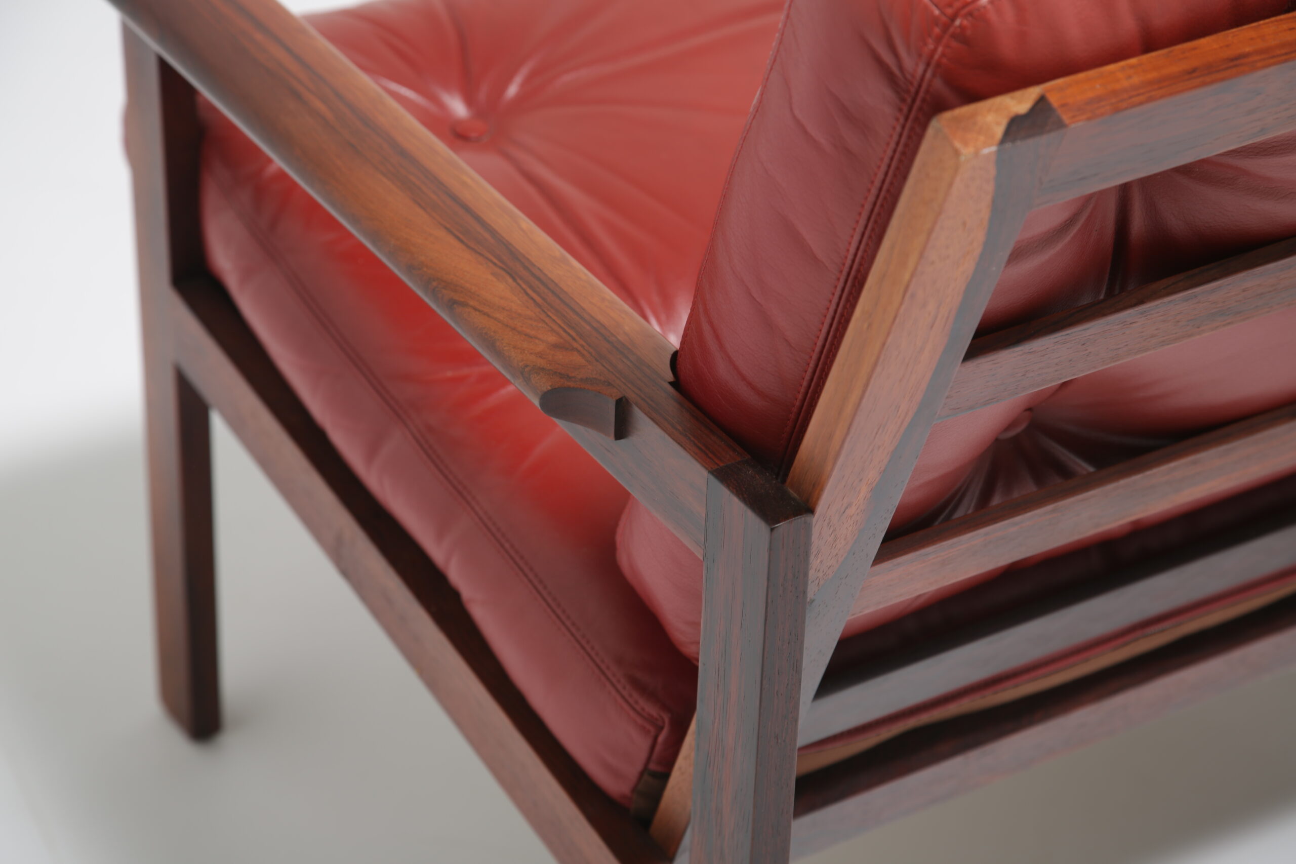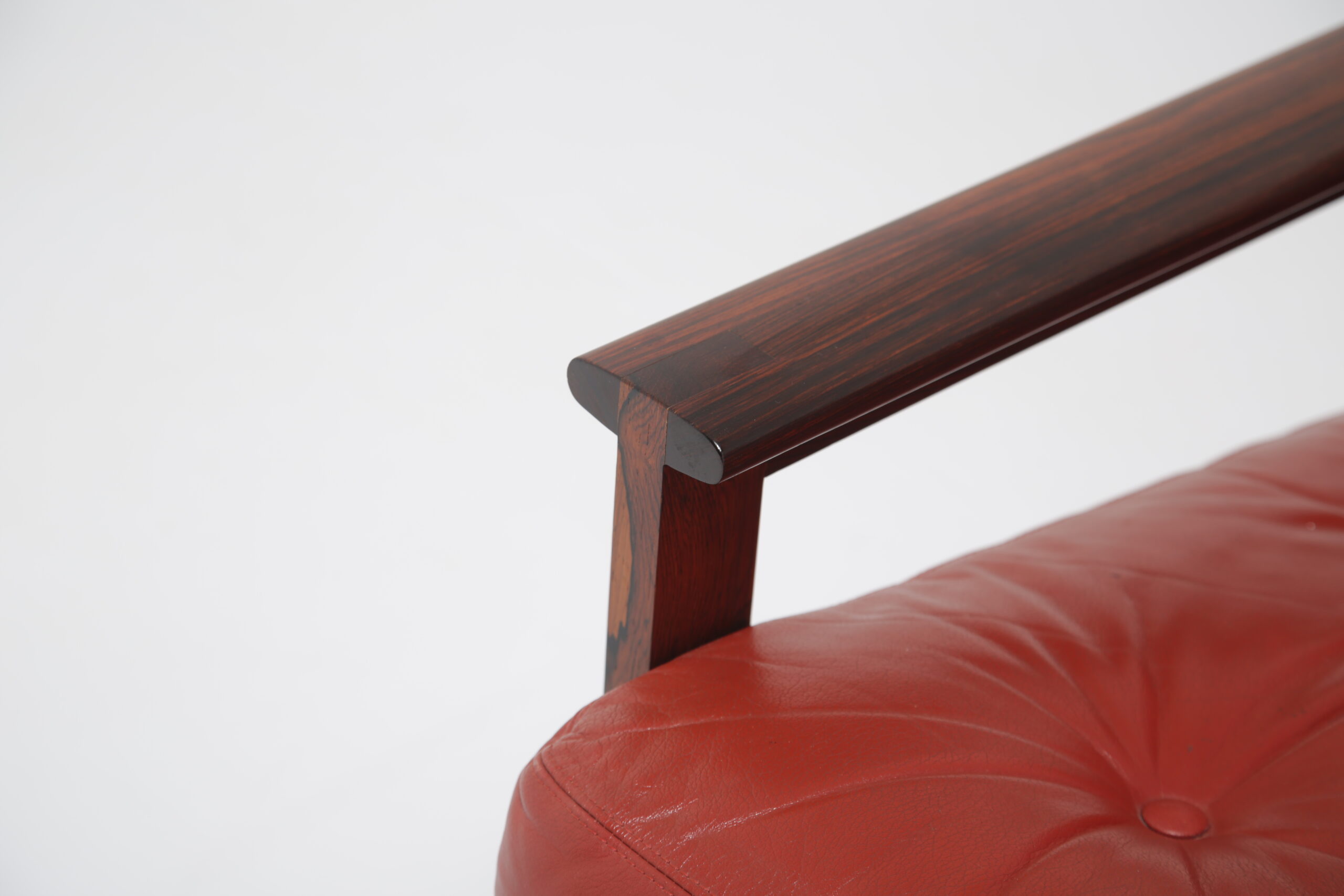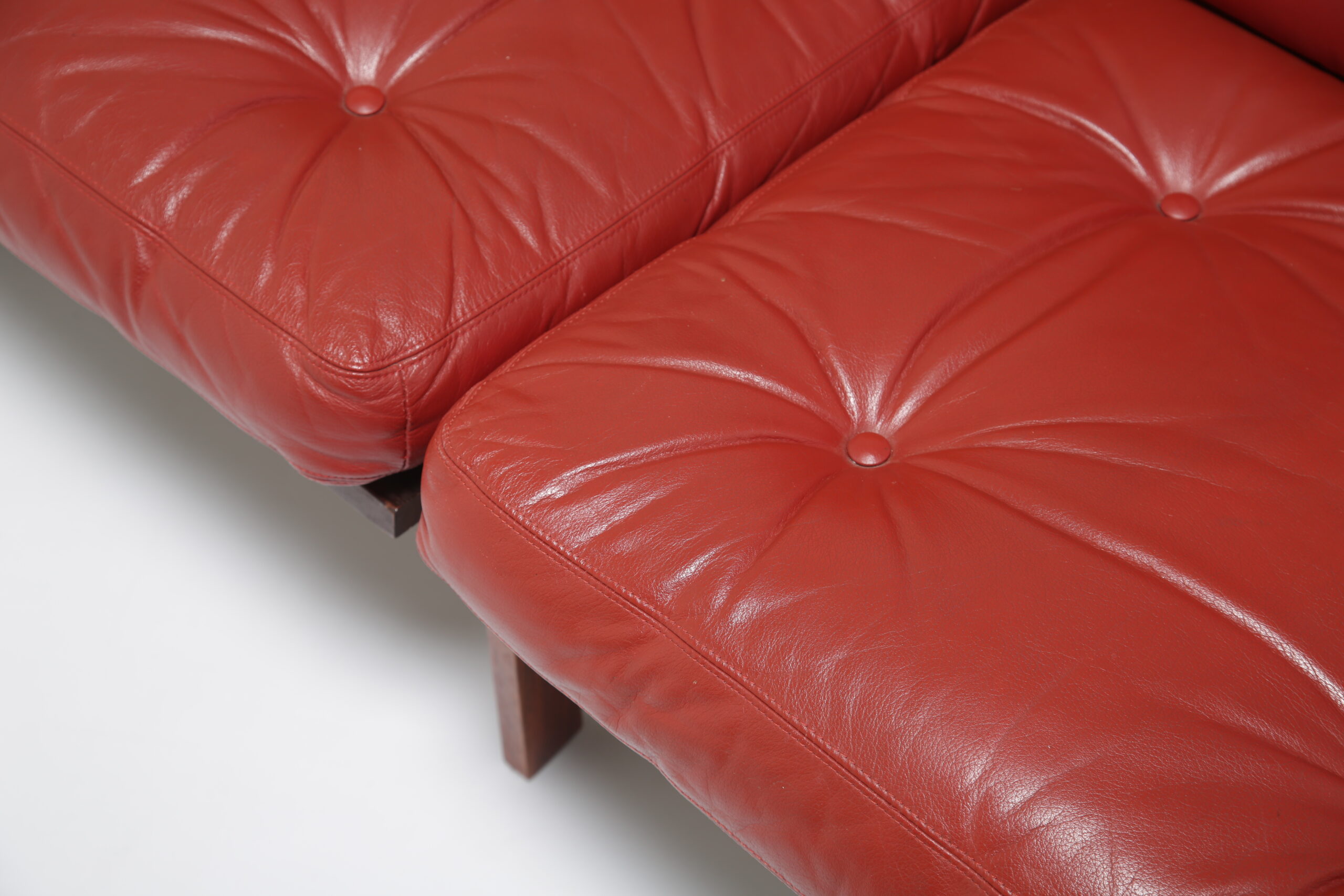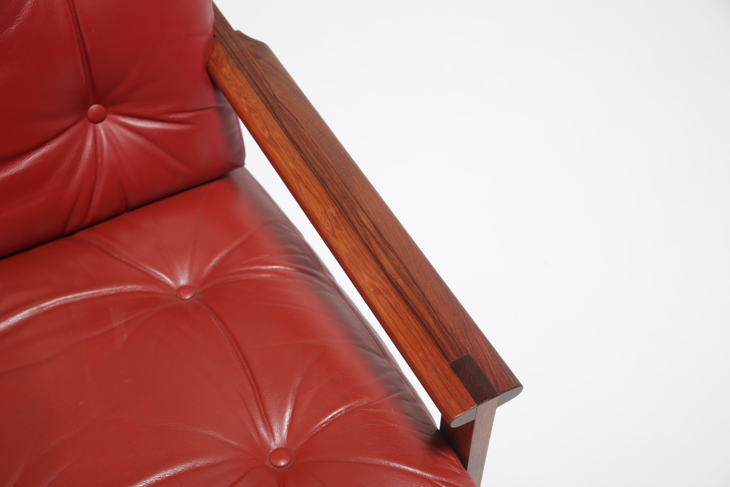 The deep red leather upholstery adds warmth and character, while the buttoned seat and back cushions introduce a refined, tailored finish synonymous with high-end Scandinavian craftsmanship of the era.