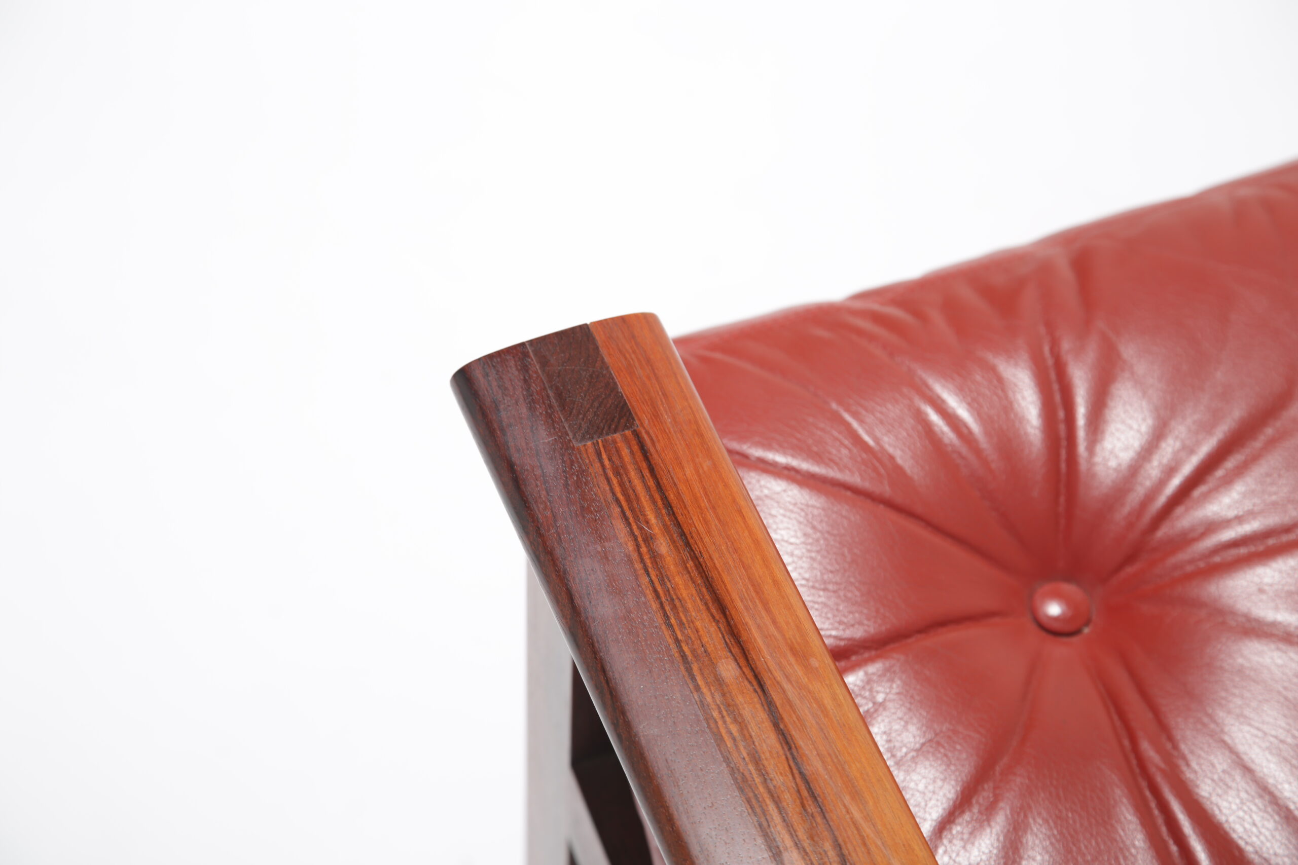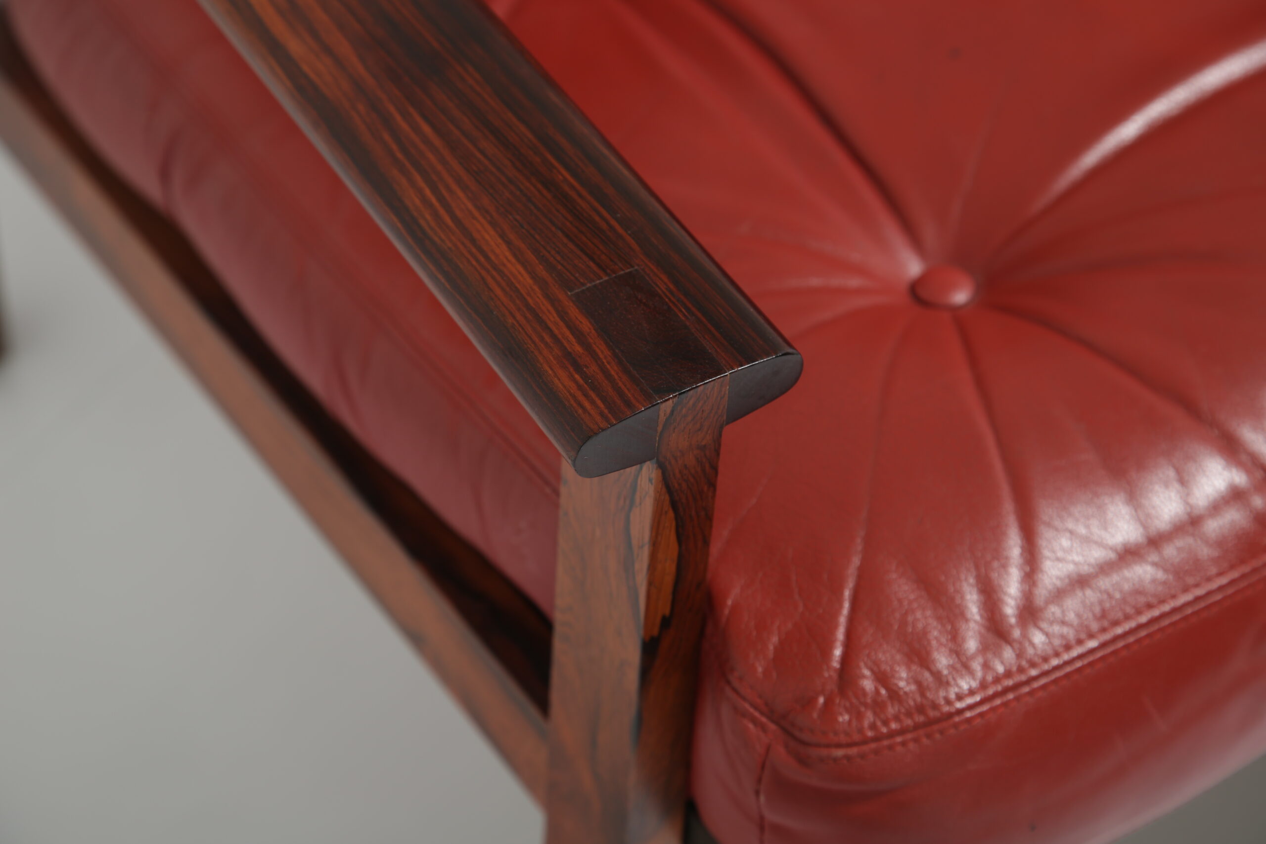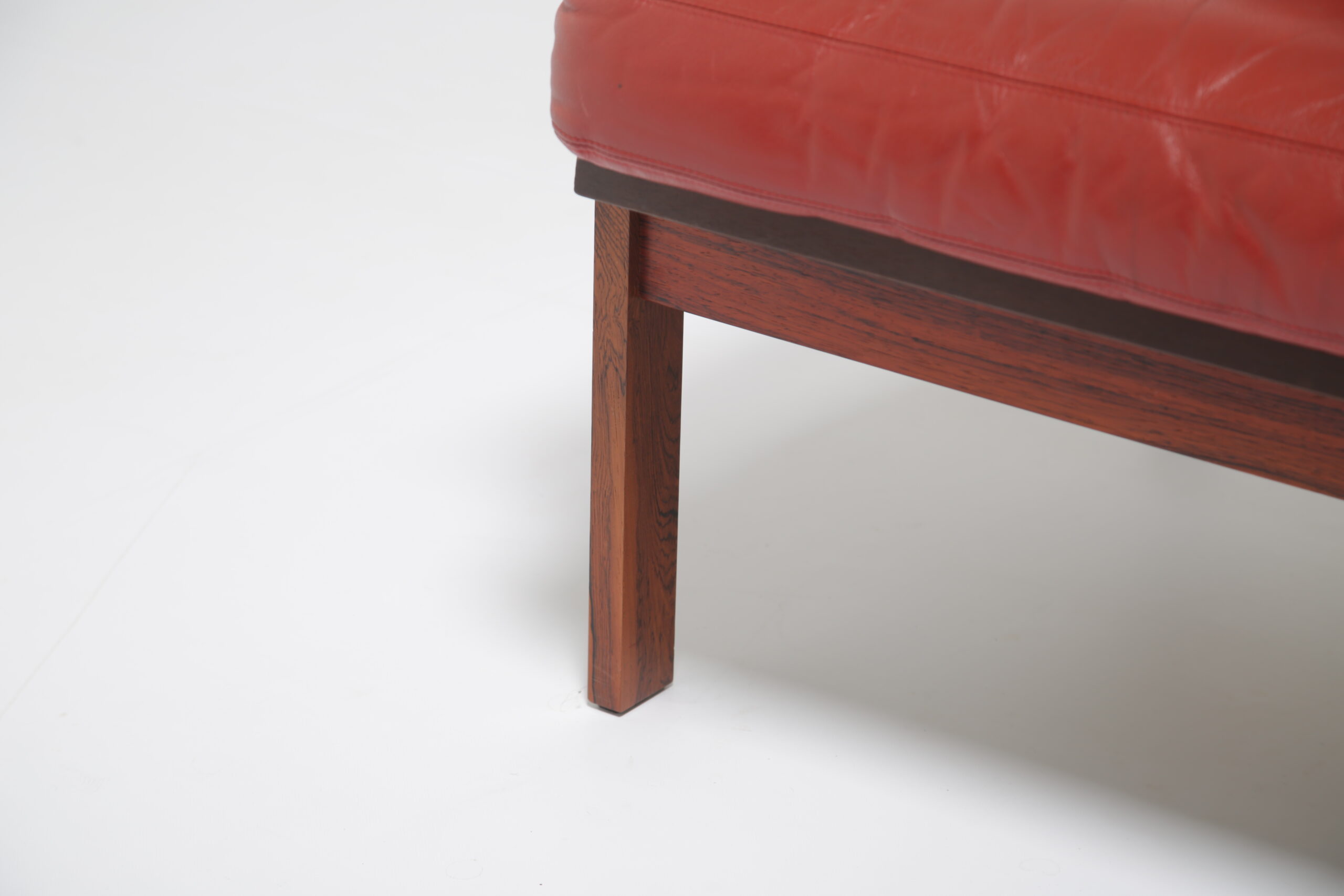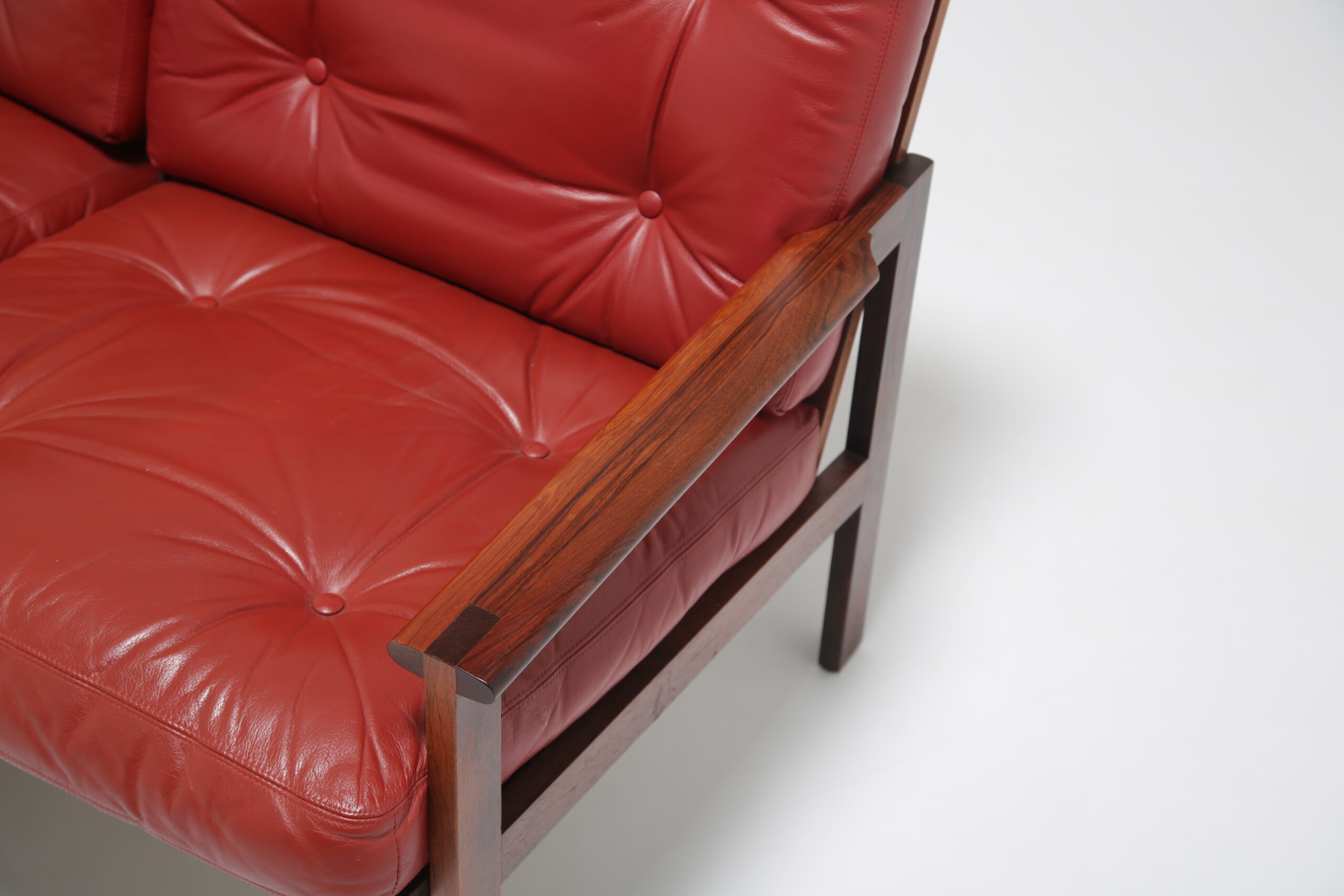 The deep red leather upholstery adds warmth and character, while the buttoned seat and back cushions introduce a refined, tailored finish synonymous with high-end Scandinavian craftsmanship of the era.