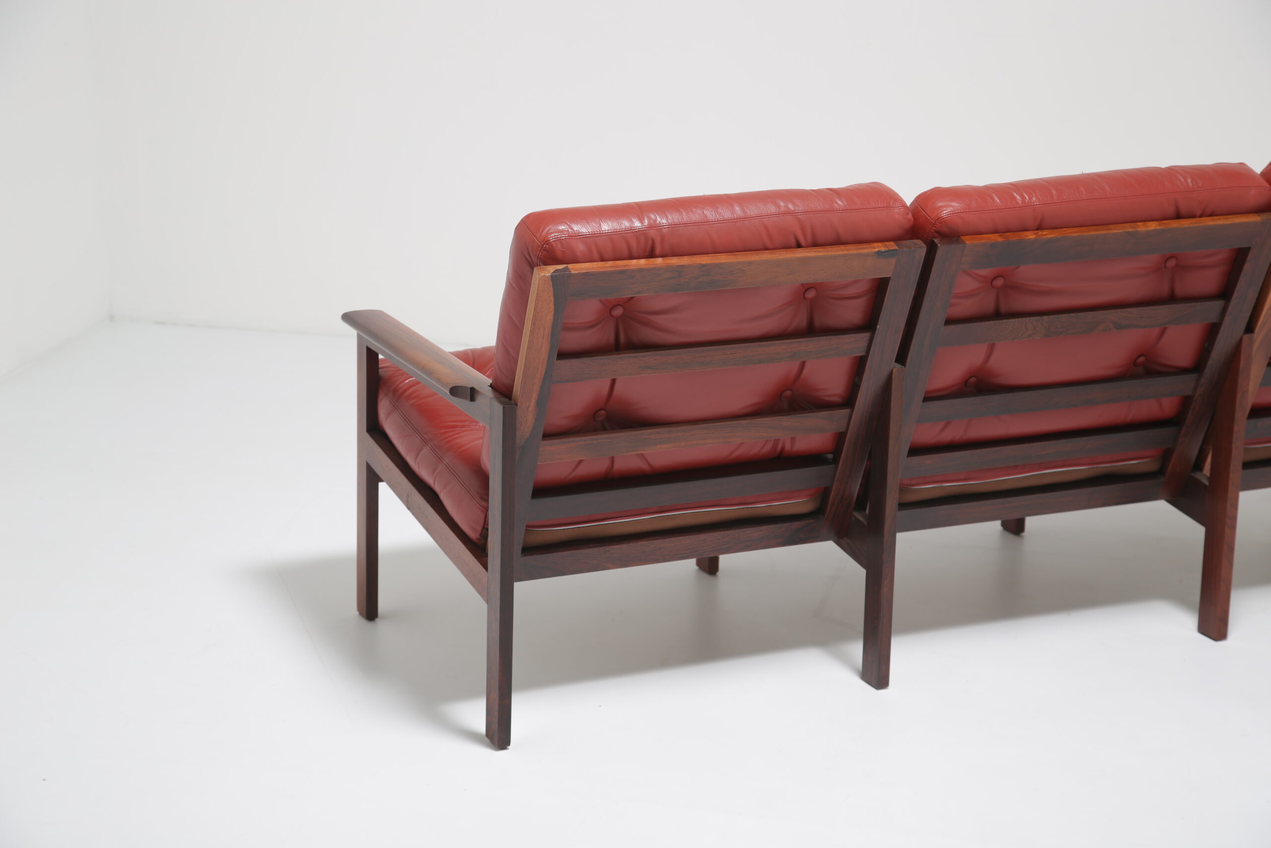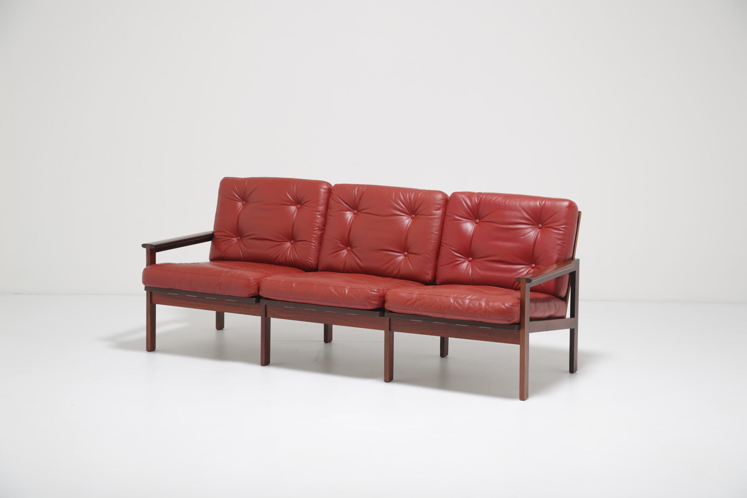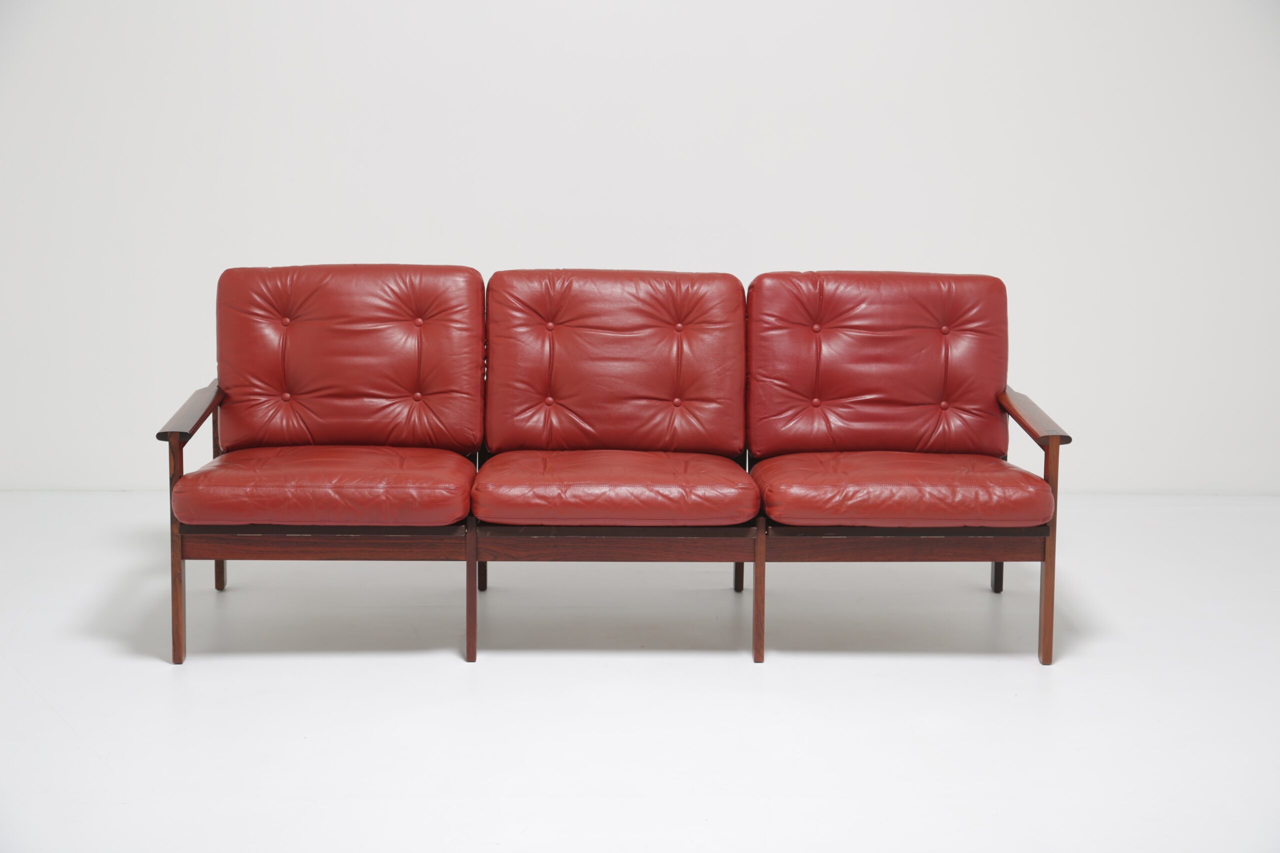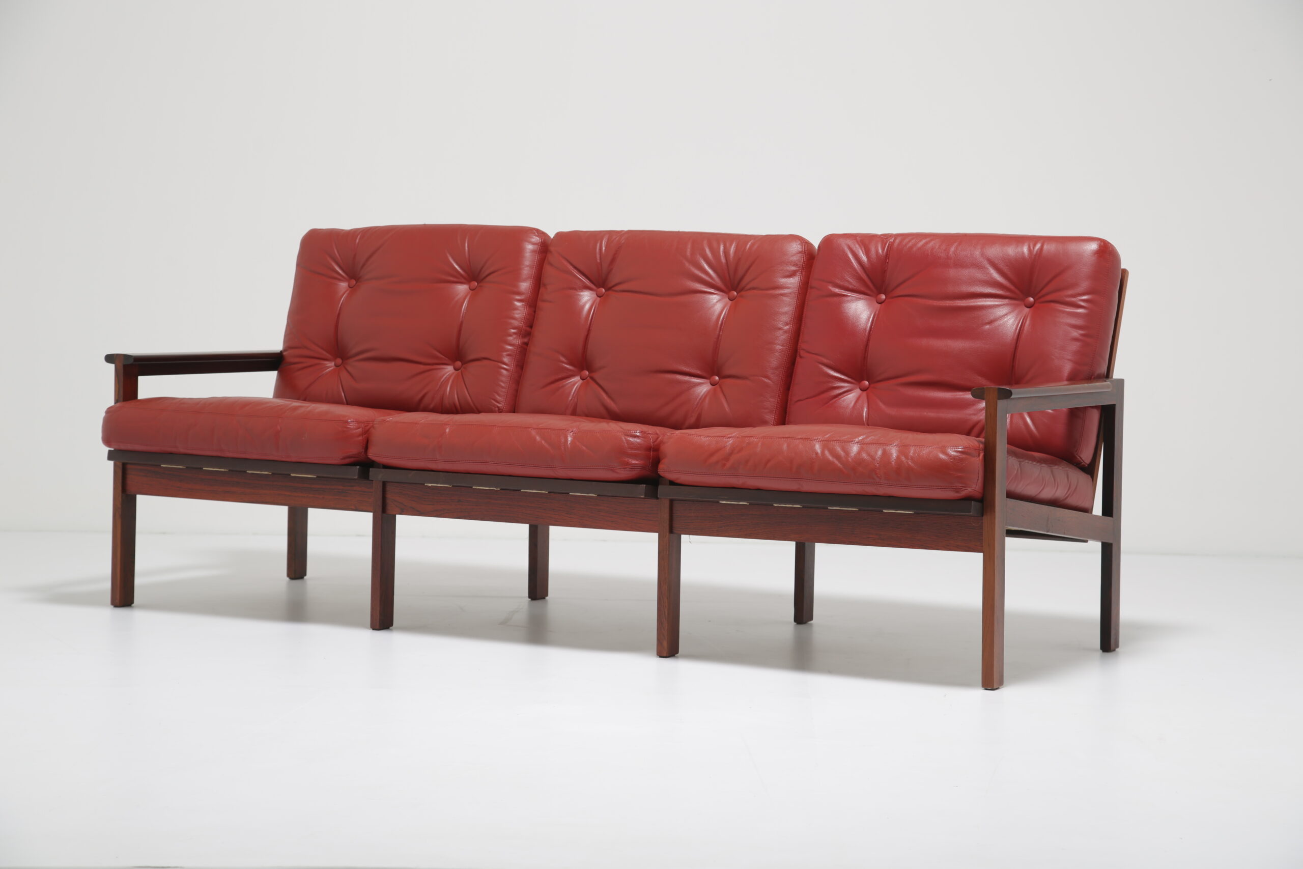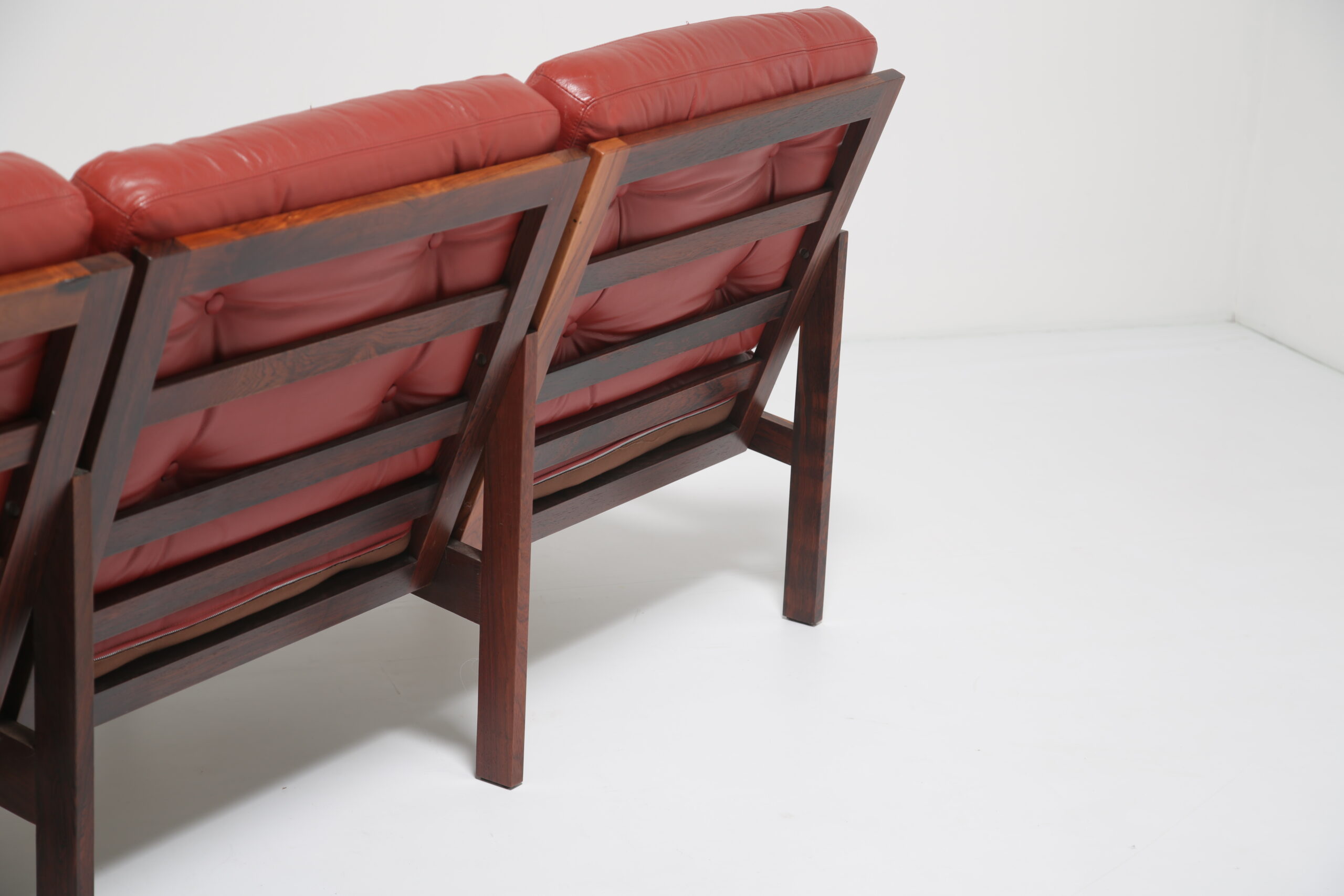 The deep red leather upholstery adds warmth and character, while the buttoned seat and back cushions introduce a refined, tailored finish synonymous with high-end Scandinavian craftsmanship of the era.