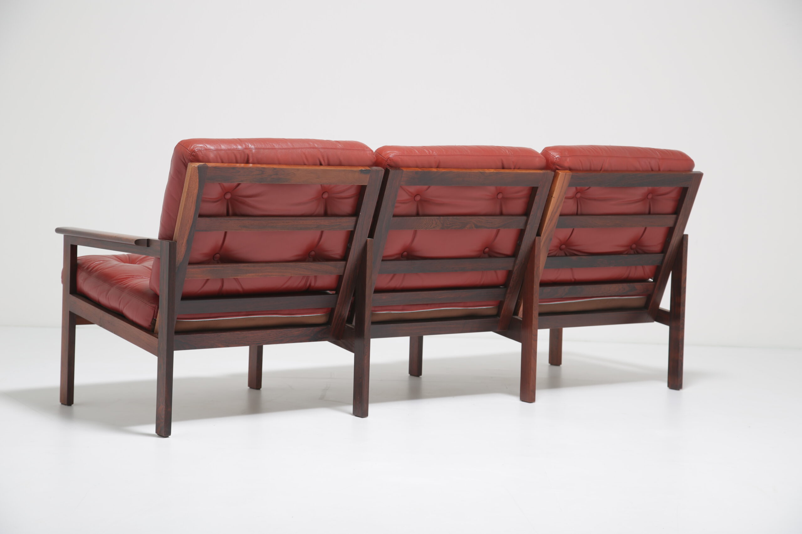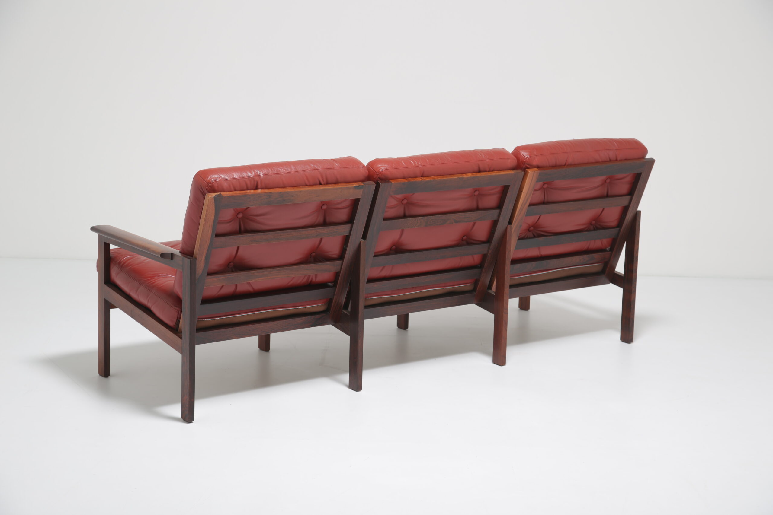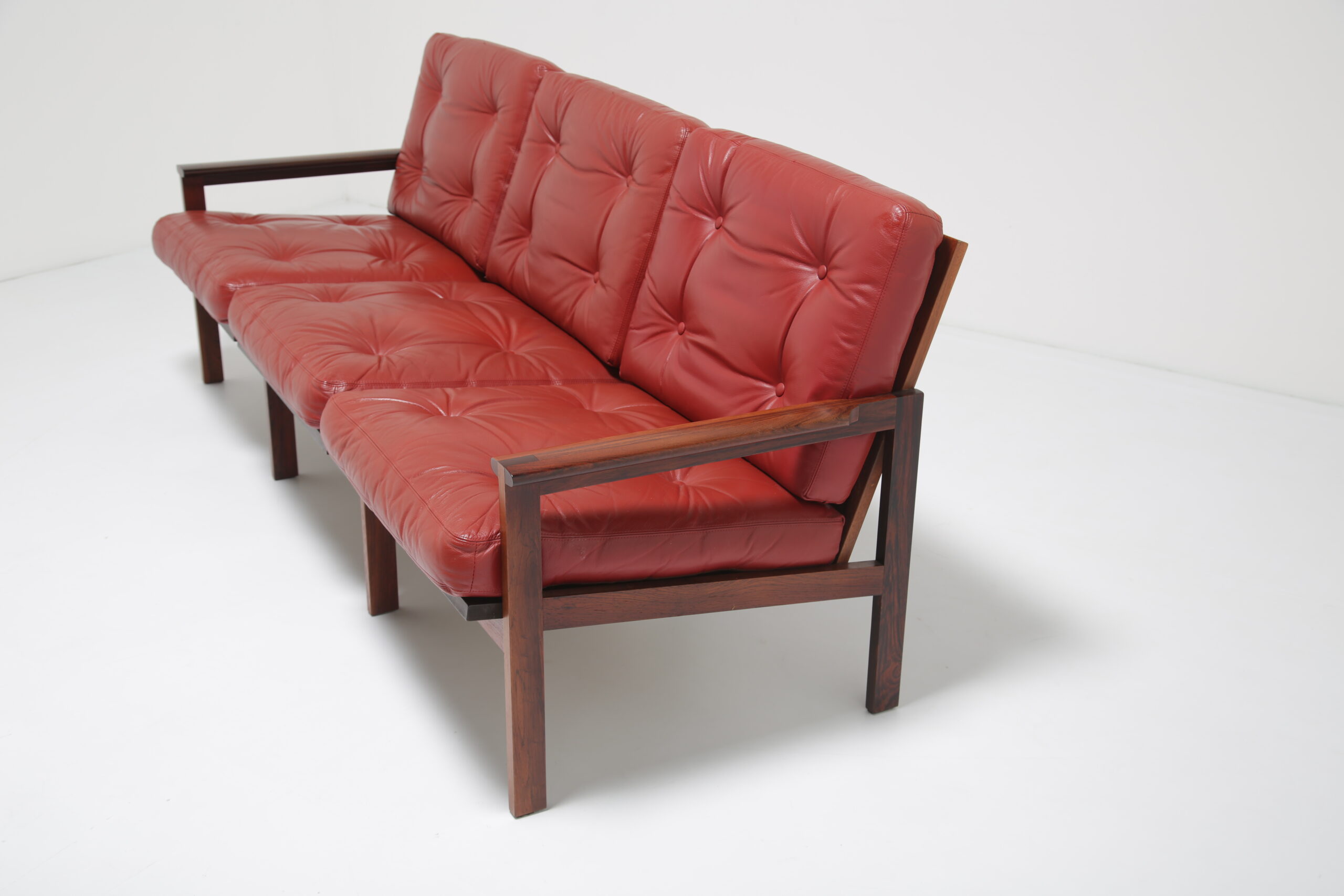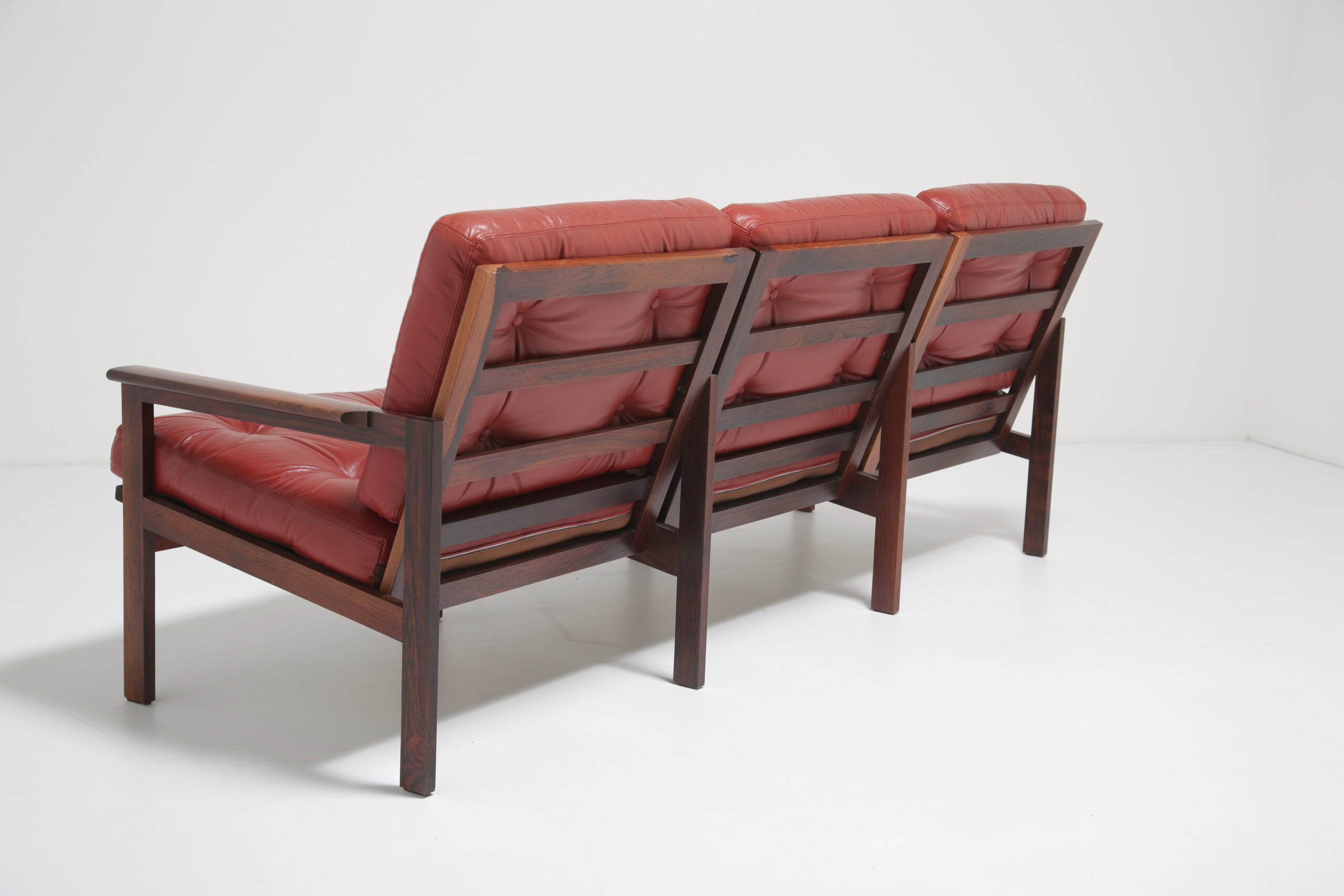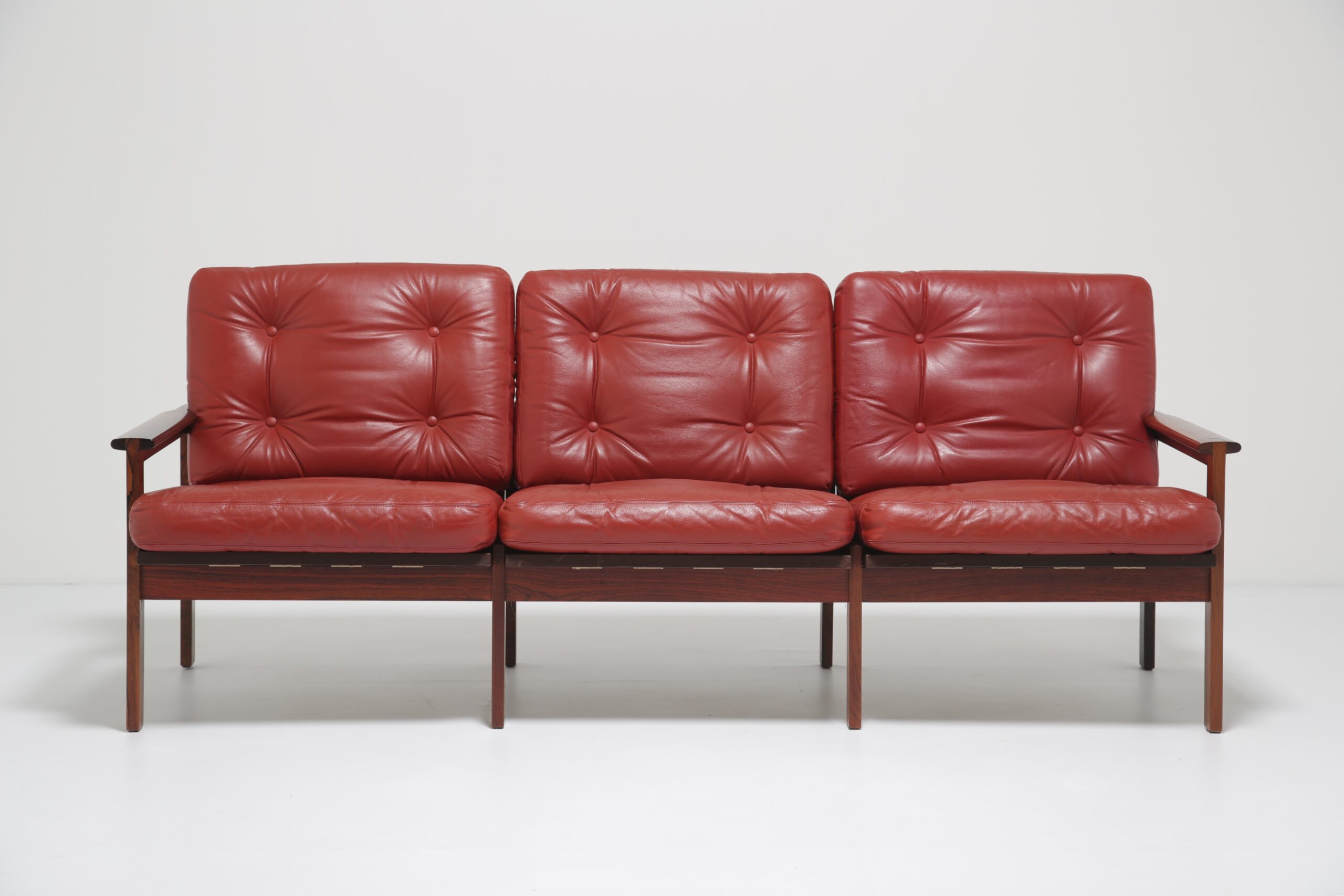The deep red leather upholstery adds warmth and character, while the buttoned seat and back cushions introduce a refined, tailored finish synonymous with high-end Scandinavian craftsmanship of the era.