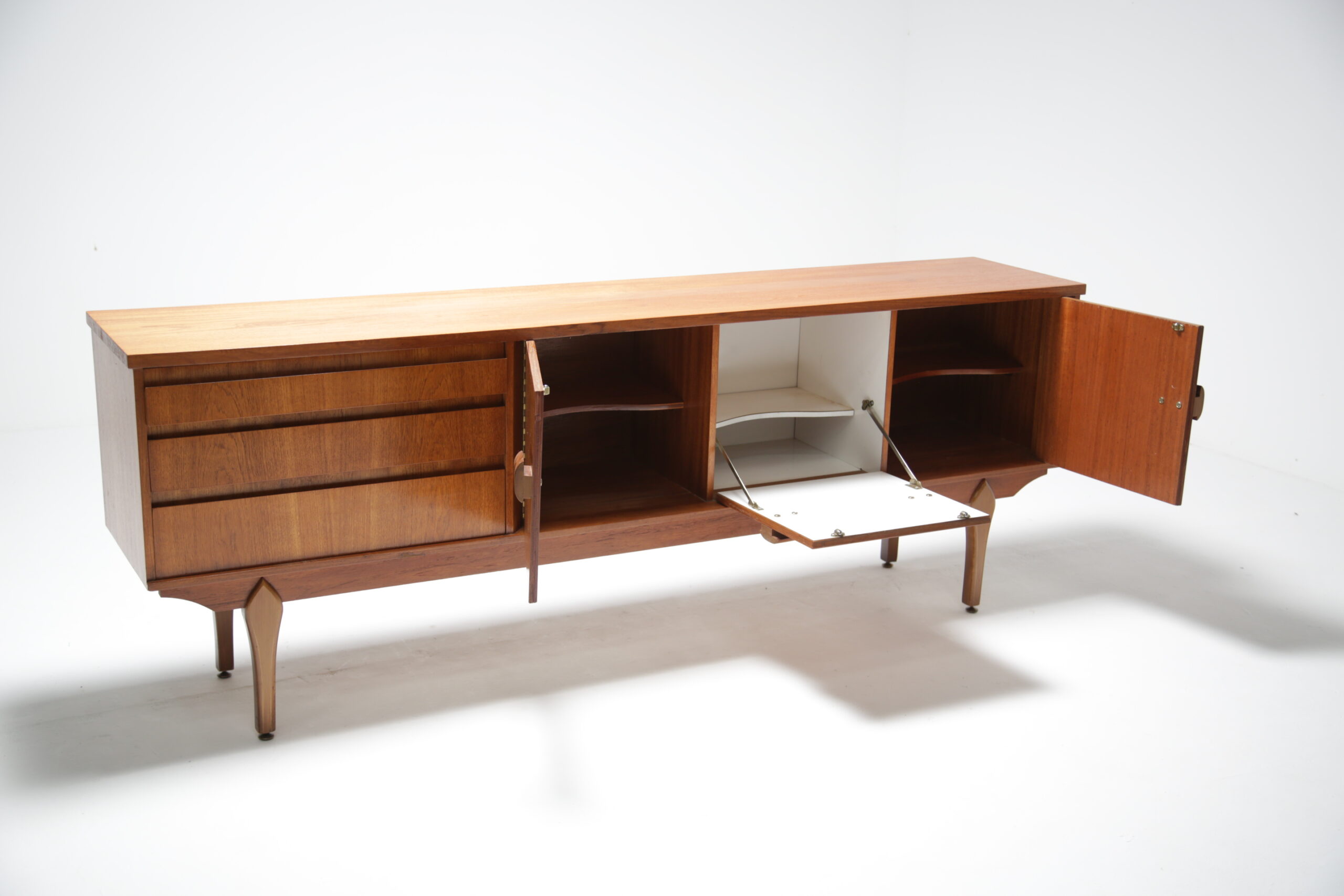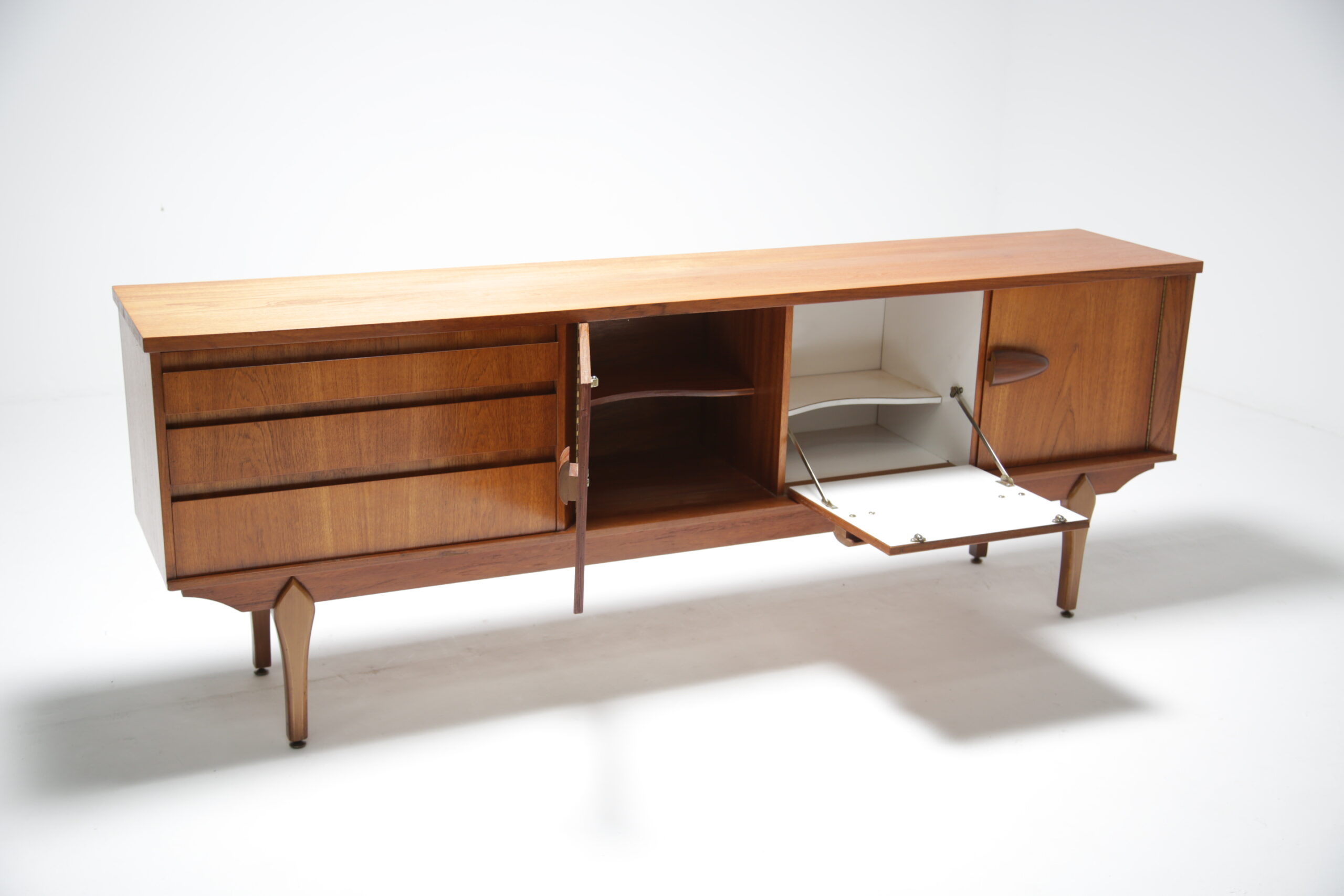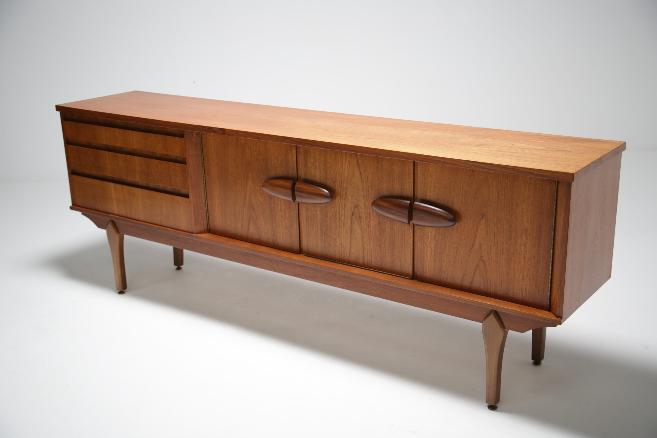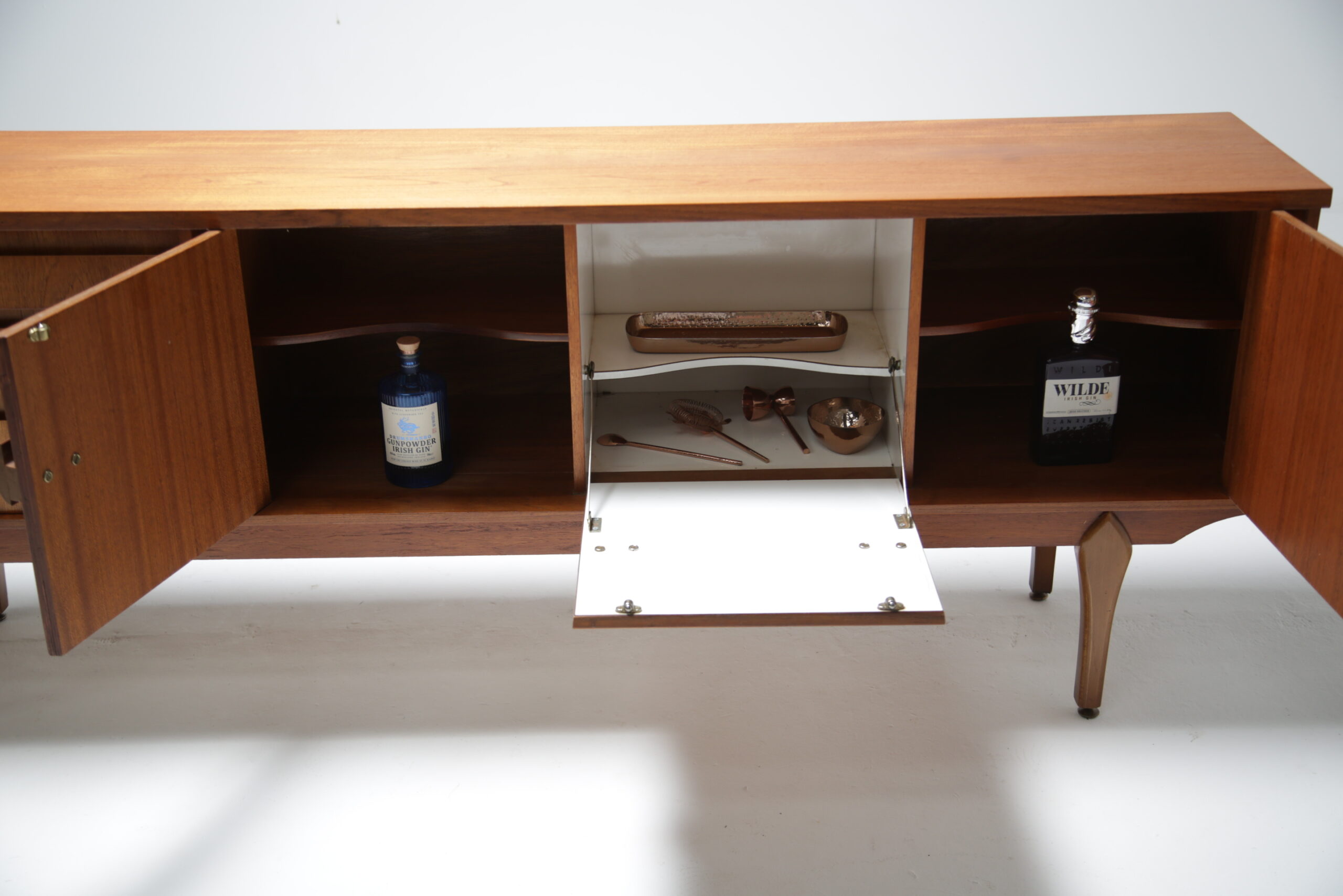 A teak sideboard made by Jentique. There are three drawers on the left and then three doors on the right. The middle door drops down to reveal a white laminate bar section. Either side of the bar are two tier cupboard sections that can hold bottles and glasses. The doors on this sideboard have beautiful tactile door handles. The middle door drops and so half of each handle drops down while the left and right door handles swing open. The doors open and close with a really satisfying click – probably a good thing if you have teenagers in the house as its only the sections that hold booze that click. Fully refurbished and in wonderful vintage condition. Pricing includes delivery anywhere in Ireland.