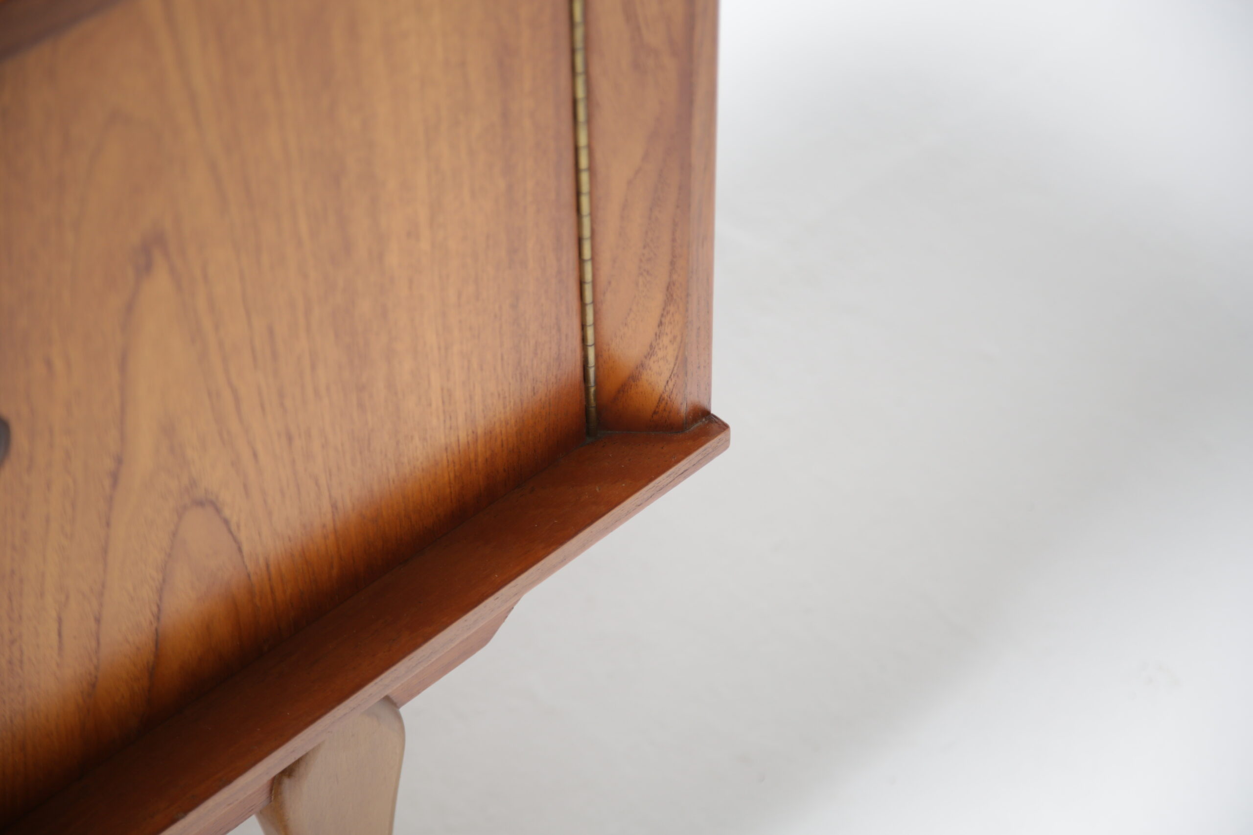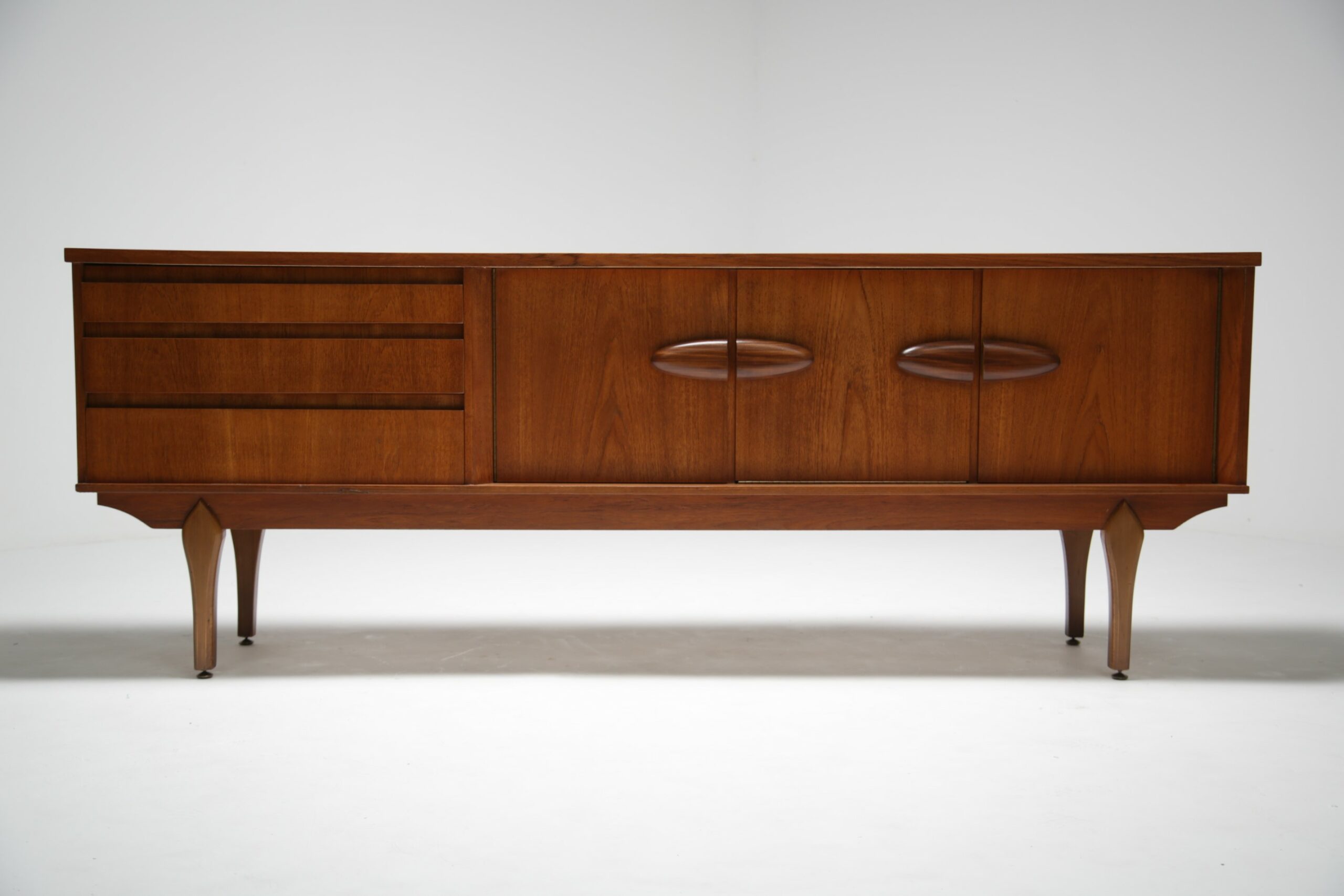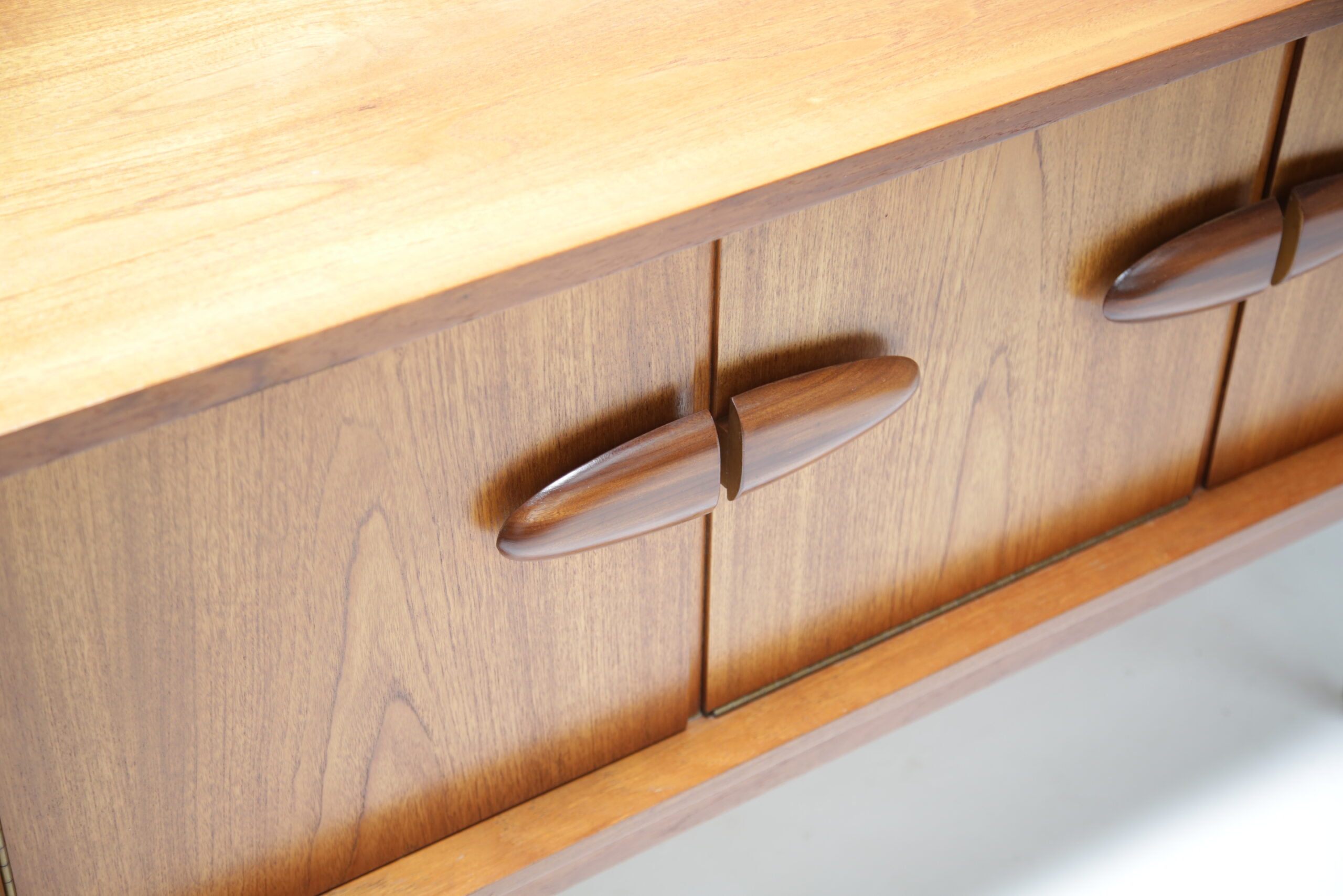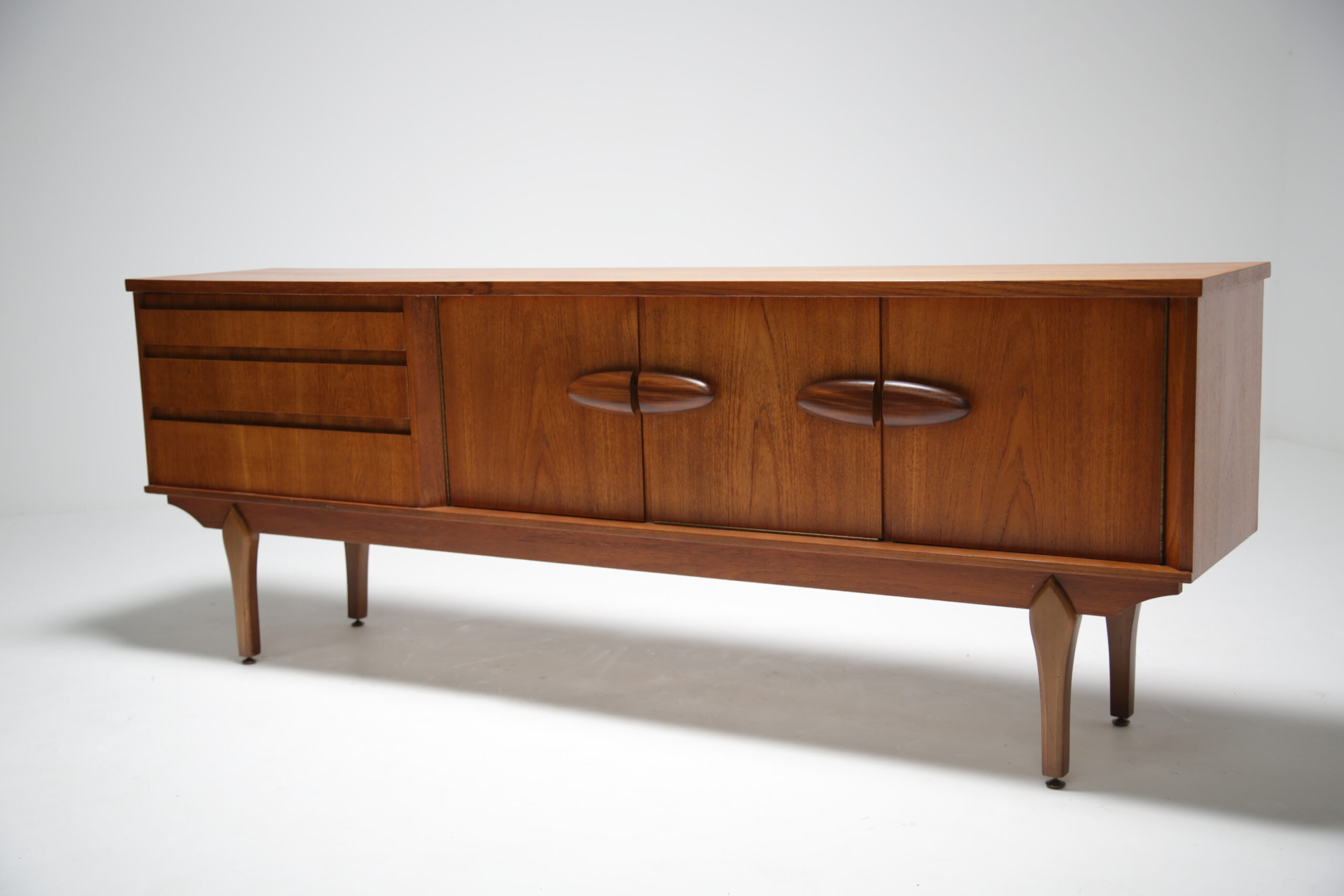 A teak sideboard made by Jentique. There are three drawers on the left and then three doors on the right. The middle door drops down to reveal a white laminate bar section. Either side of the bar are two tier cupboard sections that can hold bottles and glasses. The doors on this sideboard have beautiful tactile door handles. The middle door drops and so half of each handle drops down while the left and right door handles swing open. The doors open and close with a really satisfying click – probably a good thing if you have teenagers in the house as its only the sections that hold booze that click. Fully refurbished and in wonderful vintage condition. Pricing includes delivery anywhere in Ireland.