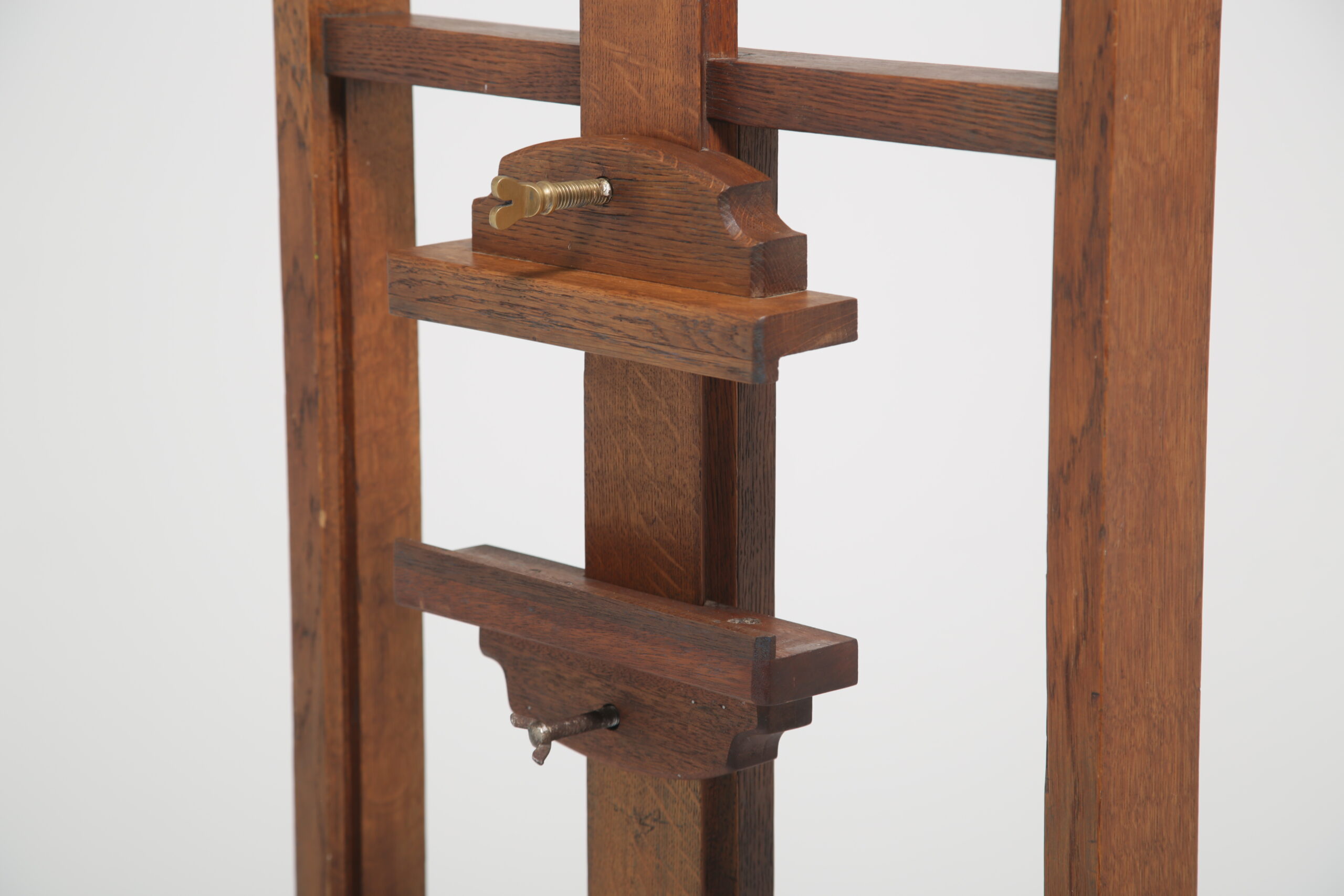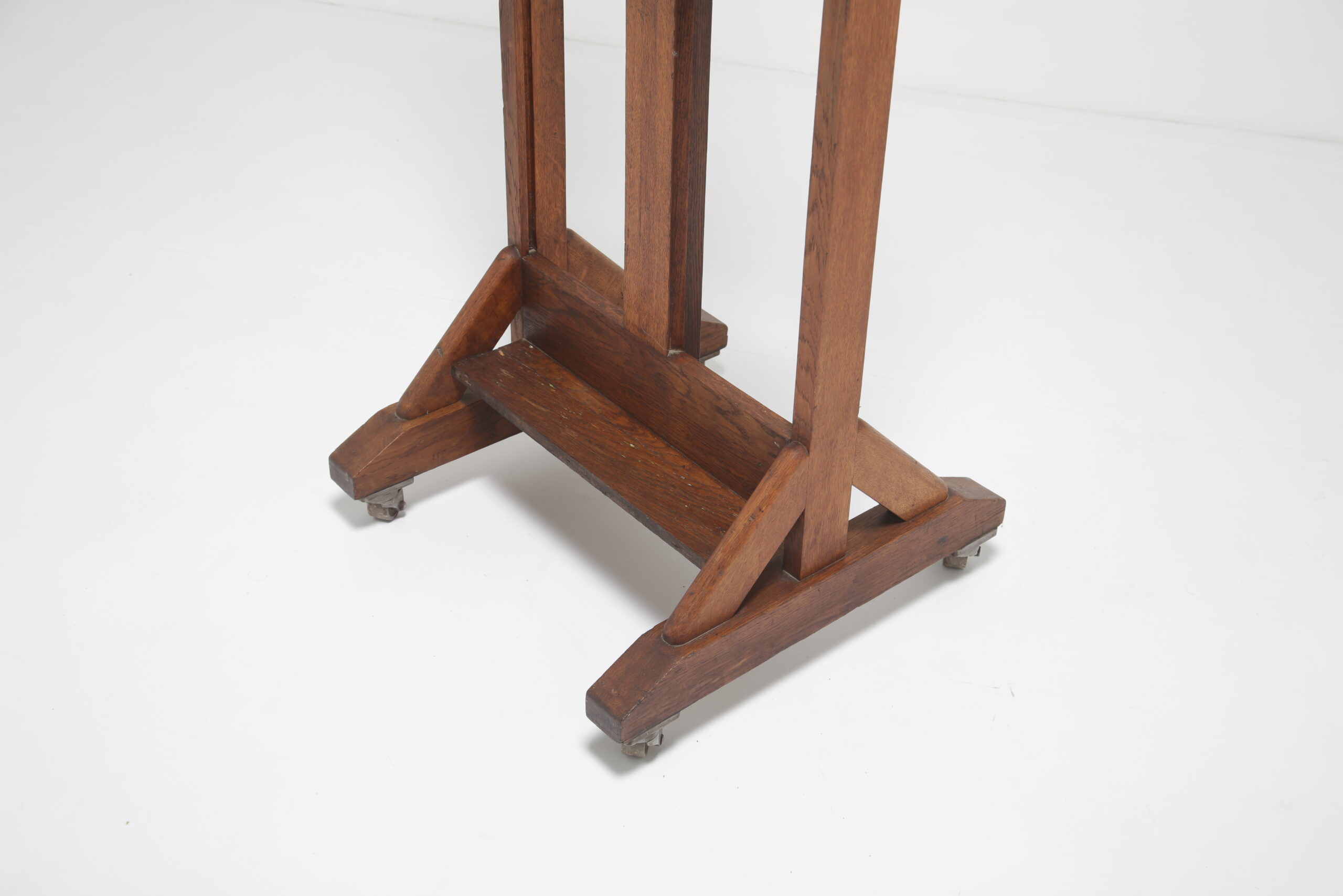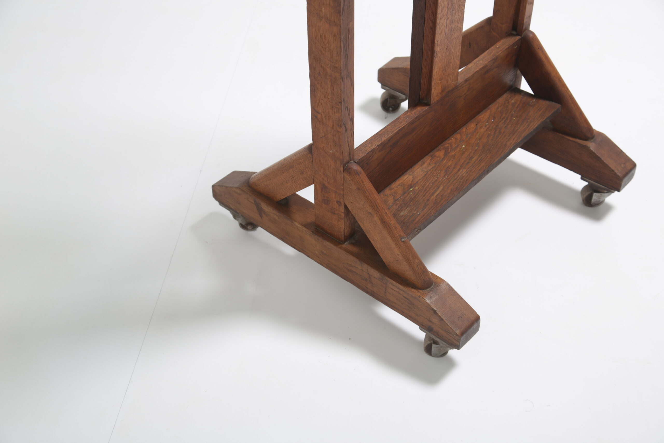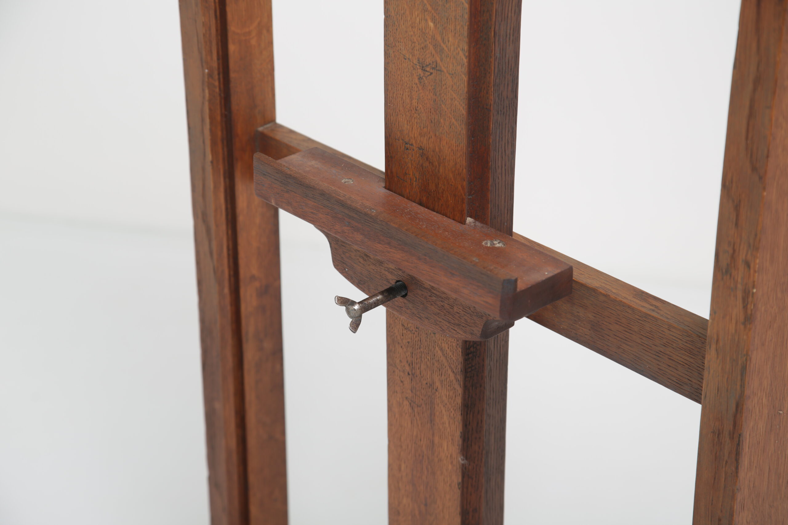 A beautifully timeworn late Victorian artist’s gallery easel, crafted from solid timber and designed for both functionality and presence. This piece features a classic upright studio form, with a central adjustable mast allowing the canvas height to be altered with ease, secured by simple wooden brackets. The proportions are well balanced, with twin rear supports and a sturdy base that sits on original castors, making it easy to maneuver around a studio space.