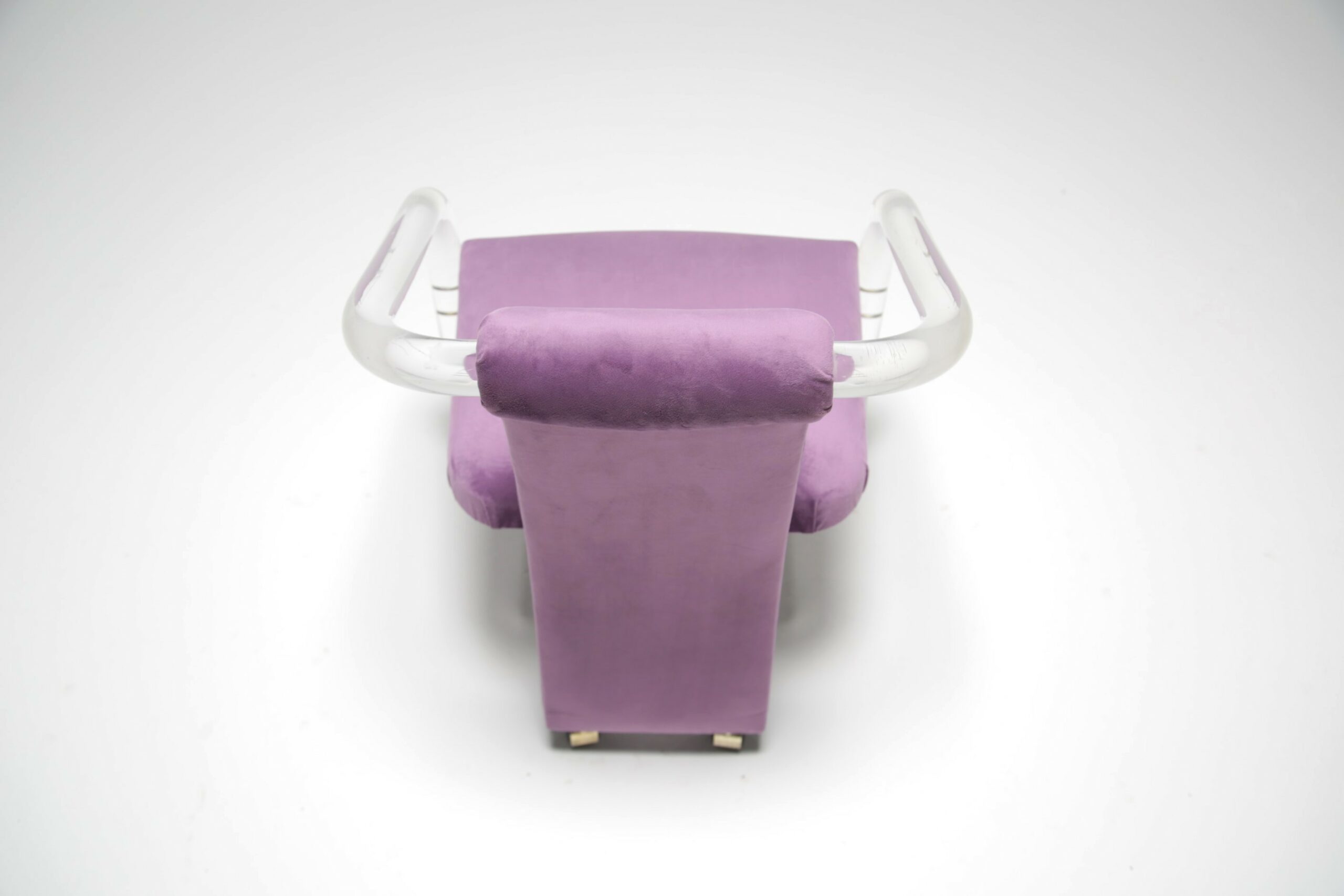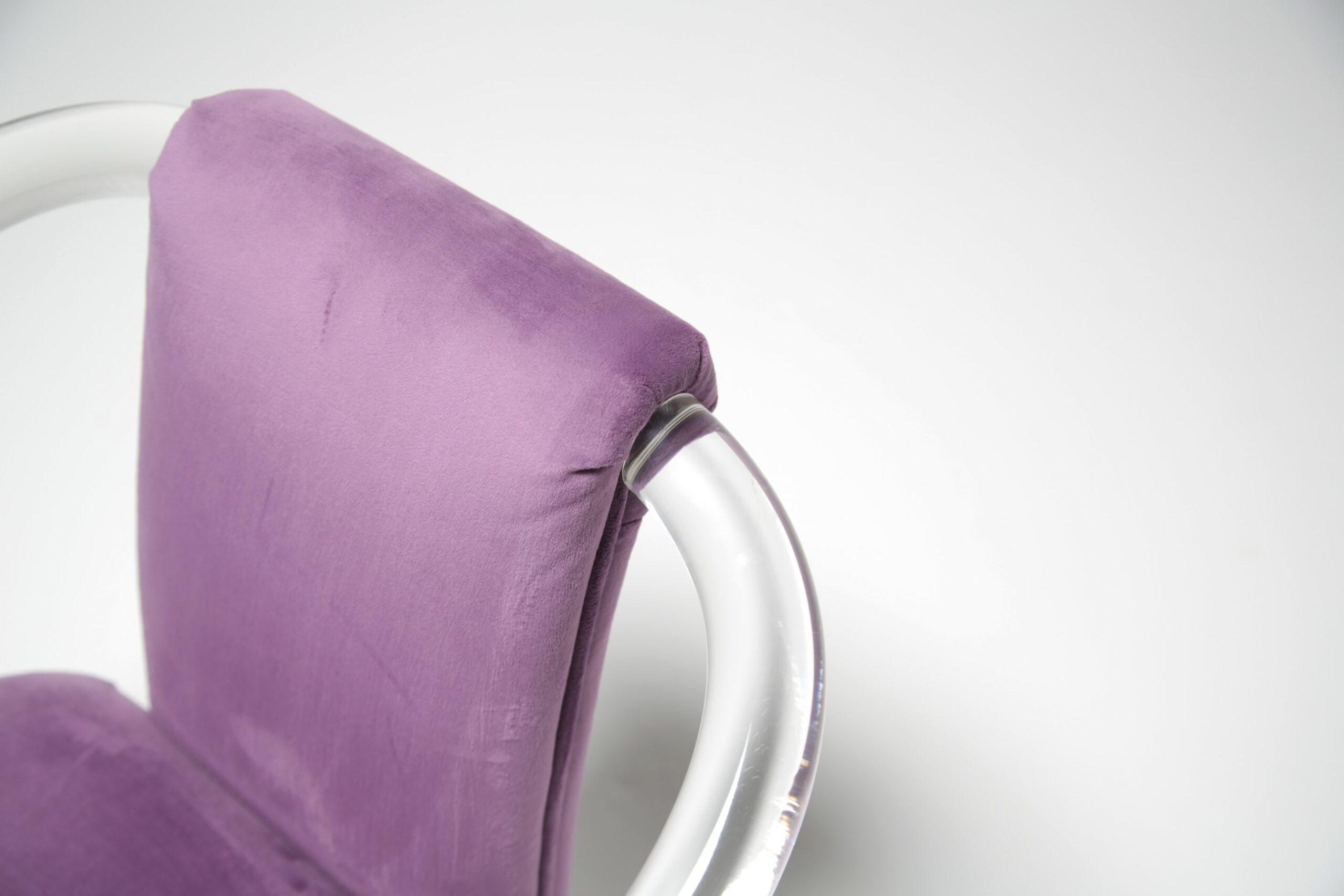 Experience timeless elegance with our Vintage Lucite and Purple Velvet Armchair, designed by Charles Hollis Jones in the 1970s. Crafted from solid tubular lucite. This chair boasts a plush purple velvet upholstery and gold-colored wheels. It is a blending mid-century modern design with luxurious comfort.