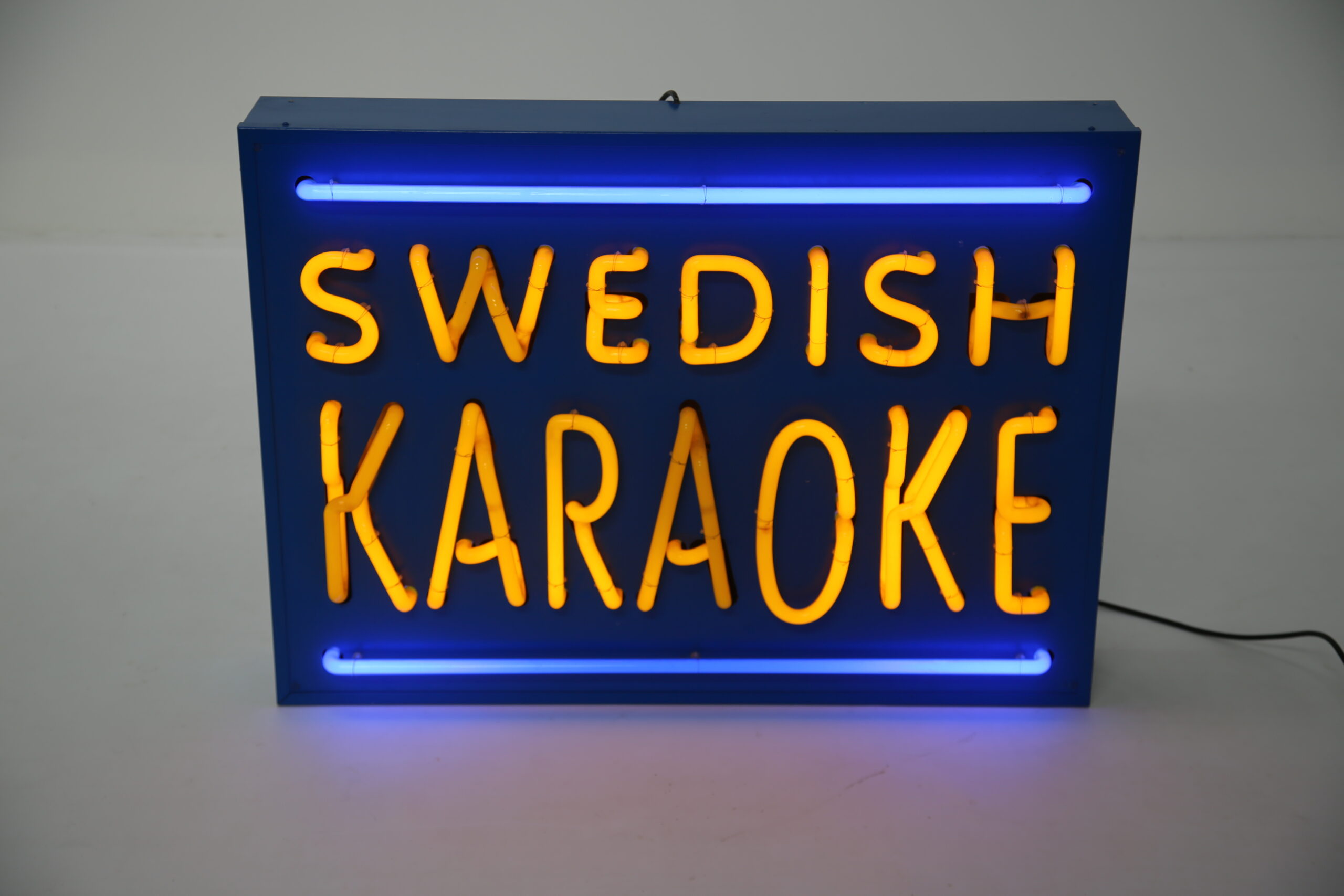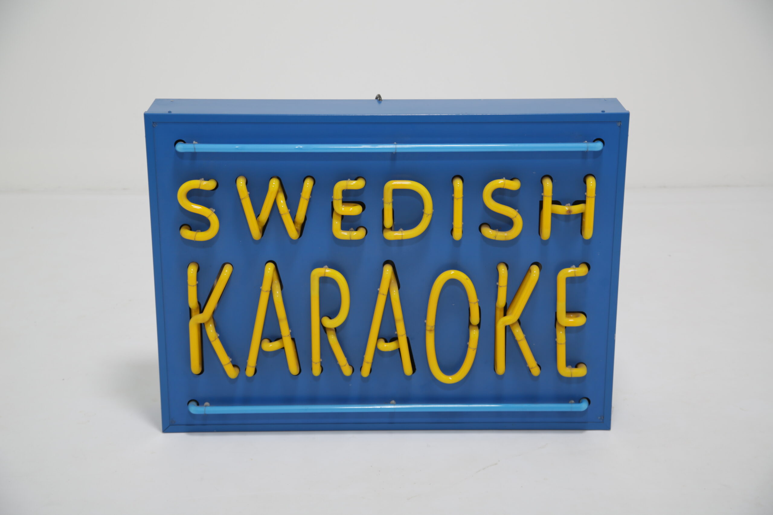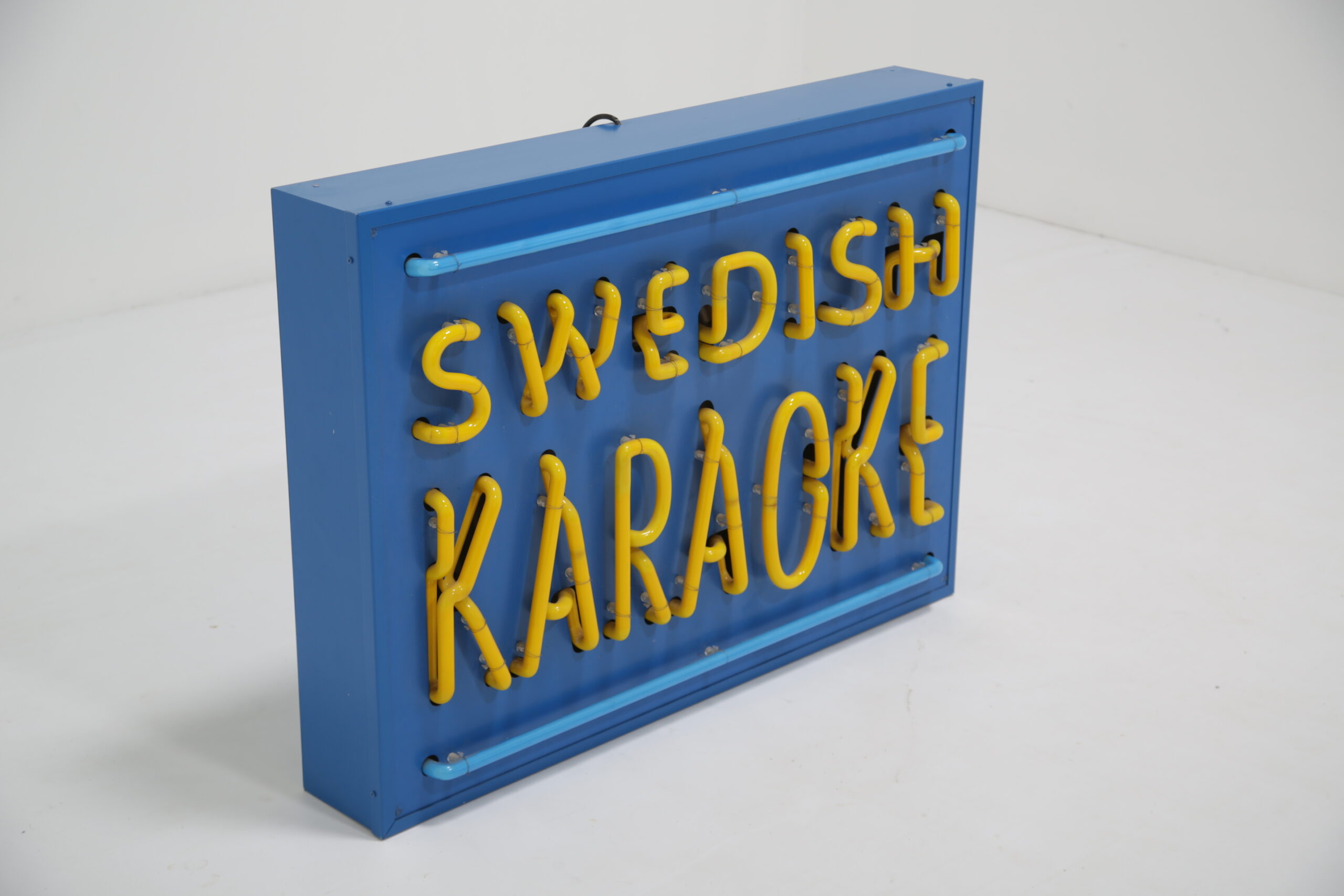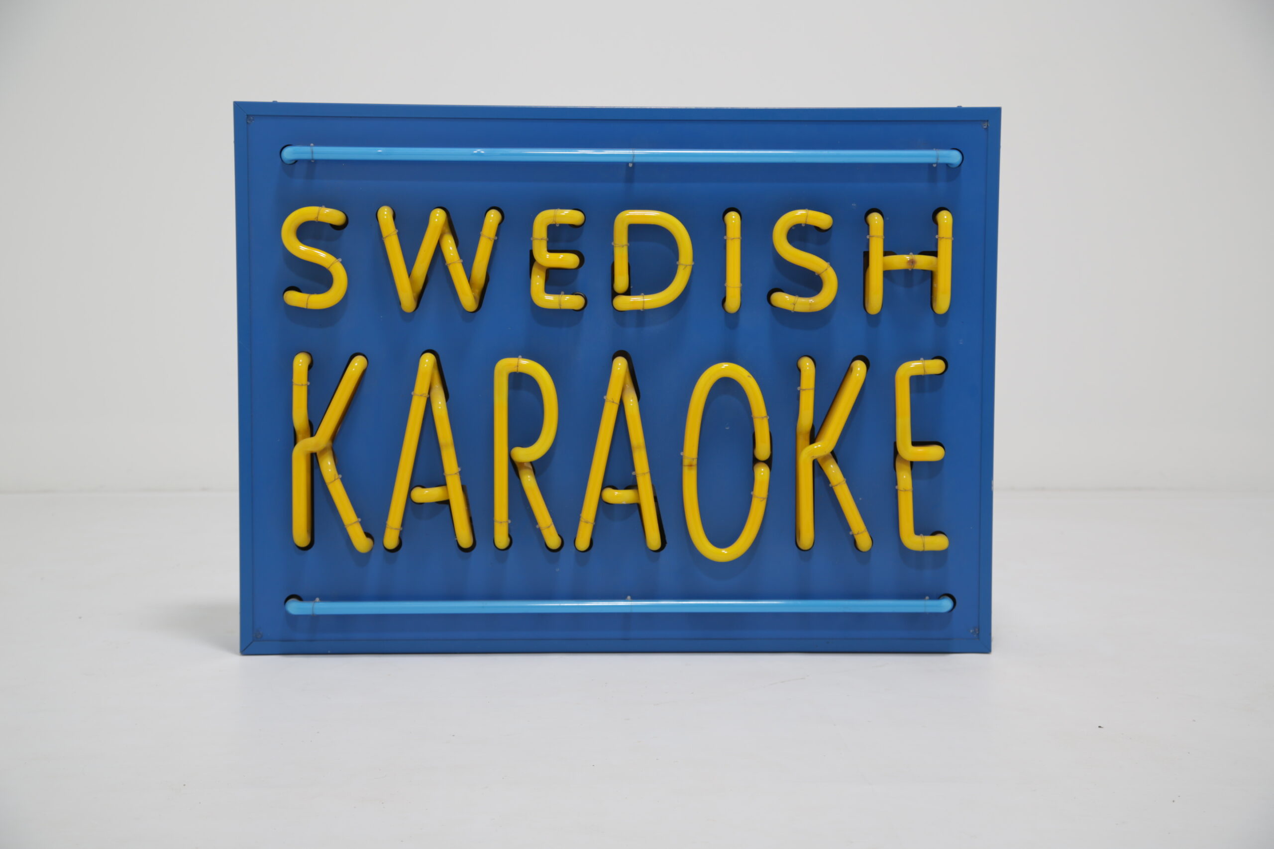 Spruce up your bar or walls with this light up neon sign with the text “Swedish Karaoke”. Featuring a blue metal box frame with yellow and blue neon lights. Imported from Sweden it has been re-wired to suit Irish and UK homes.