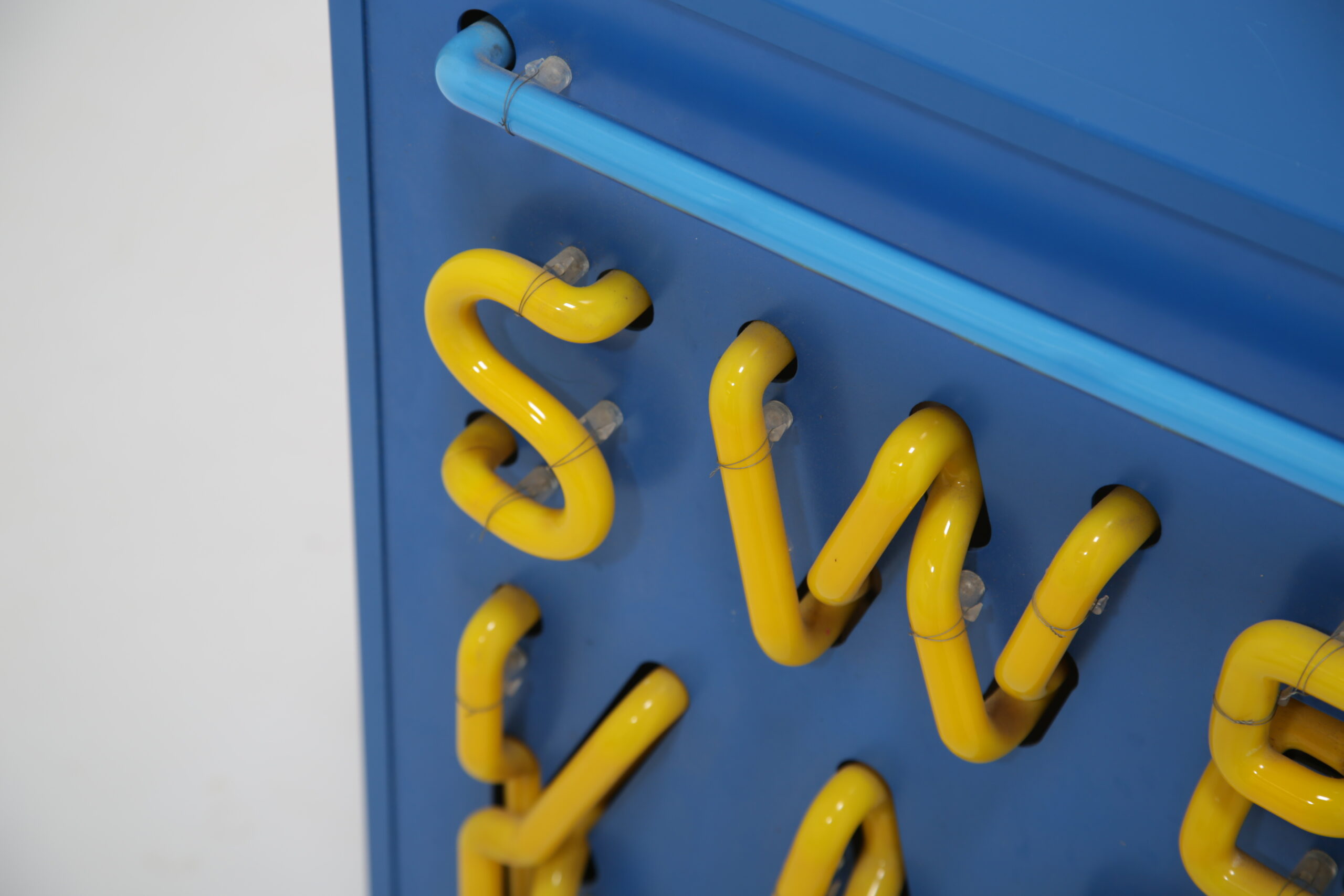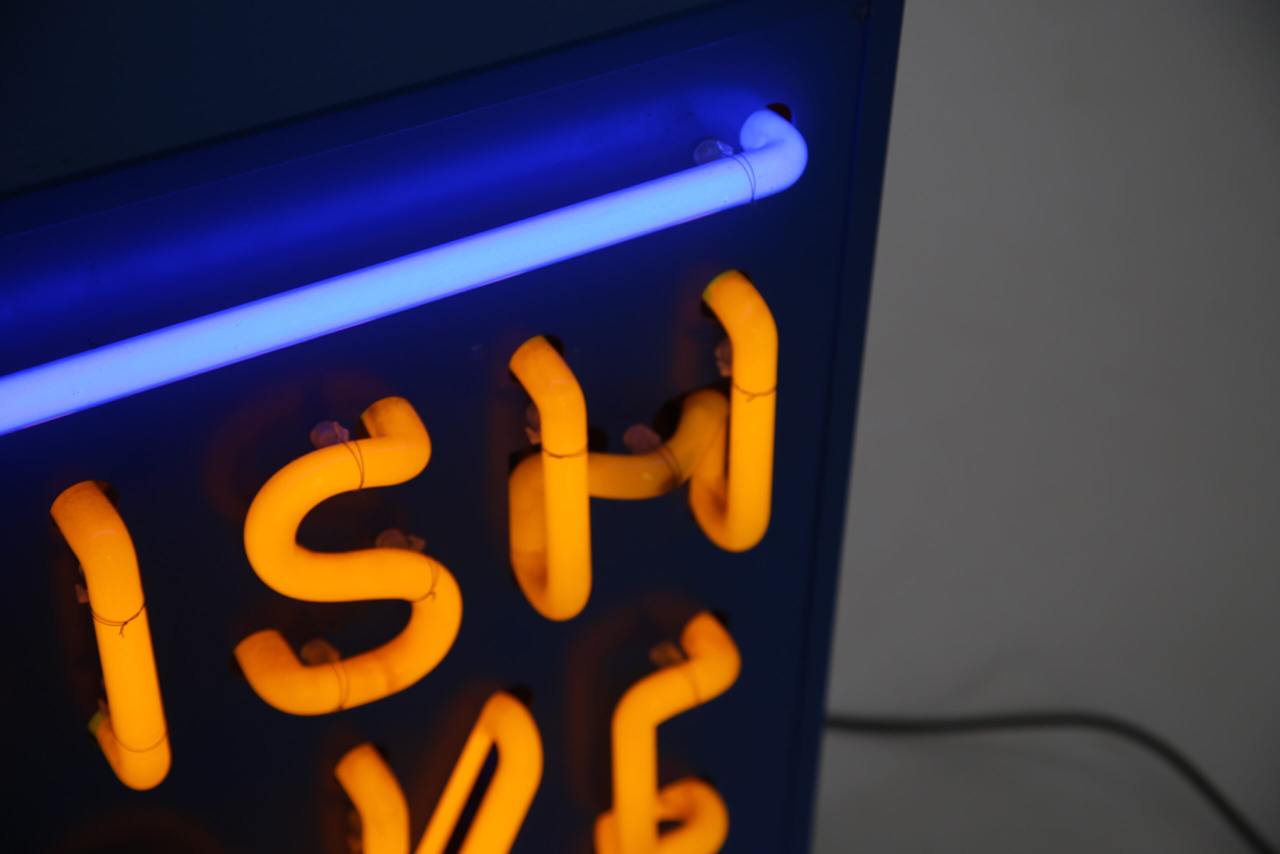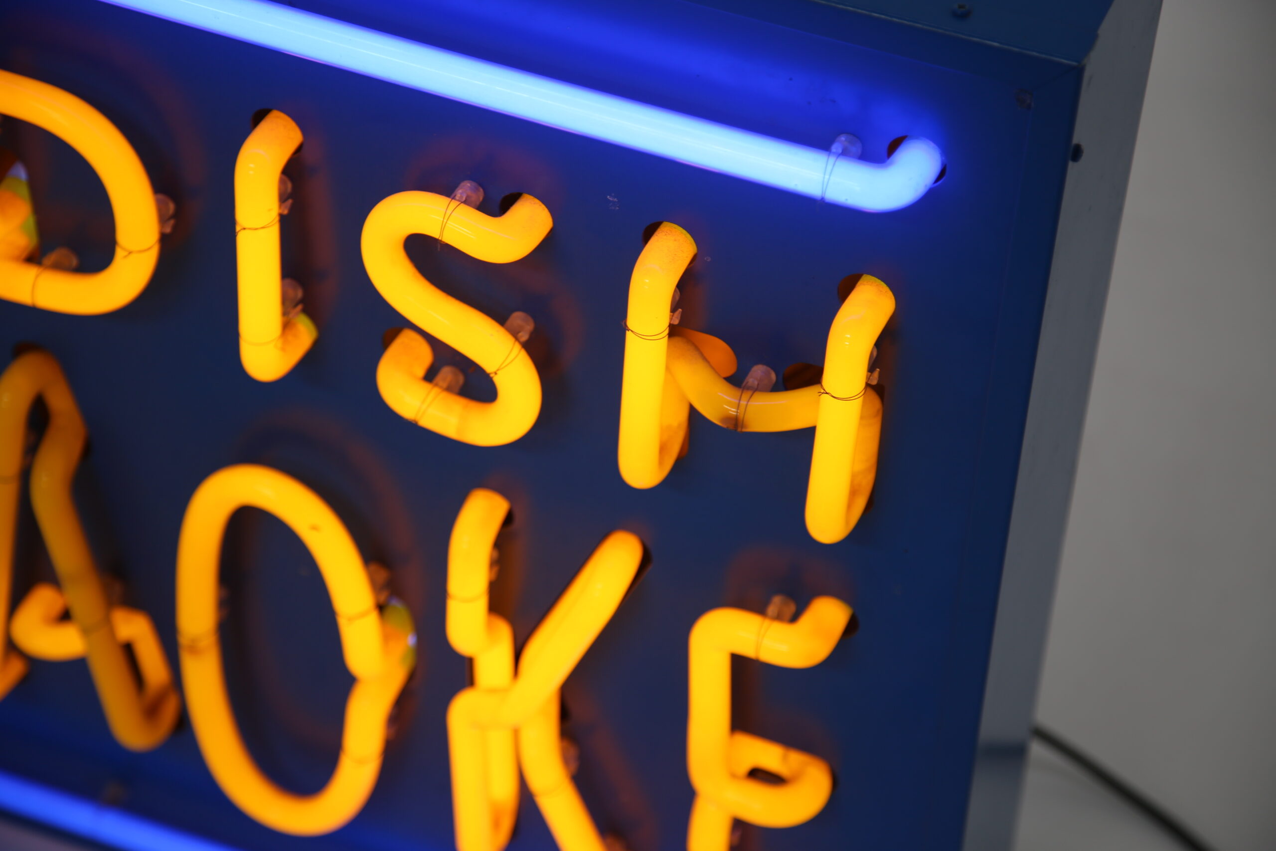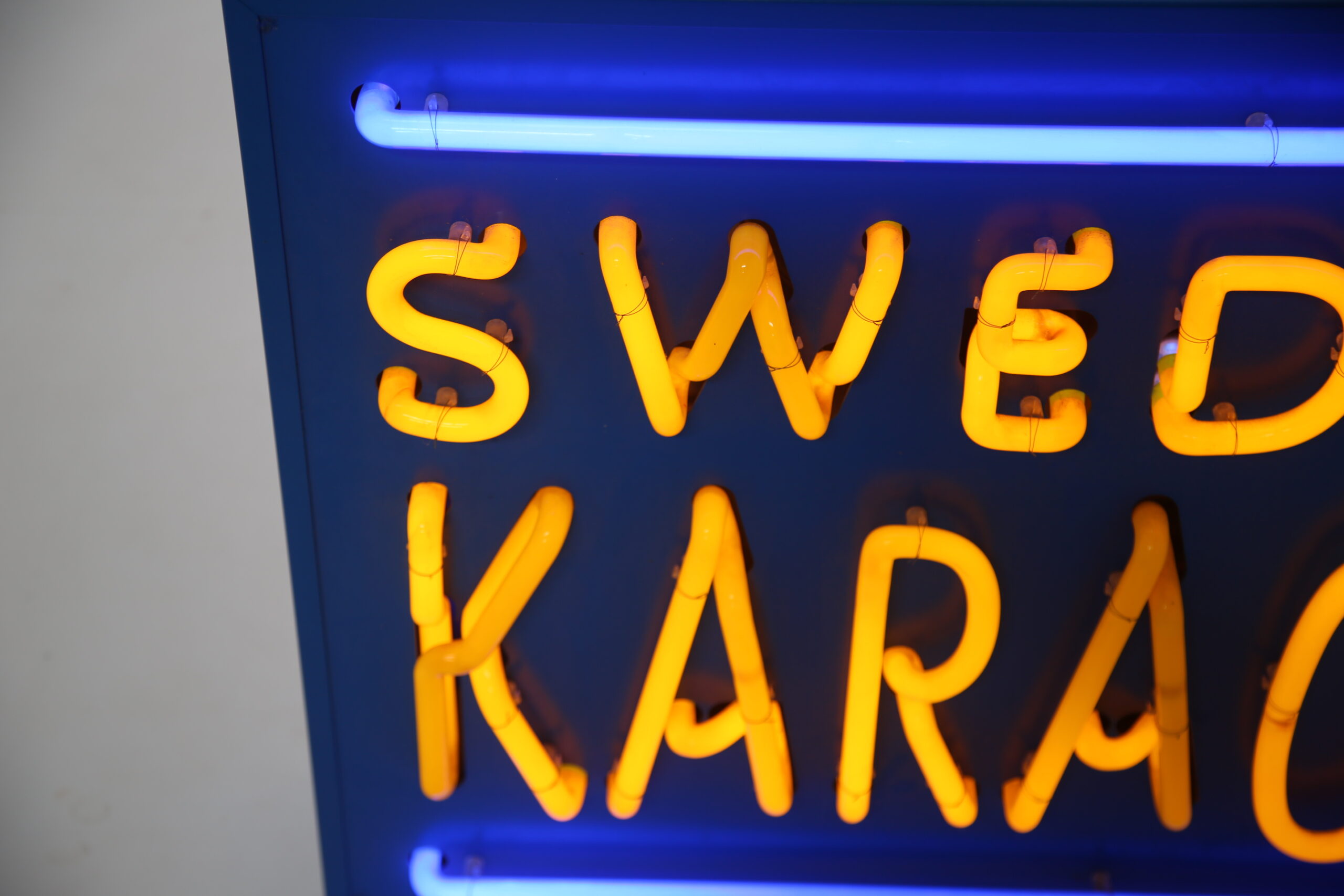 Spruce up your bar or walls with this light up neon sign with the text “Swedish Karaoke”. Featuring a blue metal box frame with yellow and blue neon lights. Imported from Sweden it has been re-wired to suit Irish and UK homes.