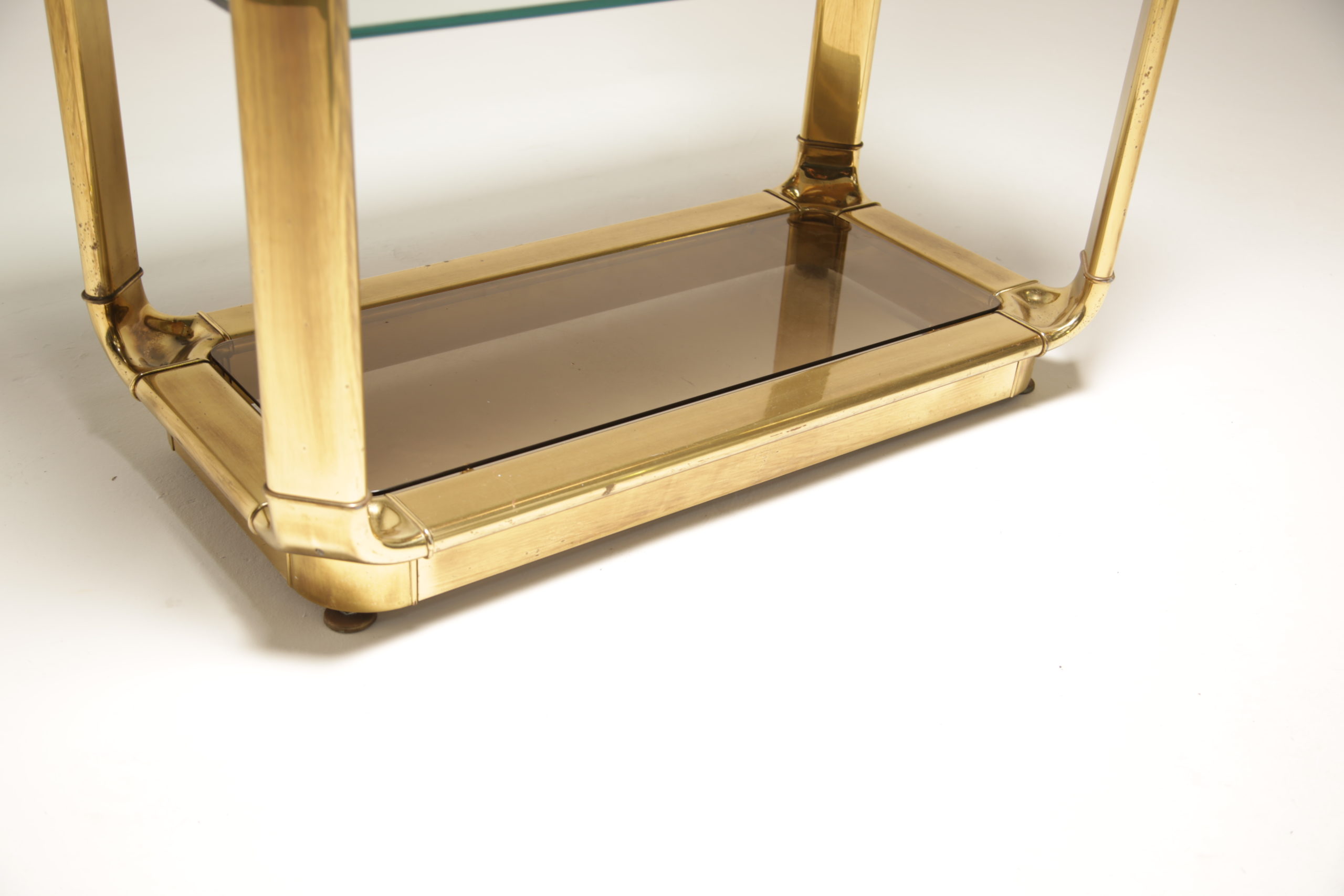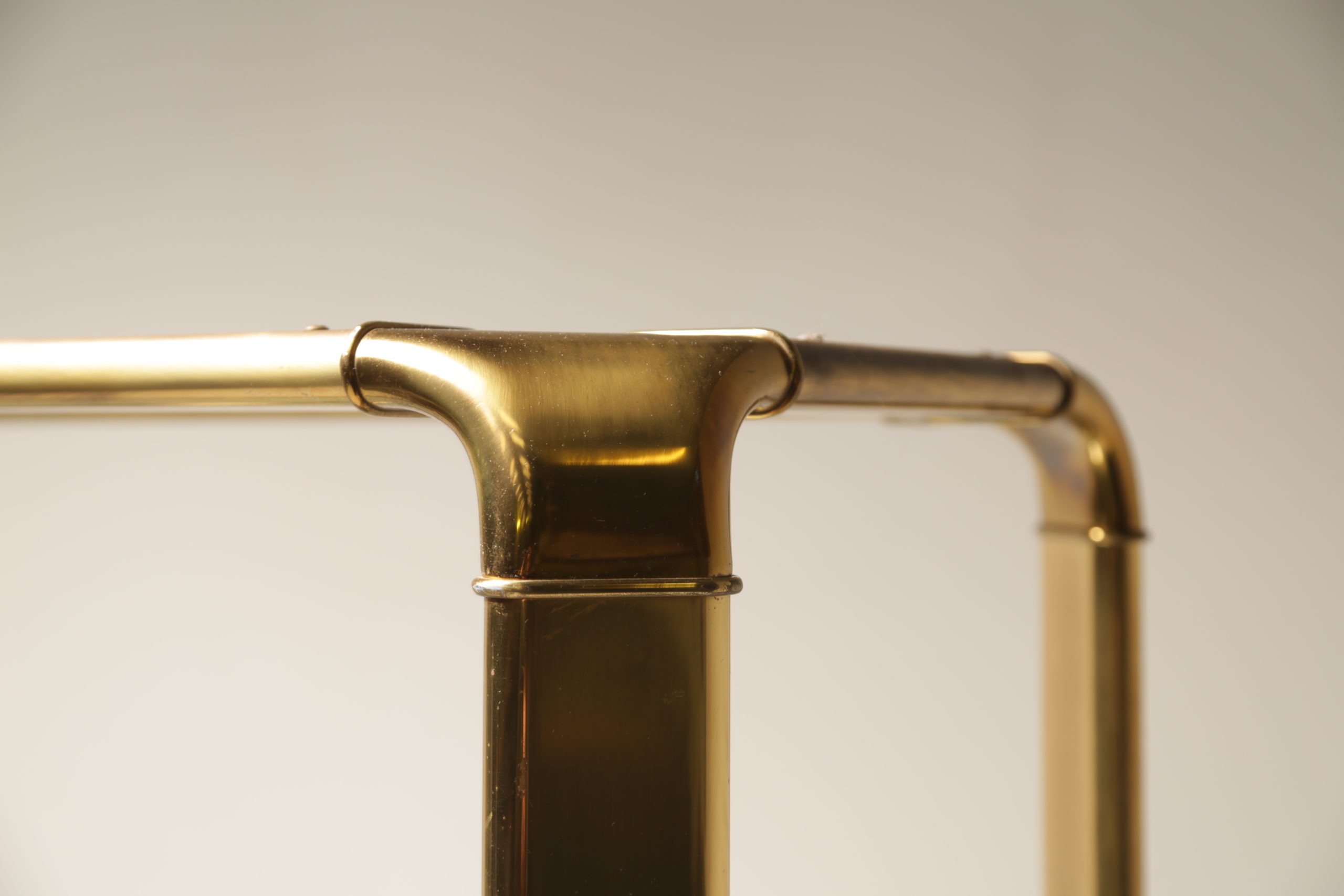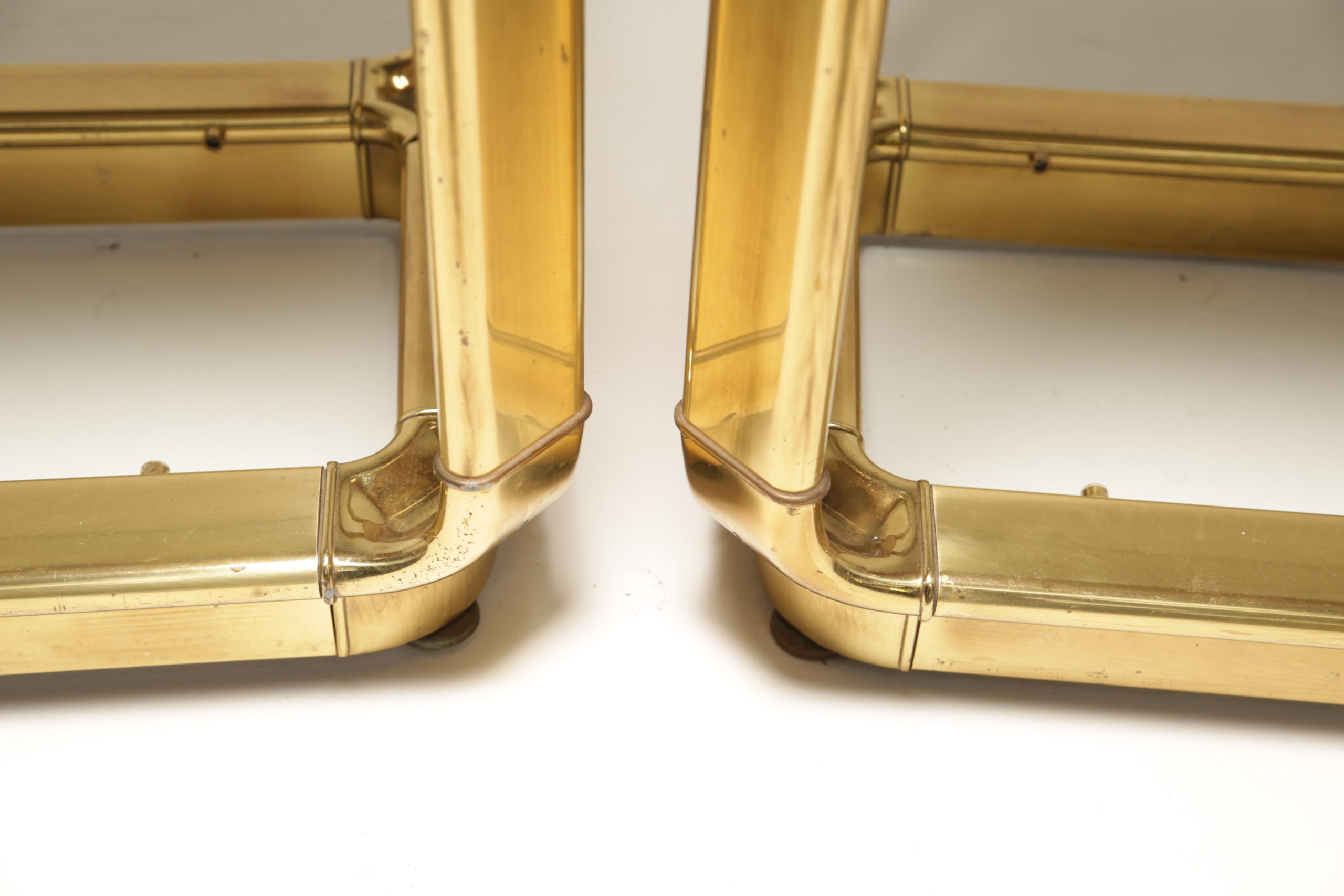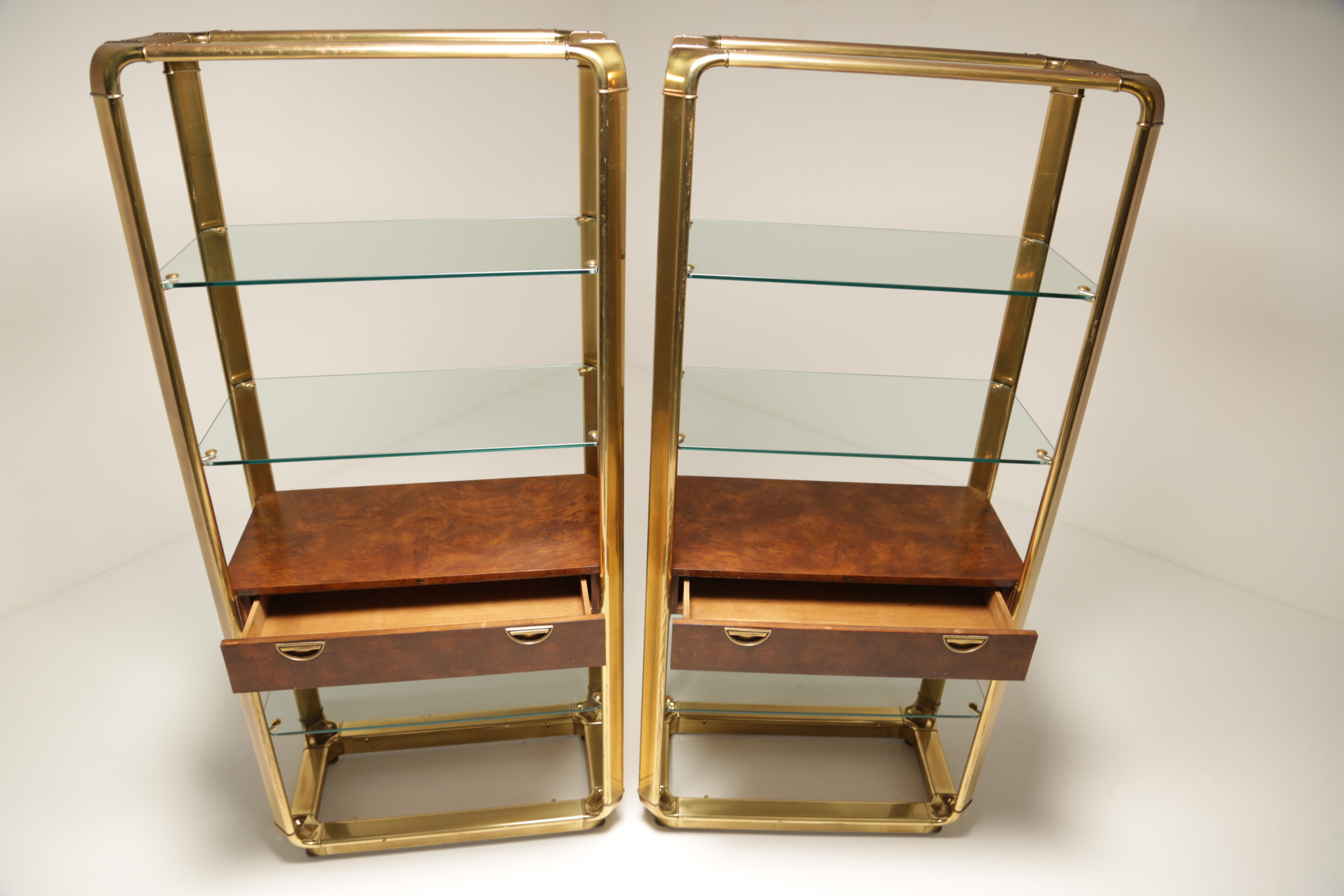 Mid-Century Burlwood Brass Etageres – Pair of dangerously heavy and beautiful etagere’s in brass with burlwood inserts and glass shelves. The frames are in a good vintage condition with a few marks on frames as highlighted in the photographs. All glass shelves are in good condition and it is important to note that during time of photograph, we were missing one of the base glass inserts which will of course be replaced upon delivery. These units were imported from the States.