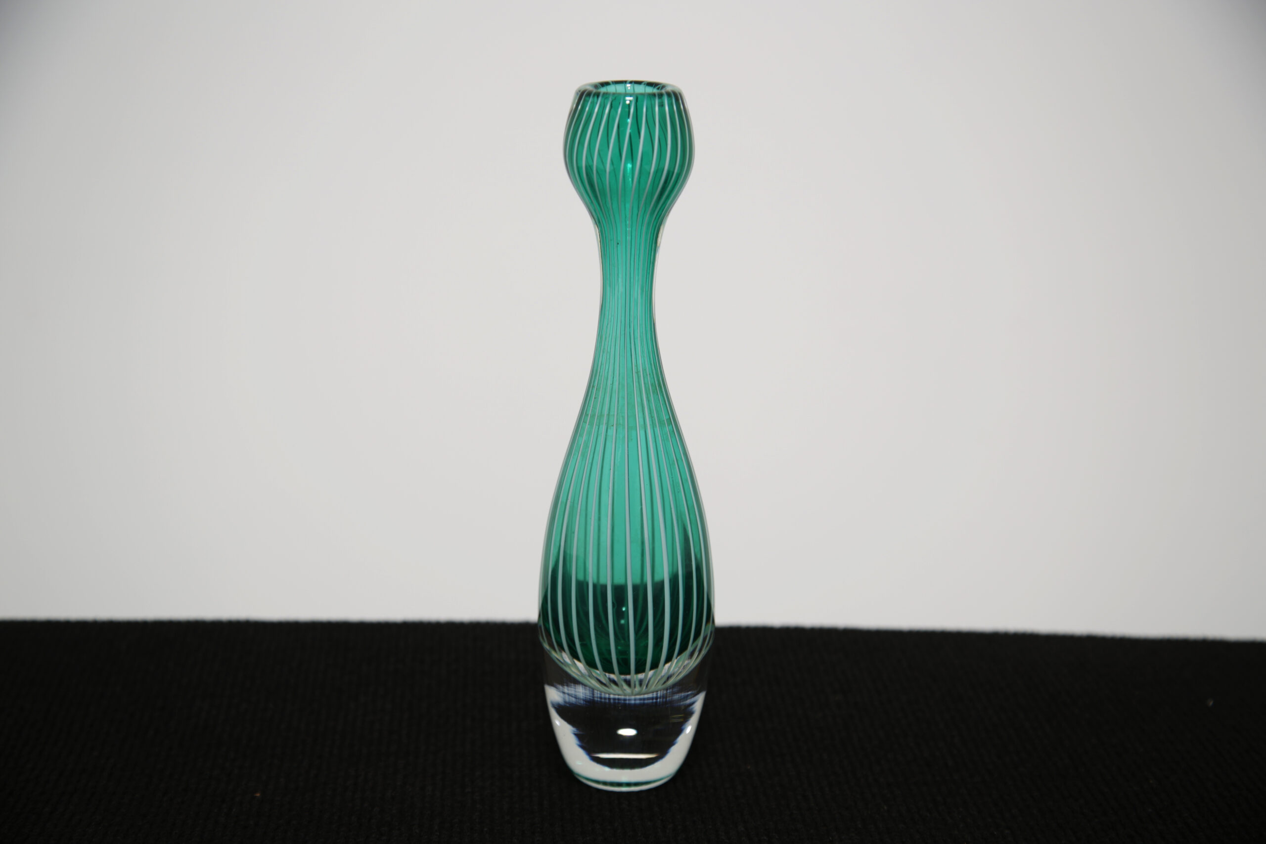 Designed by celebrated Swedish glass artist Vicke Lindstrand for Kosta Glasbruk, this striking vase features his renowned ‘Zebra’ pattern—characterized by bold linear striping in vivid green tones. The form is elegantly cylindrical with softly rounded contours, allowing the vertical stripes to elongate the piece visually and enhance its sculptural presence. Lindstrand, one of the most influential figures in Scandinavian glass design, was known for his expressive approach in combining strong graphic elements with refined silhouettes. The contrast between the rhythmic striping and the smooth clarity of the glass surface gives this vase a dynamic yet balanced character, showcasing the innovation of Swedish studio glass during the mid-20th century.