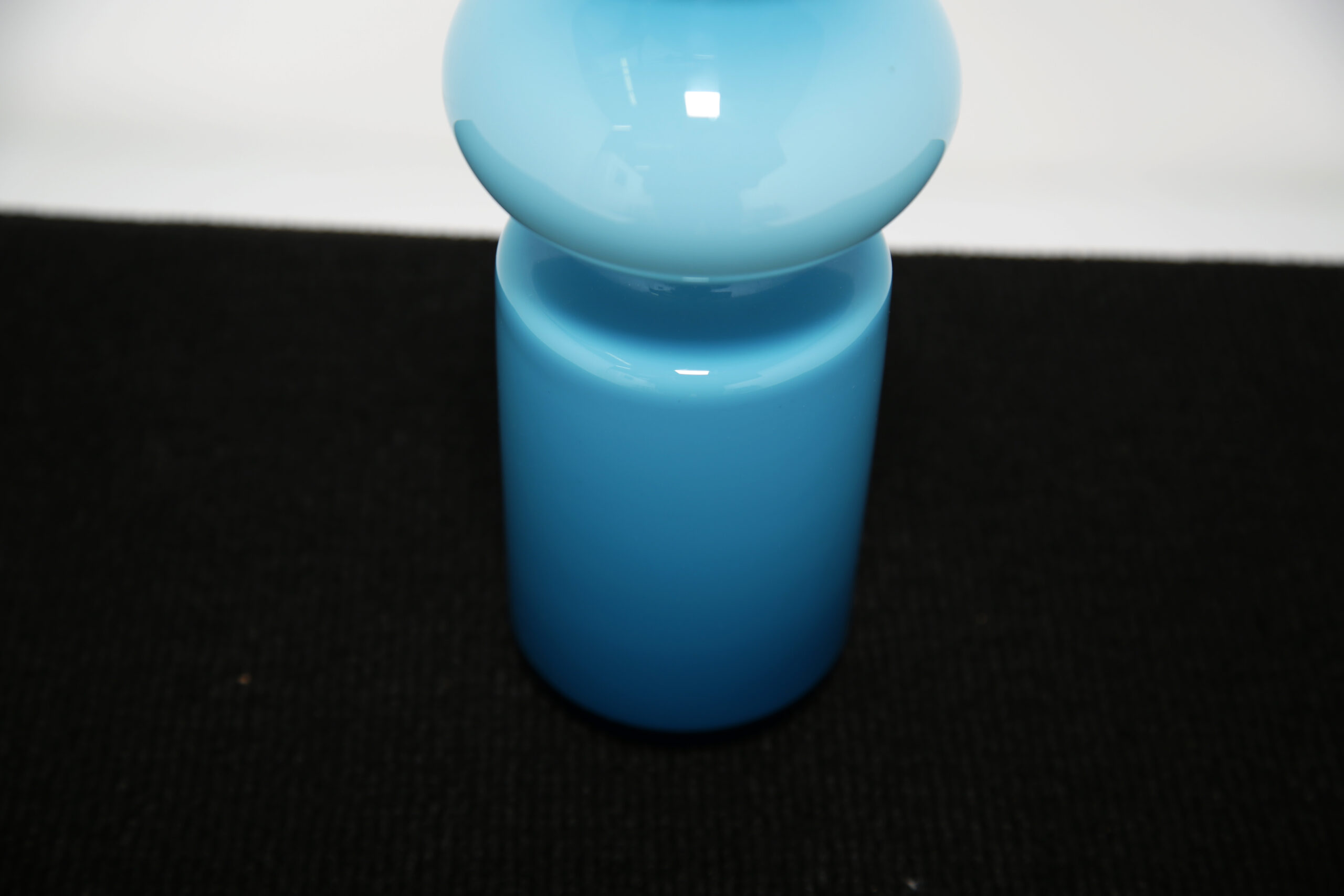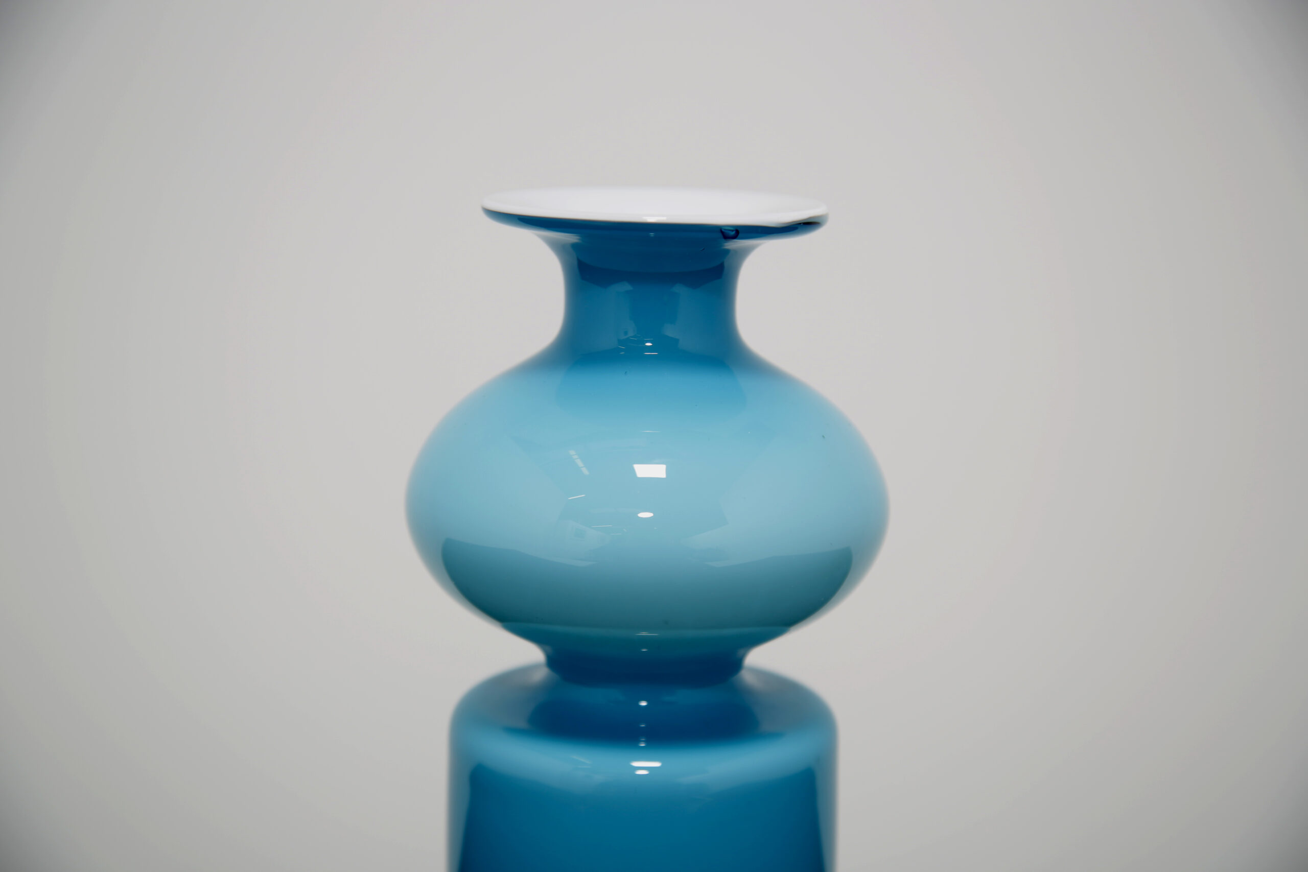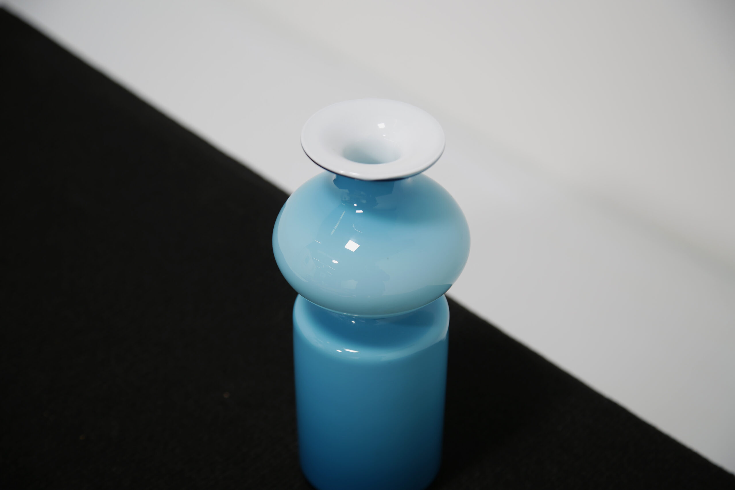 Part of the iconic “Carnaby” series, this vase is admired for its clean lines and captivating use of colour layering. The vivid blue interior softly glows through the opaque white exterior, creating subtle visual drama without compromising the minimal Scandinavian aesthetic. Both elegant and distinctive, it makes a striking standalone centrepiece while remaining versatile within a wider mid-century collection.