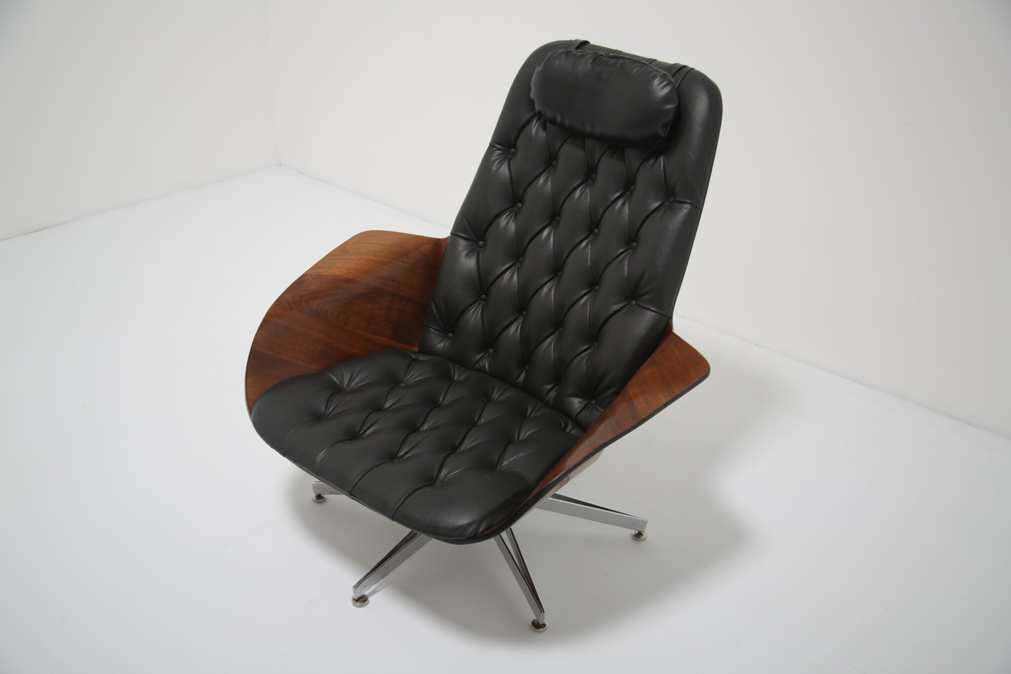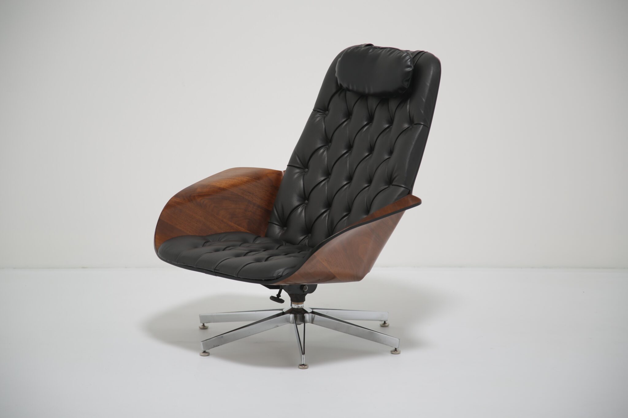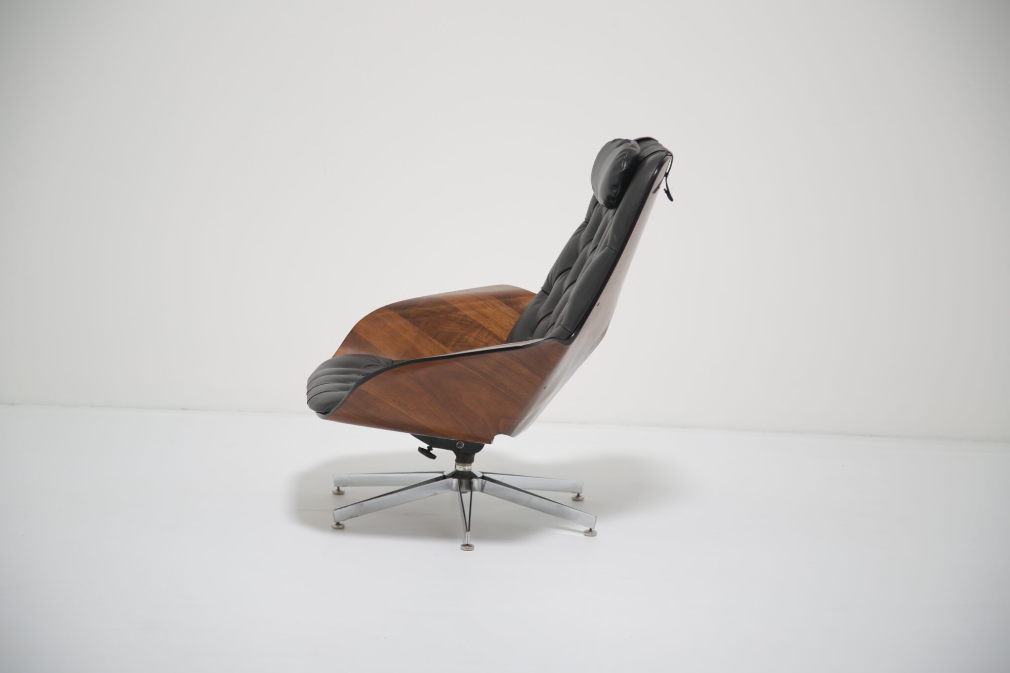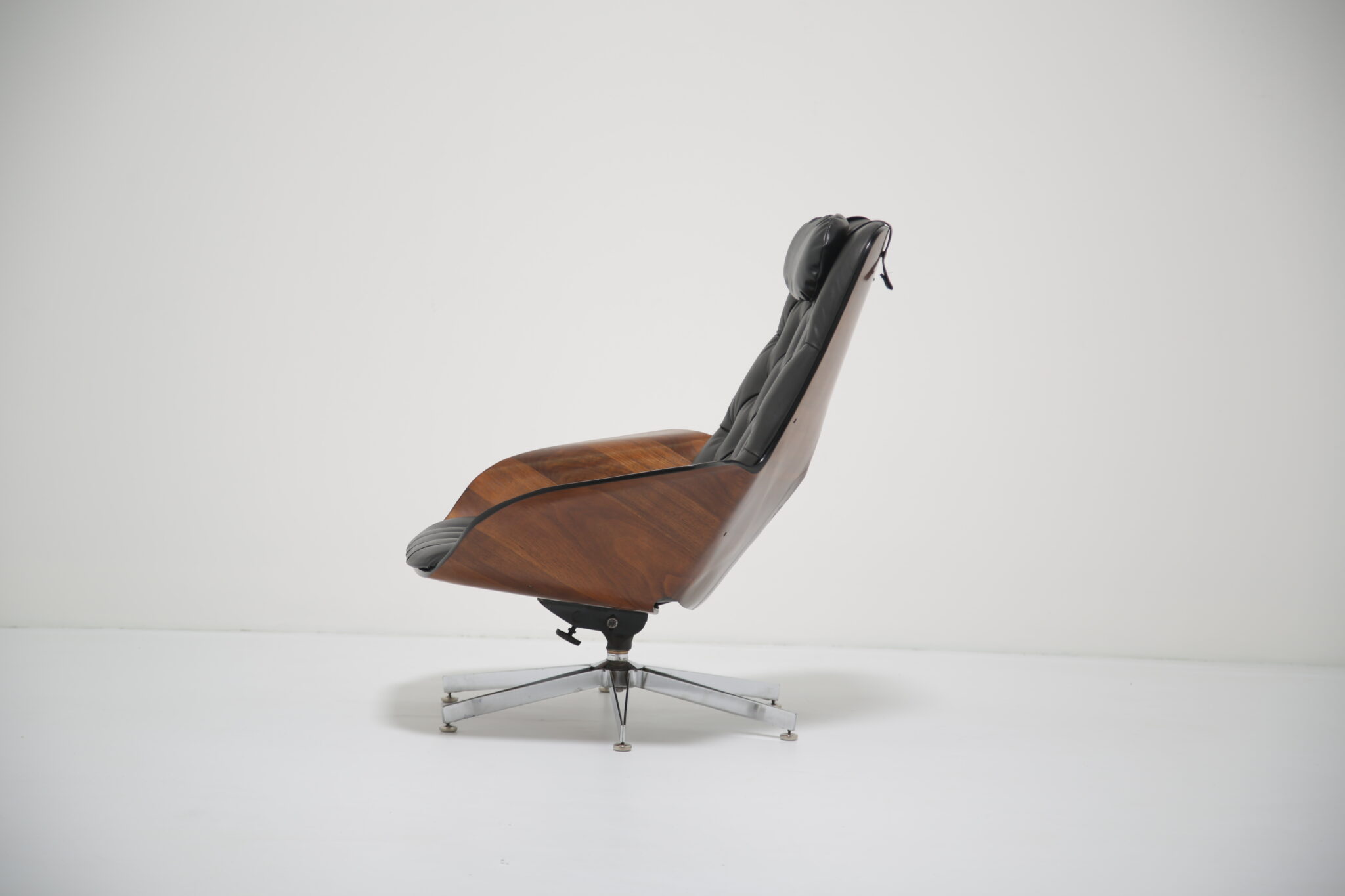 This model is particularly notable for its comfort, featuring both swivel and reclining functions, making it as practical as it is striking. The craftsmanship highlights Plycraft’s reputation for quality and design ingenuity, offering a timeless alternative to the more widely known Eames lounge chair.