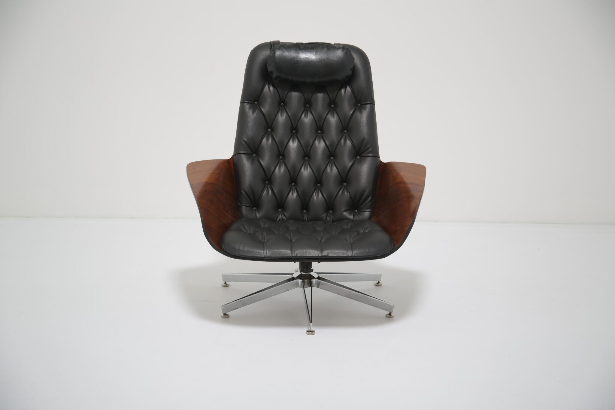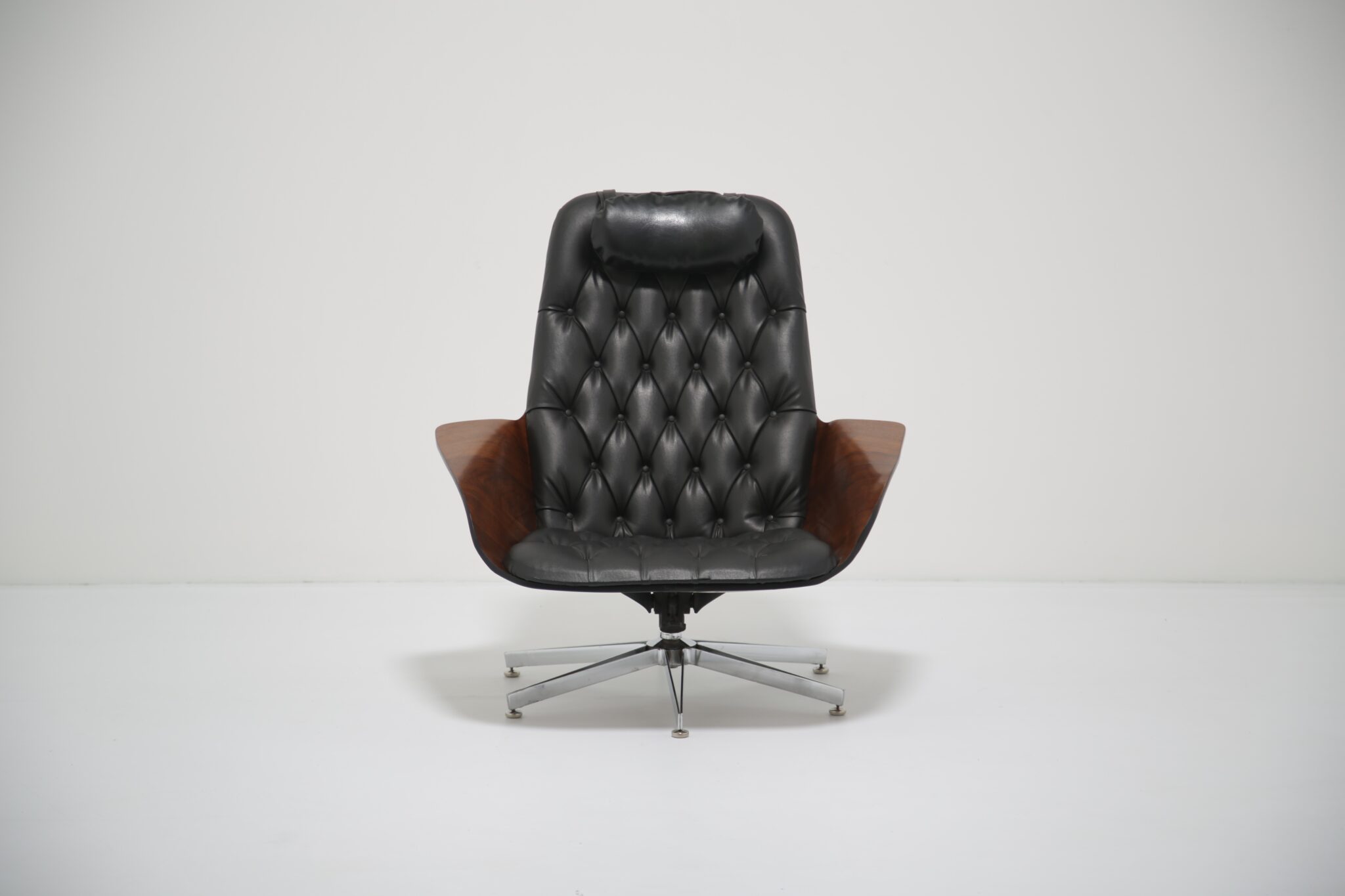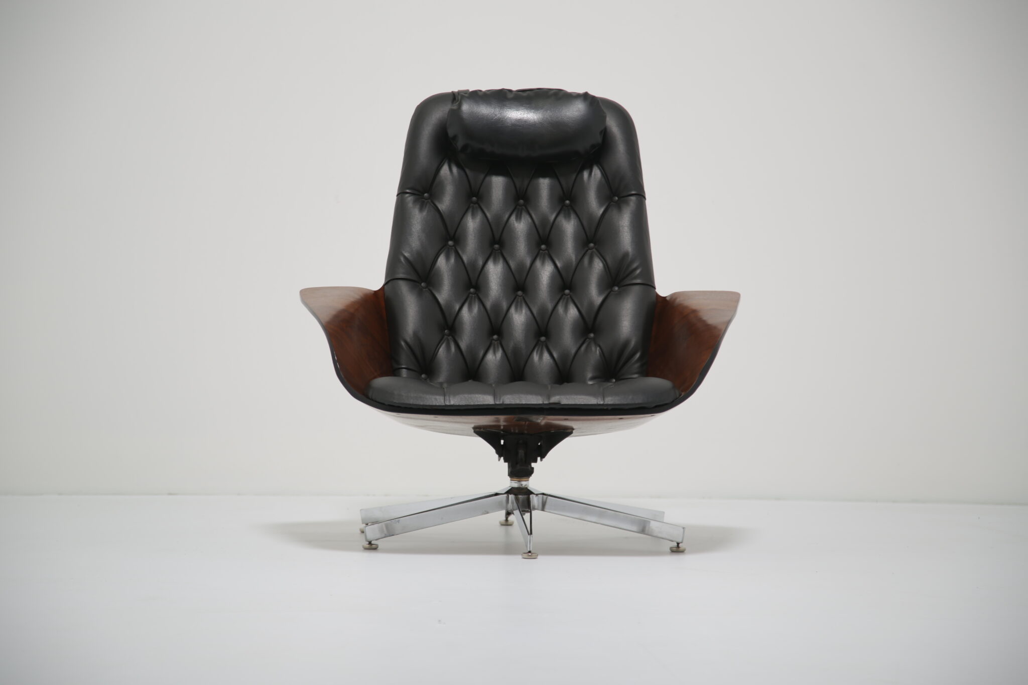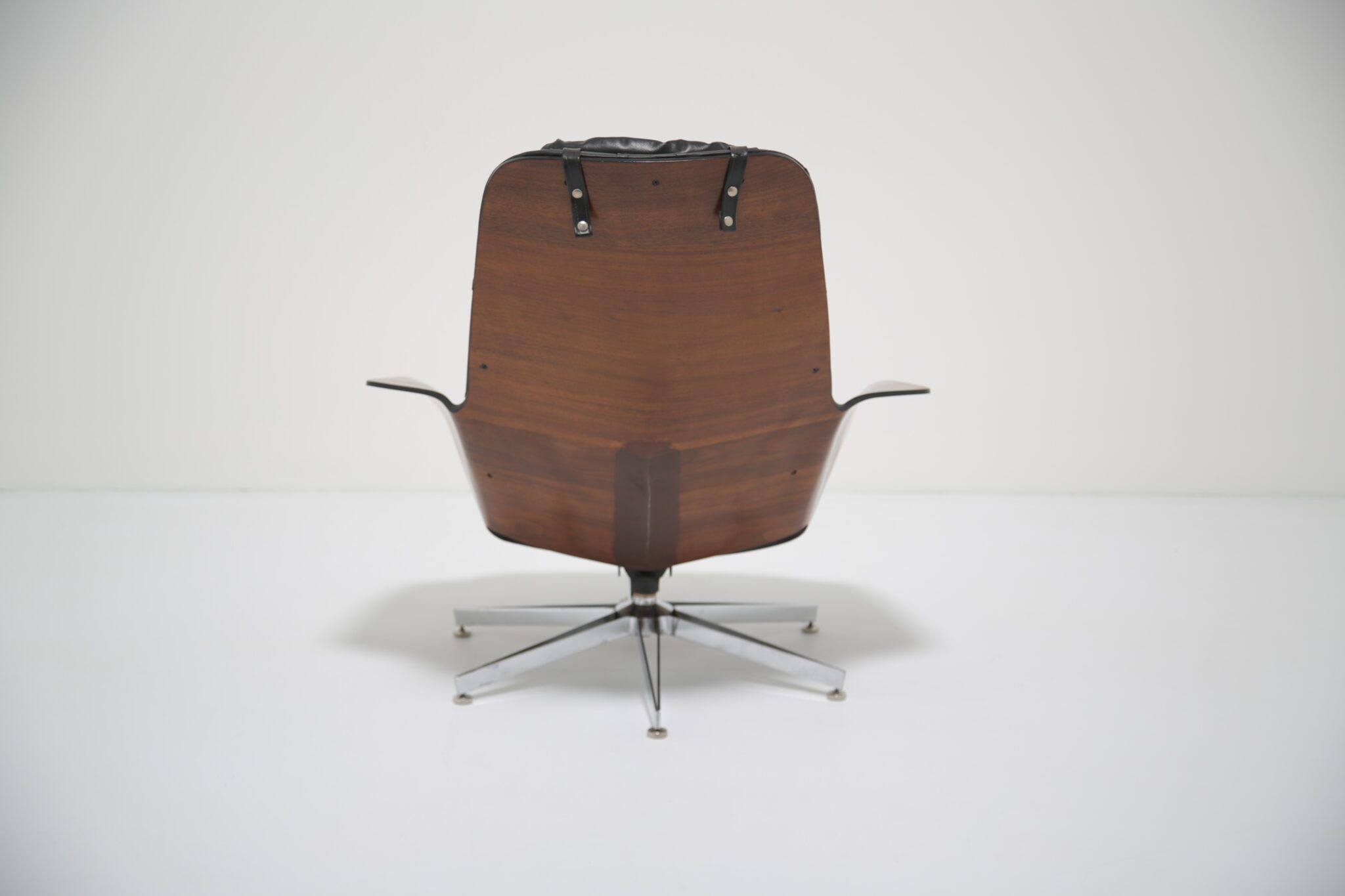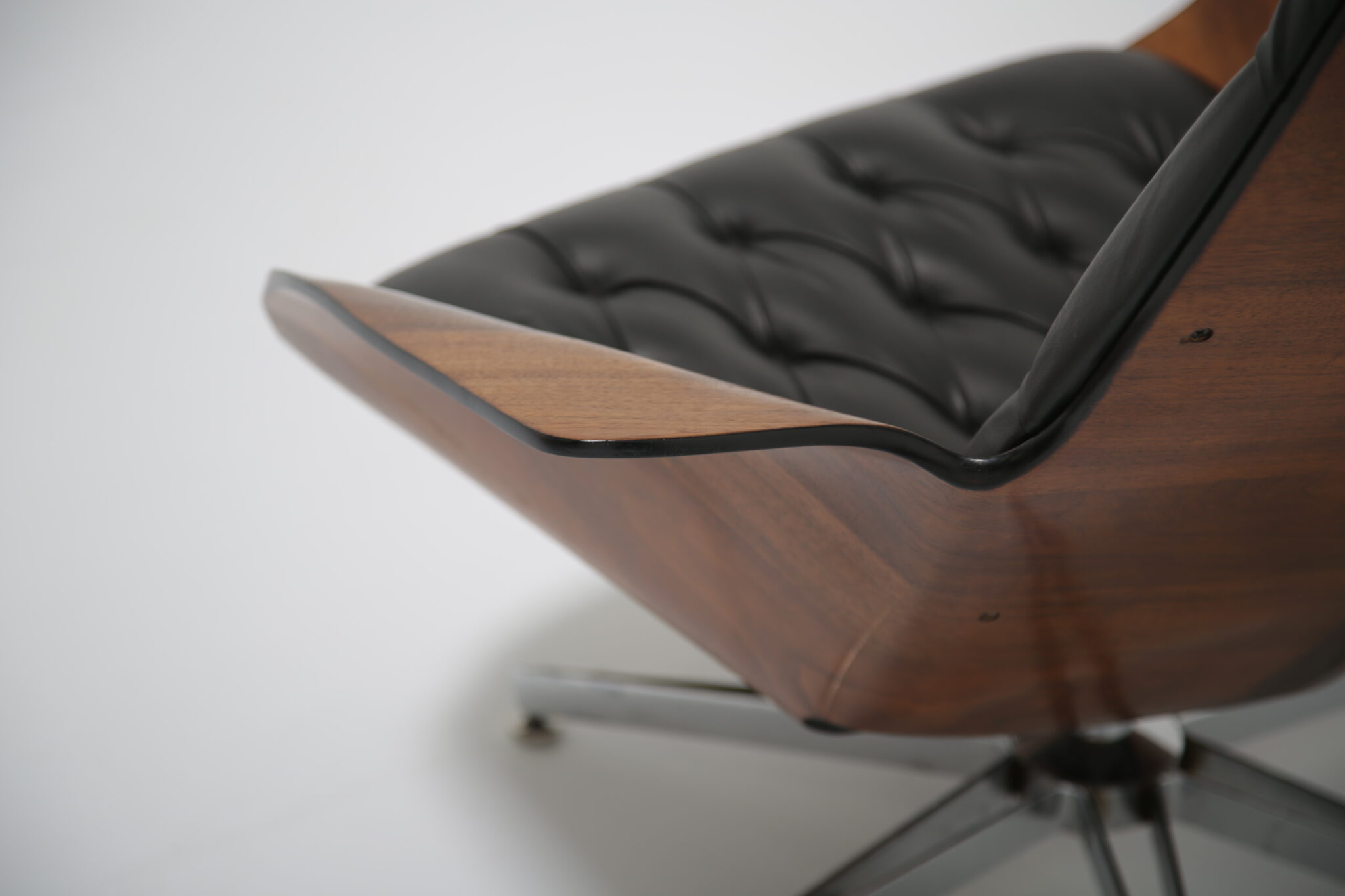 This model is particularly notable for its comfort, featuring both swivel and reclining functions, making it as practical as it is striking. The craftsmanship highlights Plycraft’s reputation for quality and design ingenuity, offering a timeless alternative to the more widely known Eames lounge chair.