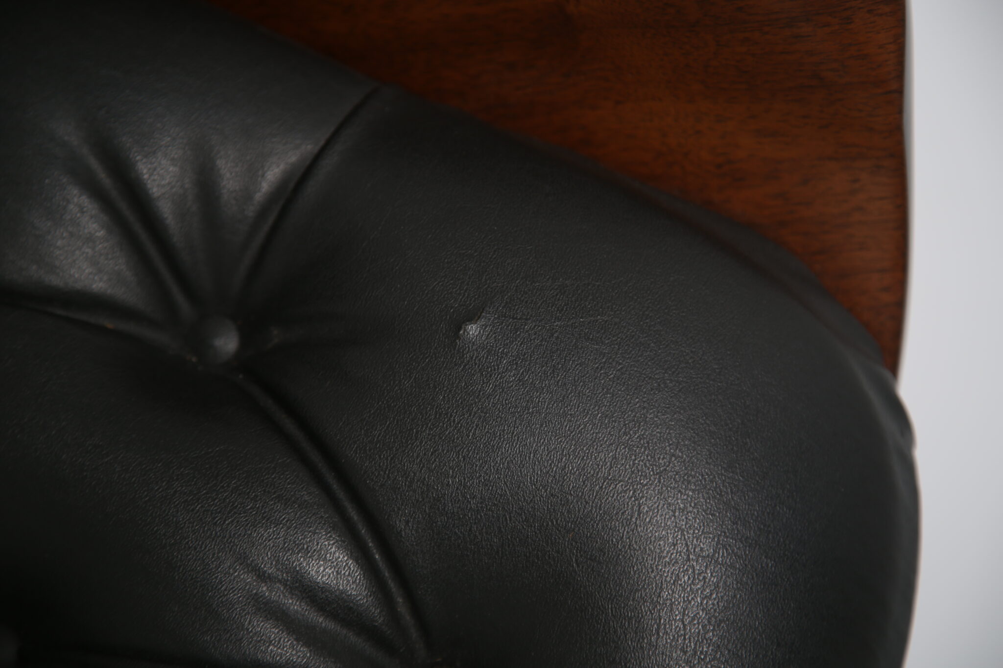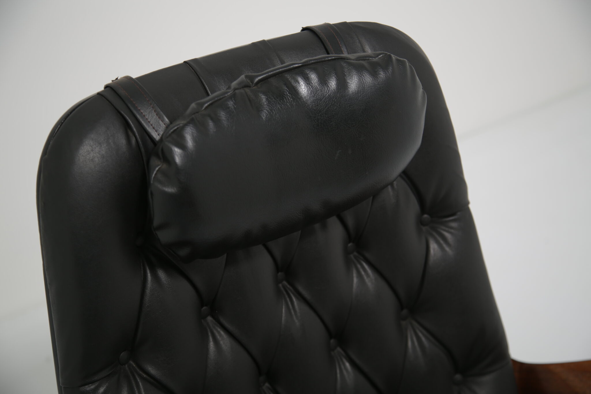 The chair is upholstered in its original black vinyl, which remains in good vintage condition with light signs of age. There are a few minor rips in the vinyl. The wood has a warm, even finish, and the overall structure is solid and stable.