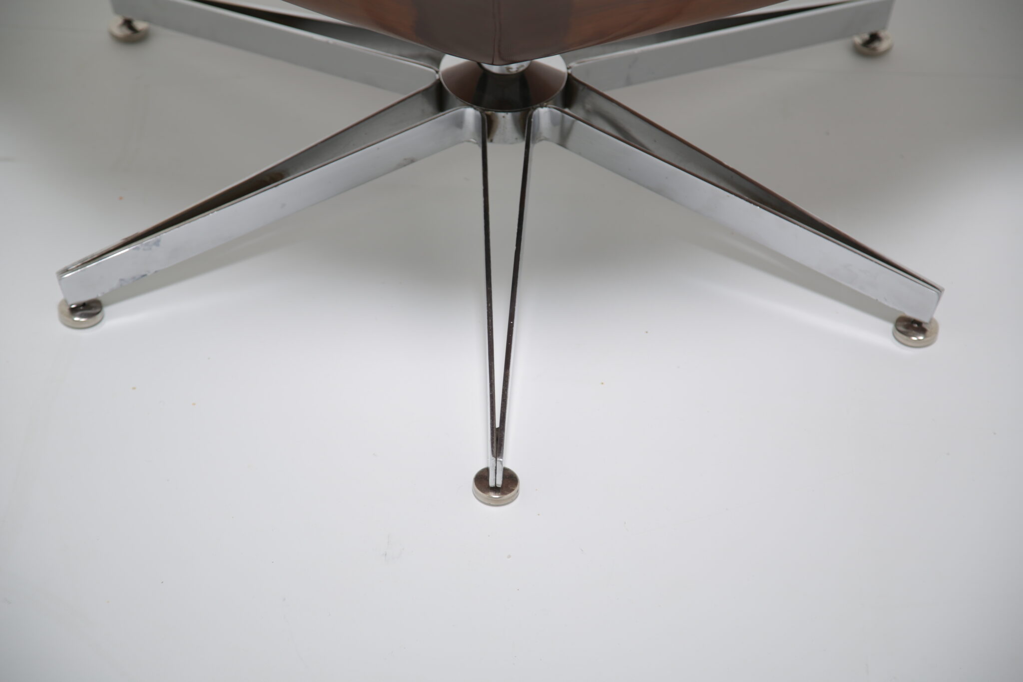 This stunning 1960s “Mr. Chair” by George Mulhauser for Plycraft has been carefully checked and serviced by our team. The sculpted bent plywood shell has been cleaned and polished, preserving its rich walnut tone. The chair retains its original swiveling and reclining function, ensuring both comfort and usability.