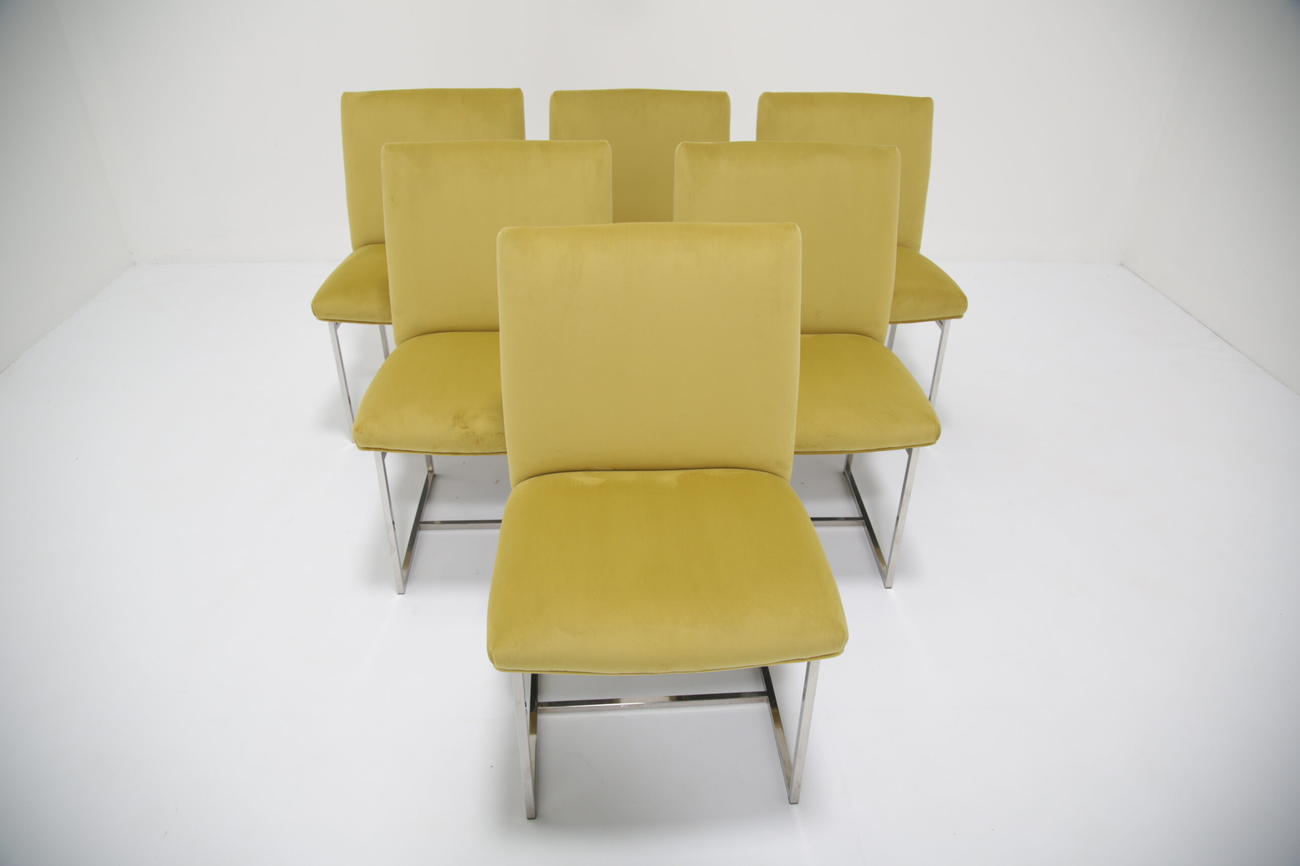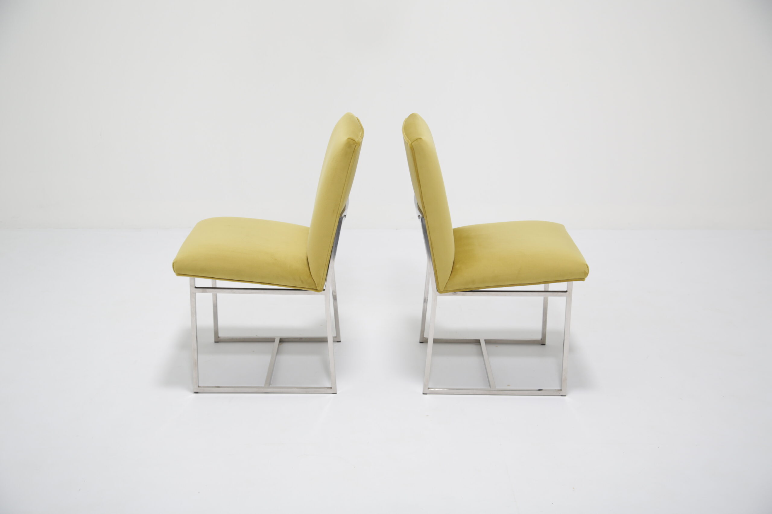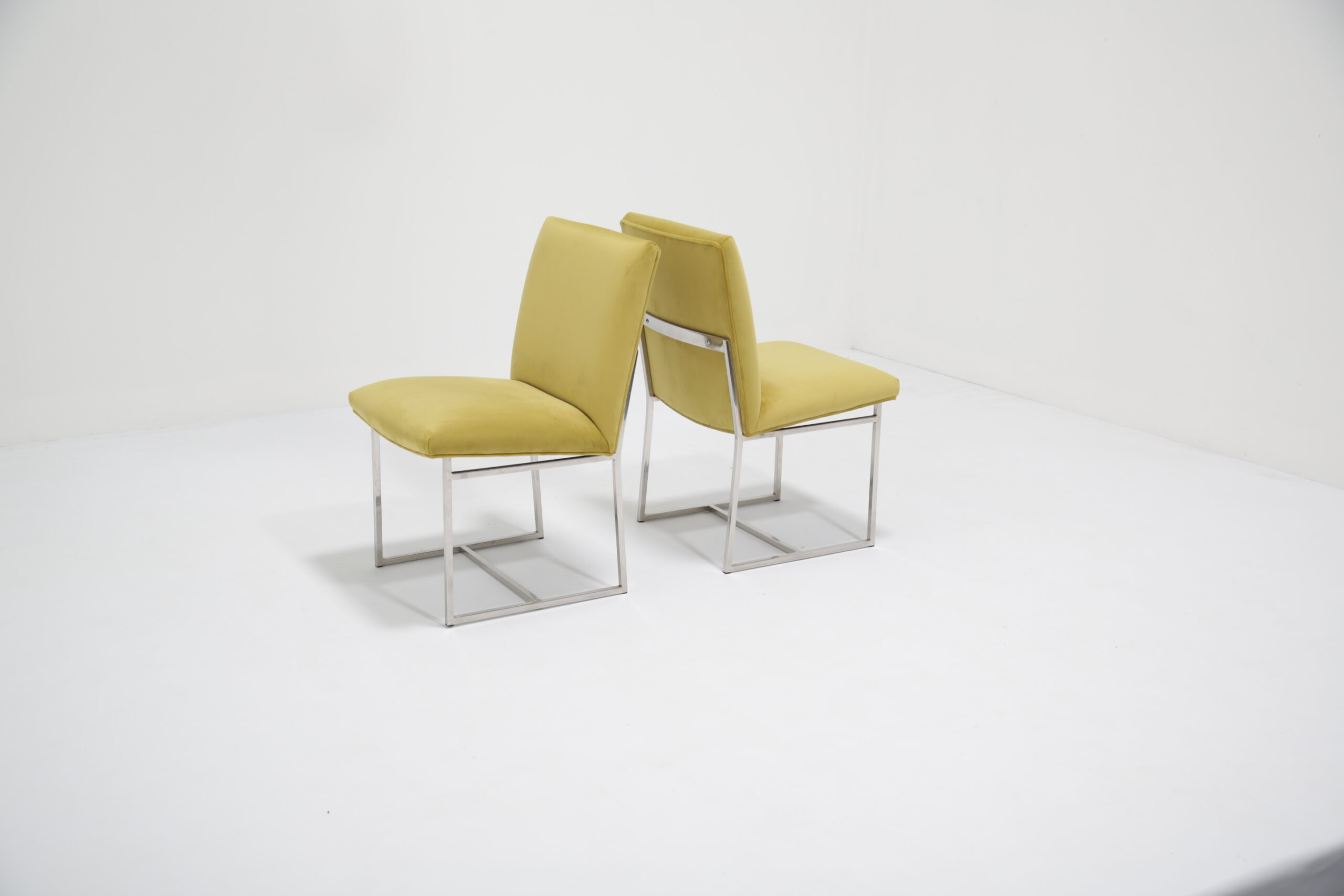 Just added to our collection are these exclusive dining chairs upholstered in a ginger lime green velvet on sturdy chrome frames. These chairs are incredible comfortable and provides good support for the back. The chrome frames are study and provides reflection in a room that may need it as natural as well as artificial light. The color choice of the upholstery adds a splash of brightness to a dining room that may need it. These chairs were imported from the States.
