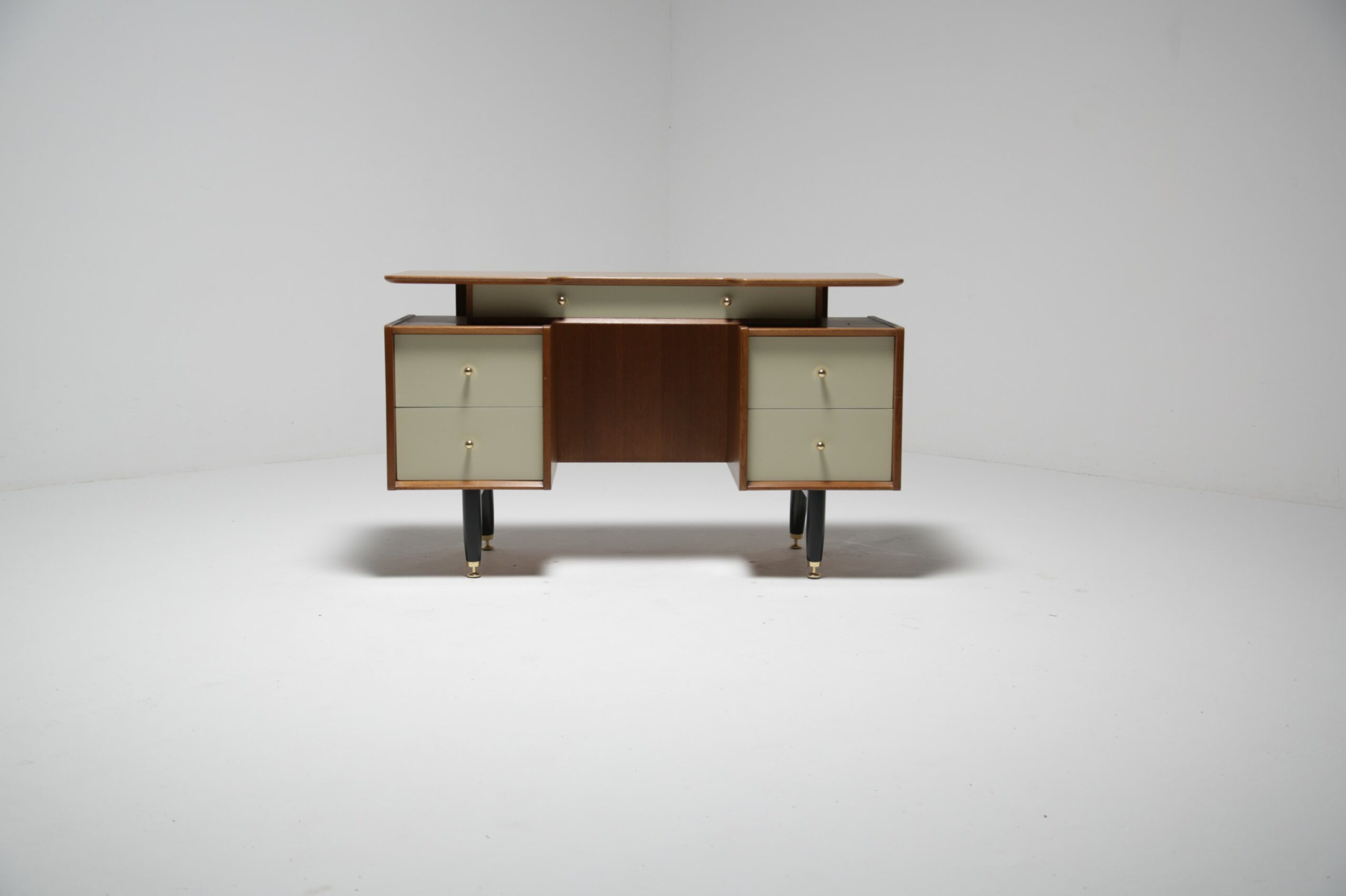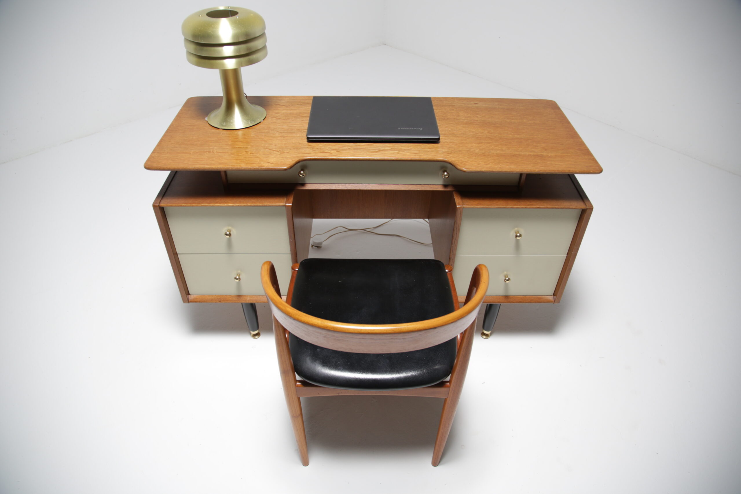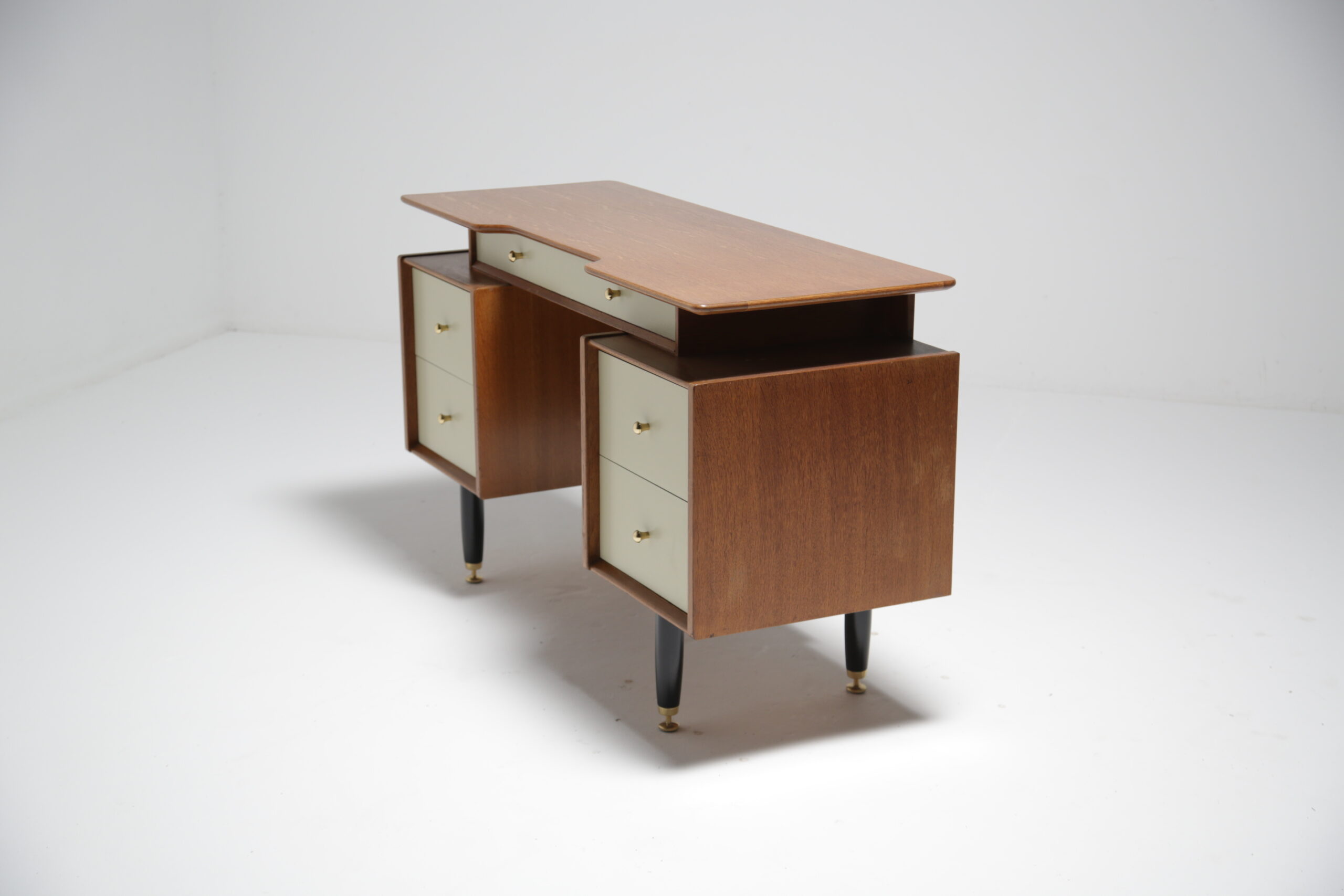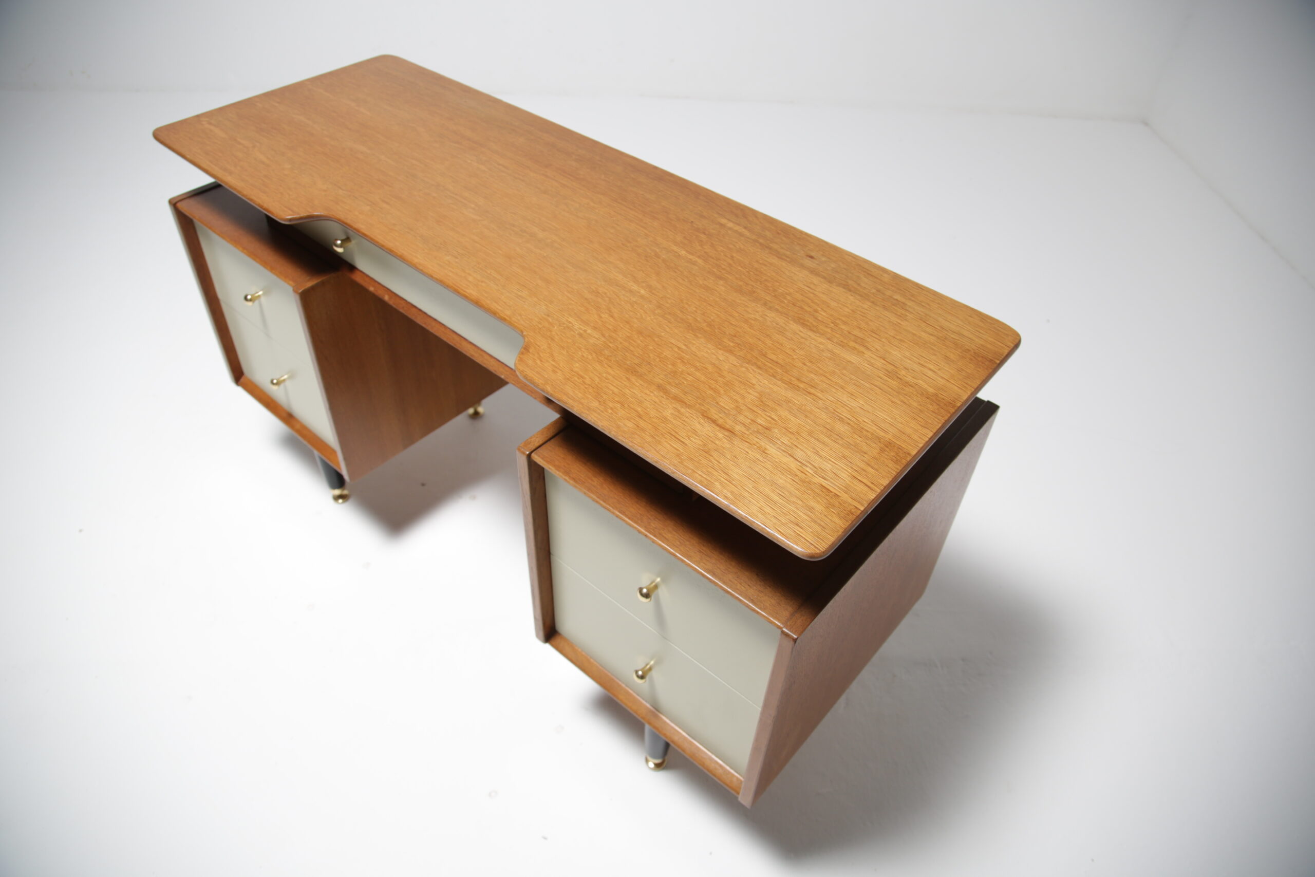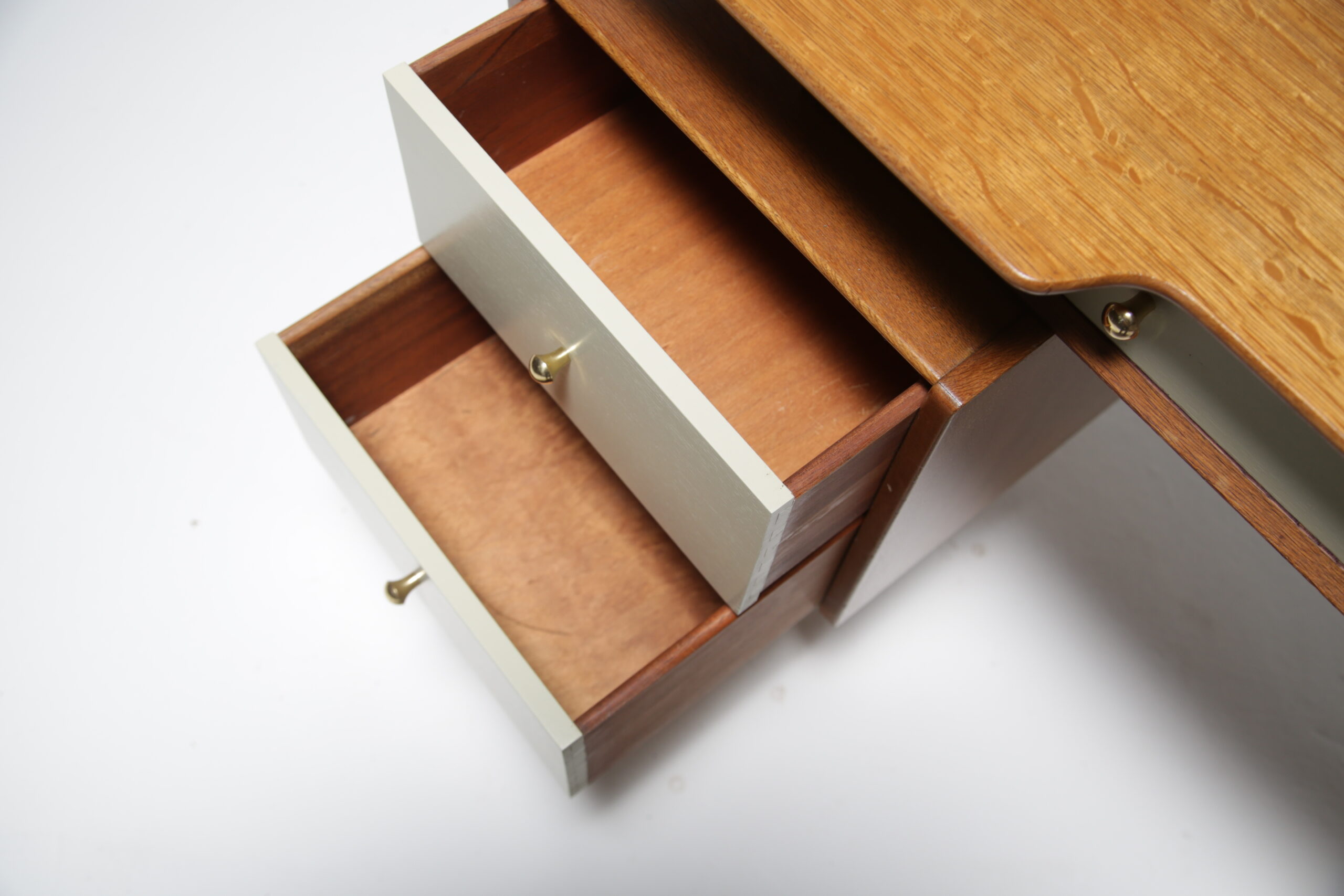 Presented here is a beautiful vanity table designed by the British furniture pioneer Ebenezer Gomme or E. Gomme as he is mostly titled as in the 1950s. The desk, which is manufactured in oak and China white painted drawers with brass pull knobs and black lacquered legs is a unique blend that works very well together. There are four spacious pull out drawers, two on either side for storage and a larger central drawer with organizer for your items.