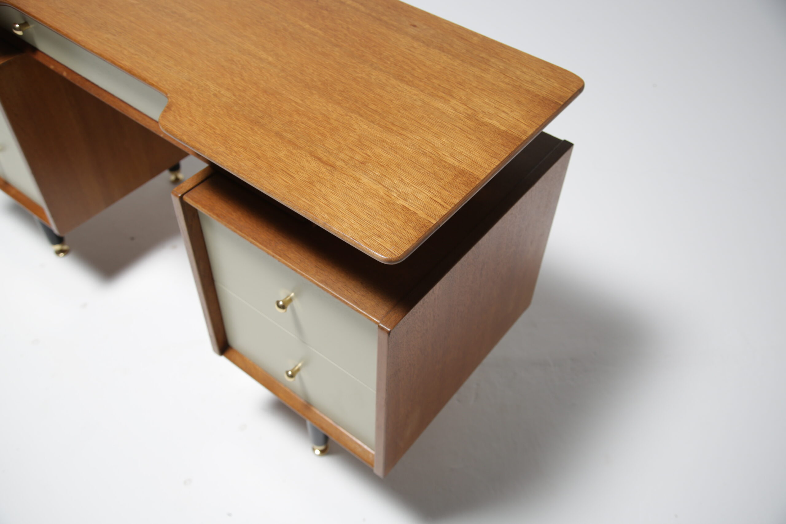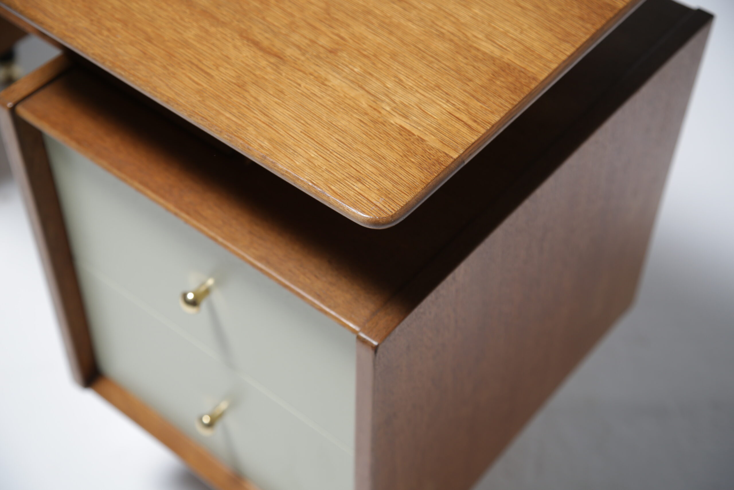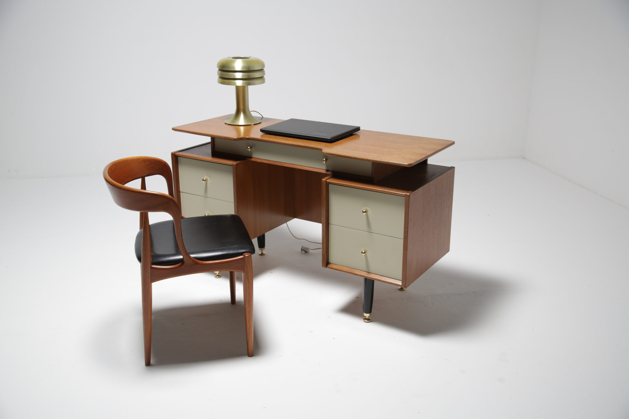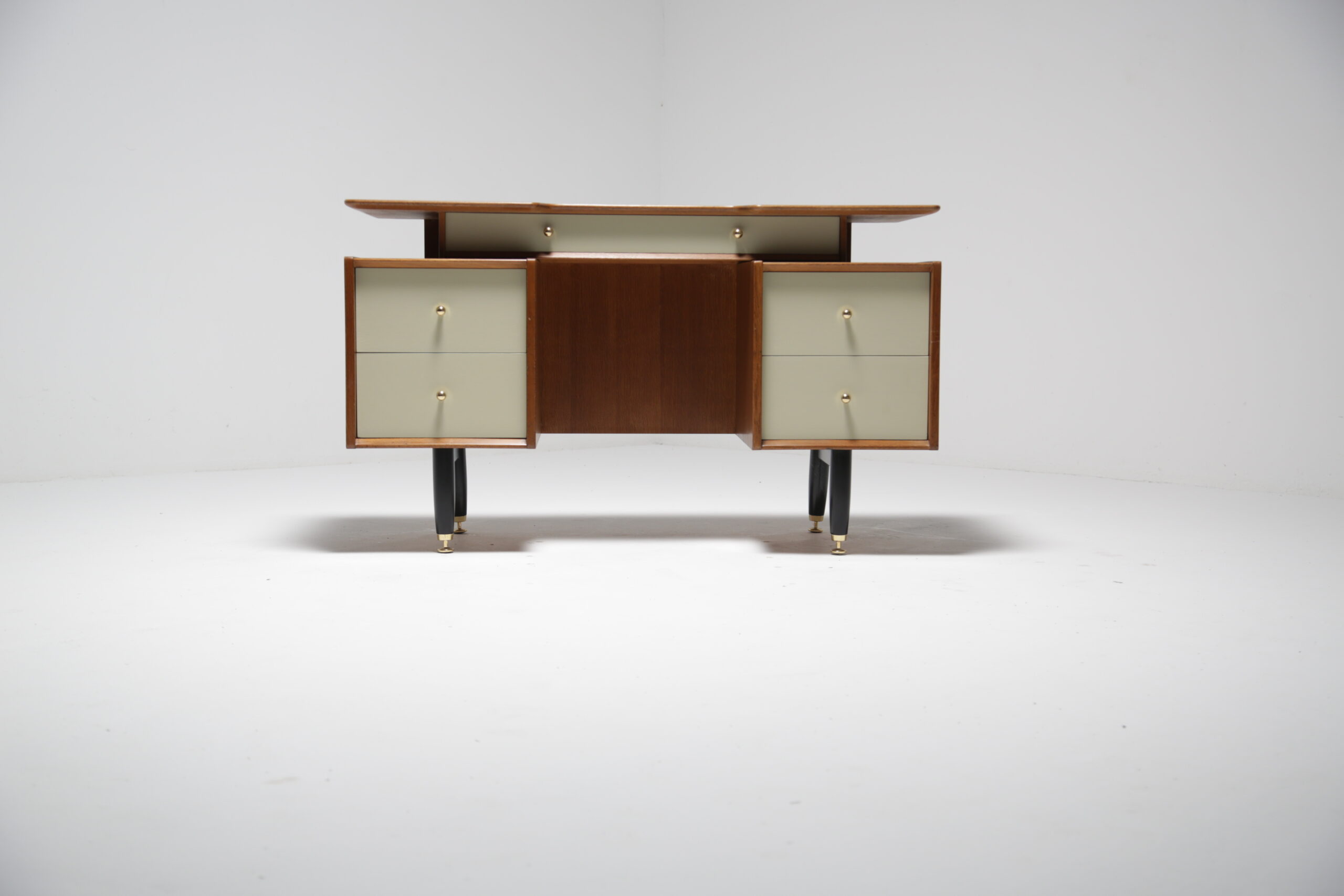 Presented here is a beautiful vanity table designed by the British furniture pioneer Ebenezer Gomme or E. Gomme as he is mostly titled as in the 1950s. The desk, which is manufactured in oak and China white painted drawers with brass pull knobs and black lacquered legs is a unique blend that works very well together. There are four spacious pull out drawers, two on either side for storage and a larger central drawer with organizer for your items.