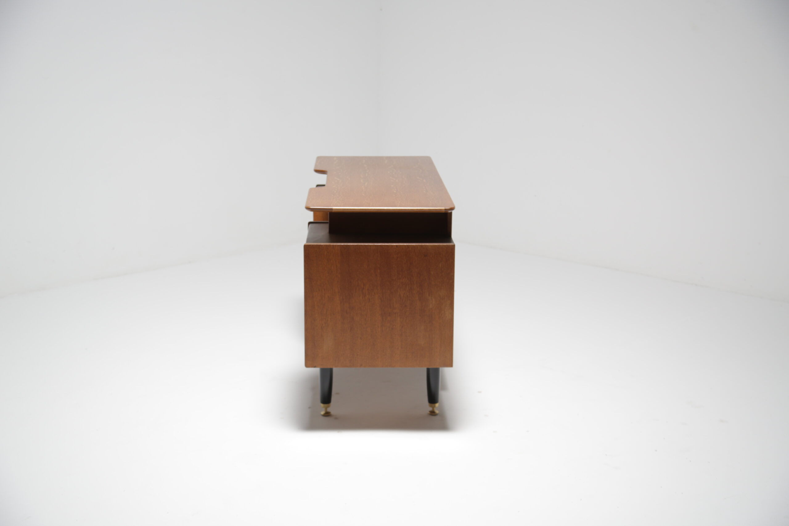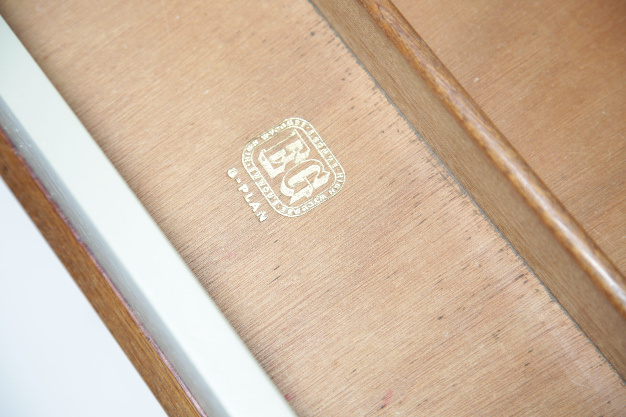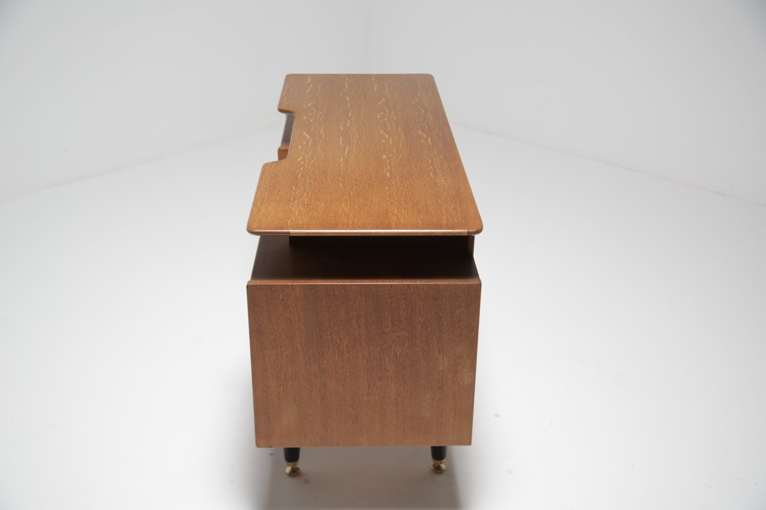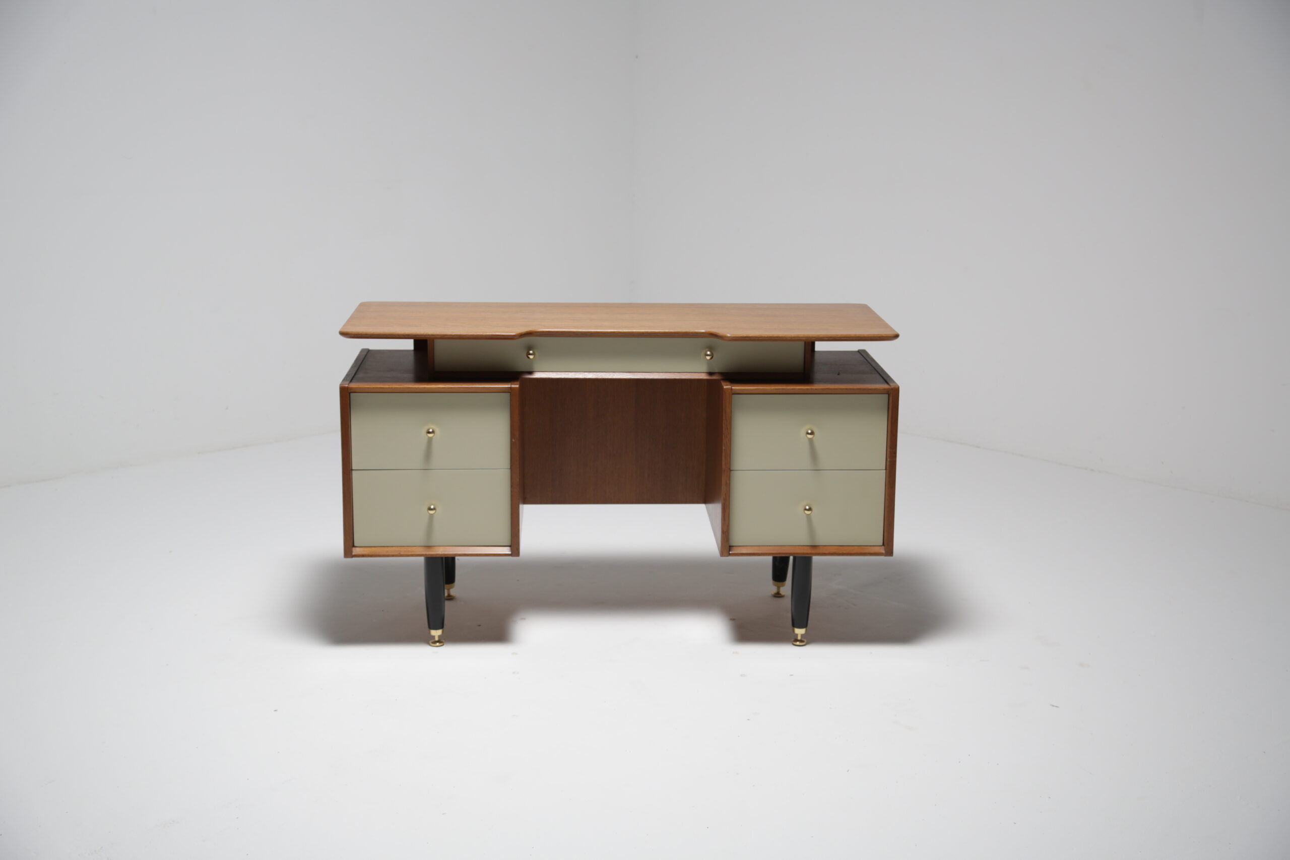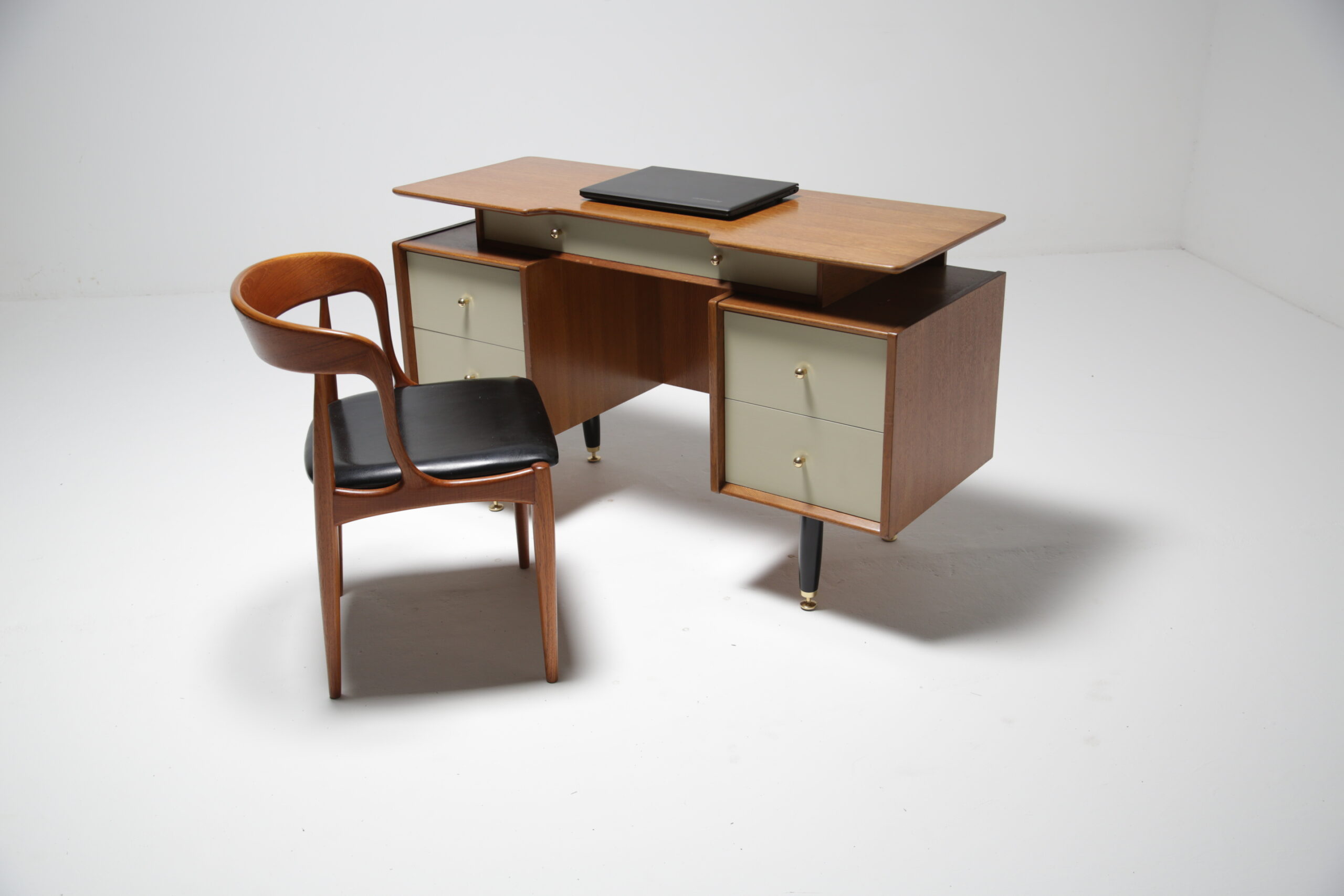 Presented here is a beautiful vanity table designed by the British furniture pioneer Ebenezer Gomme or E. Gomme as he is mostly titled as in the 1950s. The desk, which is manufactured in oak and China white painted drawers with brass pull knobs and black lacquered legs is a unique blend that works very well together. There are four spacious pull out drawers, two on either side for storage and a larger central drawer with organizer for your items.