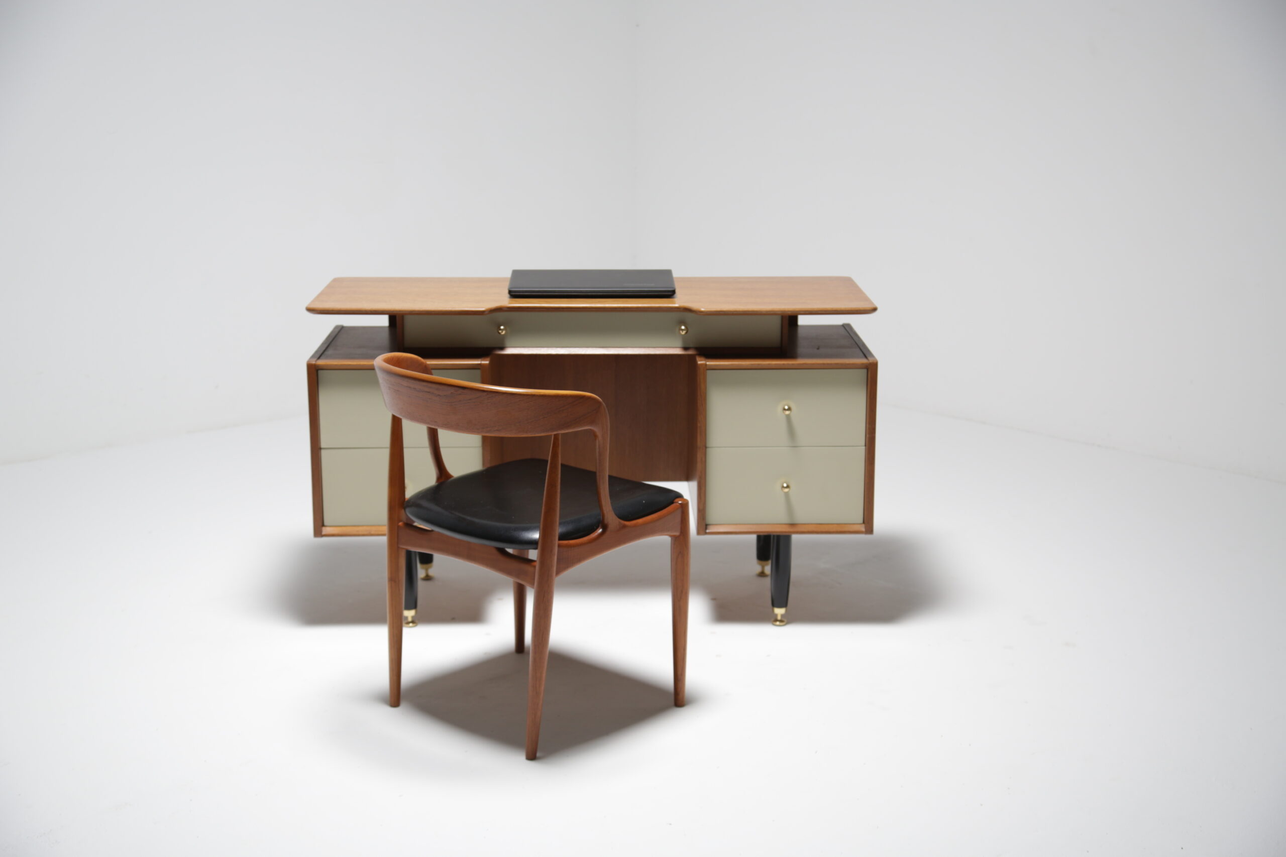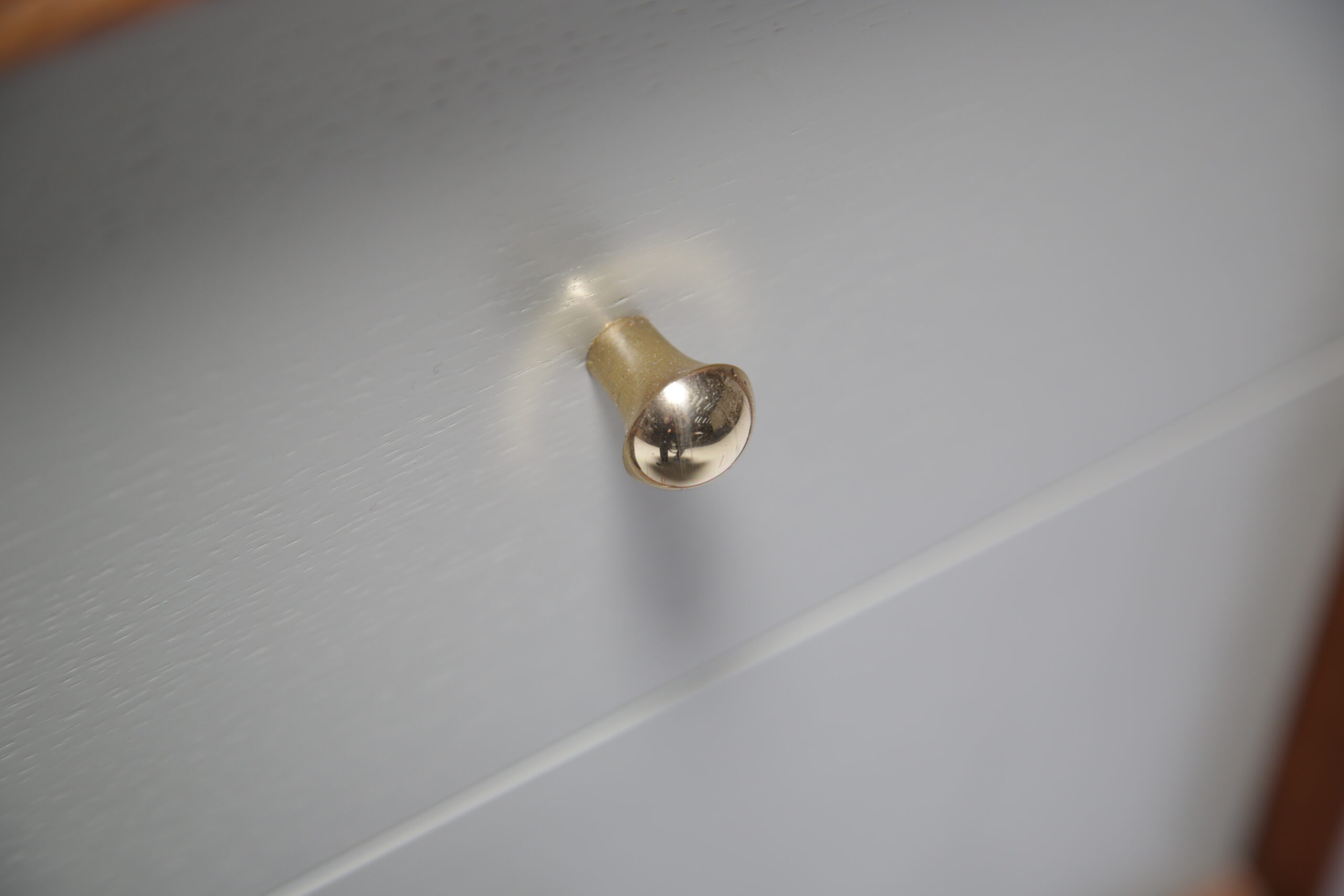 This unit has been fully restored. The unit is missing its original mirror and is sold as a desk. There are a few minor marks on the off white painted drawers but it is not something that affects the quality of value of this piece. Each drawer is easy to pull out and is functional. Each leg has been checked to ensure stability and durability.