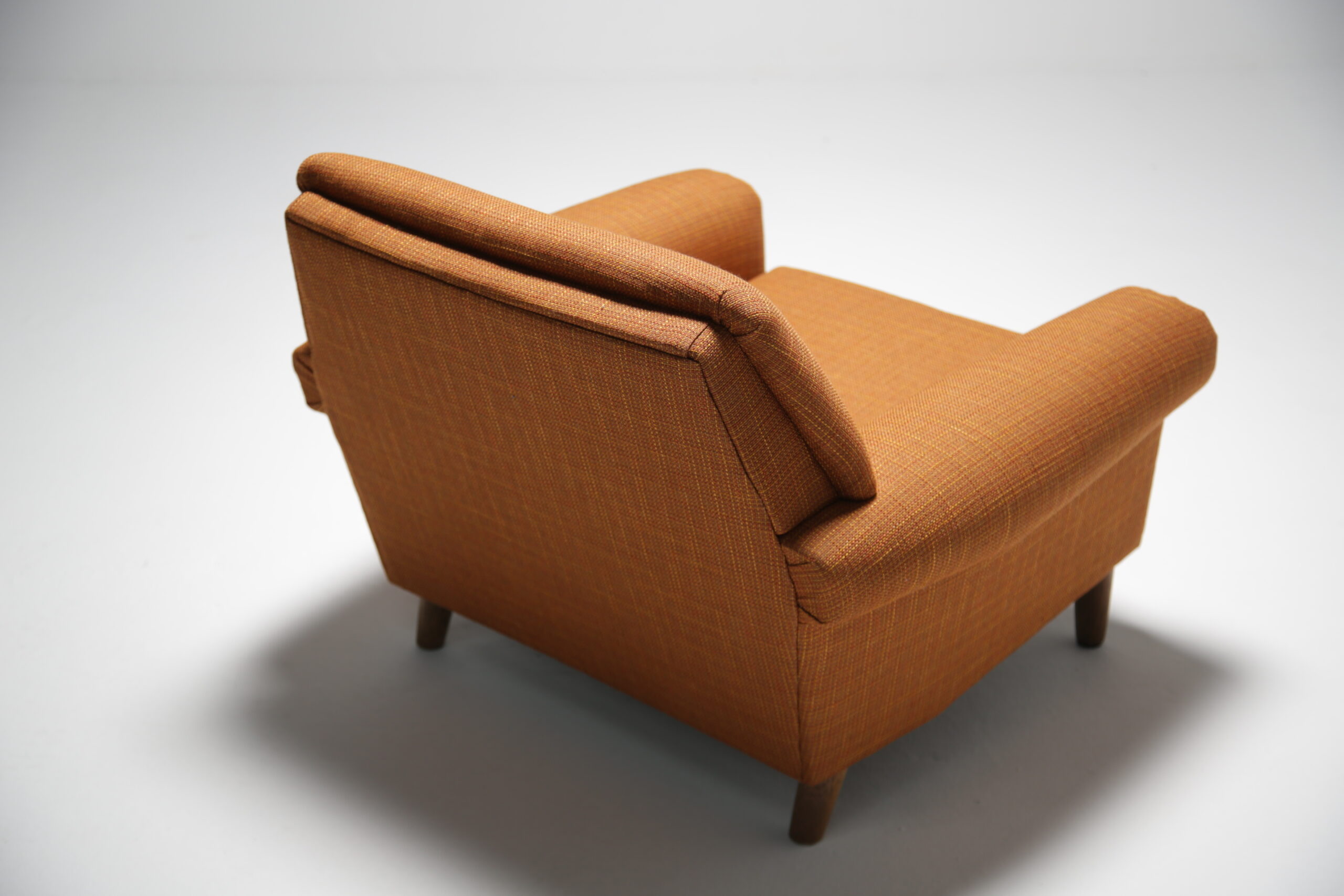 Introducing our luxurious and elegantly crafted vintage Scandinavian lounge chair. Expertly restored by our team of master craftsmen, this chair exudes the highest level of quality and craftsmanship. The chair features a stunning period style orange tweed fabric that is both comfortable and stylish. The chair has been fitted with all new foams and fabric, and the legs have been expertly refurbished, ensuring that this piece is in top-notch condition. The chair’s vintage vibe adds a touch of nostalgia and character to any room. Don’t miss out on this beautiful and unique piece of furniture. Order now and elevate your home’s style and comfort to the next level.