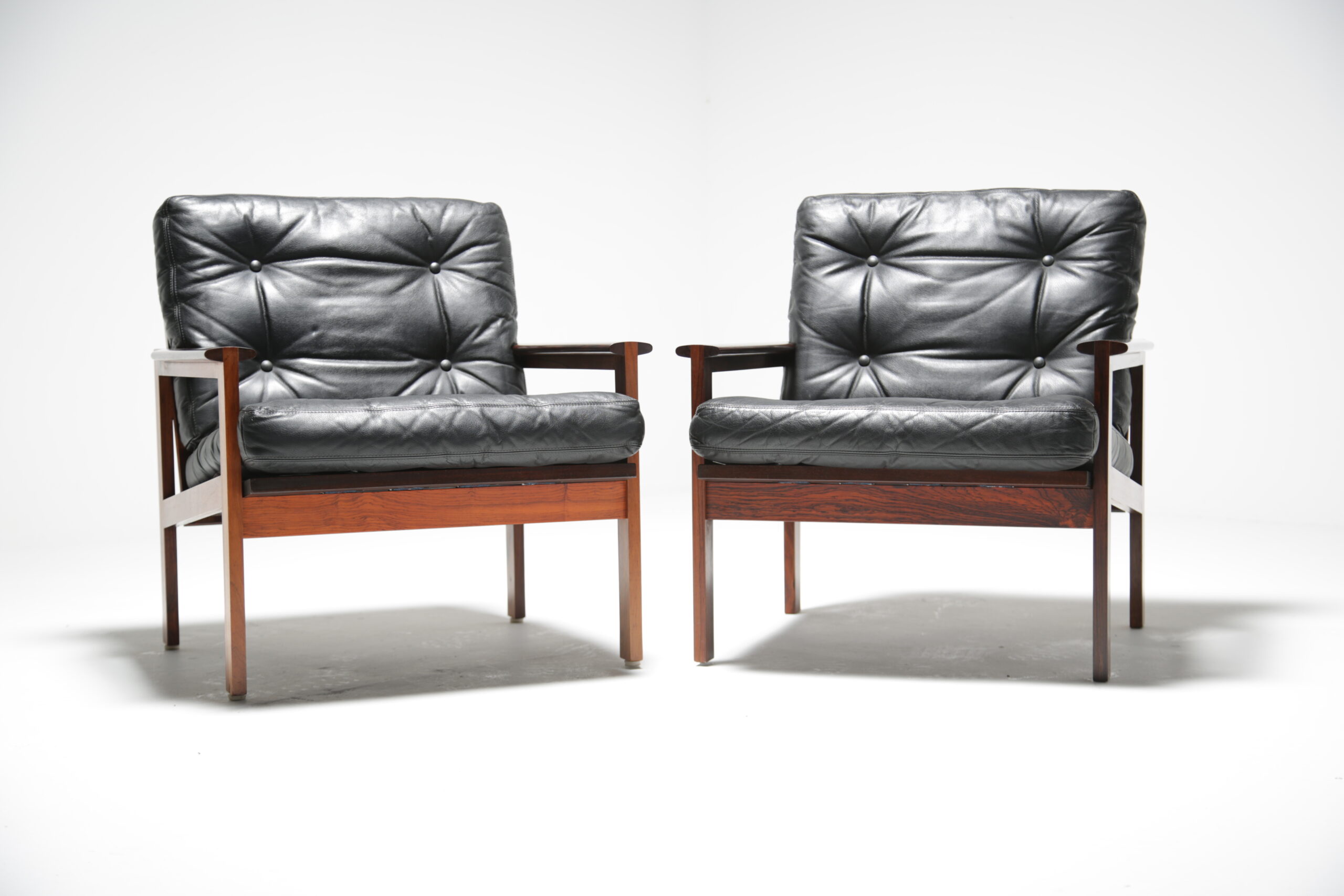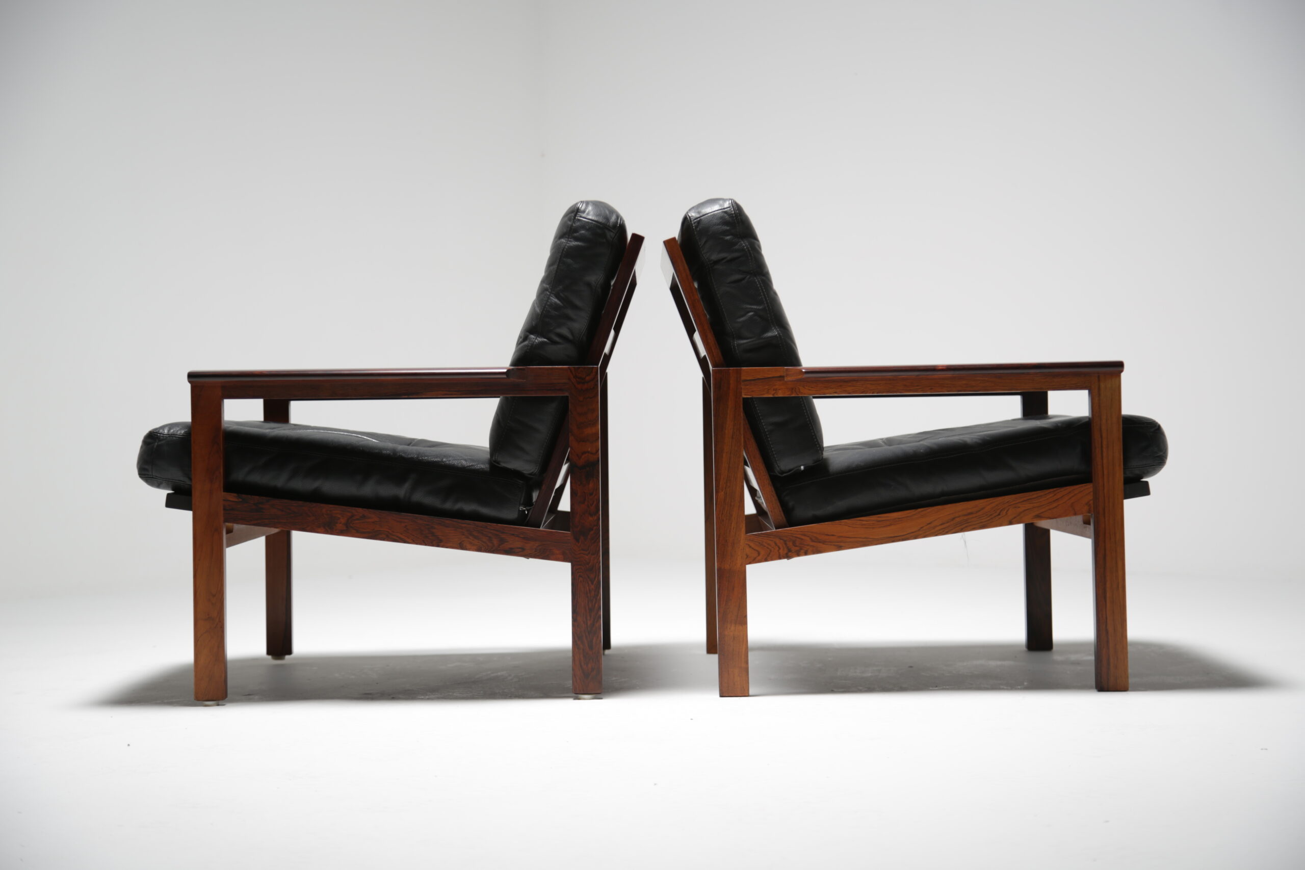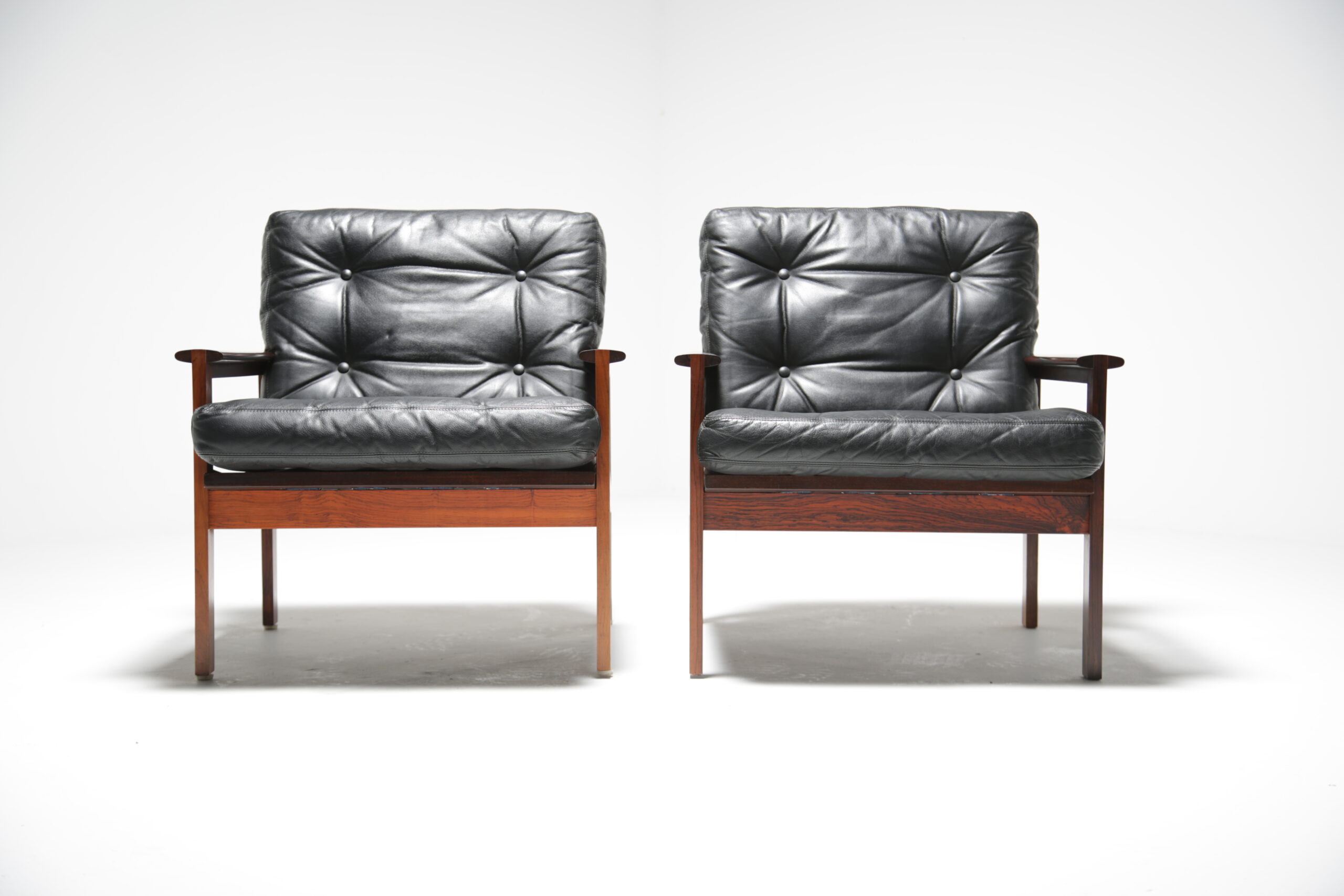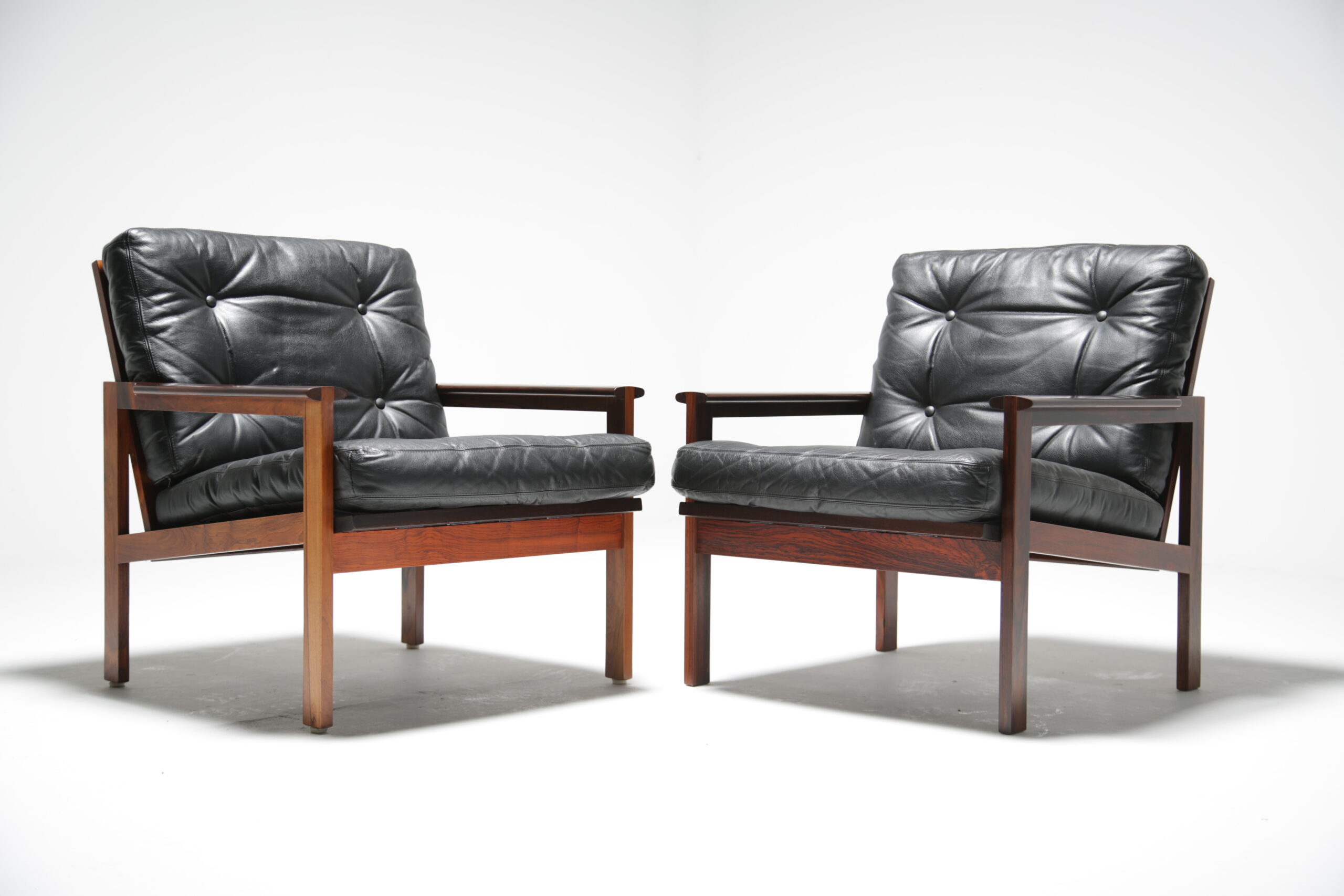 A pair of 1960s Lounge chairs designed by Illum Wikkelso for Niels Eilersen, part of the Capella range that includes sofas, side tables, high back chairs etc etc. The great feature from this set is the arms. They are slightly rounded on the top and oval shaped when looked at front on. Its a very pleasing design to the eye and also and very tactile to the sitter. The chairs are both rosewood and came together to us as an original pair however one is quite a bit darker than the other even though both were restored at the same time by the same person. The leather is original and we have made it more supple with leather food. The webbing was replaced as the original webbing was dry and brittle. Everything that needs to be done has been done. This is a great set of original chairs in wonderful condition. They cannot be bought new so only vintage versions in rosewood exist. Available now. Worldwide shipping available.