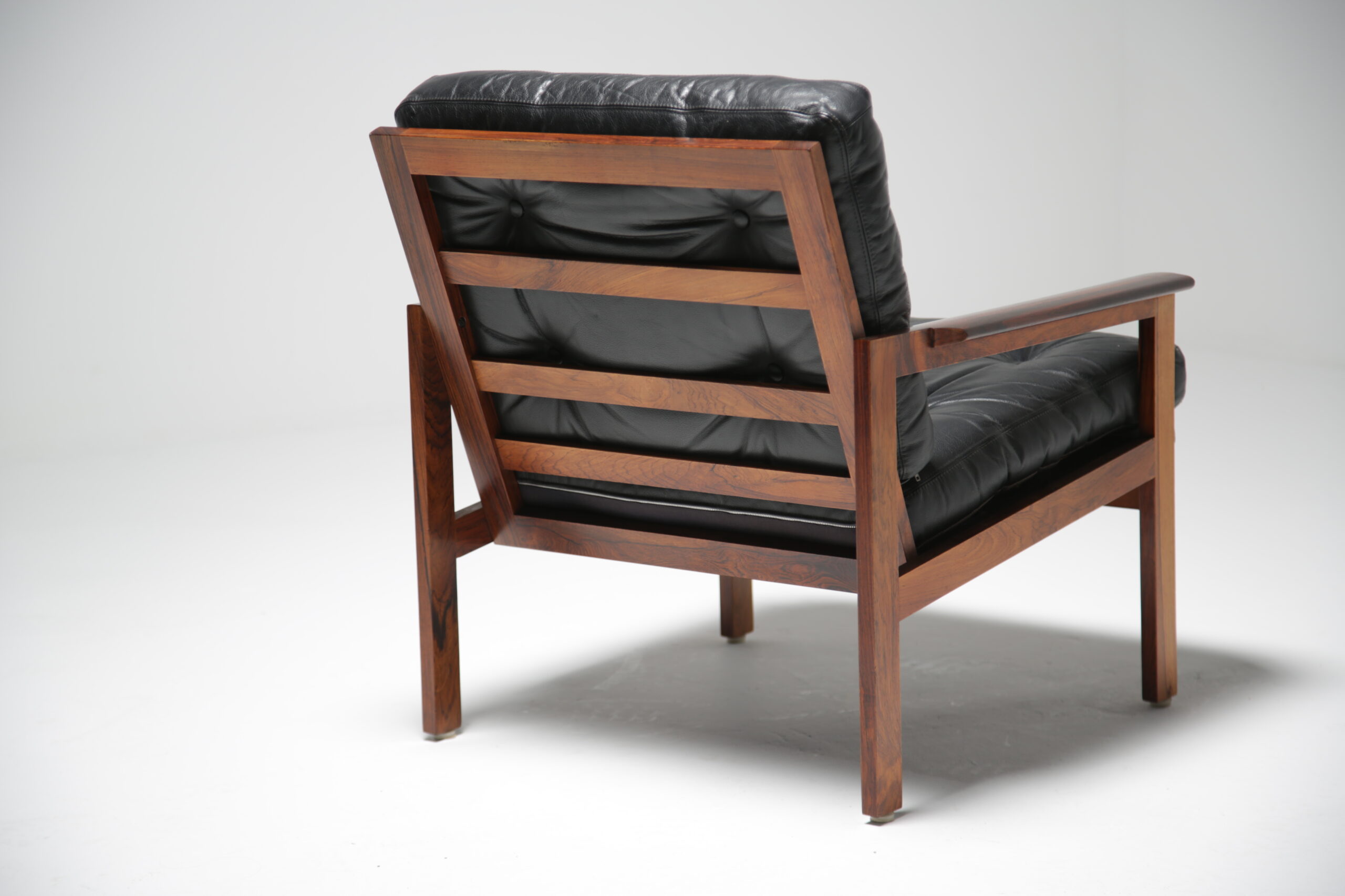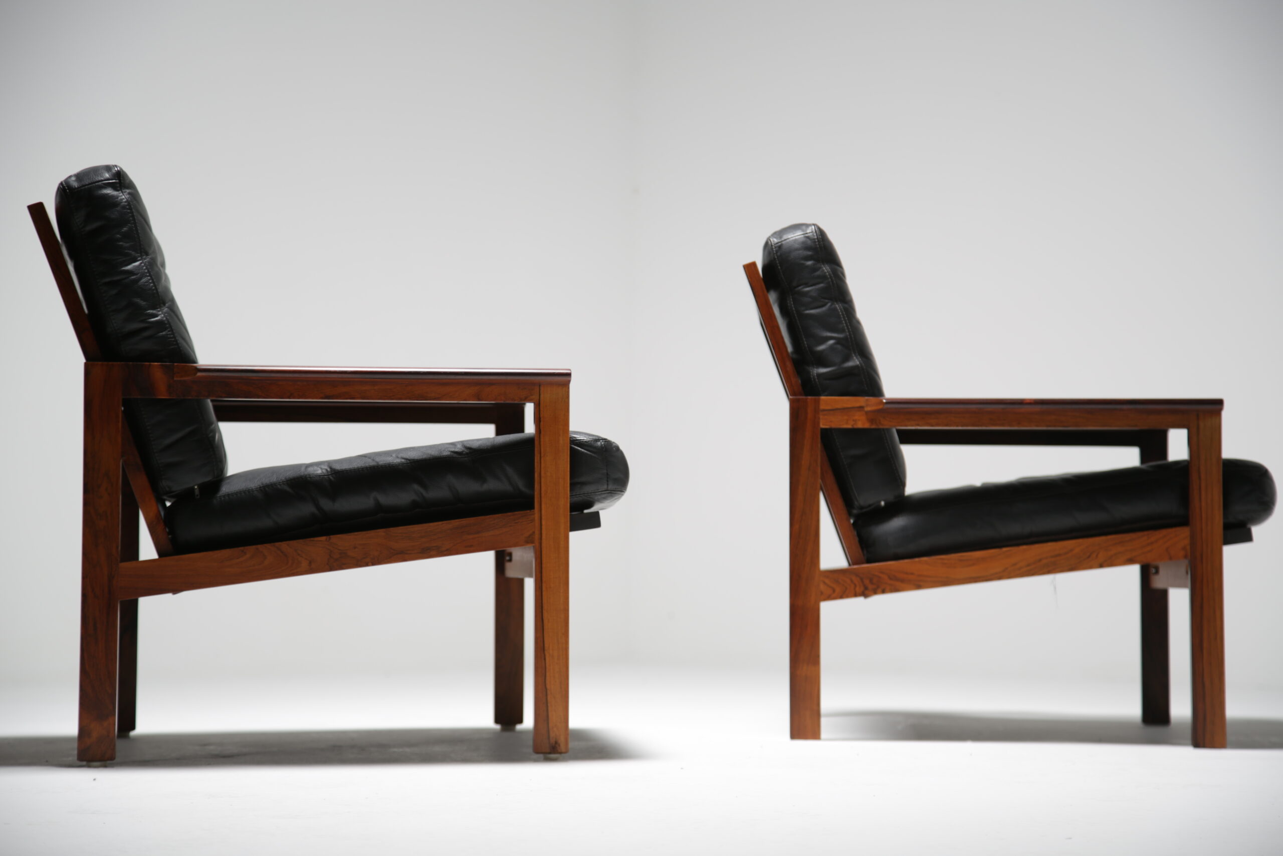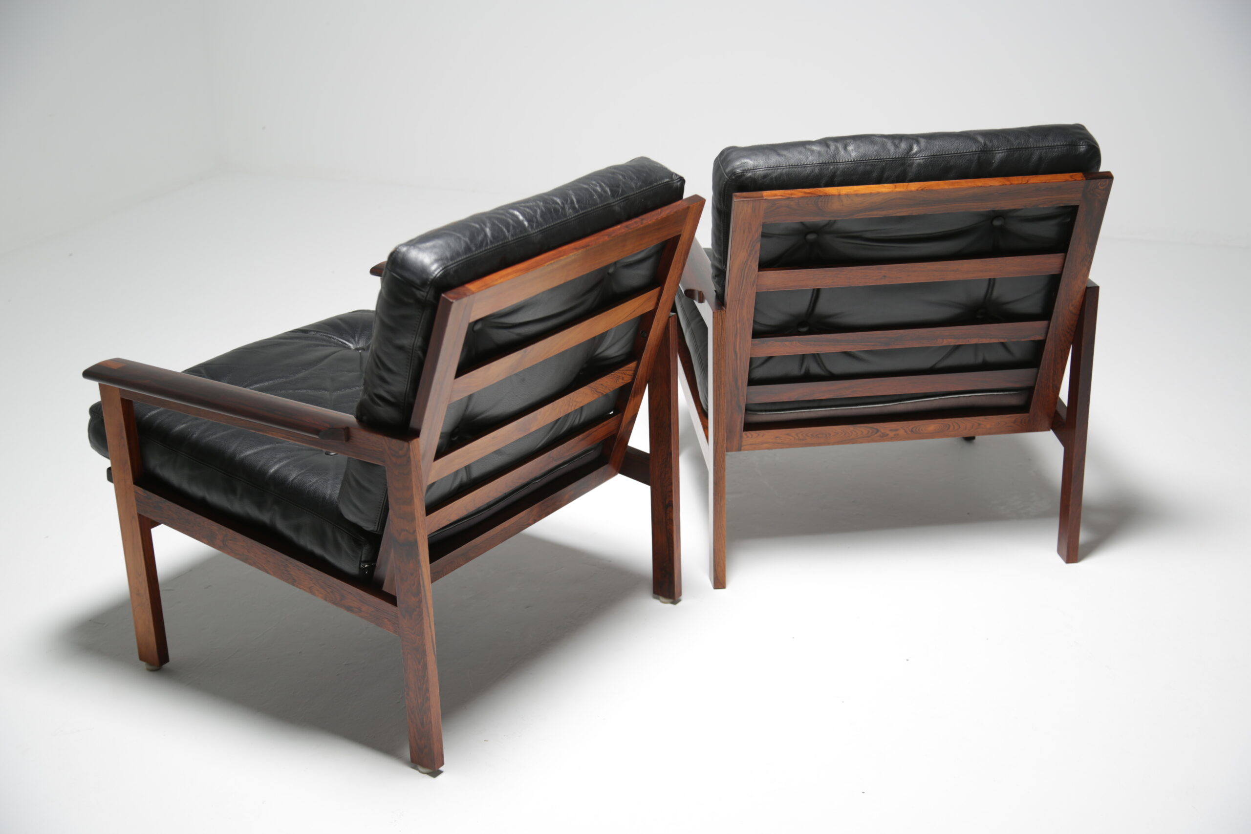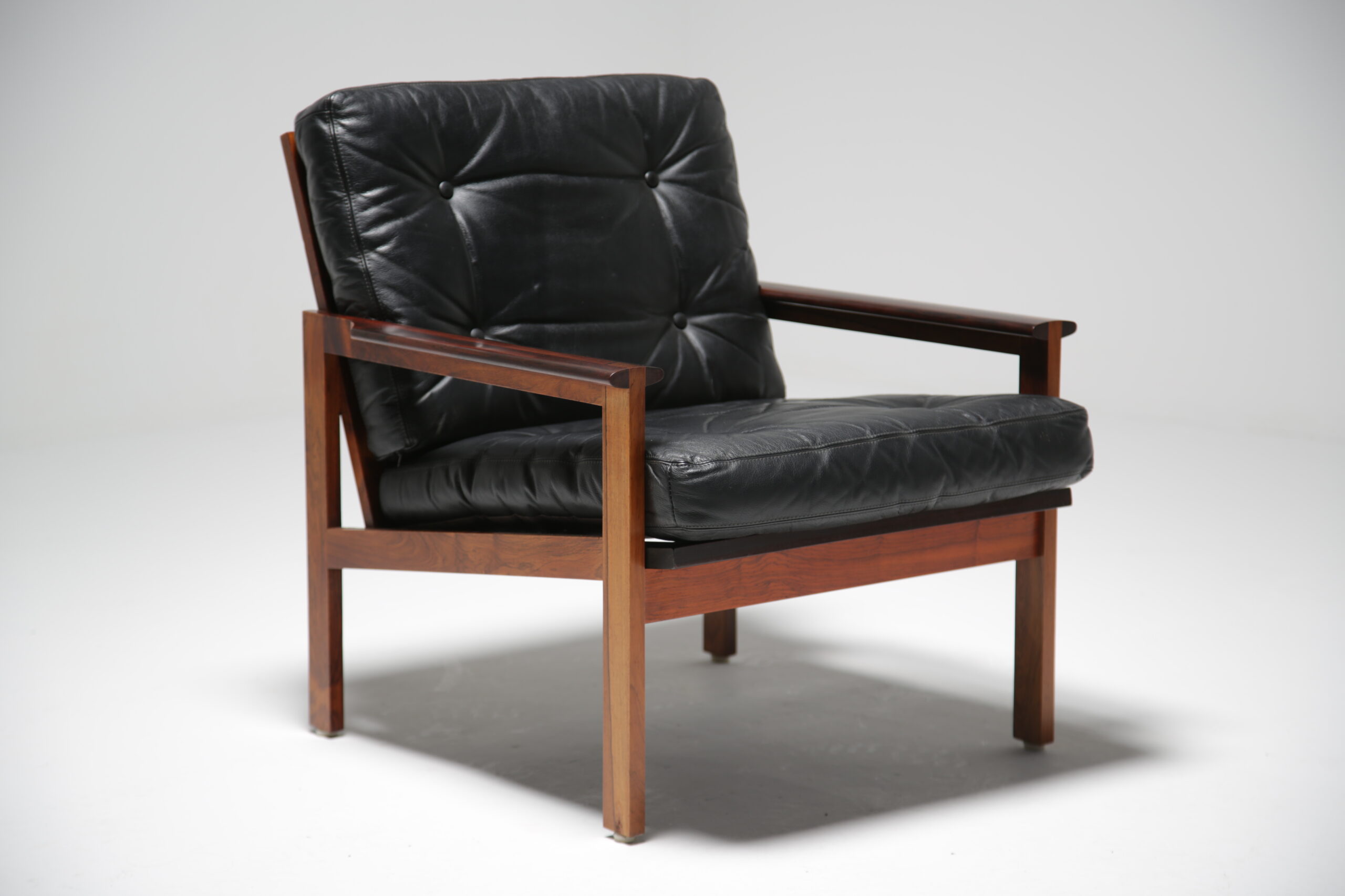 A pair of 1960s Lounge chairs designed by Illum Wikkelso for Niels Eilersen, part of the Capella range that includes sofas, side tables, high back chairs etc etc. The great feature from this set is the arms. They are slightly rounded on the top and oval shaped when looked at front on. Its a very pleasing design to the eye and also and very tactile to the sitter. The chairs are both rosewood and came together to us as an original pair however one is quite a bit darker than the other even though both were restored at the same time by the same person. The leather is original and we have made it more supple with leather food. The webbing was replaced as the original webbing was dry and brittle. Everything that needs to be done has been done. This is a great set of original chairs in wonderful condition. They cannot be bought new so only vintage versions in rosewood exist. Available now. Worldwide shipping available.