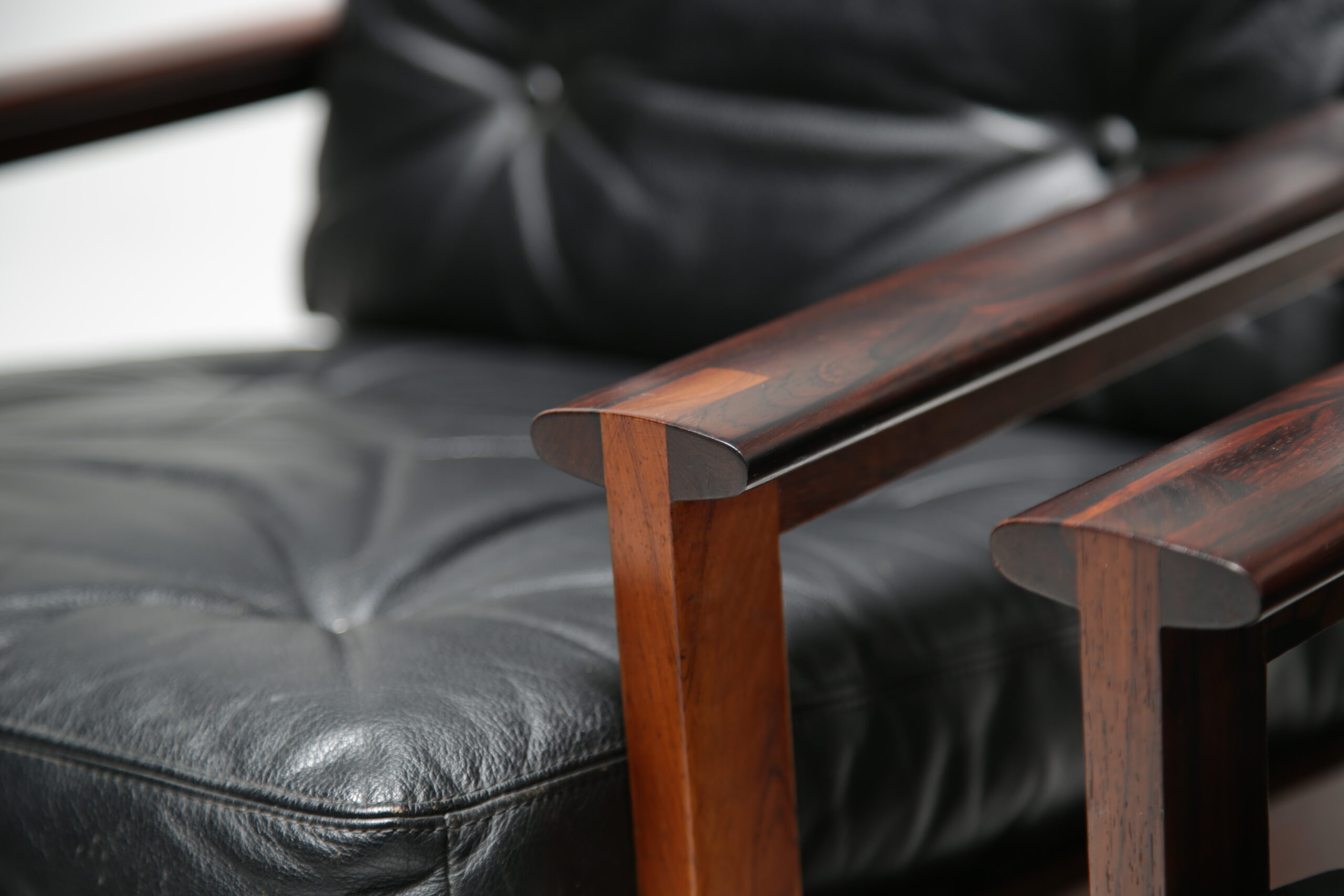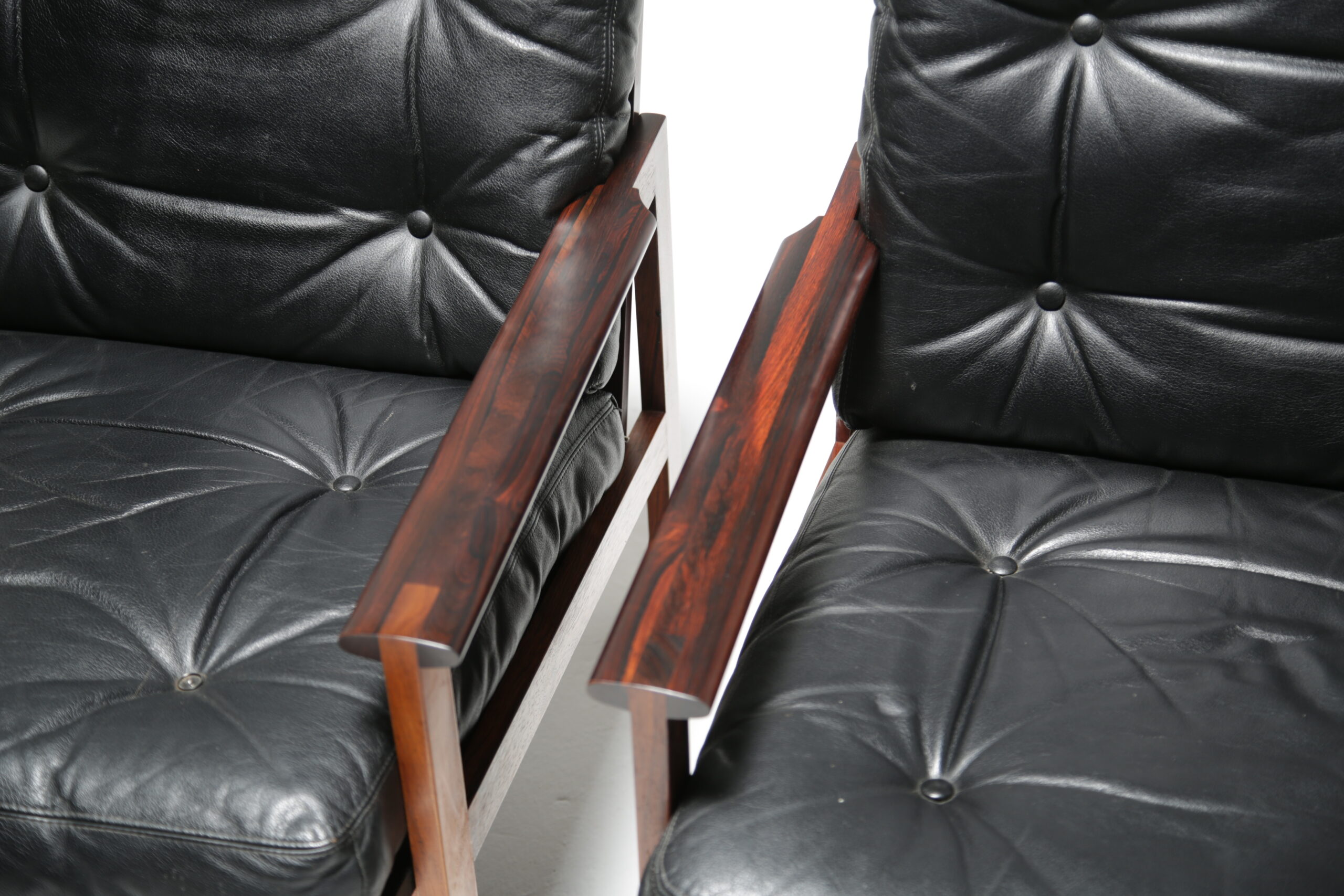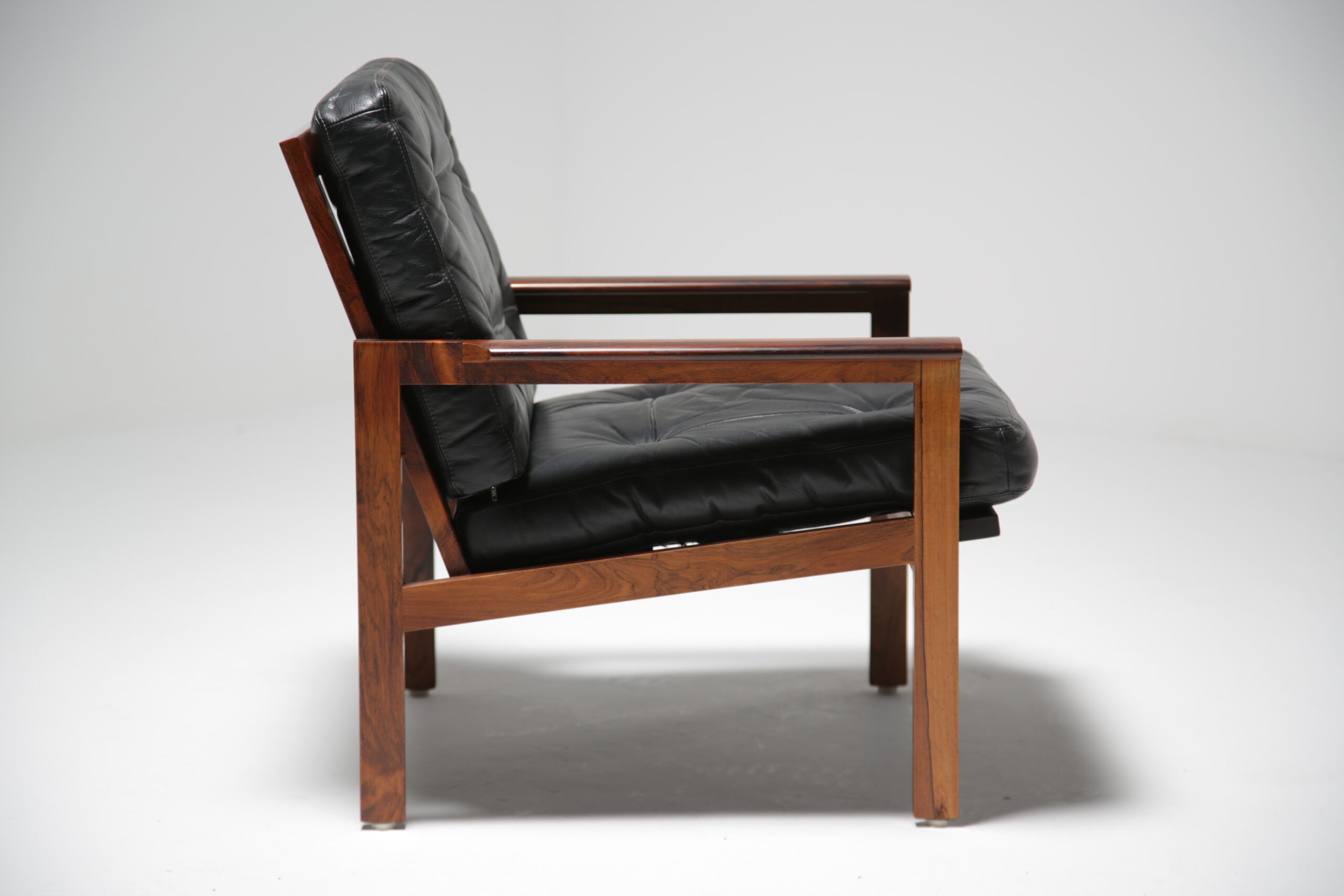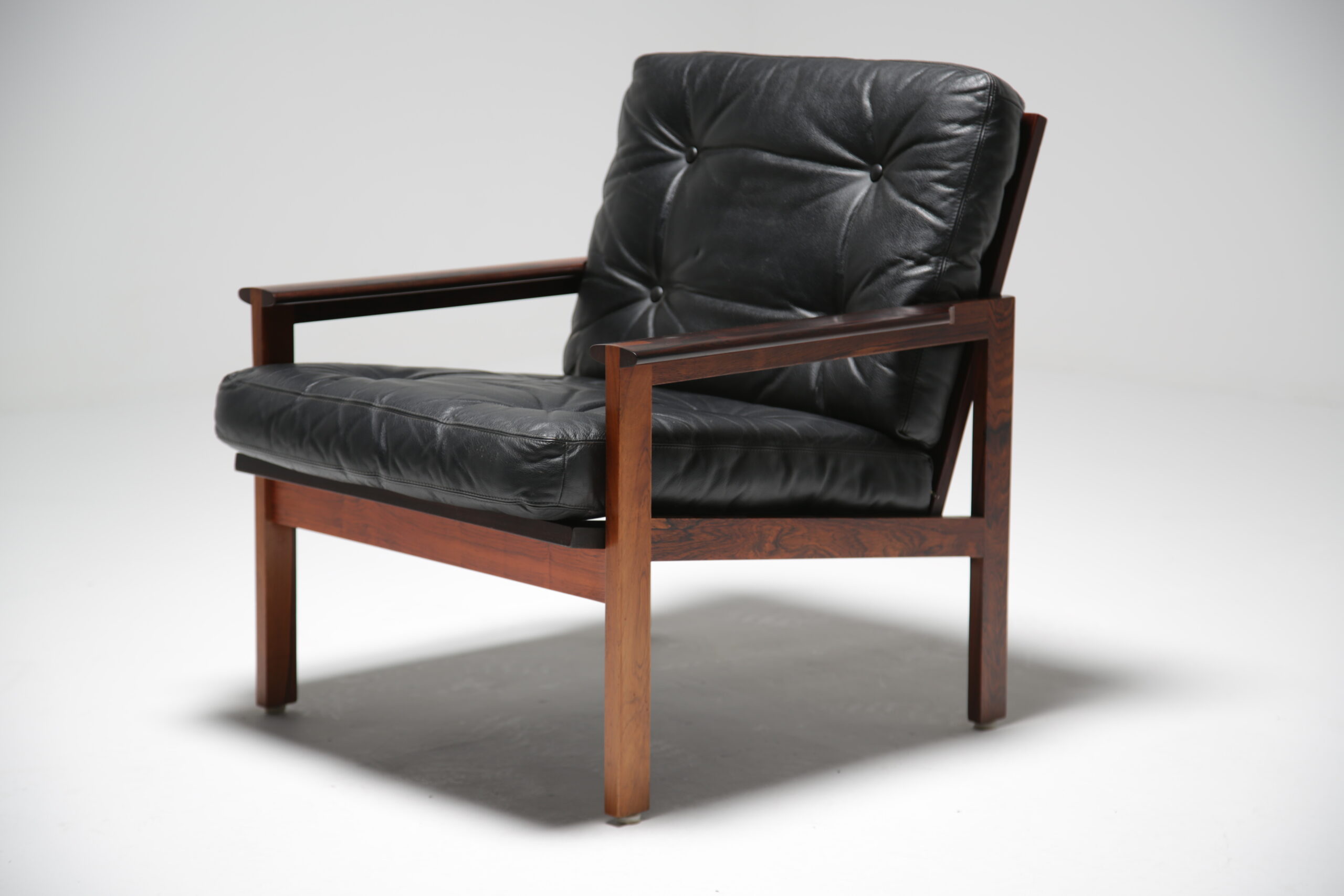 A pair of 1960s Lounge chairs designed by Illum Wikkelso for Niels Eilersen, part of the Capella range that includes sofas, side tables, high back chairs etc etc. The great feature from this set is the arms. They are slightly rounded on the top and oval shaped when looked at front on. Its a very pleasing design to the eye and also and very tactile to the sitter. The chairs are both rosewood and came together to us as an original pair however one is quite a bit darker than the other even though both were restored at the same time by the same person. The leather is original and we have made it more supple with leather food. The webbing was replaced as the original webbing was dry and brittle. Everything that needs to be done has been done. This is a great set of original chairs in wonderful condition. They cannot be bought new so only vintage versions in rosewood exist. Available now. Worldwide shipping available.