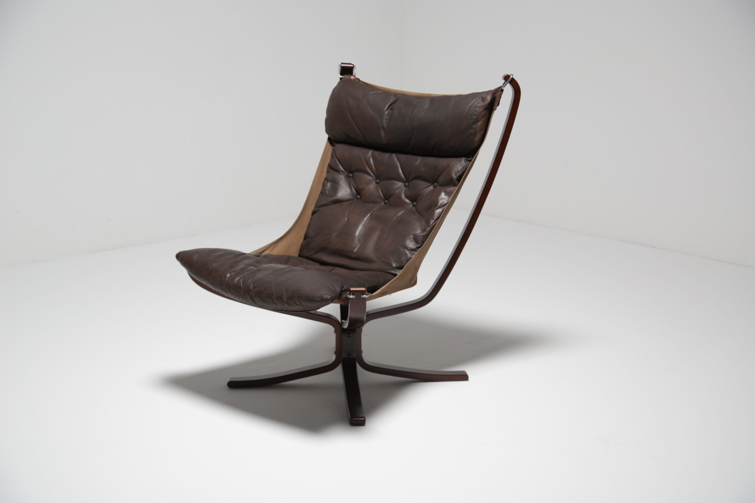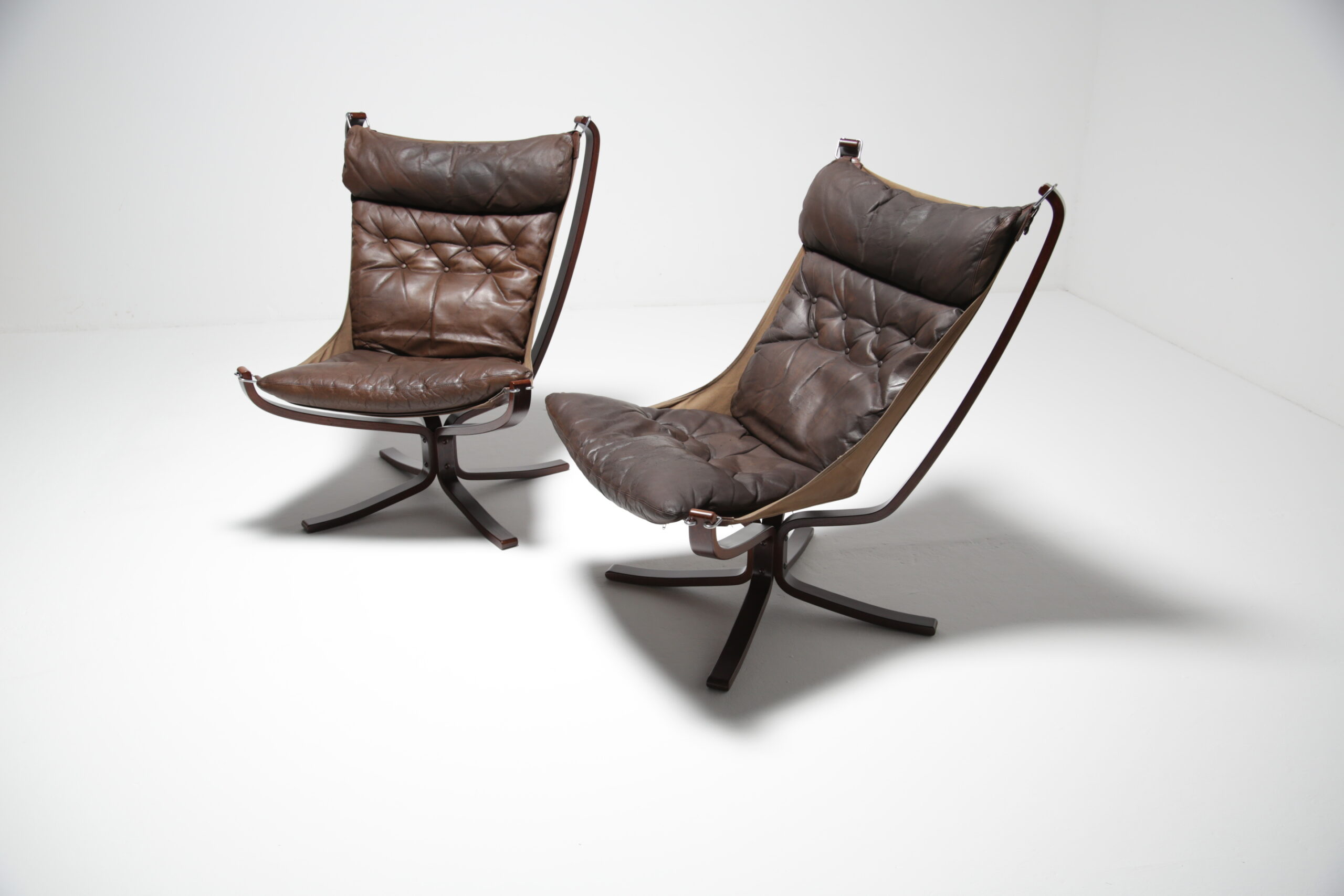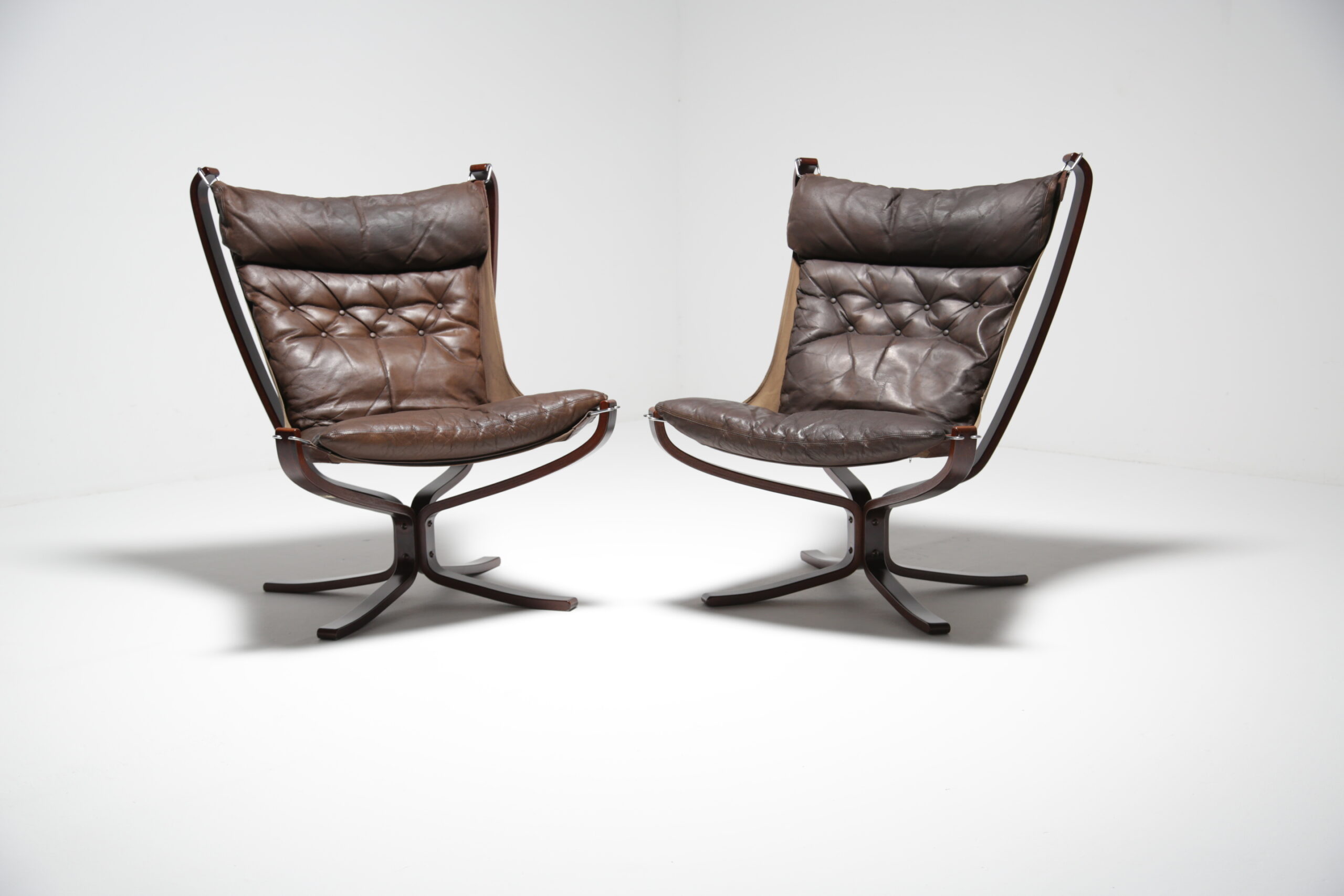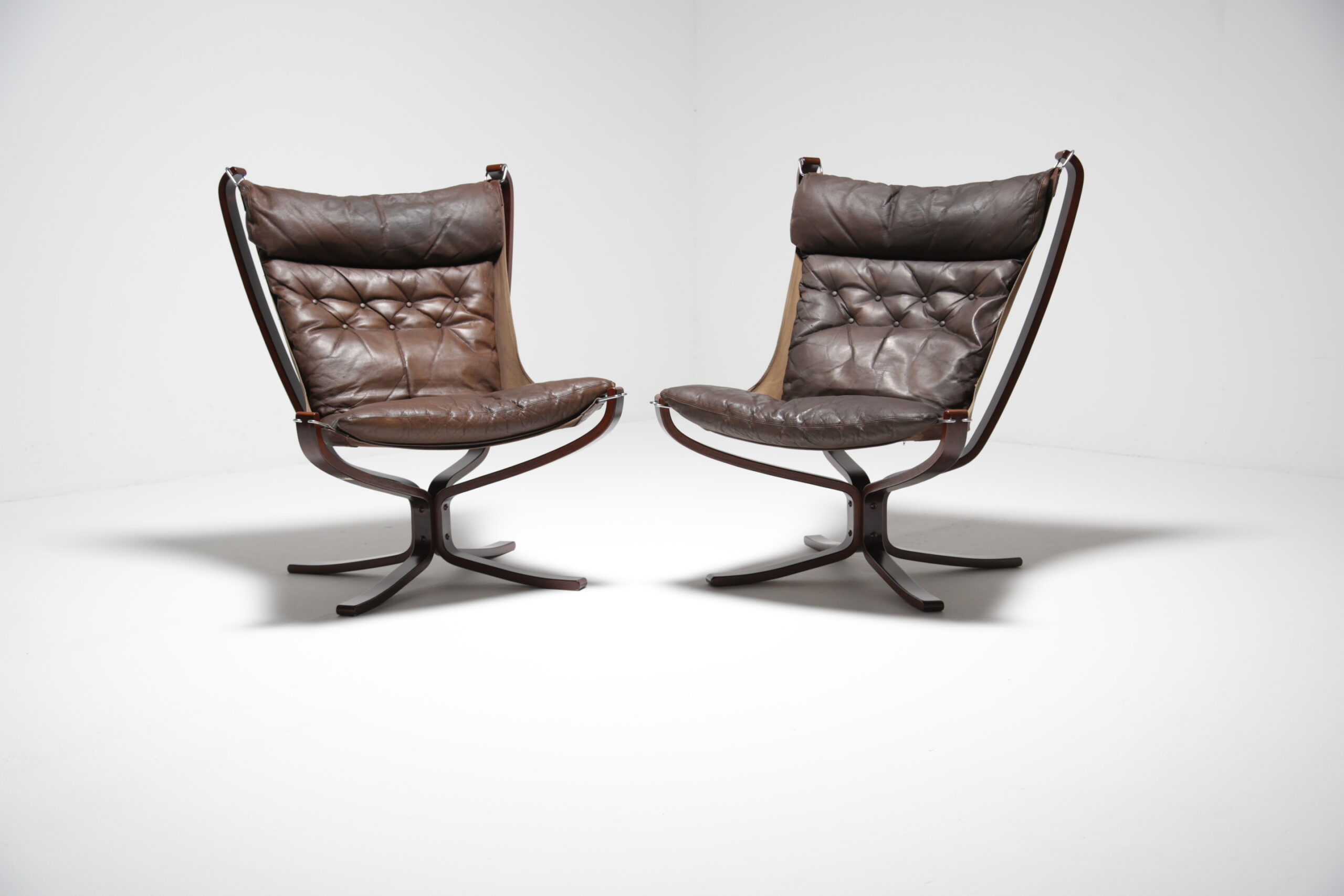 Discover the timeless elegance of our Vintage Brown Leather Falcon Chairs, designed by Sigurd Ressell for Vatne Mobler in the 1970s. These high-back chairs, featuring stained beech bentwood frames and original brown buttoned leather, blend iconic design with unmatched comfort. Fully restored to their former glory. They promise a unique seating experience that adds a touch of vintage charm to any space.